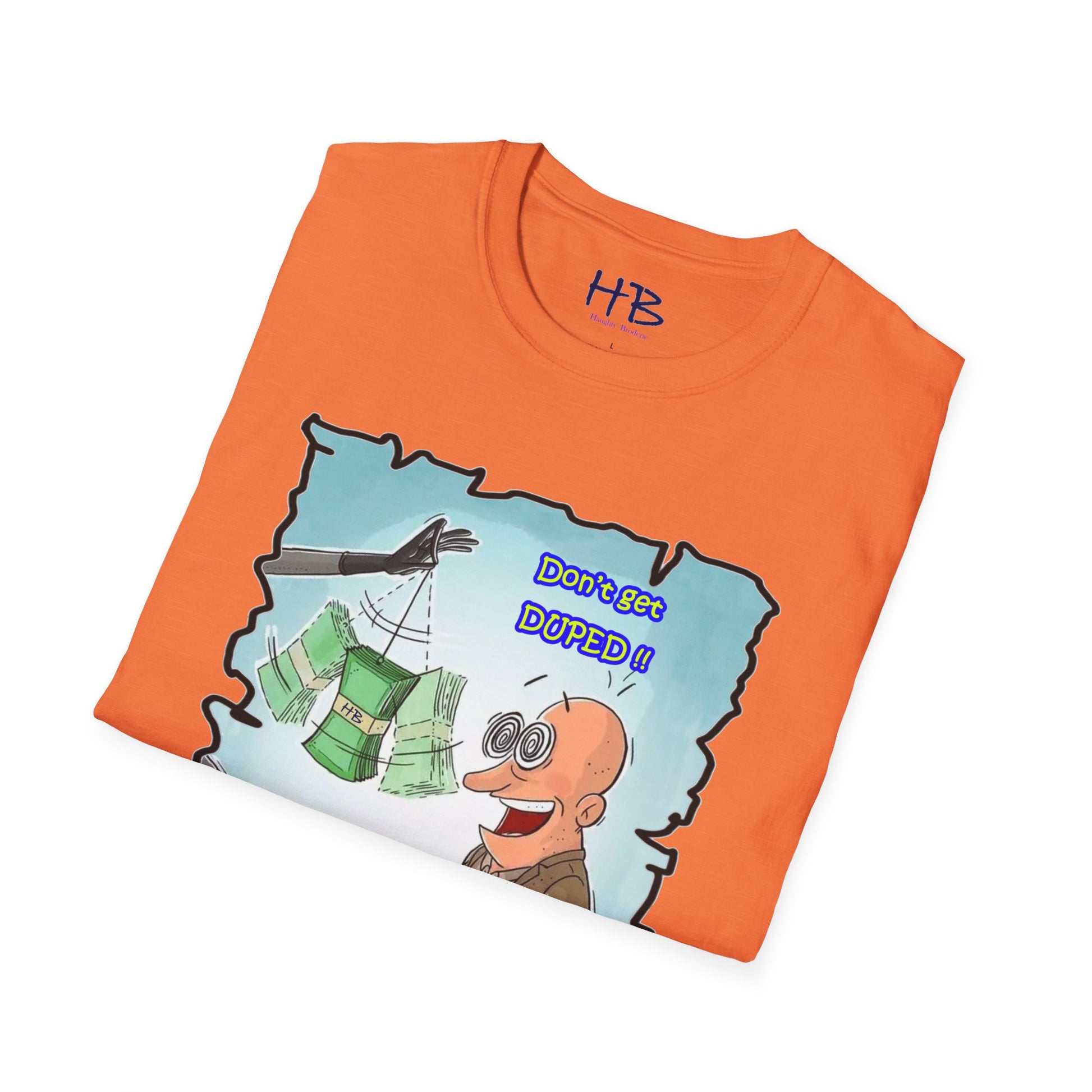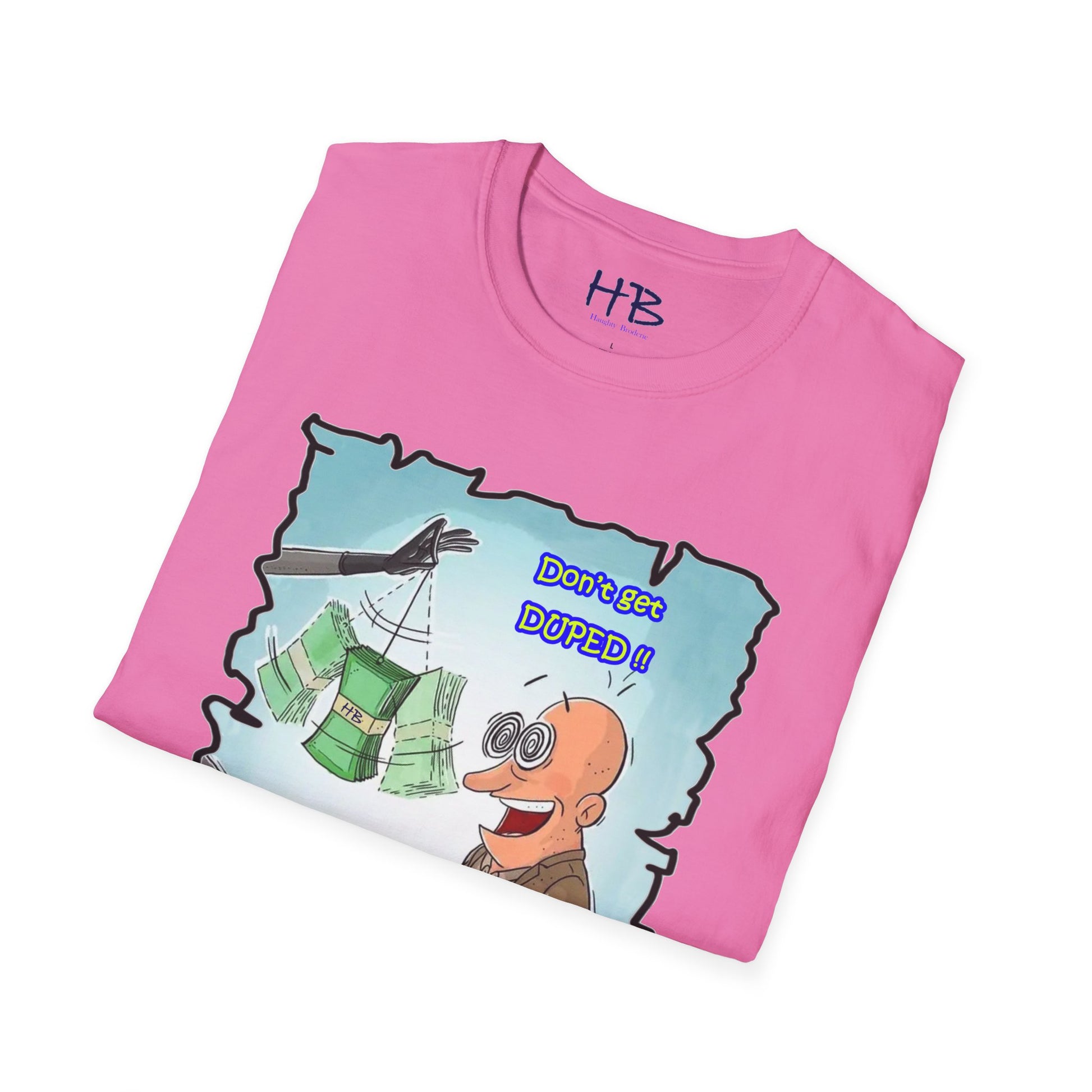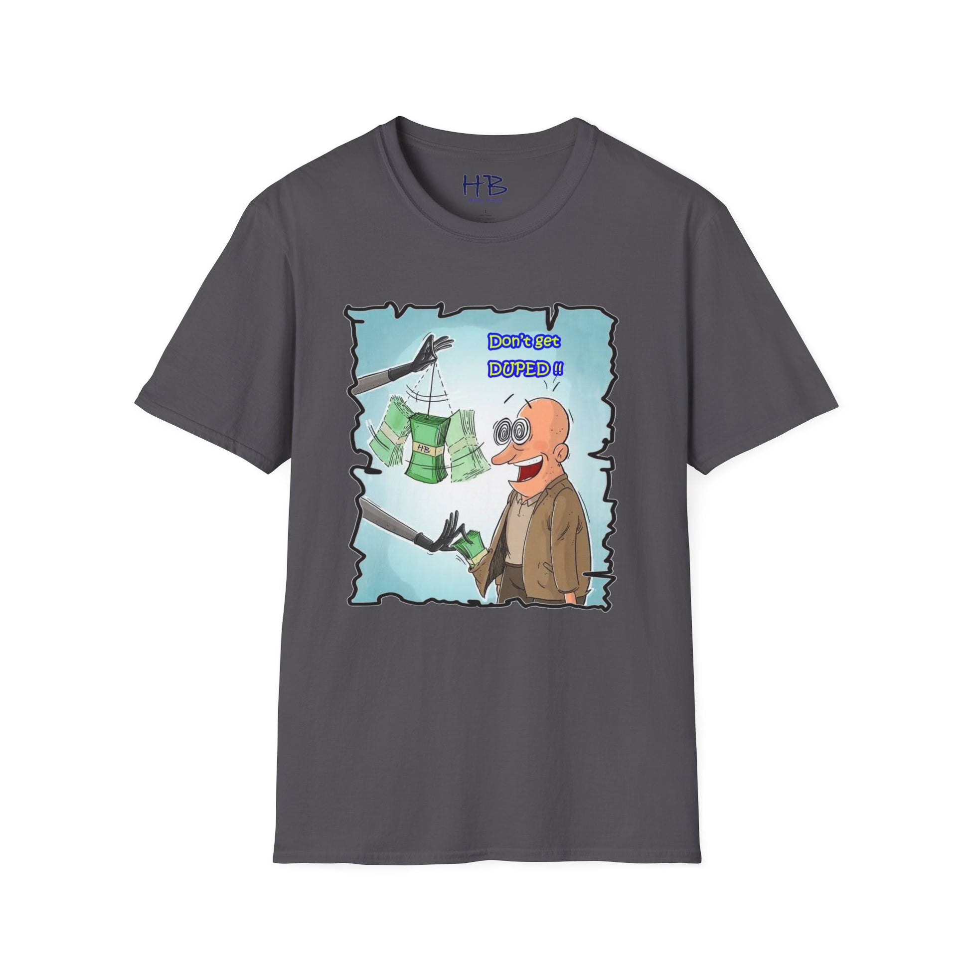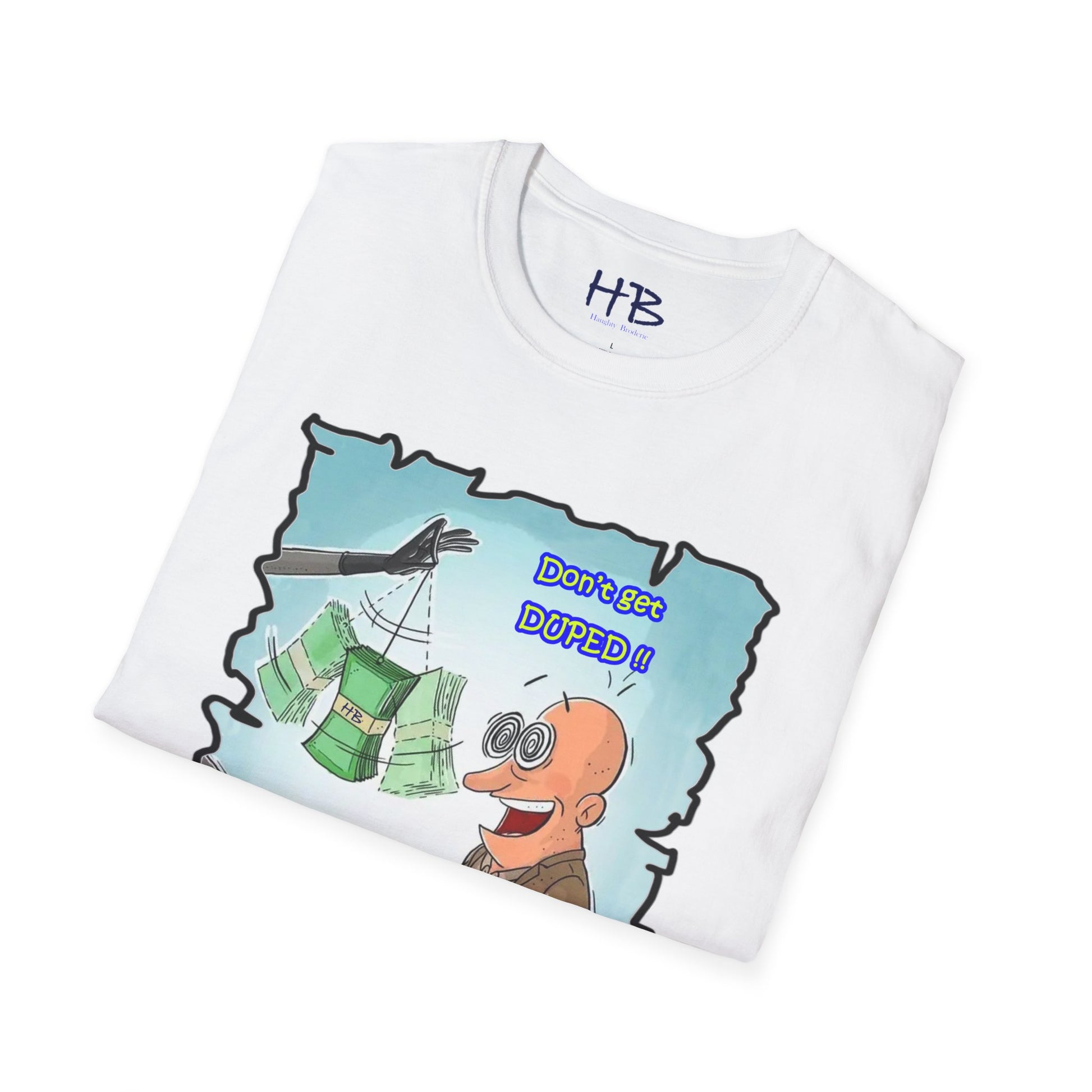 One hand, with its mesmerizing grip, has the man entranced, fixated on the allure of wealth. Meanwhile, the other hand deftly slips into the vest pocket of the unsuspecting man, stealthily pilfering his hard-earned money. With bold clarity, the text on this t-shirt emphatically declares, "Don't get DUPED!"