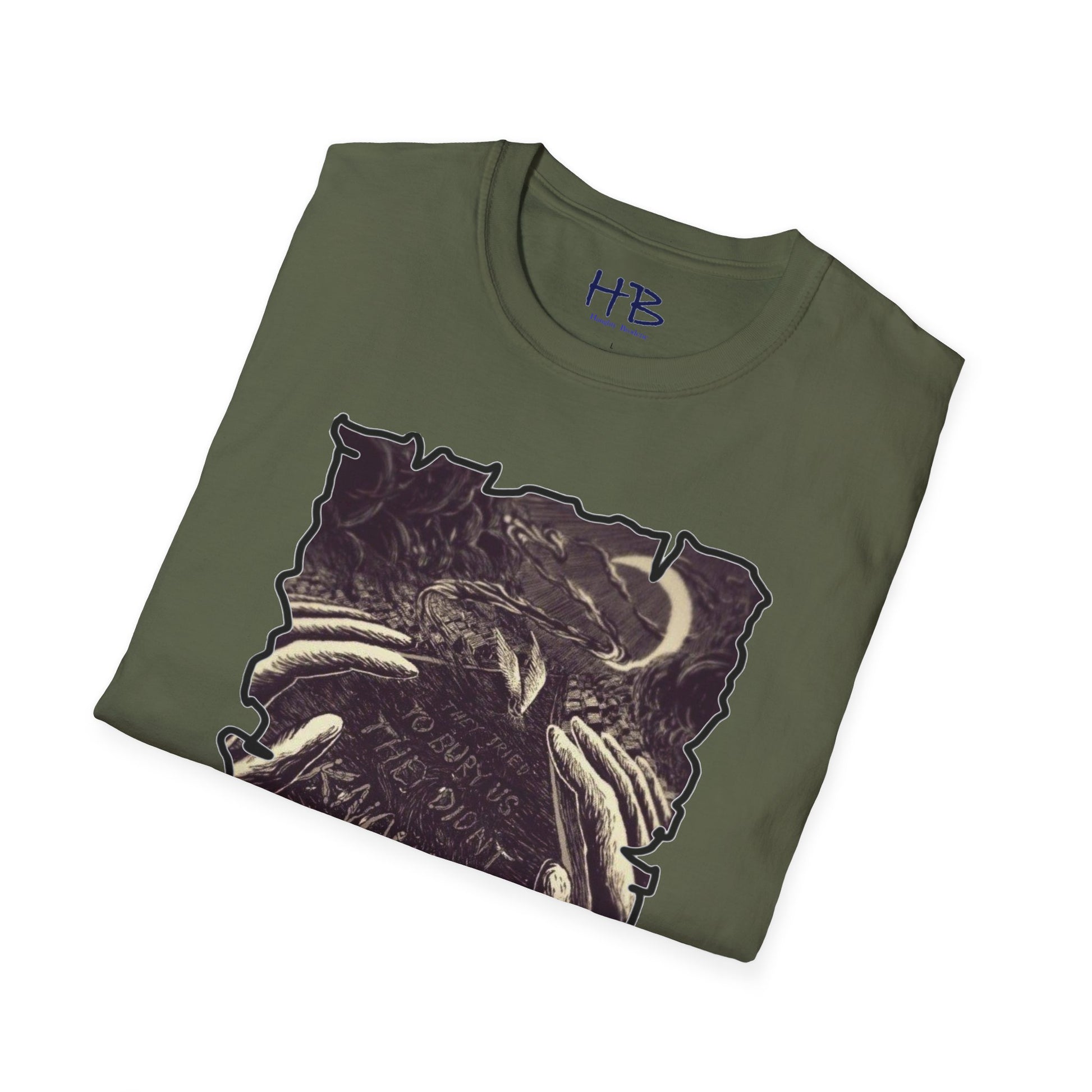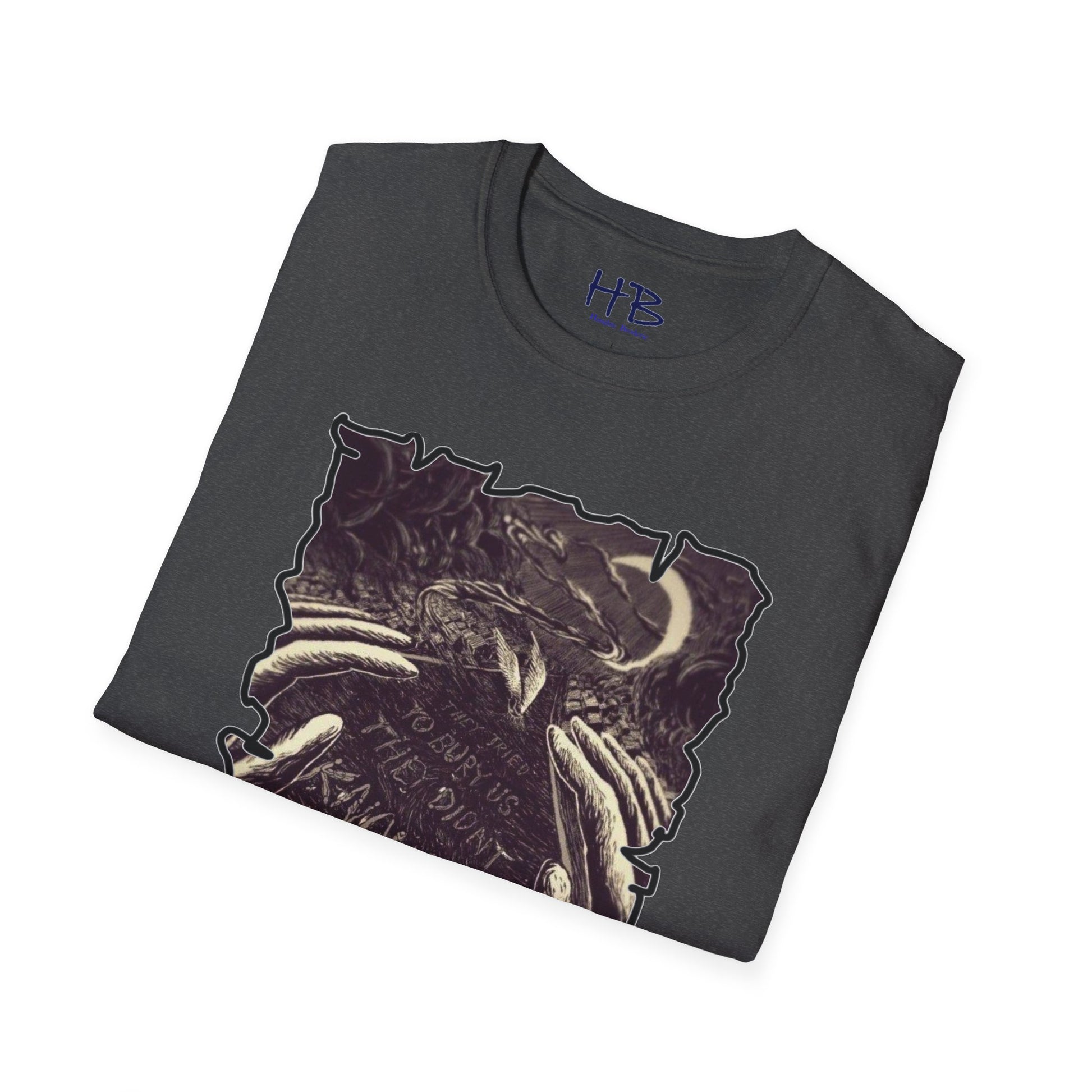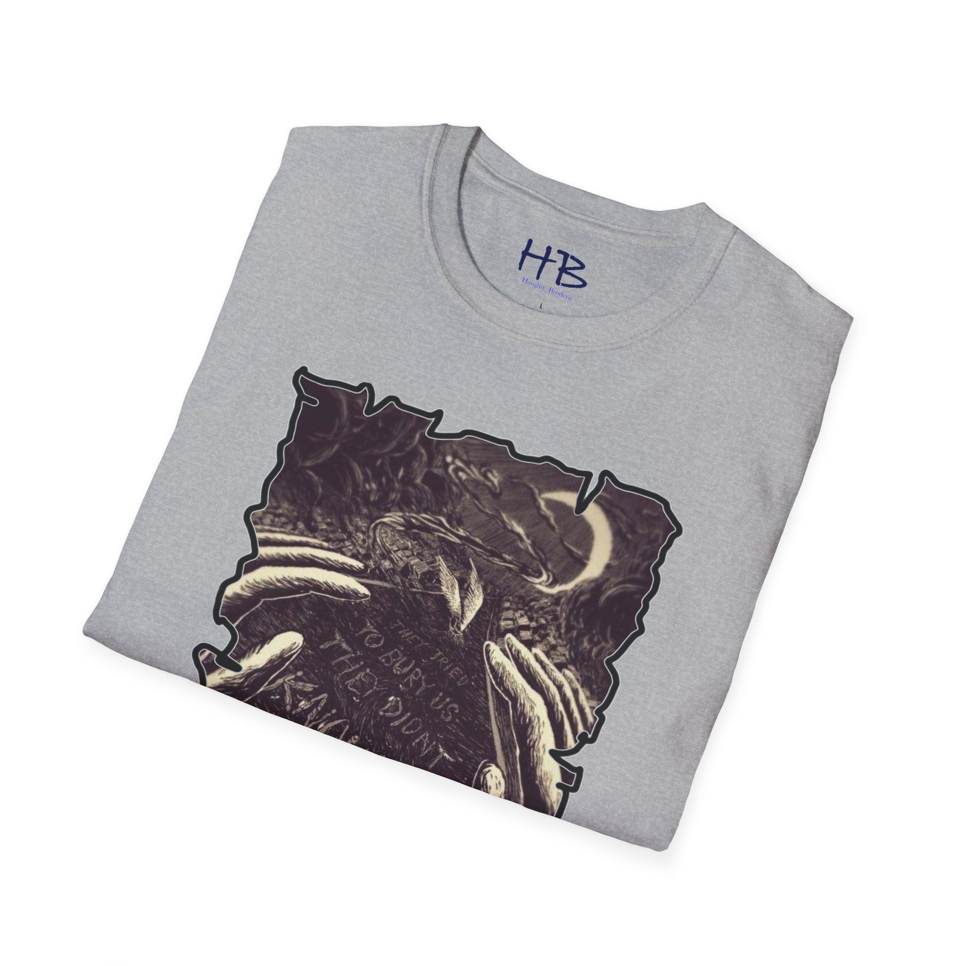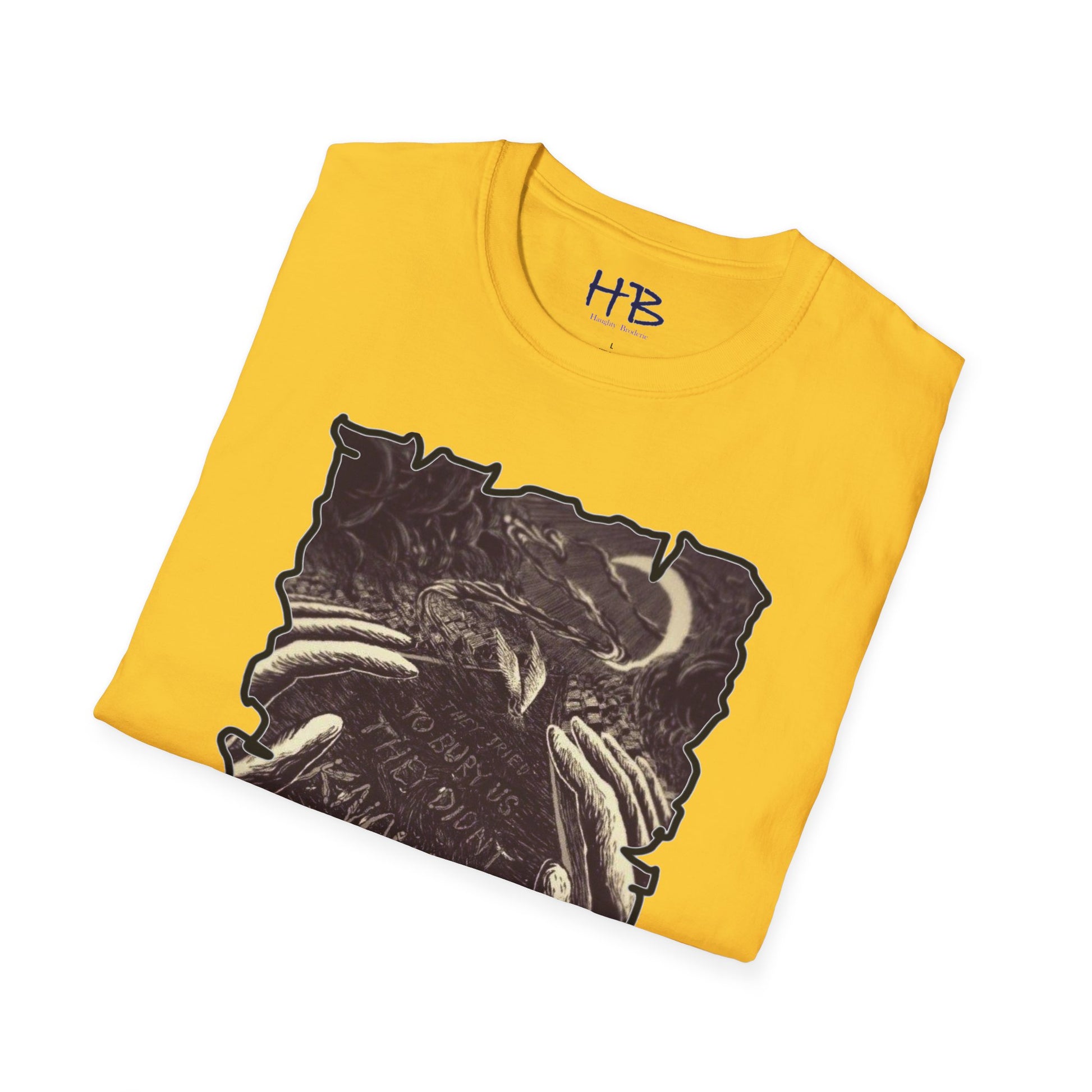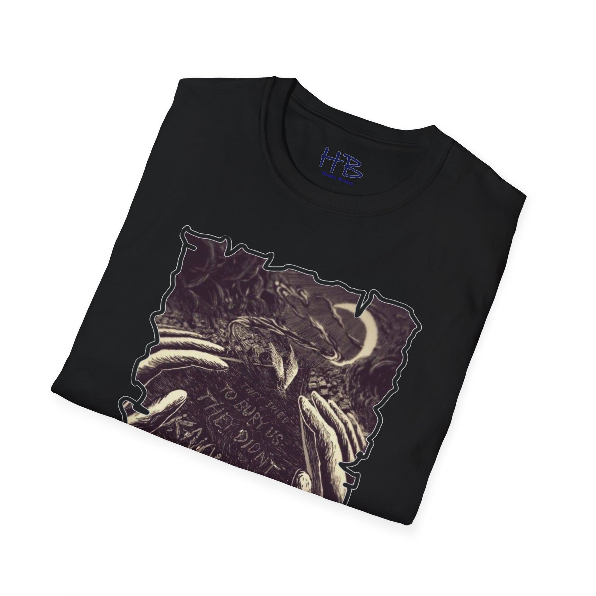 Introducing our extraordinary tee shirt, featuring a captivating drawn image that will ignite your spirit and inspire those around you. Picture this: two hands, resolute and determined, working diligently with something akin to soil. Between these hands lies a powerful message, meticulously crafted to resonate with your soul: "They tried to bury us, they didn't know we were seeds."
