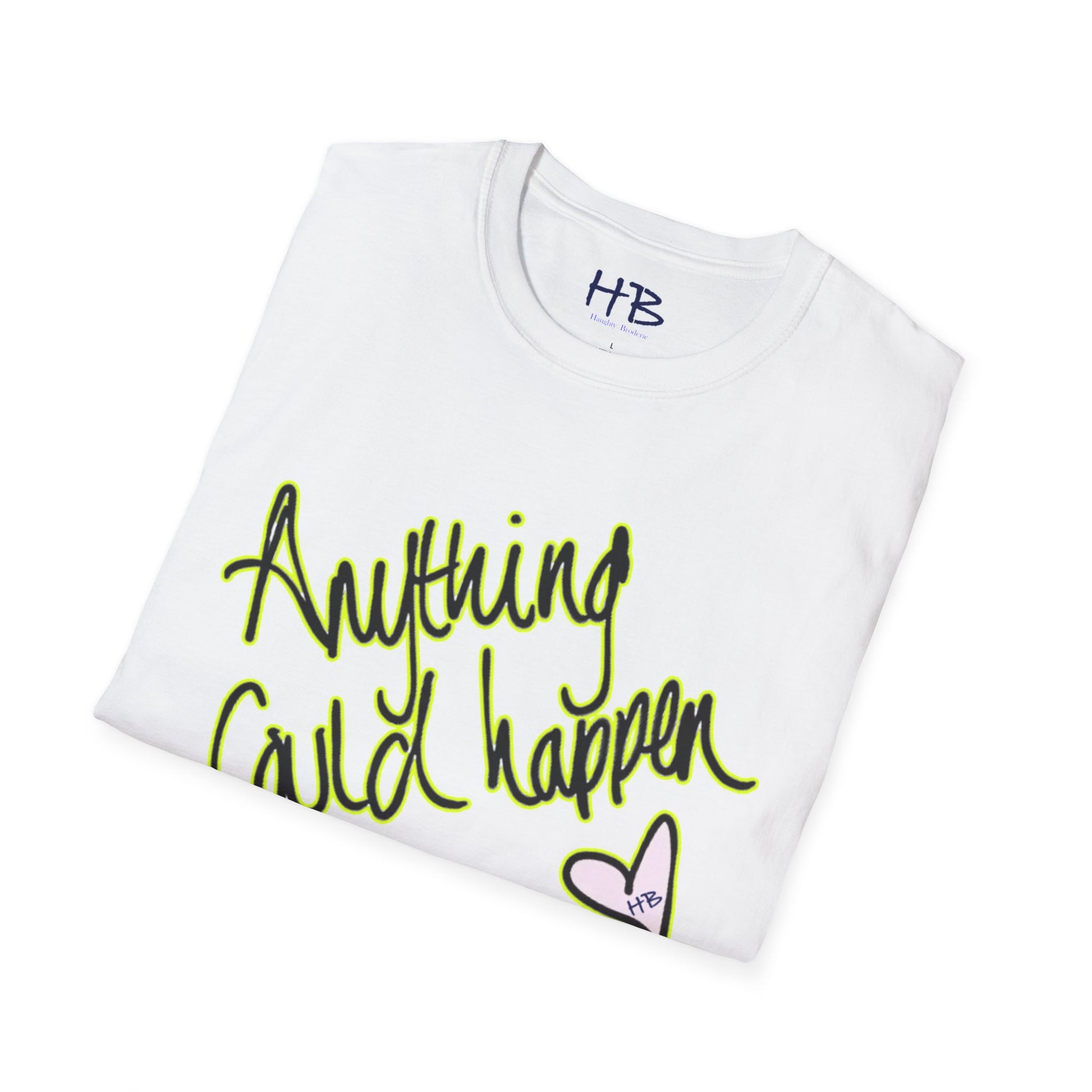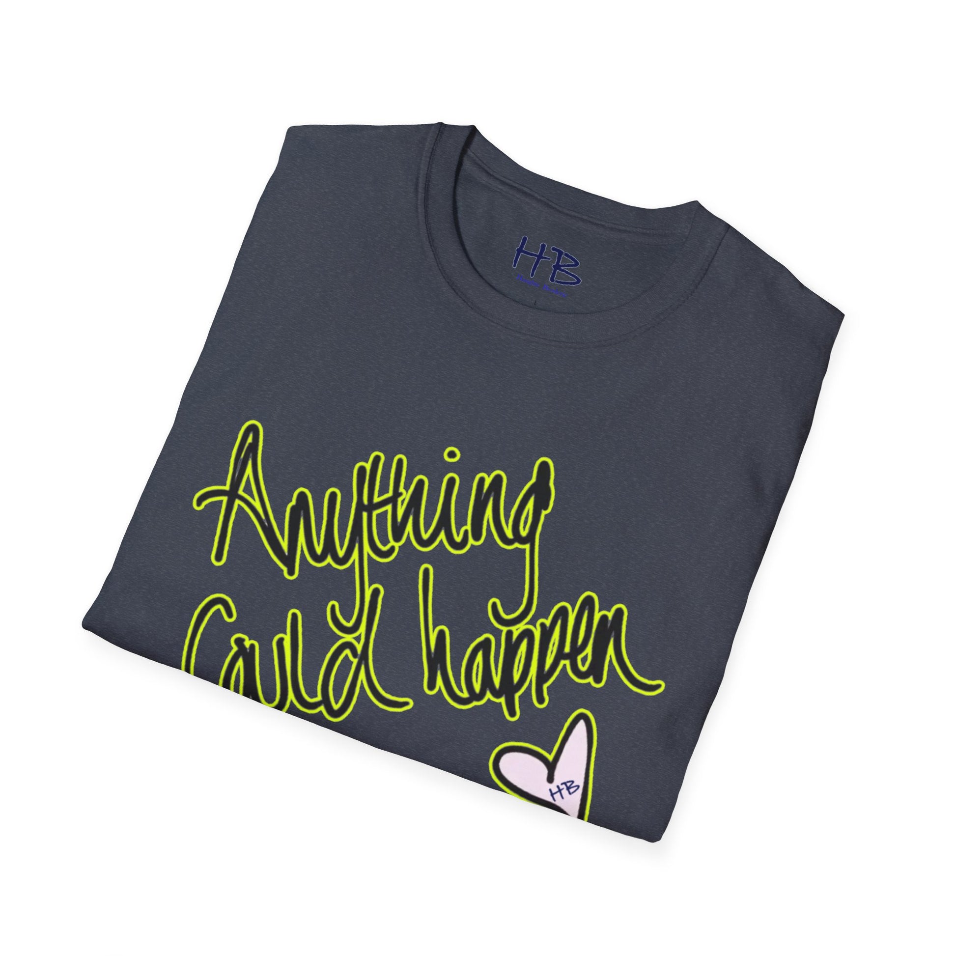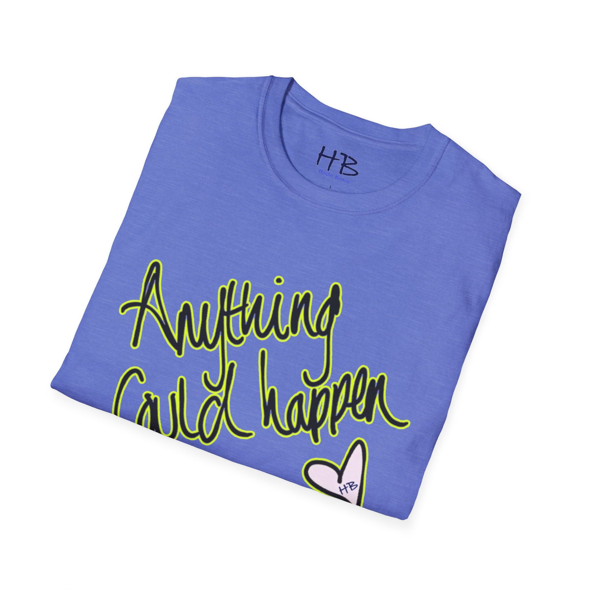 In today's fast-paced world, it's essential to be a bearer of positivity, and this tee shirt perfectly exemplifies that philosophy. The phrase "Anything could happen" serves as a daily reminder that life is full of surprises and opportunities waiting to be embraced. The symbolic heart, rendered in a soft rose hue, symbolizes love, compassion, and open-heartedness, spreading the message that love and kindness are the driving forces behind the unexpected beauty of life.