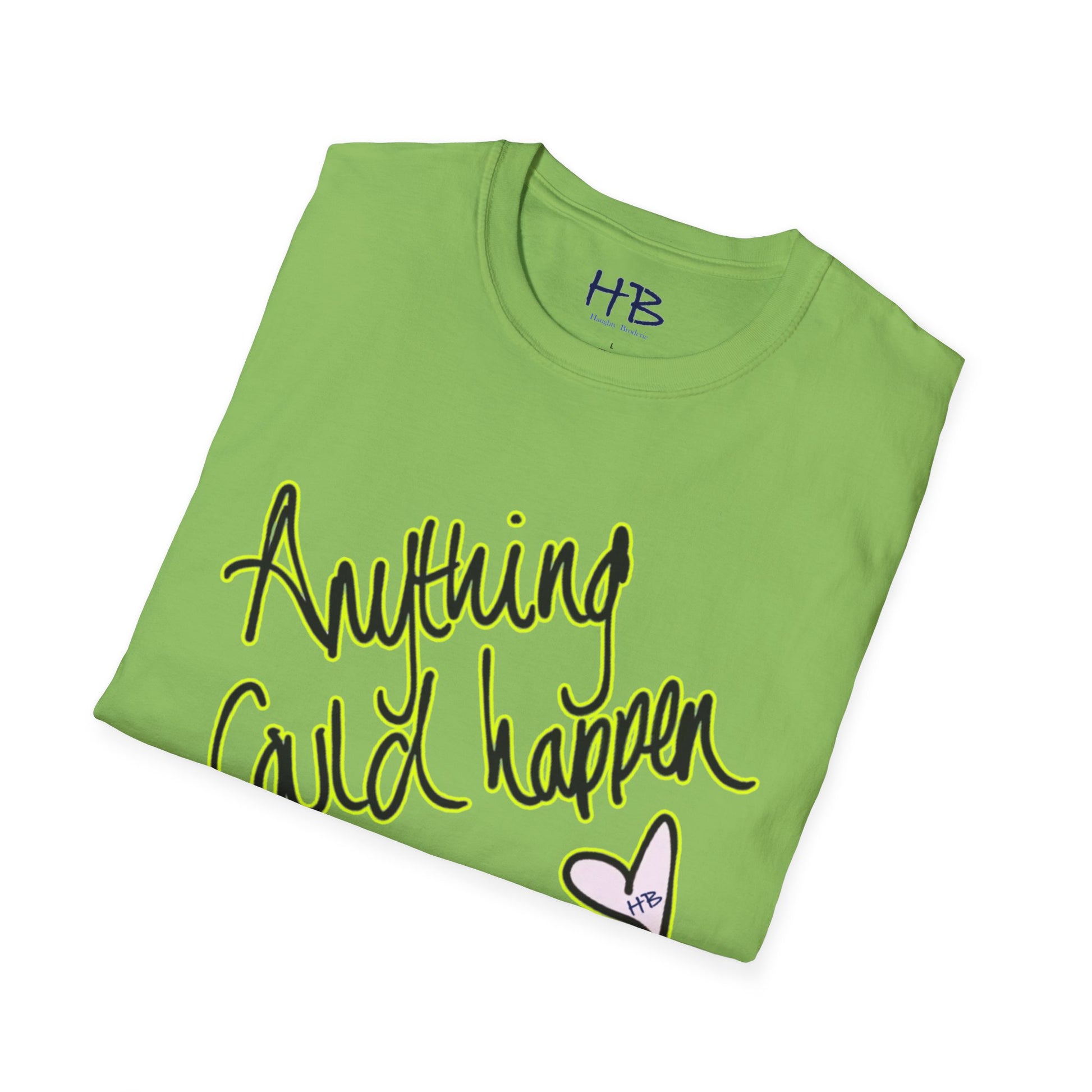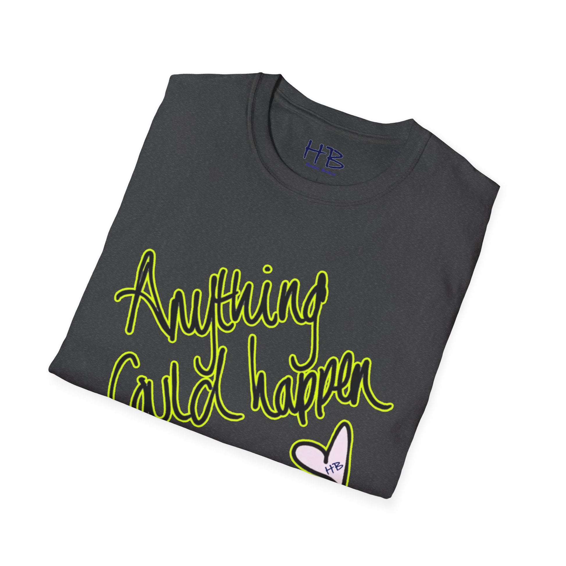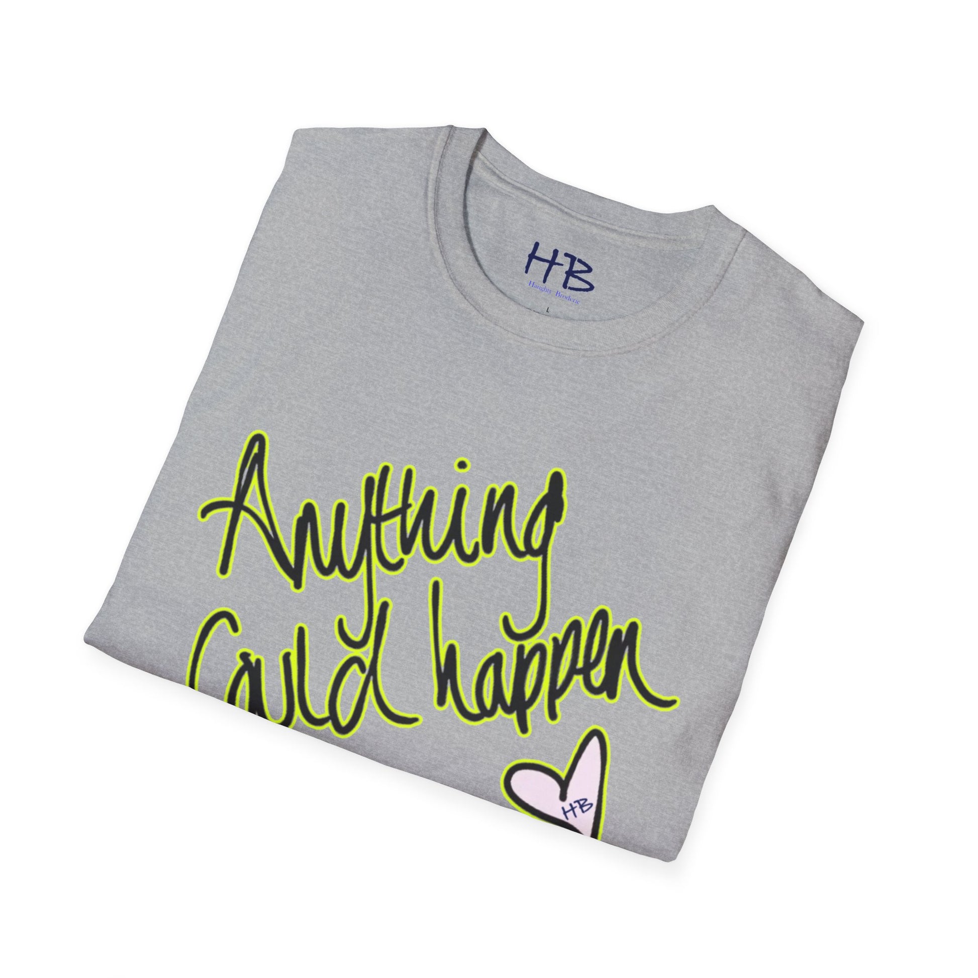 In today's fast-paced world, it's essential to be a bearer of positivity, and this tee shirt perfectly exemplifies that philosophy. The phrase "Anything could happen" serves as a daily reminder that life is full of surprises and opportunities waiting to be embraced. The symbolic heart, rendered in a soft rose hue, symbolizes love, compassion, and open-heartedness, spreading the message that love and kindness are the driving forces behind the unexpected beauty of life.