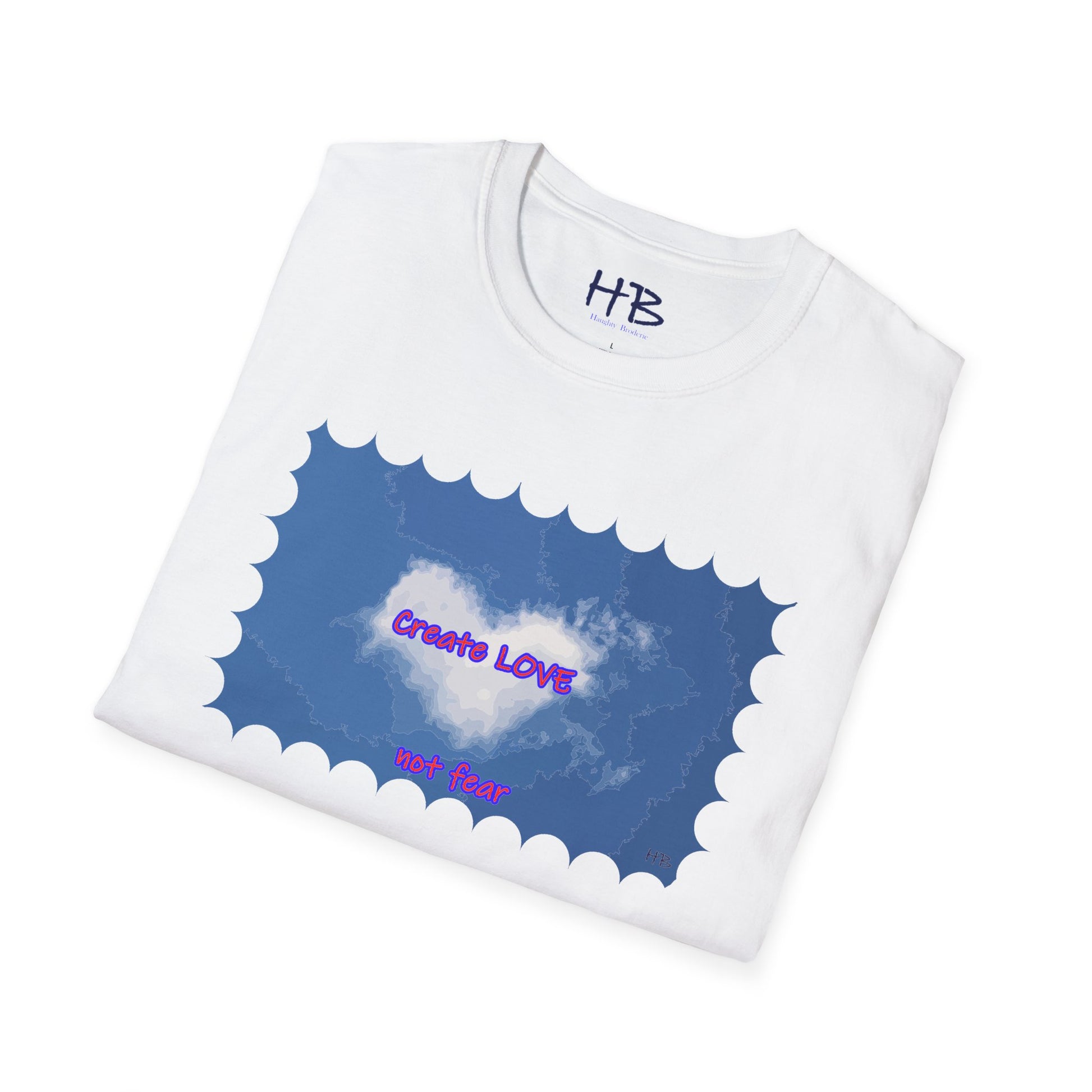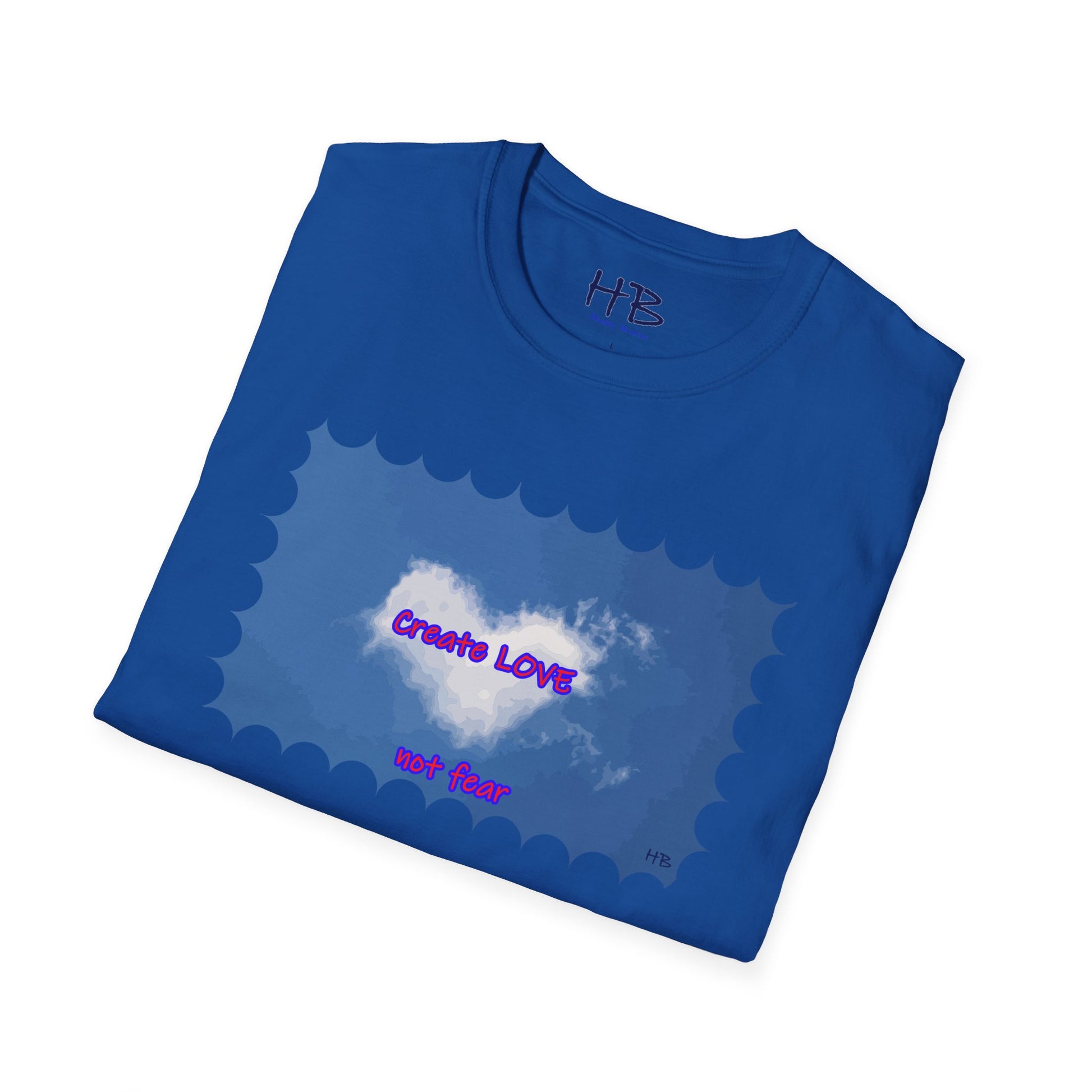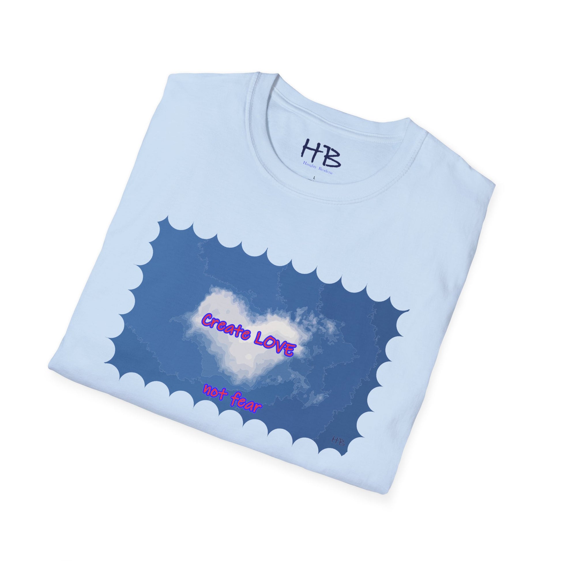 Introducing our remarkable tee shirt showcasing a serene blue sky, adorned with a single cloud crafted in the shape of a heart. This captivating image is accompanied by the powerful text, "Create LOVE not fear." This tee shirt serves as a gentle reminder of the importance of fostering love and positivity in our lives and in the world around us.