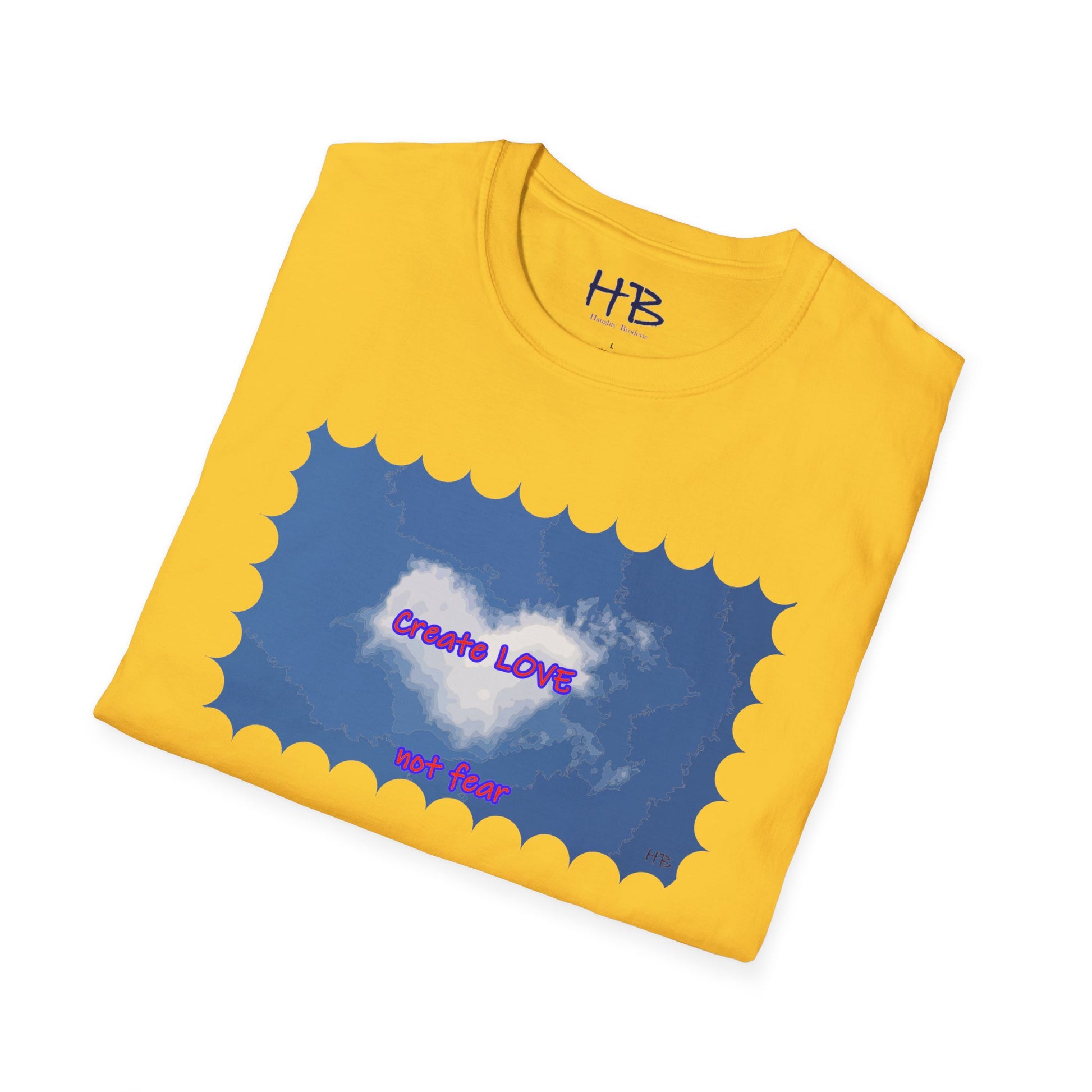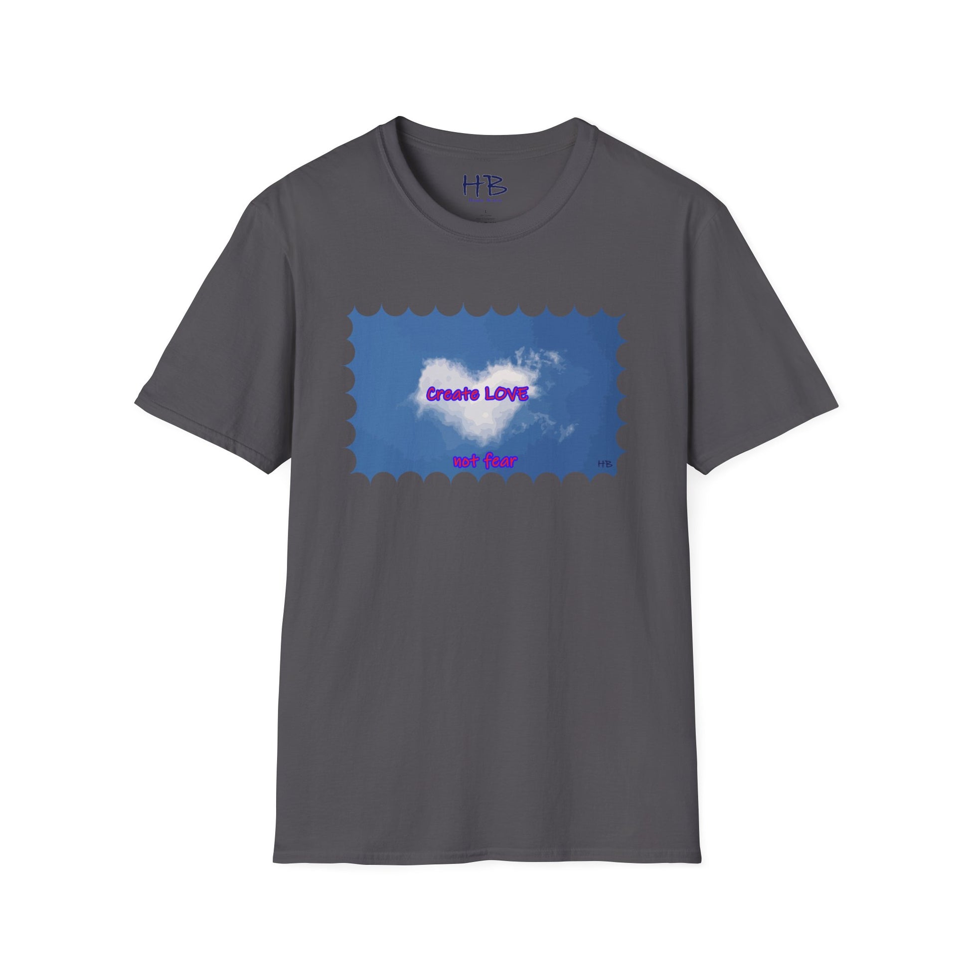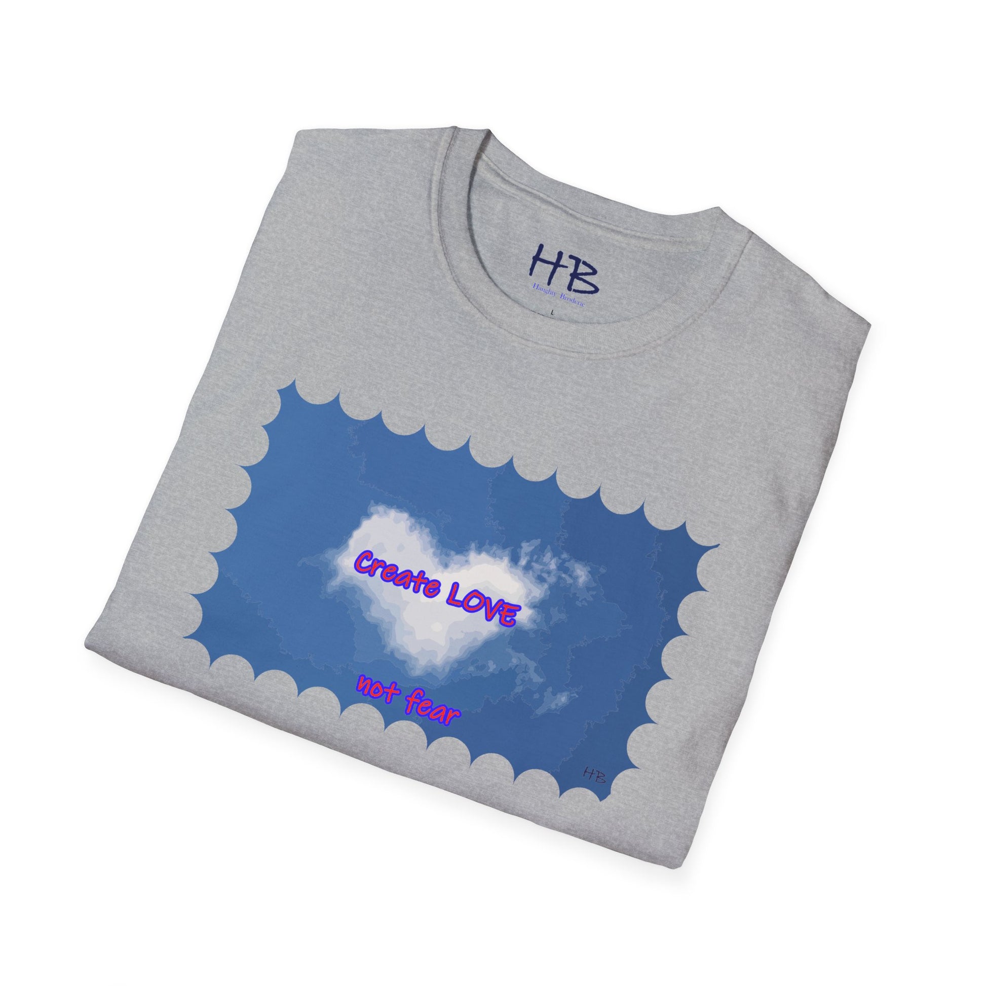 Introducing our remarkable tee shirt showcasing a serene blue sky, adorned with a single cloud crafted in the shape of a heart. This captivating image is accompanied by the powerful text, "Create LOVE not fear." This tee shirt serves as a gentle reminder of the importance of fostering love and positivity in our lives and in the world around us.