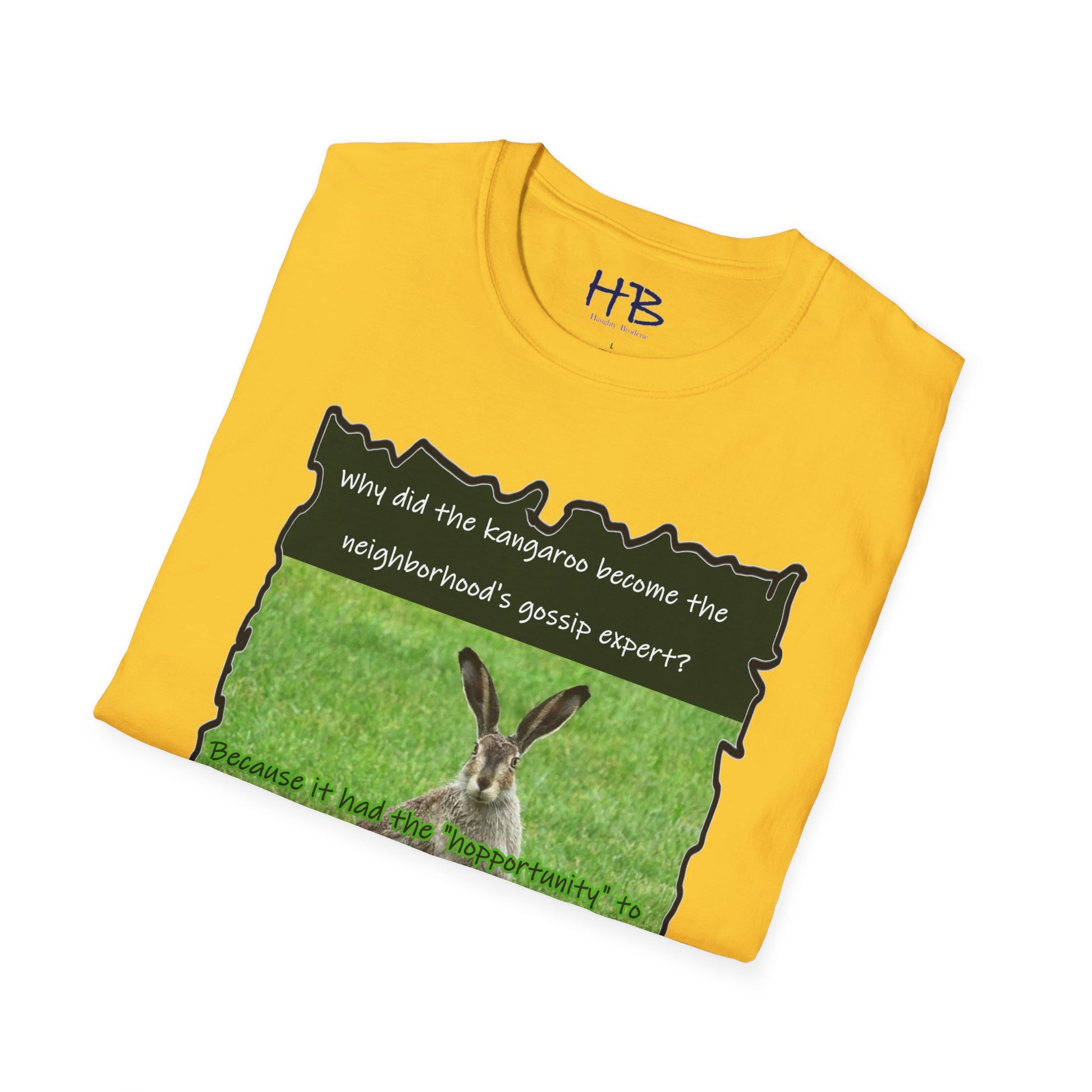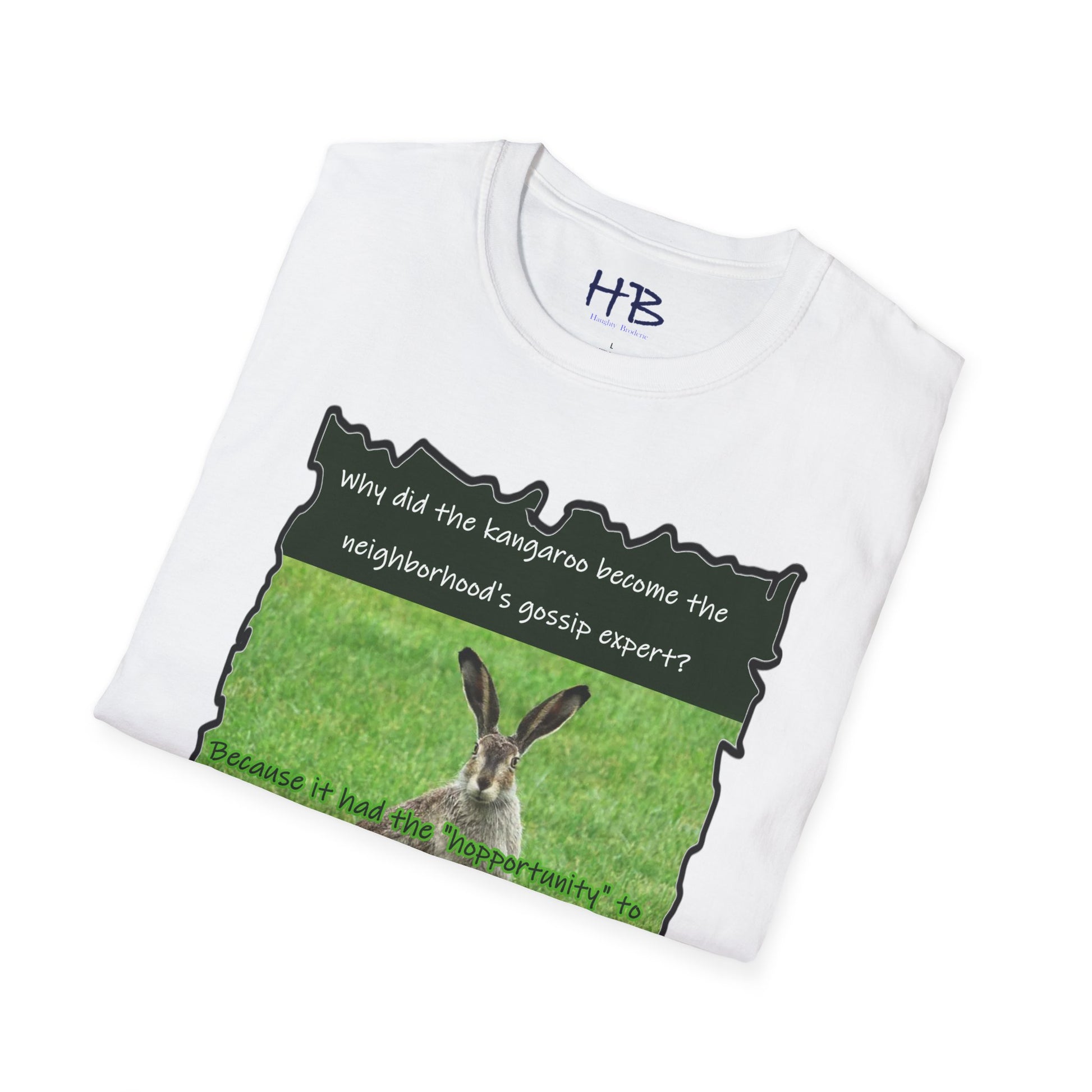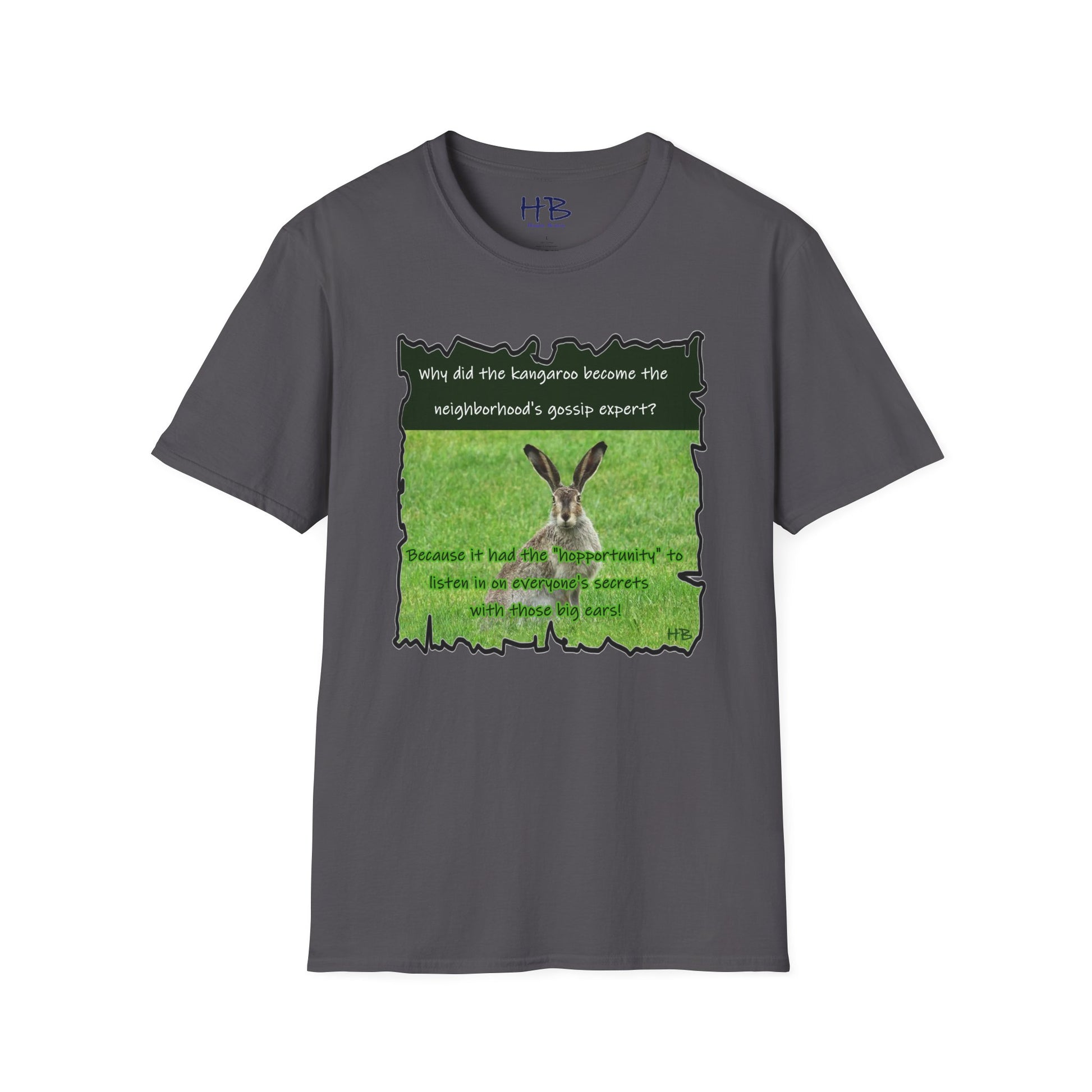 In today's fast-paced world, a tee shirt like this is more than just clothing; it's a conversation starter and a statement piece. As you don this tee, you not only carry the charm of the kangaroo's curiosity but also the power of its impeccable hearing. It serves as a playful reminder that sometimes, we all need to lend an ear to the stories and rumors around us. The kangaroo, with its keen sense of hearing, embodies the art of listening, and it's a reminder that sometimes, the best conversations happen when we truly pay attention.