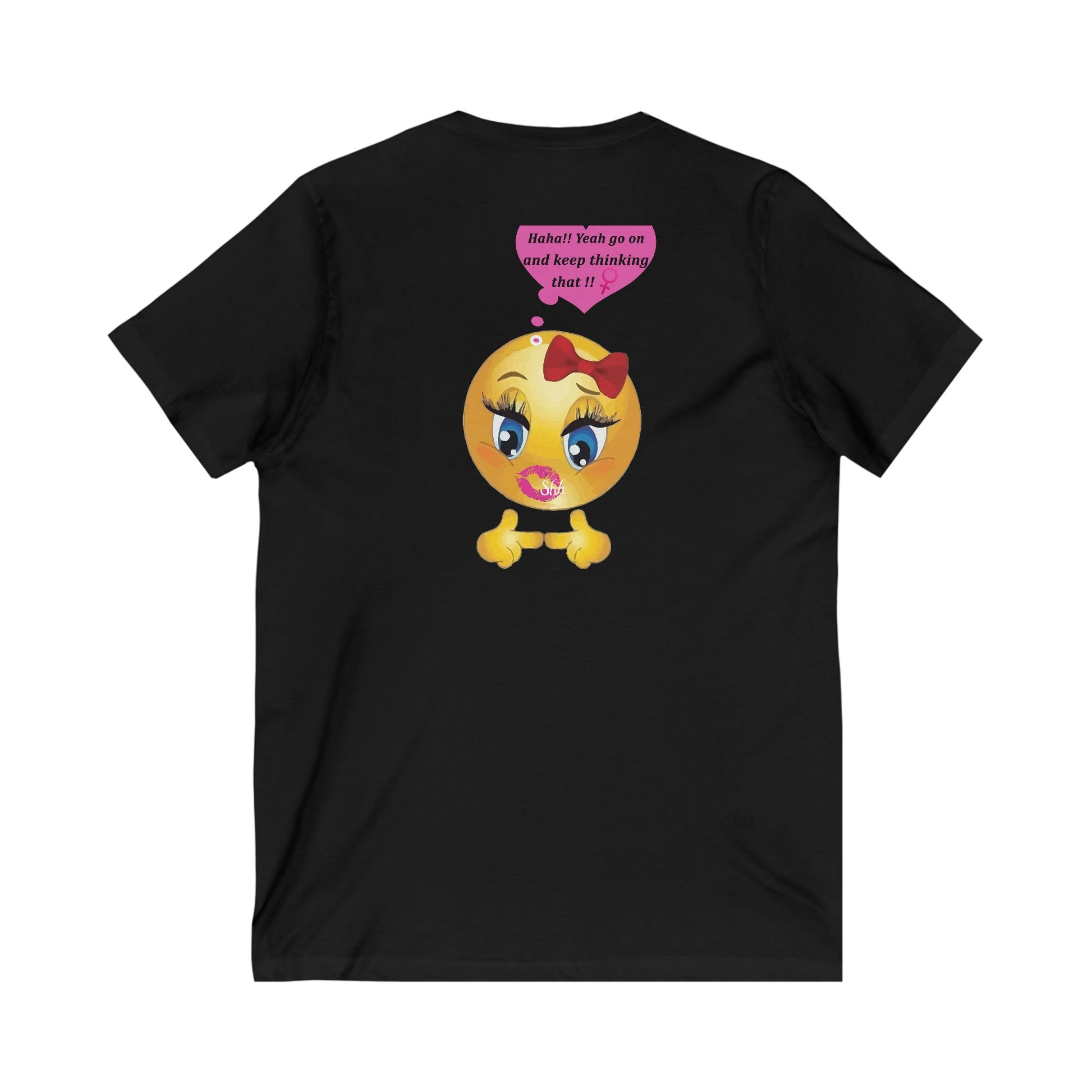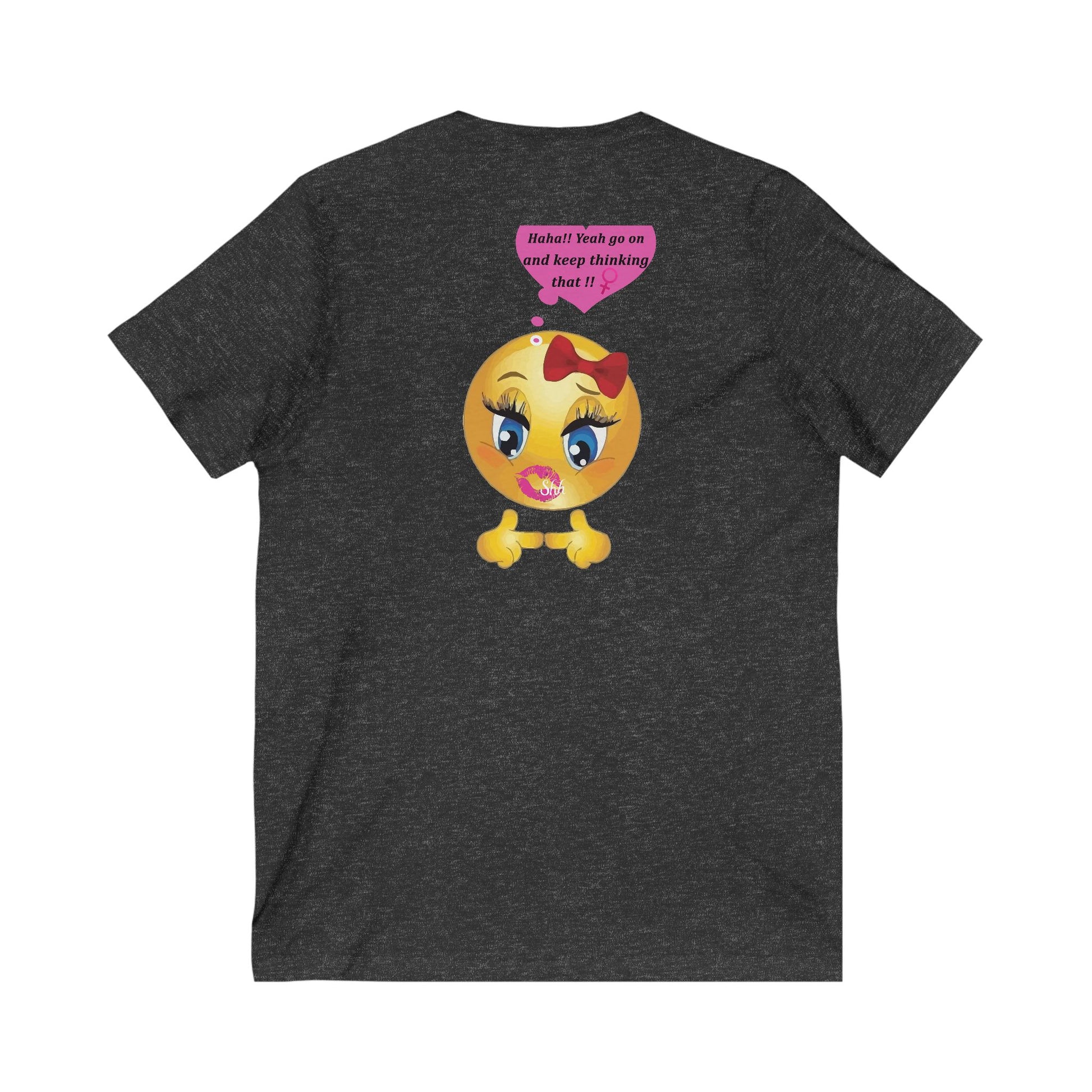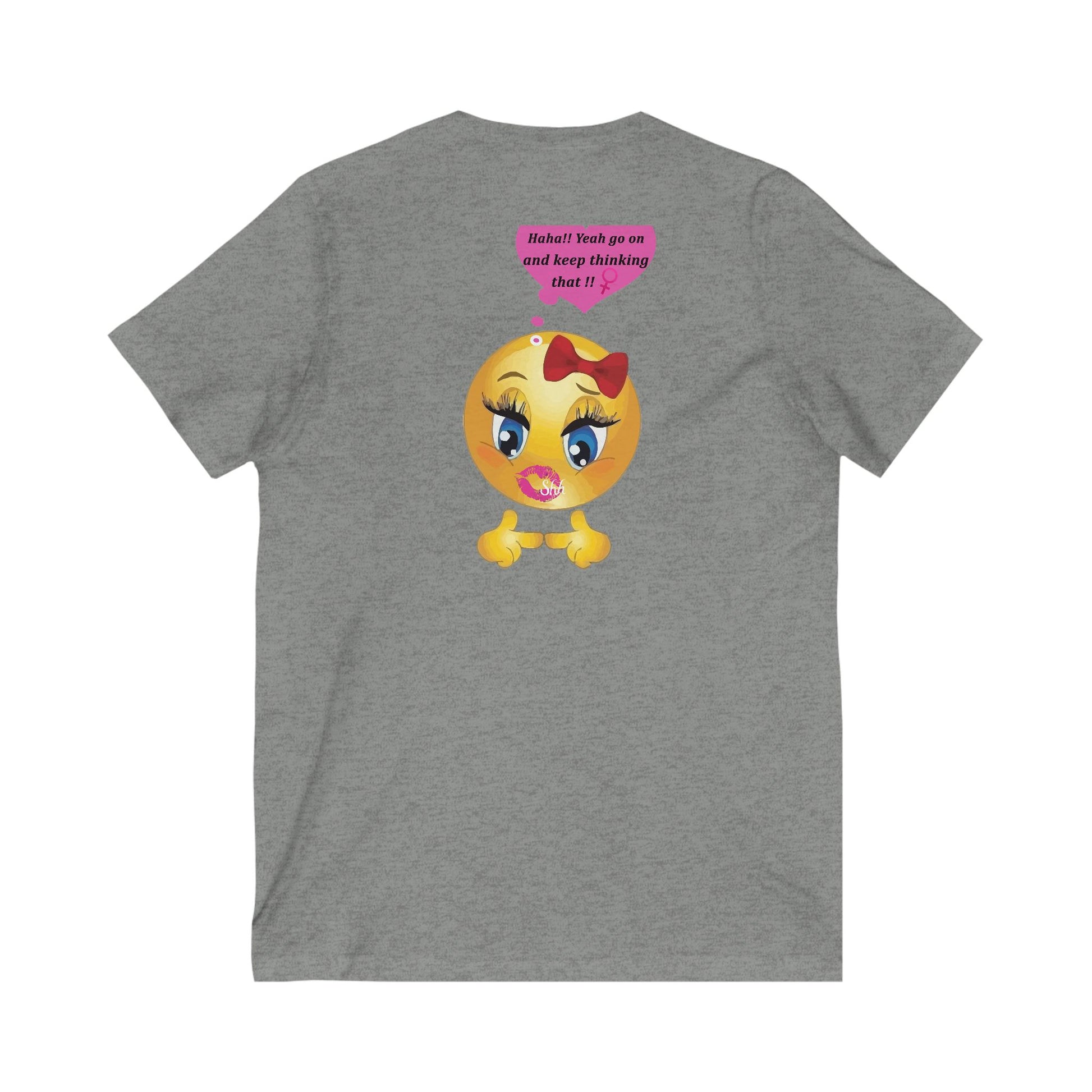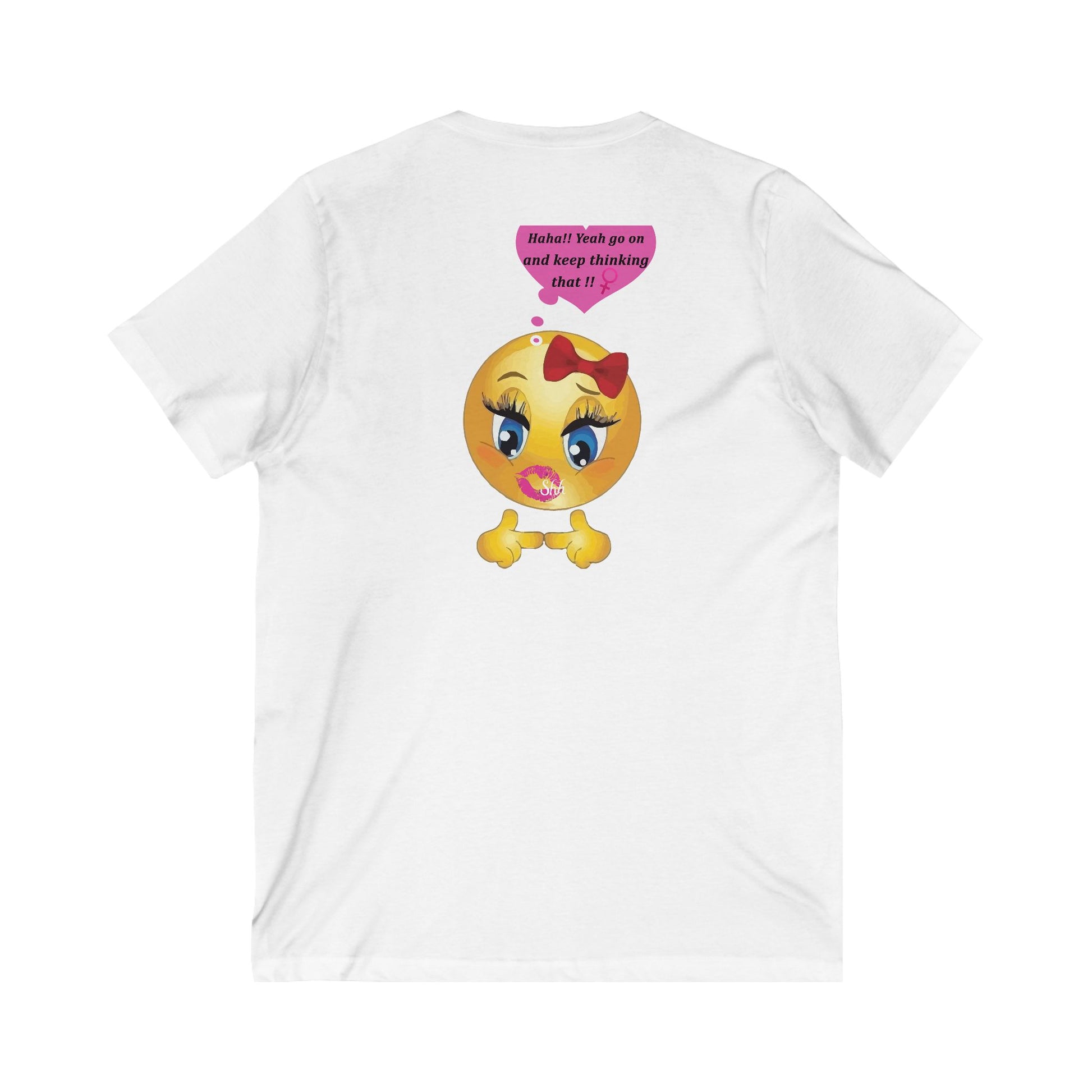 On the back of the tee shirt, there is a very cute emoji of a girl with sexy lips and eyes saying "Haha, yeah go on and keep thinking that," with a female symbol, further emphasizing the joke.