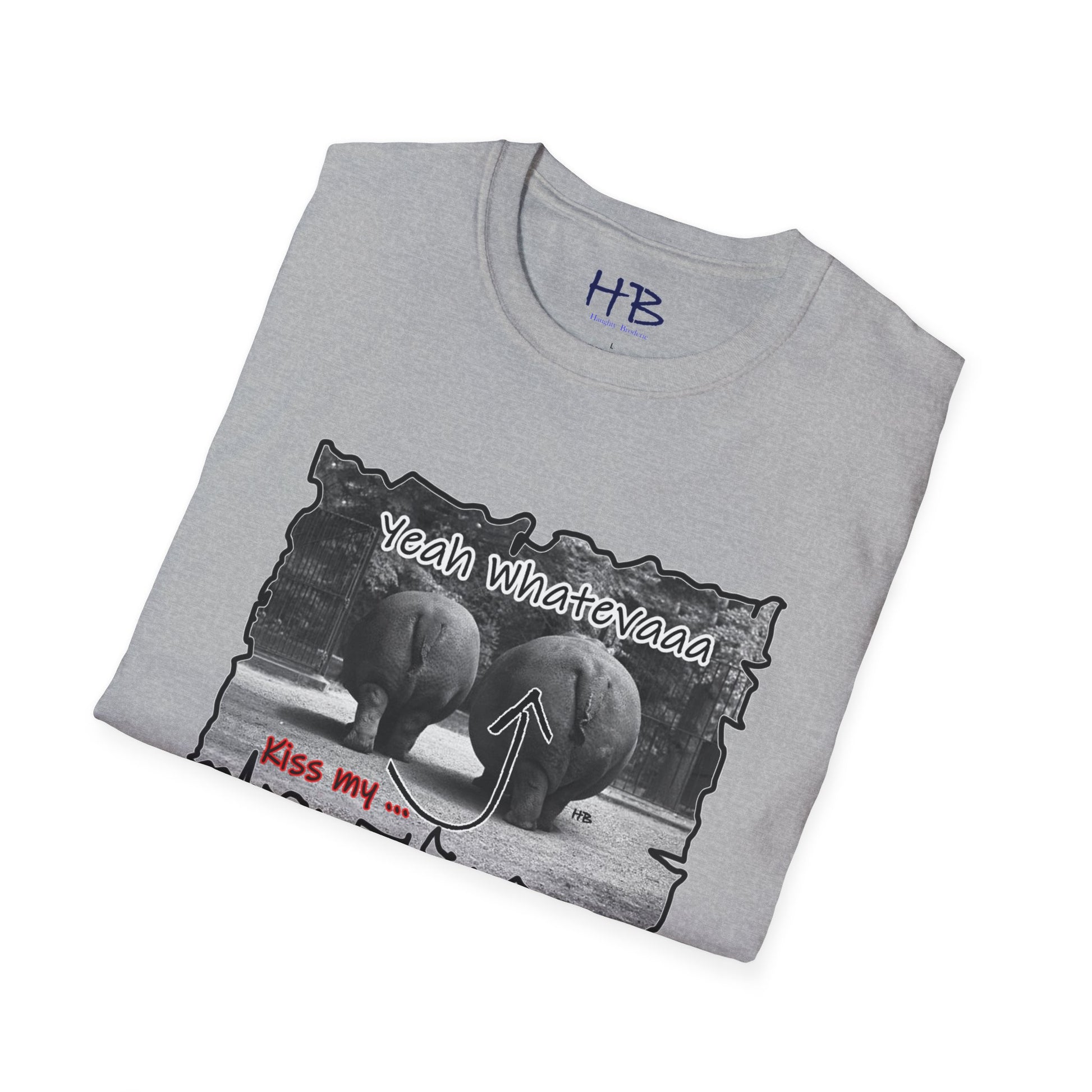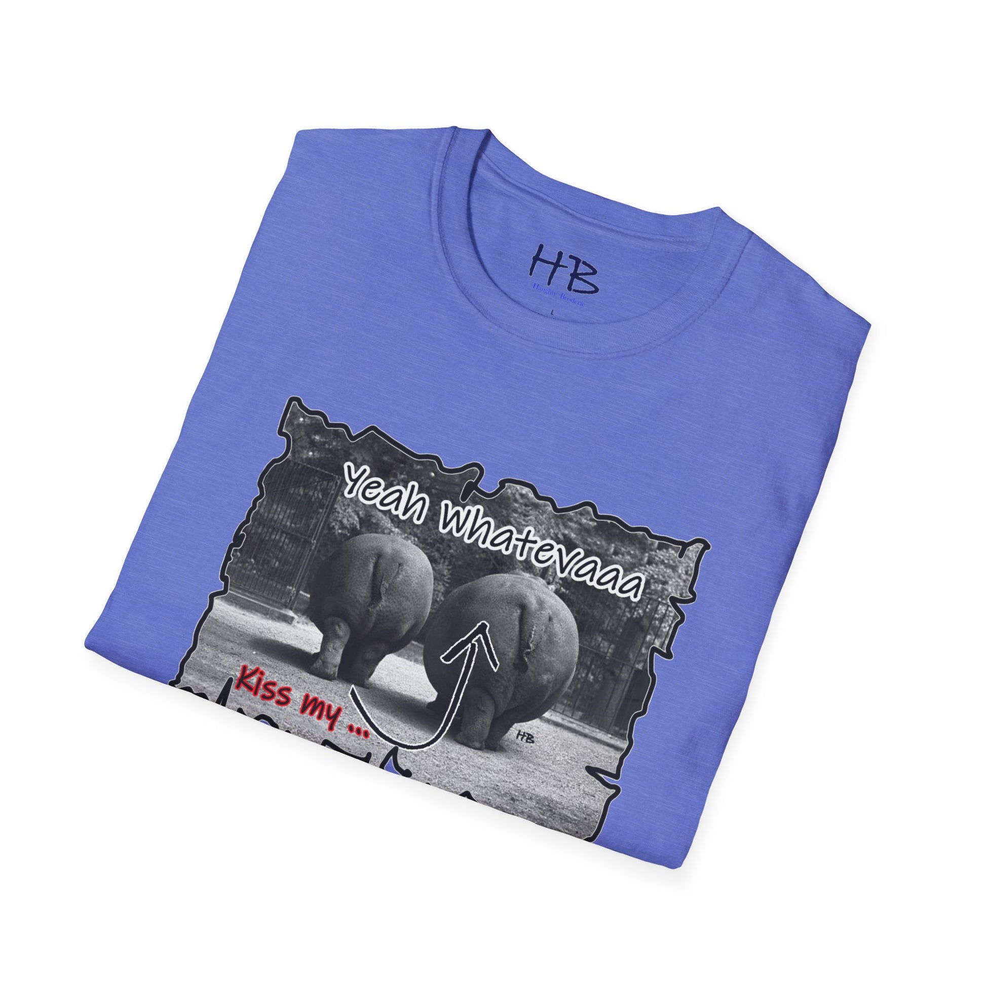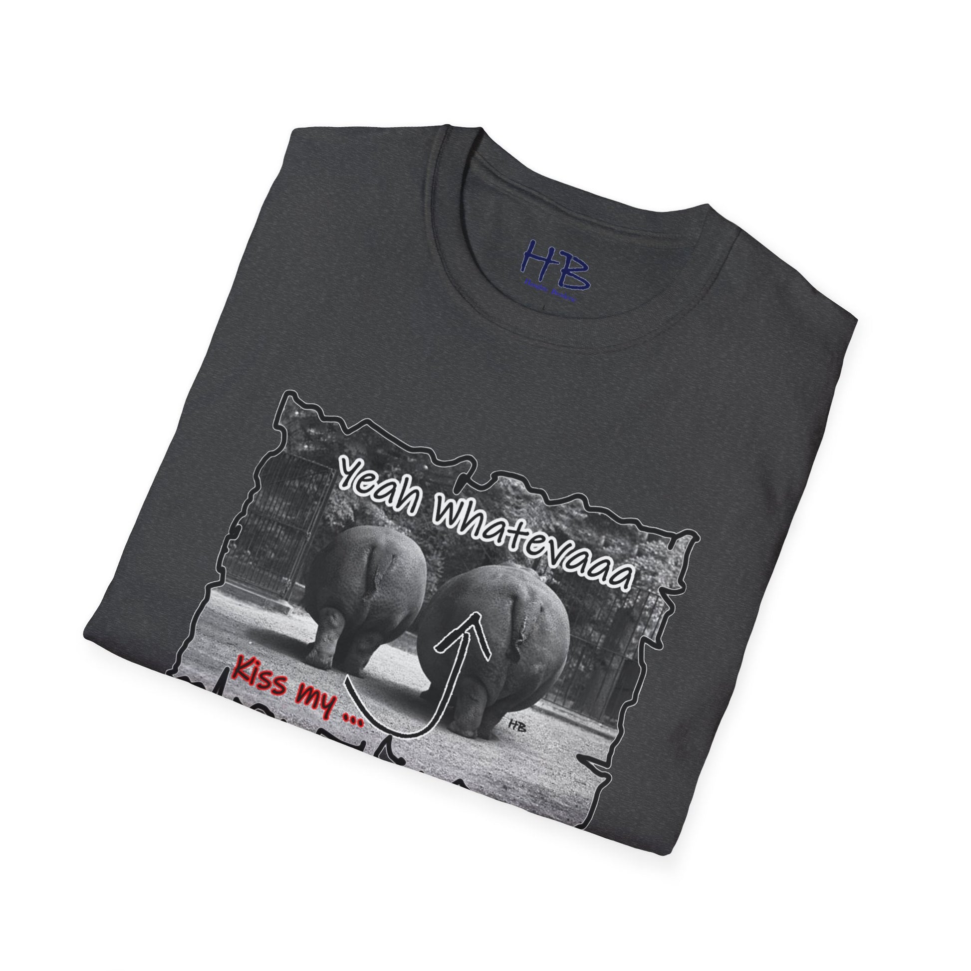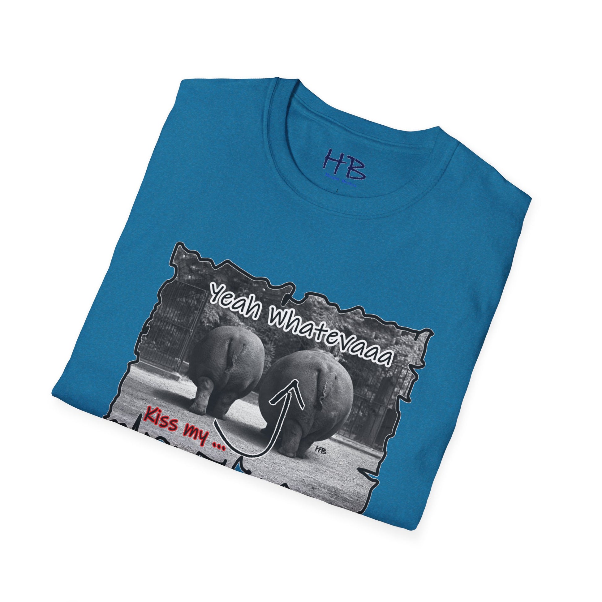 But this tee shirt is more than just an outlet for frustration; it's a reminder that humor can be a powerful antidote to the annoyances of modern life. --- **"Humorous Hippo Image Attire"** **"Irreverent Hippo Backside Tee"** **"Laugh-Inducing Hippo Apparel"** **"Quirky Hippo Graphic Top"** **"Cheeky Hippo Design Garb"** **"Whimsical Hippo Illustration Wear"** **"Sarcastic Hippo Departure Outfit"** **"Witty Hippo Posterior Attire"** **"Hilarious Hippo Graphic Shirt"** **"Amusing Hippo Farewell Tee"** **"Jovial Hippo Exit Apparel"** **"Good-Humored Hippo Parting Garment"** **"Playful Hippo Behind Design"** **"Lighthearted Hippo Graphic Top"** **"Tongue-in-Cheek Hippo Image Wear"** **"Fun-Loving Hippo Departure Shirt"** **"Entertaining Hippo Posterior Attire"** **"Chuckling Hippo Graphic Outfit"** **"Mirthful Hippo Farewell Tee"** **"Grinning Hippo Exit Apparel"** **"Joyous Hippo Farewell Garment"** --- **Universal Relatability:** Everyone encounters exasperating moments, making this tee shirt instantly relatable to people from all walks of life. **Stress Relief:** Wearing this tee shirt can serve as a humorous stress reliever, allowing you to laugh off annoyances. **Subtle Expression:** It provides a subtle and light-hearted way to convey your feelings when words fail you. **Unity Through Humor:** It's a reminder that laughter is a unifying force, bringing people together through shared experiences. **Positive Perspective:** Encouraging people to see the funny side of life's challenges, even when it means saying, "Yeah whatevaaa." **Confidence Booster:** Wearing this tee shirt signifies a carefree attitude and a sense of confidence in the face of annoyance. **Peaceful Parting:** Instead of confrontation, it suggests a peaceful parting of ways when necessary. **Conversation Starter:** It sparks conversations about the quirks of human behavior and the power of humor. **Modern Resilience:** In today's fast-paced world, it's a humorous symbol of resilience, showing that you can face annoyances with a smile. **Empowerment:** By wearing this tee shirt, you empower yourself to tackle everyday irritations with humor and grace. --- This tee shirt is more than just fashion; it's a statement piece that encapsulates the spirit of our times. It reminds us that in a world full of annoyances, a good laugh can be the best response. So, step out with a smile, and let the world know that when faced with exasperation, you can always say, "Yeah whatevaaa. Kiss my..." --- The unisex soft-style t-shirt puts a new spin on casual comfort.