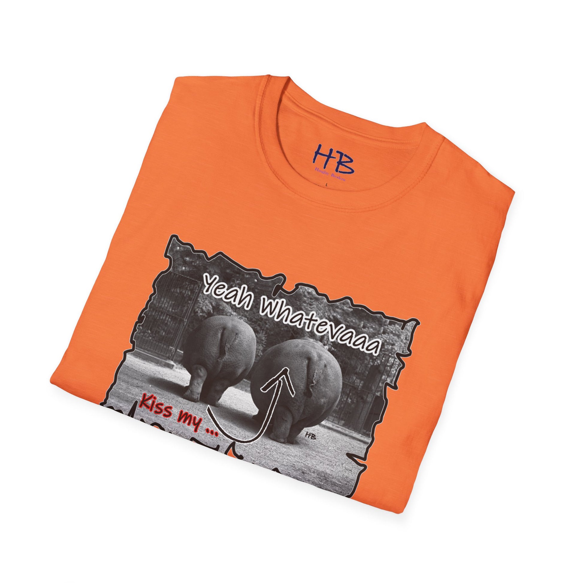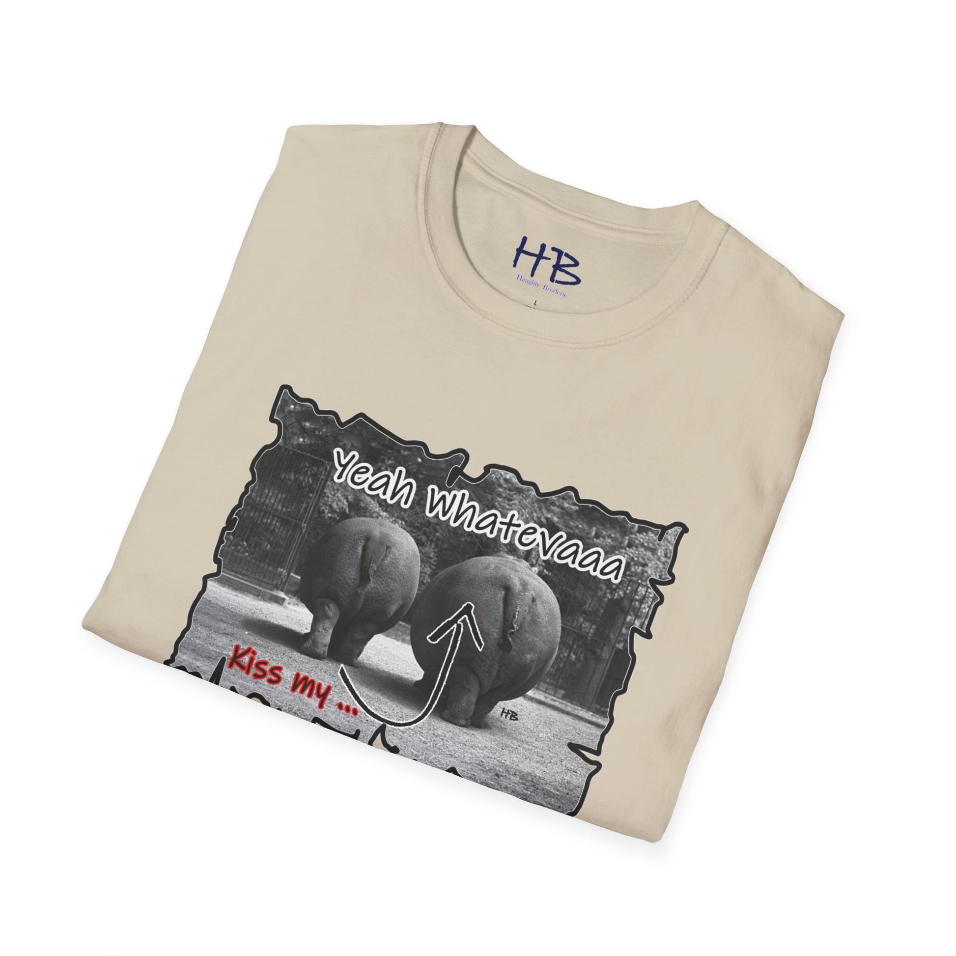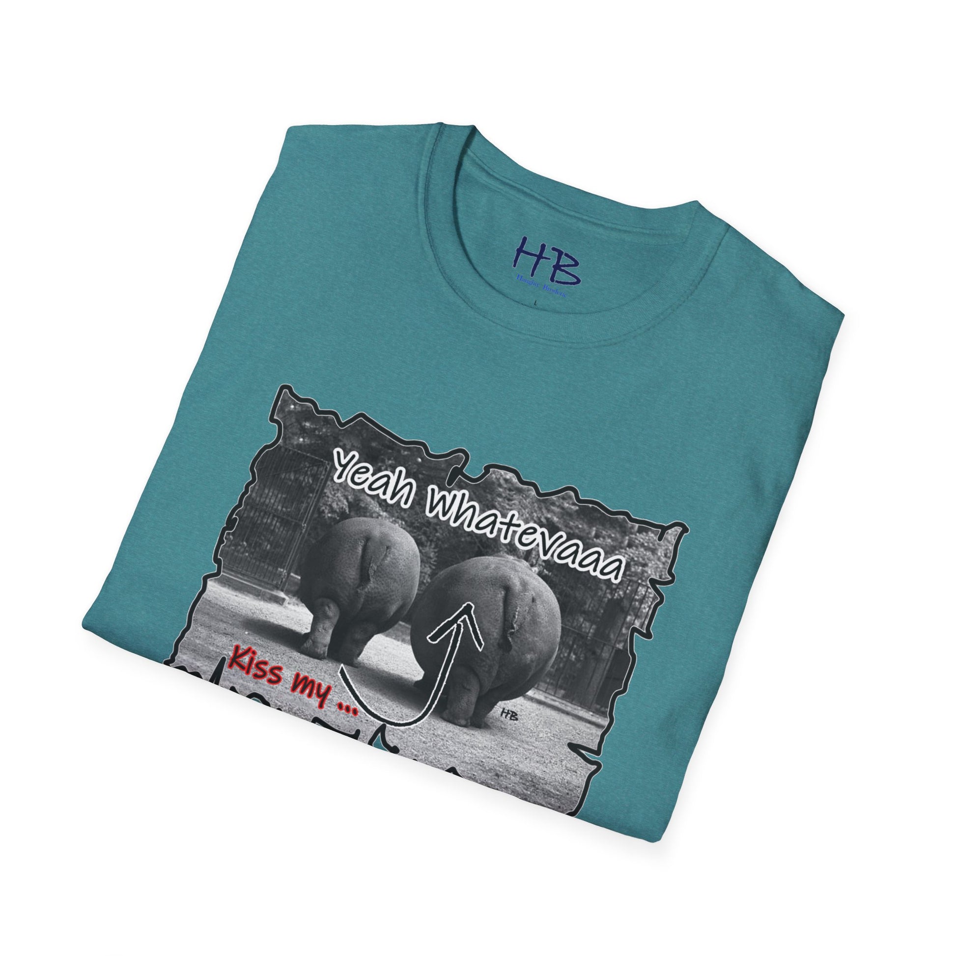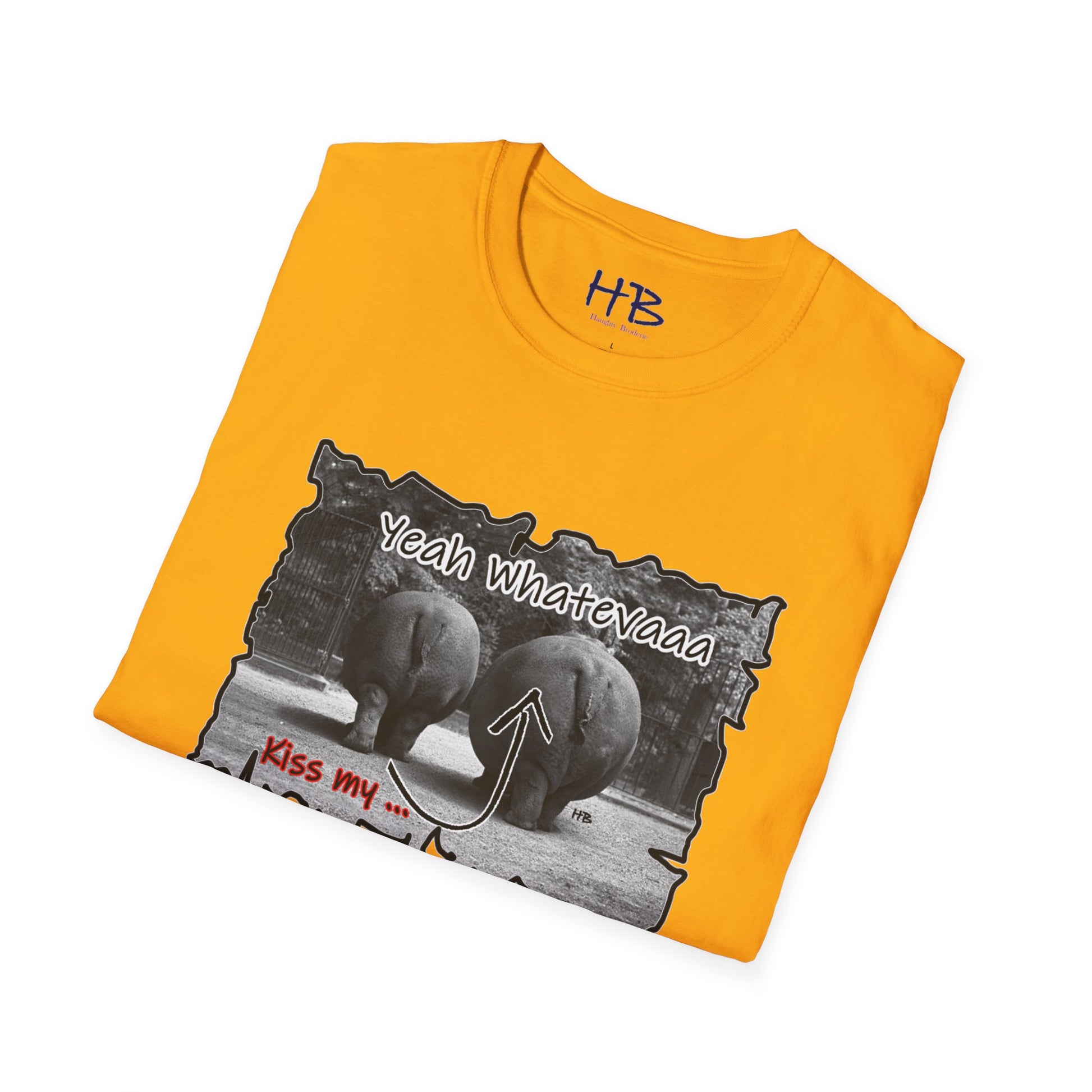 But this tee shirt is more than just an outlet for frustration; it's a reminder that humor can be a powerful antidote to the annoyances of modern life. --- **"Humorous Hippo Image Attire"** **"Irreverent Hippo Backside Tee"** **"Laugh-Inducing Hippo Apparel"** **"Quirky Hippo Graphic Top"** **"Cheeky Hippo Design Garb"** **"Whimsical Hippo Illustration Wear"** **"Sarcastic Hippo Departure Outfit"** **"Witty Hippo Posterior Attire"** **"Hilarious Hippo Graphic Shirt"** **"Amusing Hippo Farewell Tee"** **"Jovial Hippo Exit Apparel"** **"Good-Humored Hippo Parting Garment"** **"Playful Hippo Behind Design"** **"Lighthearted Hippo Graphic Top"** **"Tongue-in-Cheek Hippo Image Wear"** **"Fun-Loving Hippo Departure Shirt"** **"Entertaining Hippo Posterior Attire"** **"Chuckling Hippo Graphic Outfit"** **"Mirthful Hippo Farewell Tee"** **"Grinning Hippo Exit Apparel"** **"Joyous Hippo Farewell Garment"** --- **Universal Relatability:** Everyone encounters exasperating moments, making this tee shirt instantly relatable to people from all walks of life. **Stress Relief:** Wearing this tee shirt can serve as a humorous stress reliever, allowing you to laugh off annoyances. **Subtle Expression:** It provides a subtle and light-hearted way to convey your feelings when words fail you. **Unity Through Humor:** It's a reminder that laughter is a unifying force, bringing people together through shared experiences. **Positive Perspective:** Encouraging people to see the funny side of life's challenges, even when it means saying, "Yeah whatevaaa." **Confidence Booster:** Wearing this tee shirt signifies a carefree attitude and a sense of confidence in the face of annoyance. **Peaceful Parting:** Instead of confrontation, it suggests a peaceful parting of ways when necessary. **Conversation Starter:** It sparks conversations about the quirks of human behavior and the power of humor. **Modern Resilience:** In today's fast-paced world, it's a humorous symbol of resilience, showing that you can face annoyances with a smile. **Empowerment:** By wearing this tee shirt, you empower yourself to tackle everyday irritations with humor and grace. --- This tee shirt is more than just fashion; it's a statement piece that encapsulates the spirit of our times. It reminds us that in a world full of annoyances, a good laugh can be the best response. So, step out with a smile, and let the world know that when faced with exasperation, you can always say, "Yeah whatevaaa. Kiss my..." --- The unisex soft-style t-shirt puts a new spin on casual comfort.