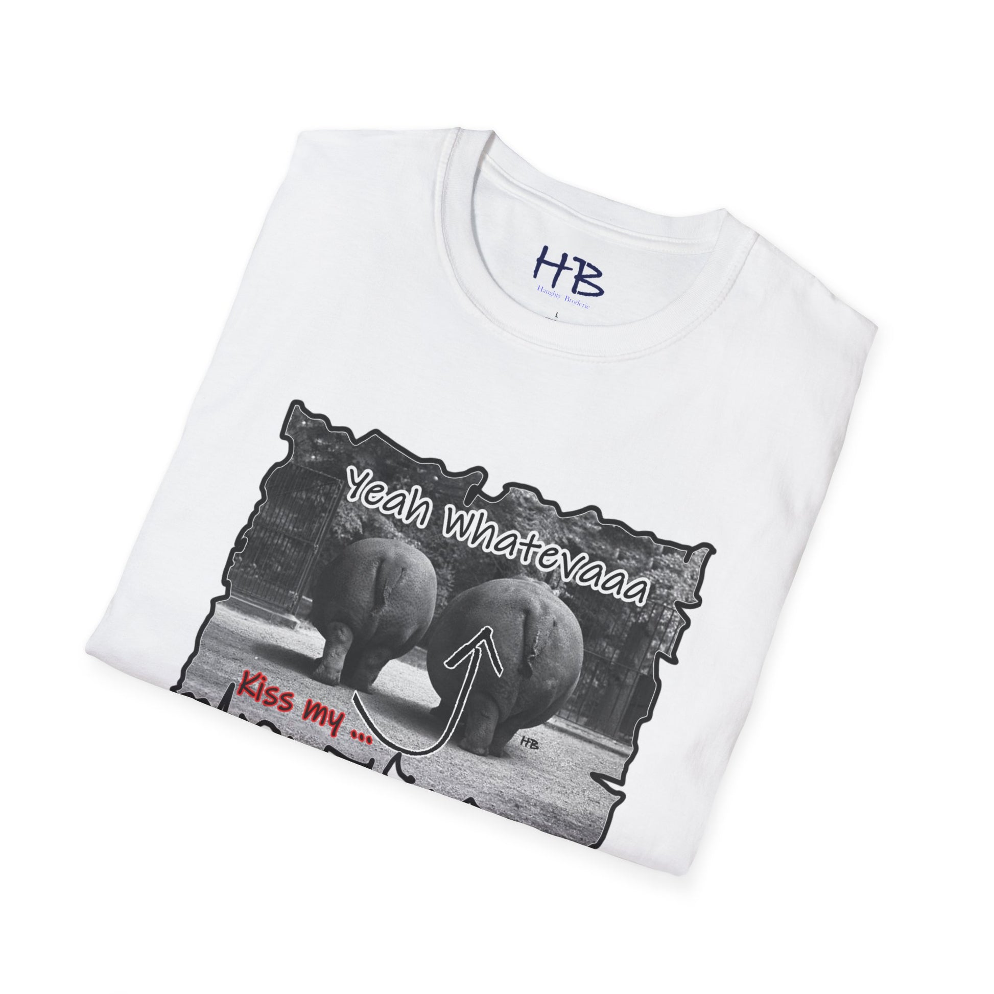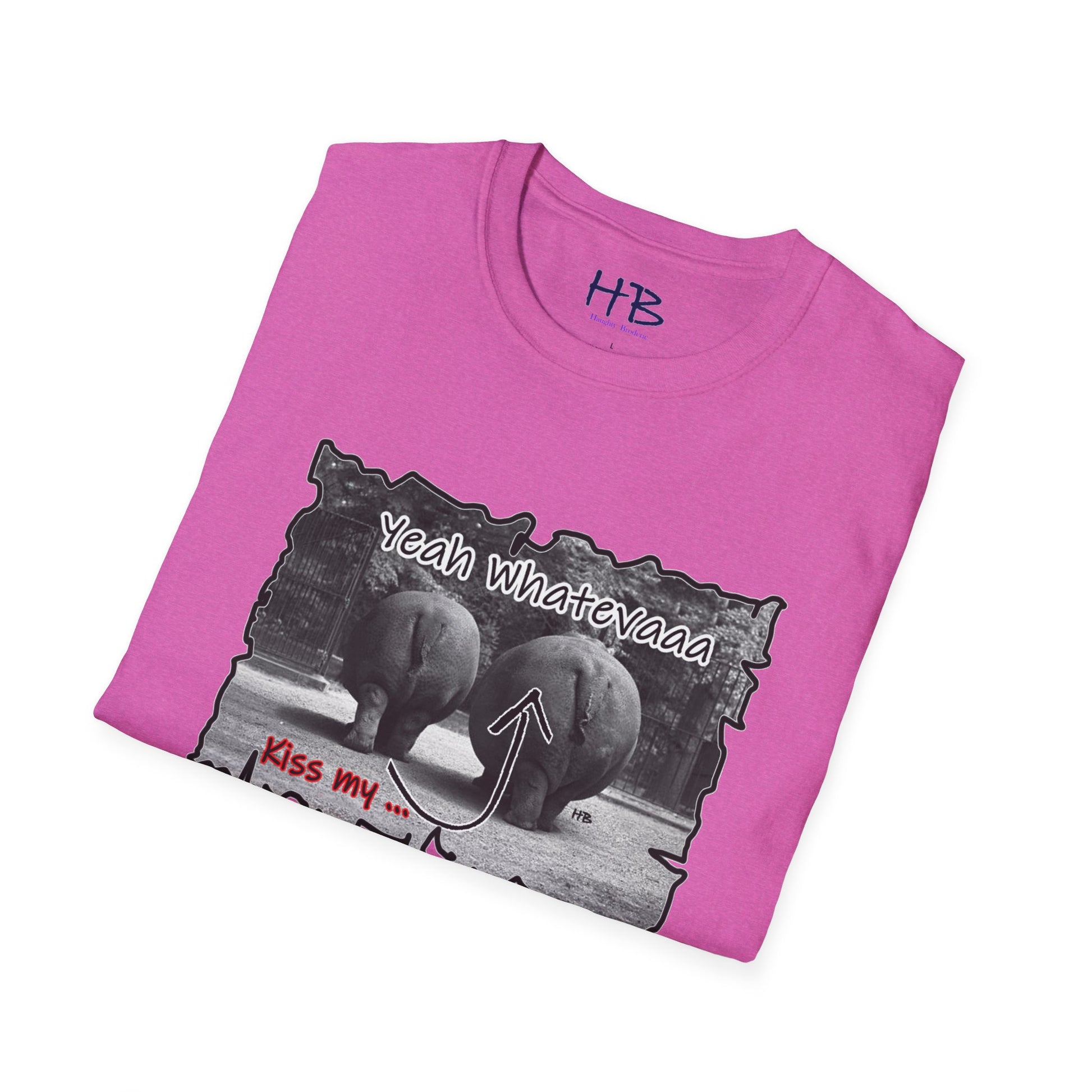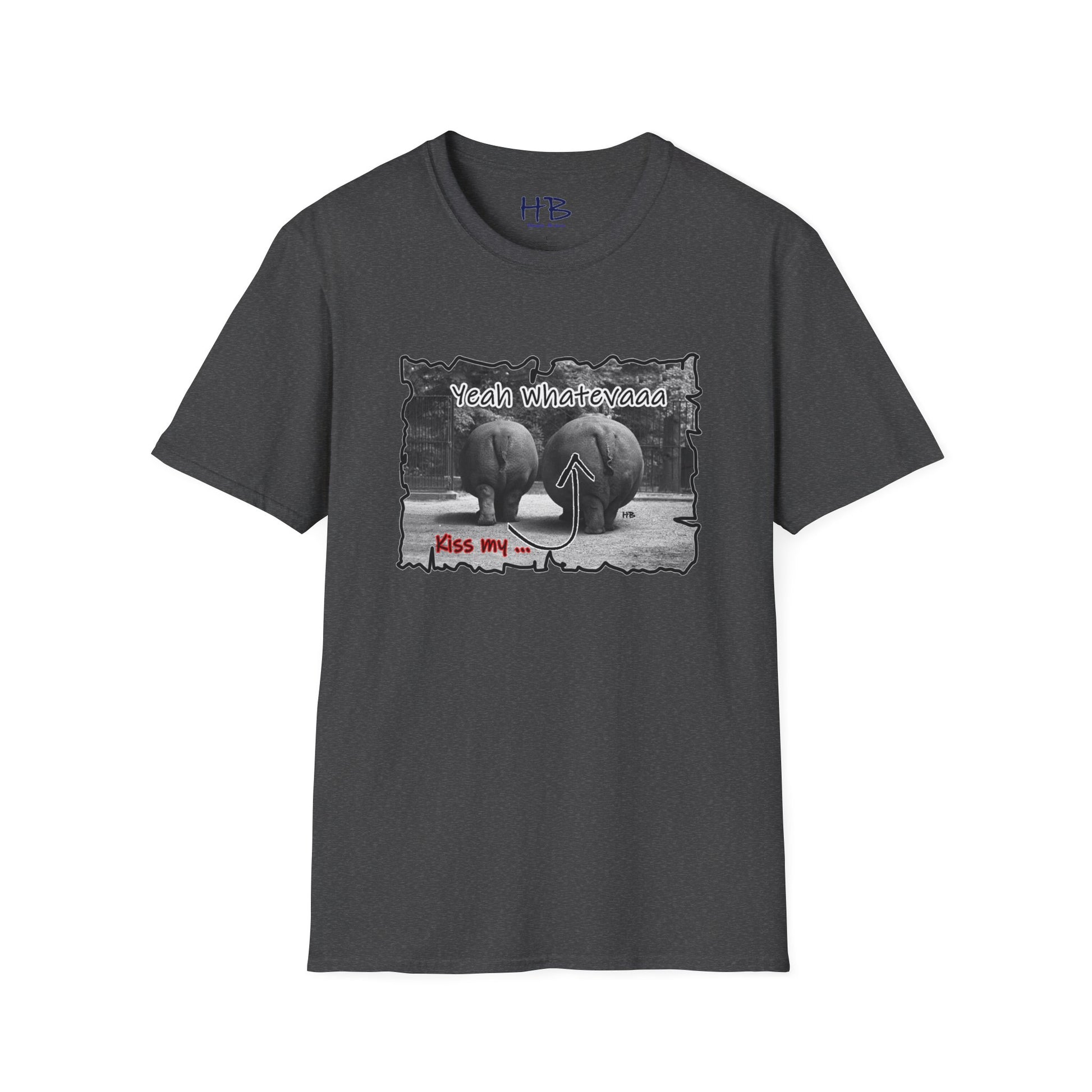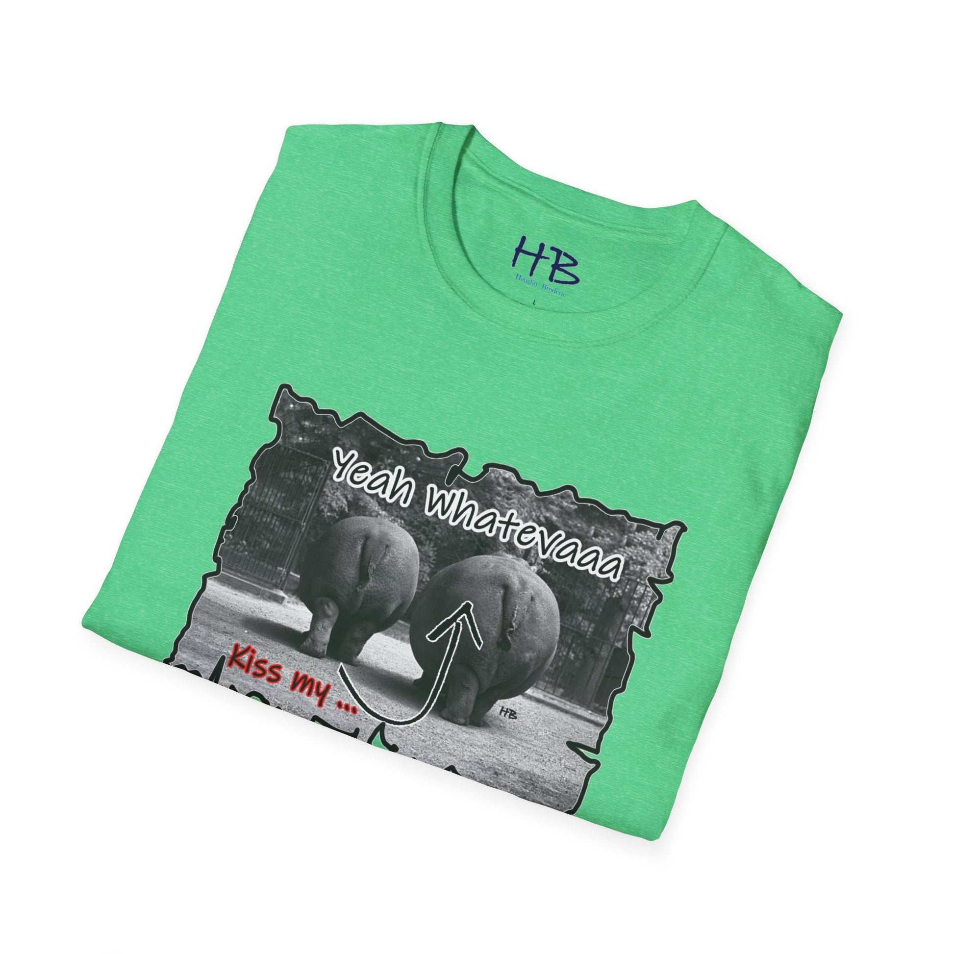 But this tee shirt is more than just an outlet for frustration; it's a reminder that humor can be a powerful antidote to the annoyances of modern life. --- **"Humorous Hippo Image Attire"** **"Irreverent Hippo Backside Tee"** **"Laugh-Inducing Hippo Apparel"** **"Quirky Hippo Graphic Top"** **"Cheeky Hippo Design Garb"** **"Whimsical Hippo Illustration Wear"** **"Sarcastic Hippo Departure Outfit"** **"Witty Hippo Posterior Attire"** **"Hilarious Hippo Graphic Shirt"** **"Amusing Hippo Farewell Tee"** **"Jovial Hippo Exit Apparel"** **"Good-Humored Hippo Parting Garment"** **"Playful Hippo Behind Design"** **"Lighthearted Hippo Graphic Top"** **"Tongue-in-Cheek Hippo Image Wear"** **"Fun-Loving Hippo Departure Shirt"** **"Entertaining Hippo Posterior Attire"** **"Chuckling Hippo Graphic Outfit"** **"Mirthful Hippo Farewell Tee"** **"Grinning Hippo Exit Apparel"** **"Joyous Hippo Farewell Garment"** --- **Universal Relatability:** Everyone encounters exasperating moments, making this tee shirt instantly relatable to people from all walks of life. **Stress Relief:** Wearing this tee shirt can serve as a humorous stress reliever, allowing you to laugh off annoyances. **Subtle Expression:** It provides a subtle and light-hearted way to convey your feelings when words fail you. **Unity Through Humor:** It's a reminder that laughter is a unifying force, bringing people together through shared experiences. **Positive Perspective:** Encouraging people to see the funny side of life's challenges, even when it means saying, "Yeah whatevaaa." **Confidence Booster:** Wearing this tee shirt signifies a carefree attitude and a sense of confidence in the face of annoyance. **Peaceful Parting:** Instead of confrontation, it suggests a peaceful parting of ways when necessary. **Conversation Starter:** It sparks conversations about the quirks of human behavior and the power of humor. **Modern Resilience:** In today's fast-paced world, it's a humorous symbol of resilience, showing that you can face annoyances with a smile. **Empowerment:** By wearing this tee shirt, you empower yourself to tackle everyday irritations with humor and grace. --- This tee shirt is more than just fashion; it's a statement piece that encapsulates the spirit of our times. It reminds us that in a world full of annoyances, a good laugh can be the best response. So, step out with a smile, and let the world know that when faced with exasperation, you can always say, "Yeah whatevaaa. Kiss my..." --- The unisex soft-style t-shirt puts a new spin on casual comfort.