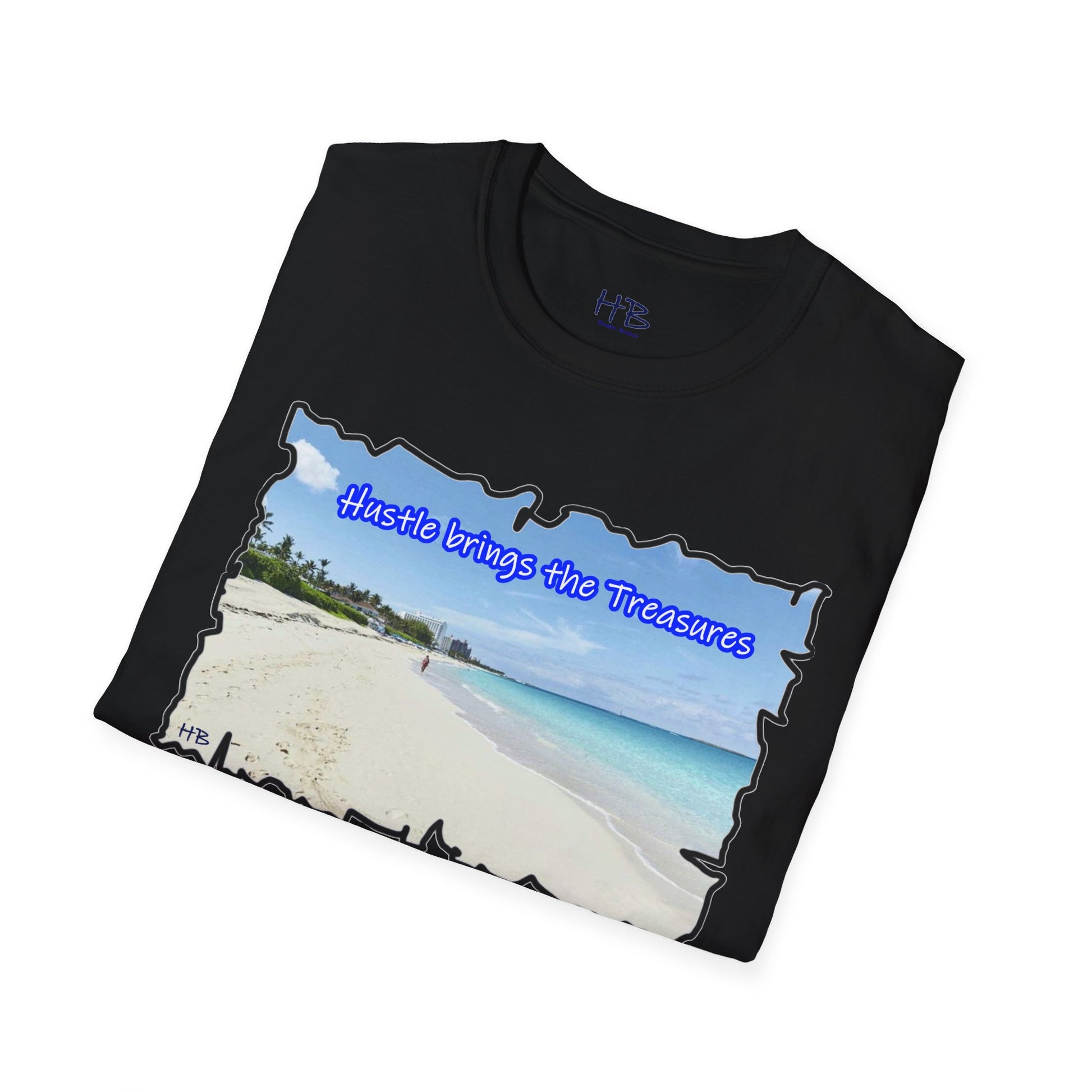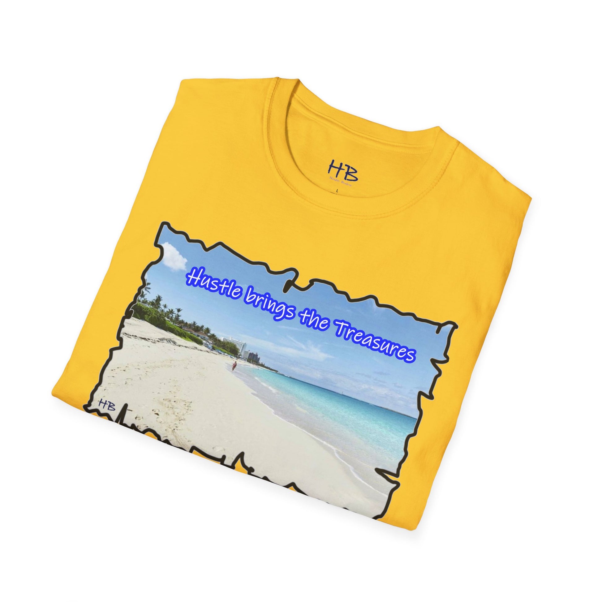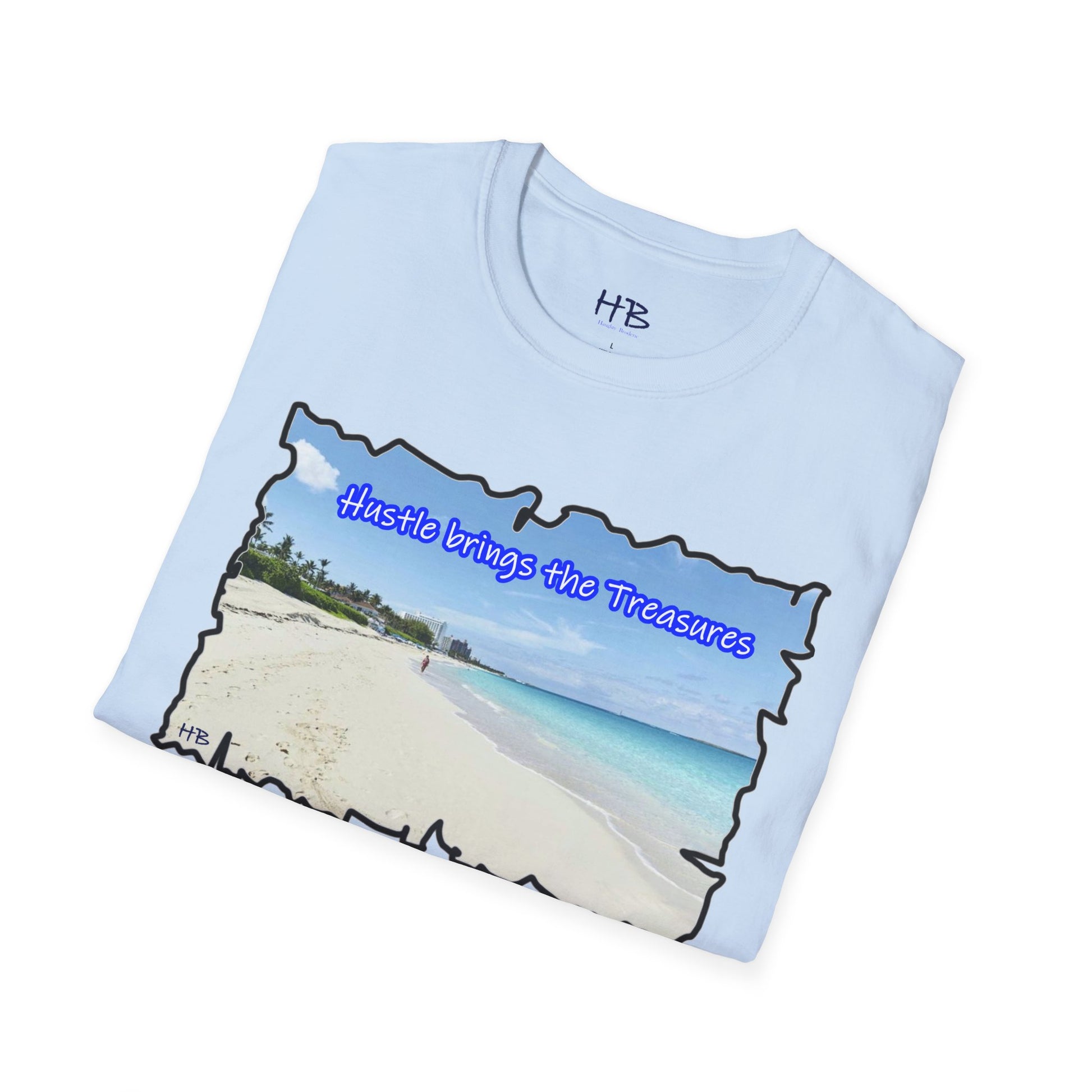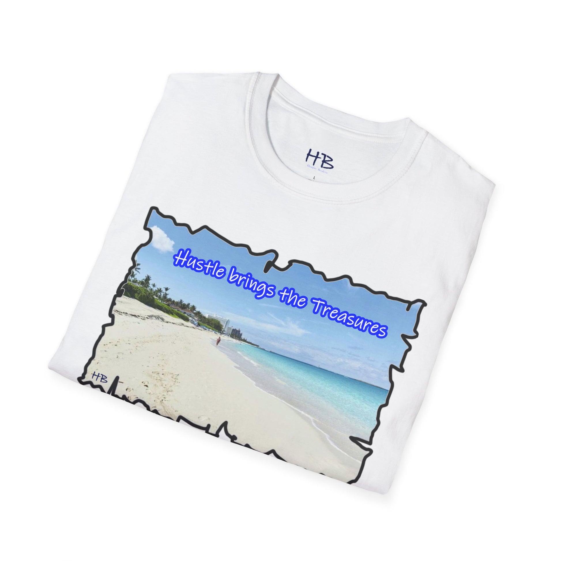 Immerse yourself in the allure of this paradisiacal image that serves as a visual ode to the relentless pursuit of dreams. The text, "Hustle brings the Treasures," is a poignant reminder that hard work paves the way to idyllic islands and well-deserved vacations. This t-shirt encapsulates the essence of perseverance, ambition, and the tangible rewards that come from the grind.
