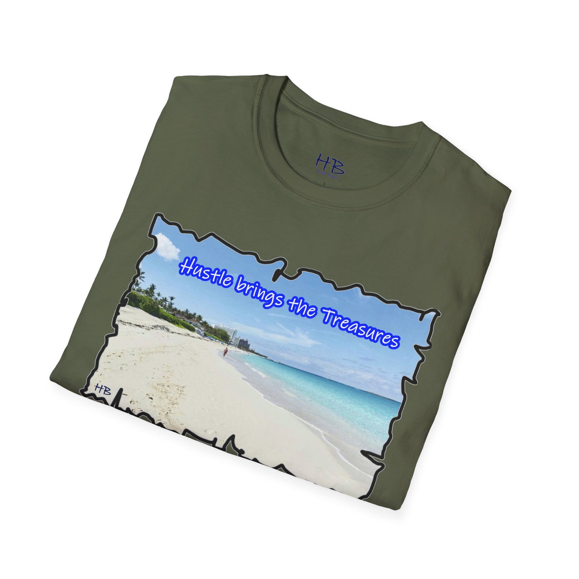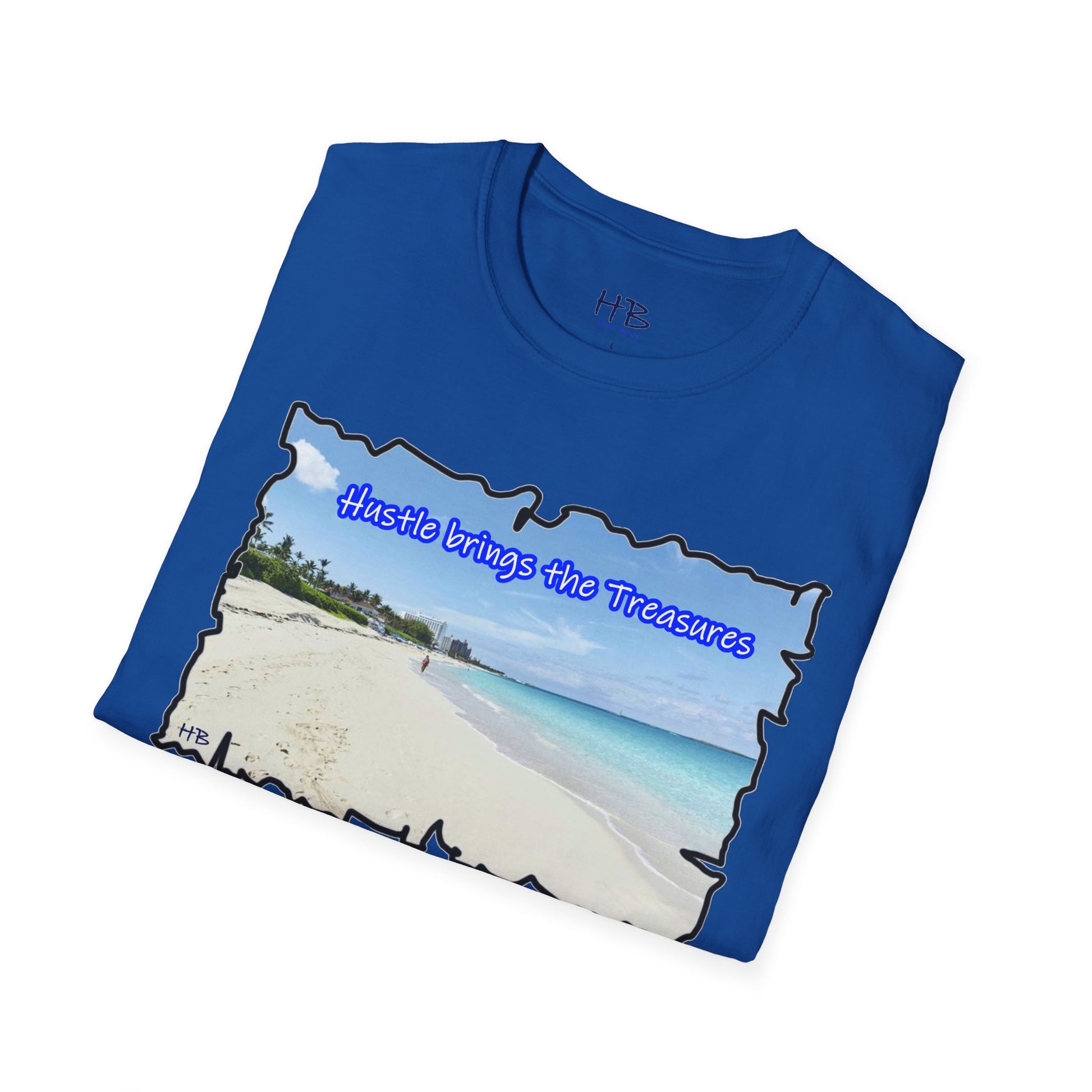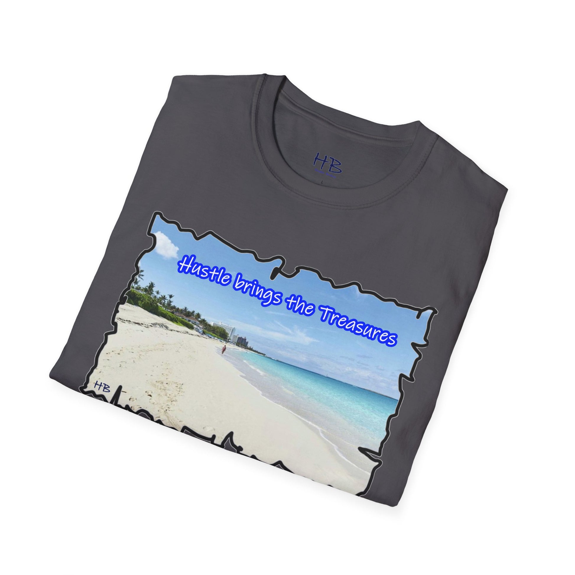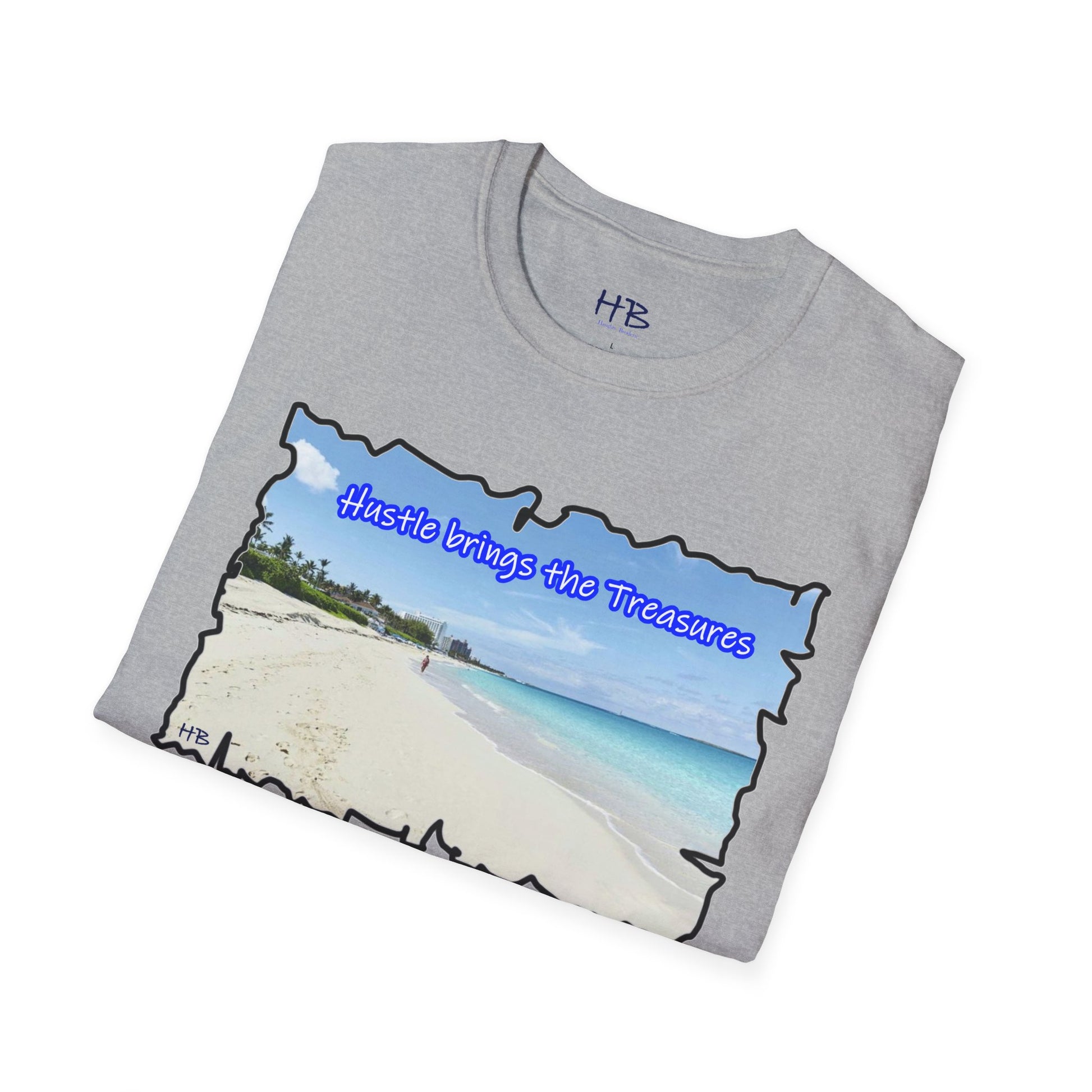 Immerse yourself in the allure of this paradisiacal image that serves as a visual ode to the relentless pursuit of dreams. The text, "Hustle brings the Treasures," is a poignant reminder that hard work paves the way to idyllic islands and well-deserved vacations. This t-shirt encapsulates the essence of perseverance, ambition, and the tangible rewards that come from the grind.