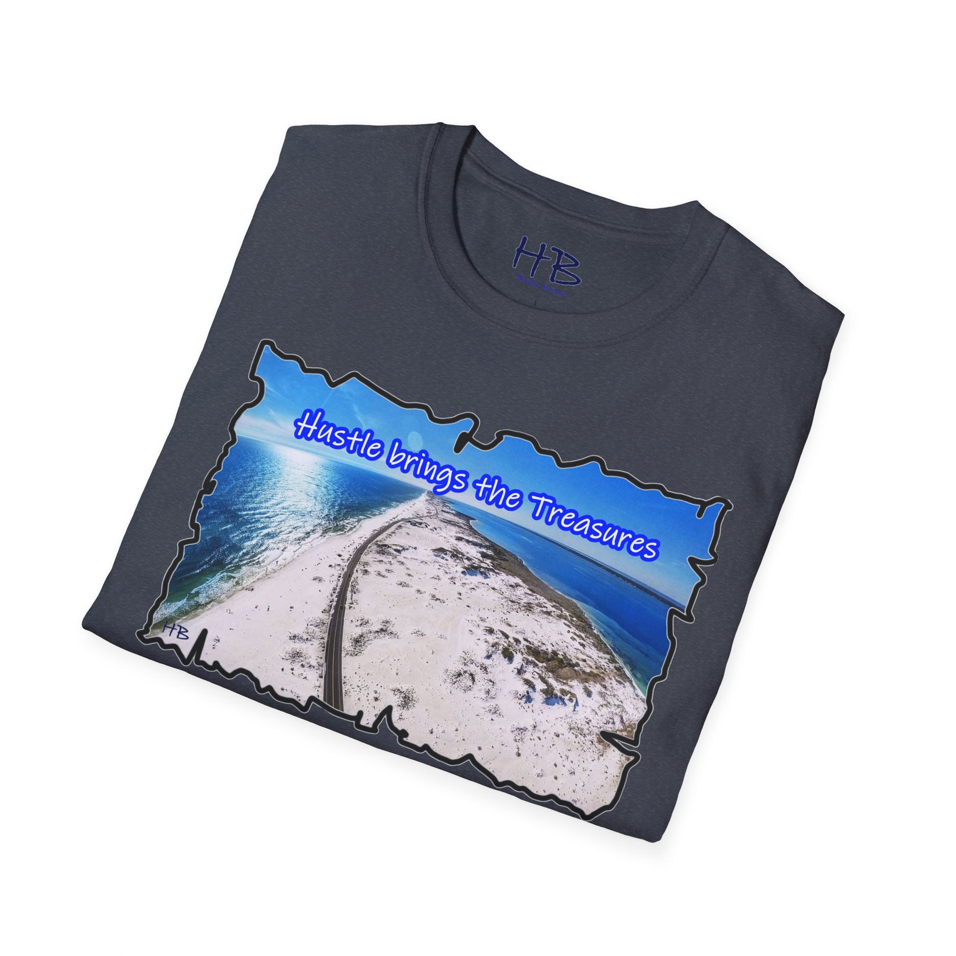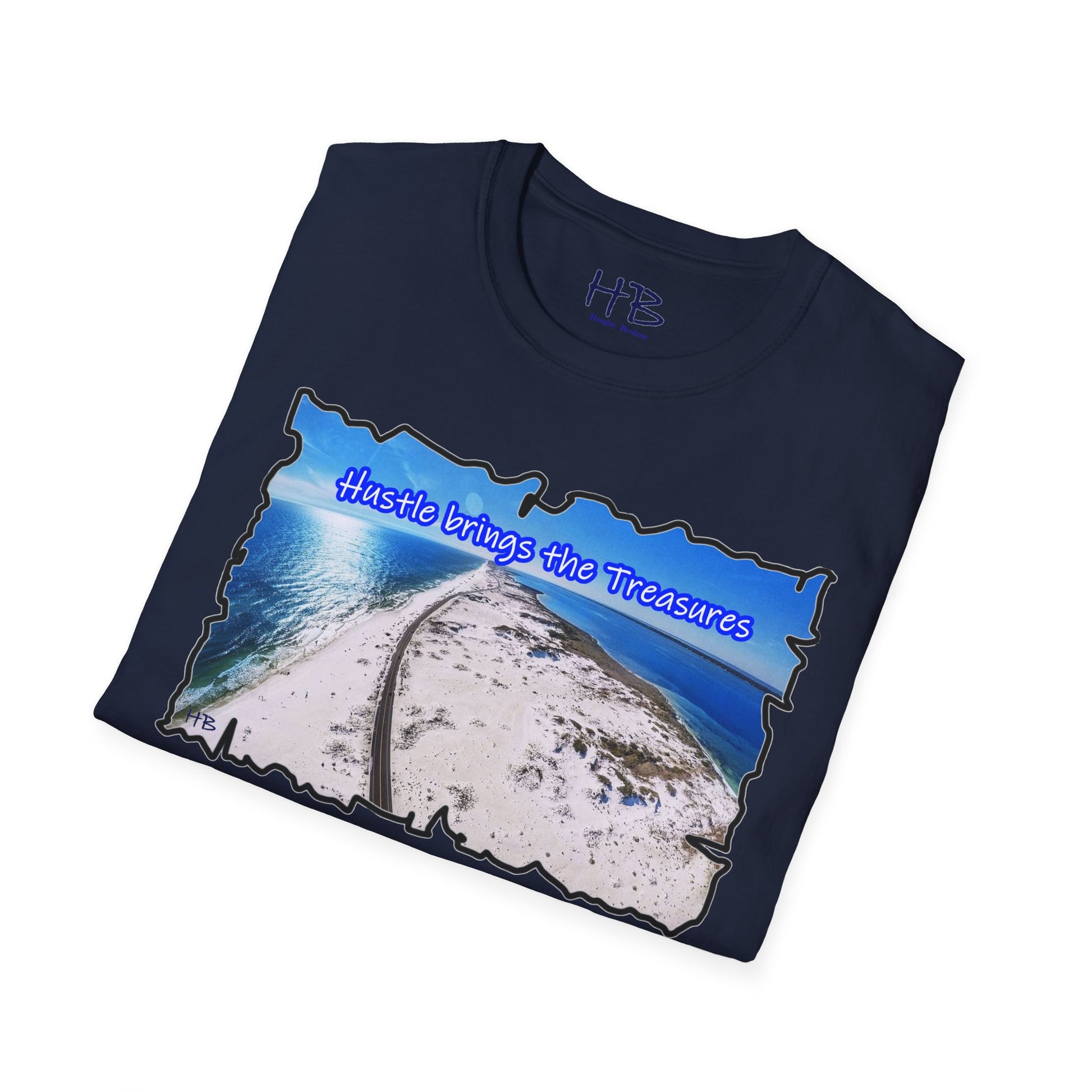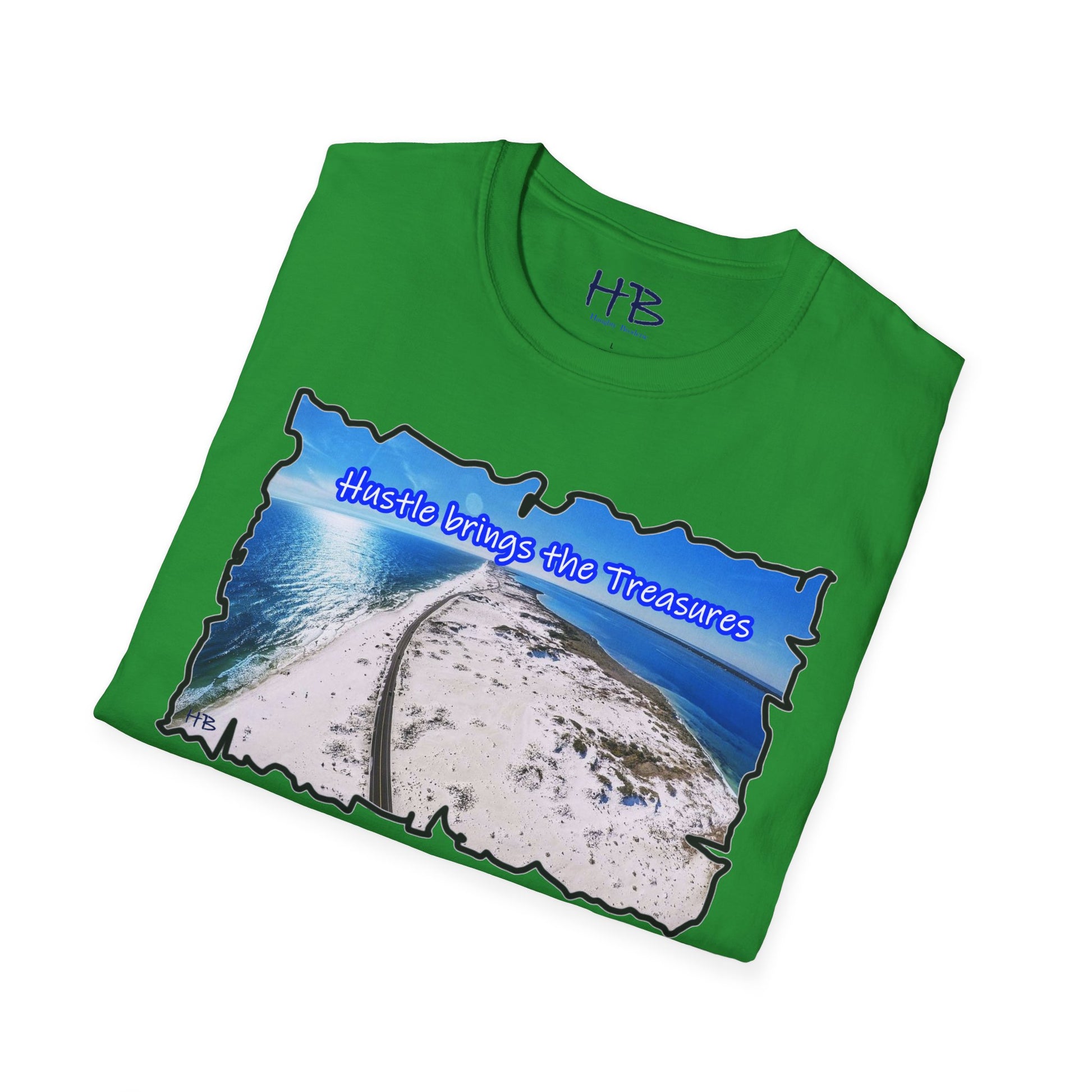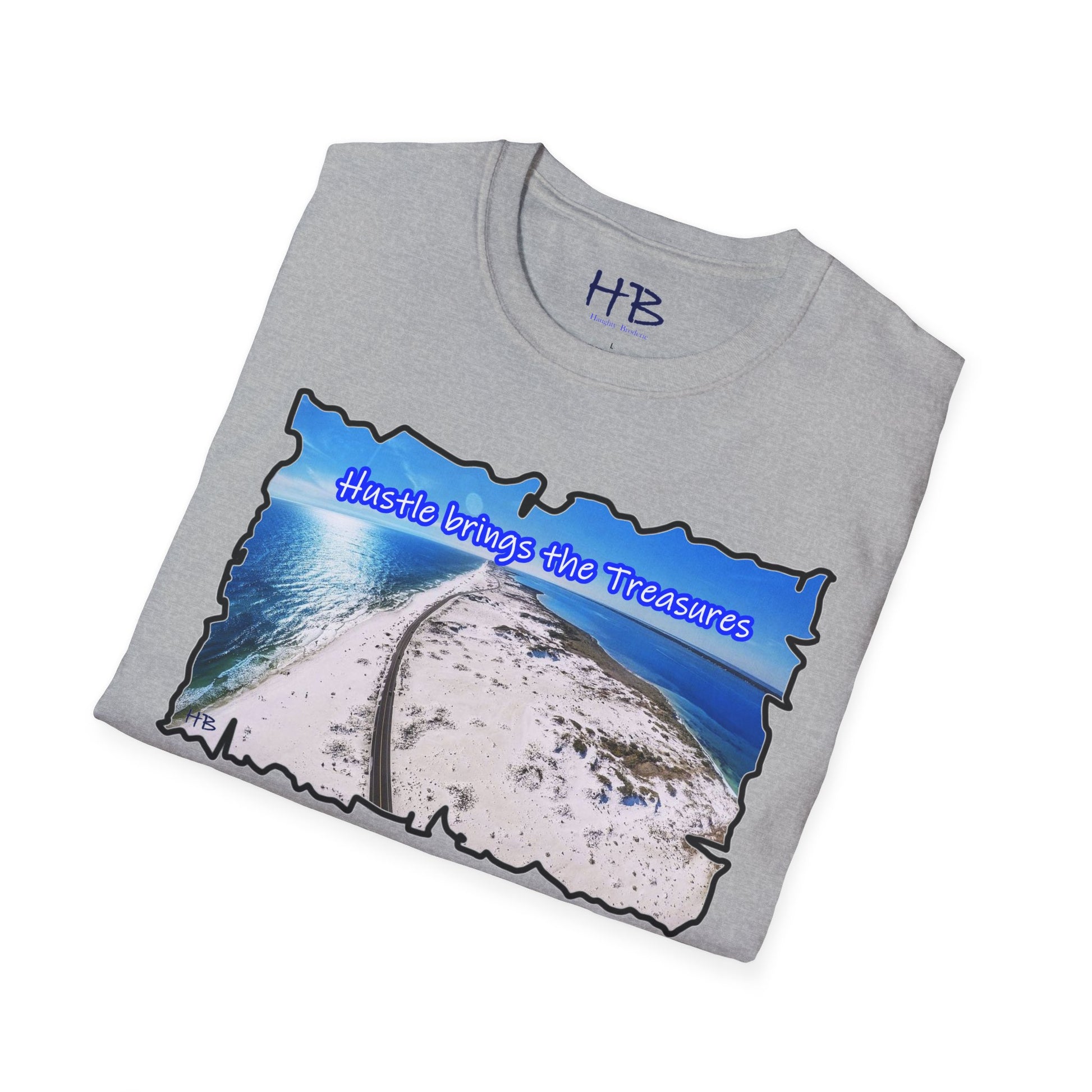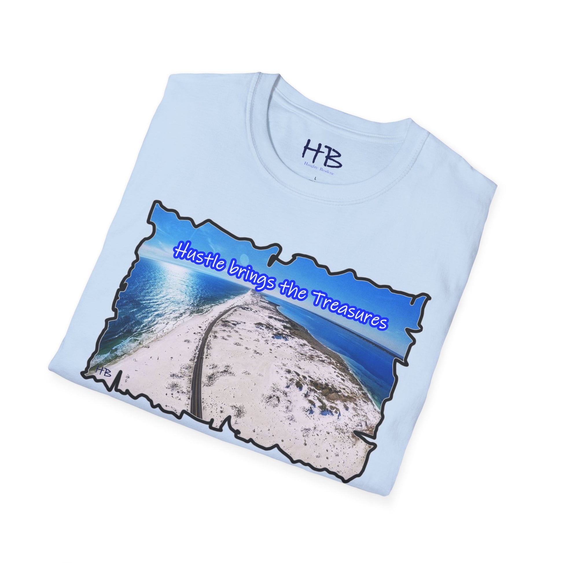 Embark on a sartorial journey with our exclusive "Hustle Brings the Treasures" masterpiece, an embodiment of aspiration and triumph encapsulated on the fabric of a finely crafted t-shirt. Picture this: a scenic panorama unfolds, a sought-after touristic haven stretching its azure embrace along a meandering highway, revealing an oceanic majesty that sweeps from left to right. The image beckons with the promise of pristine shores and rejuvenating vistas, a visual testament to the belief that dedication and hard work lead to the ultimate rewards.