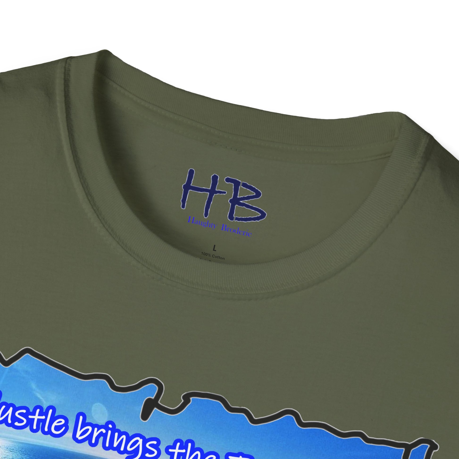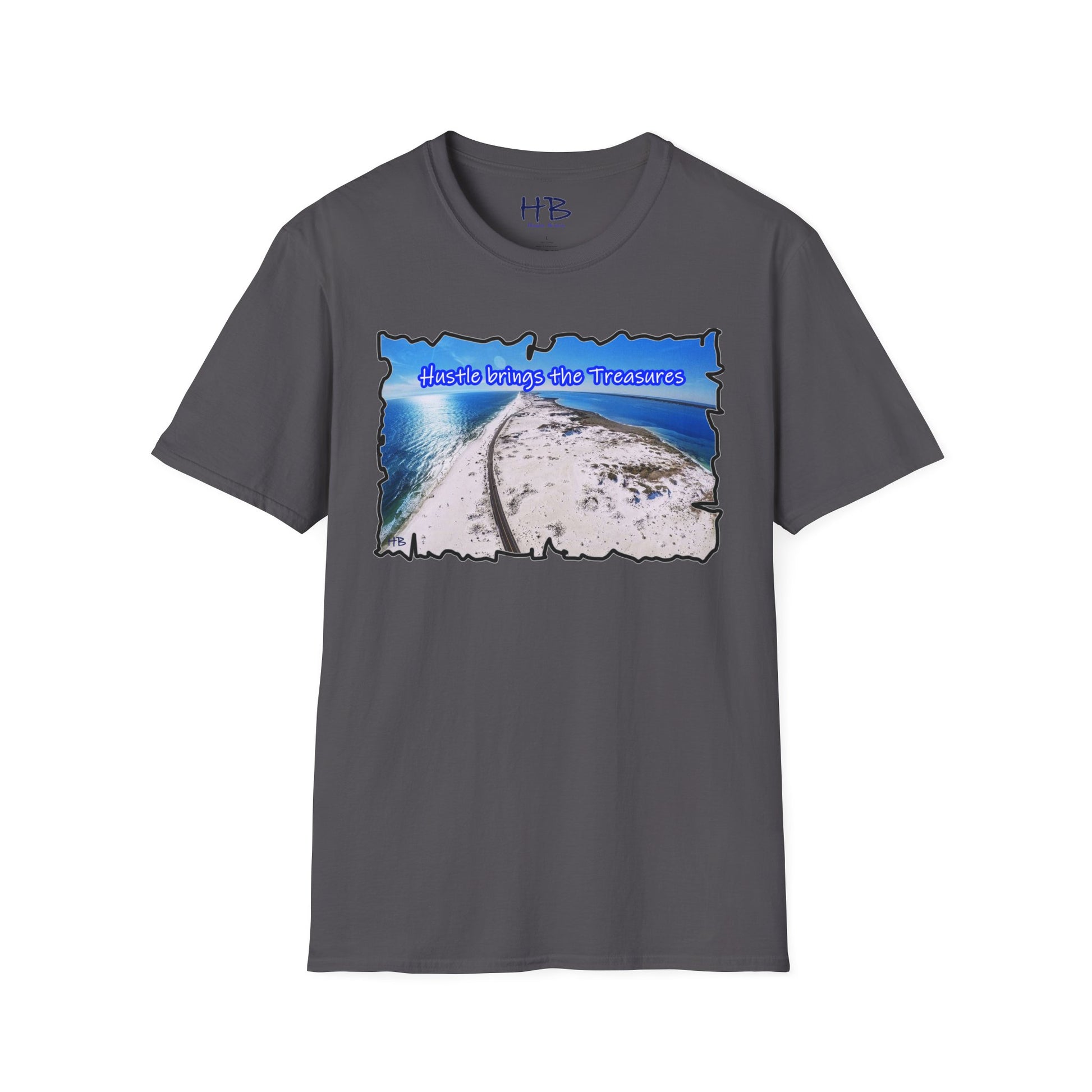 In a world where the relentless pursuit of success is the anthem, this t-shirt becomes more than just apparel; it's a wearable affirmation of the ethos that diligence and tenacity yield coveted treasures. The text, "Hustle brings the treasures," etched boldly across the landscape, serves as a daily reminder that each stride toward excellence is a step closer to the idyllic islands of leisure and repose.