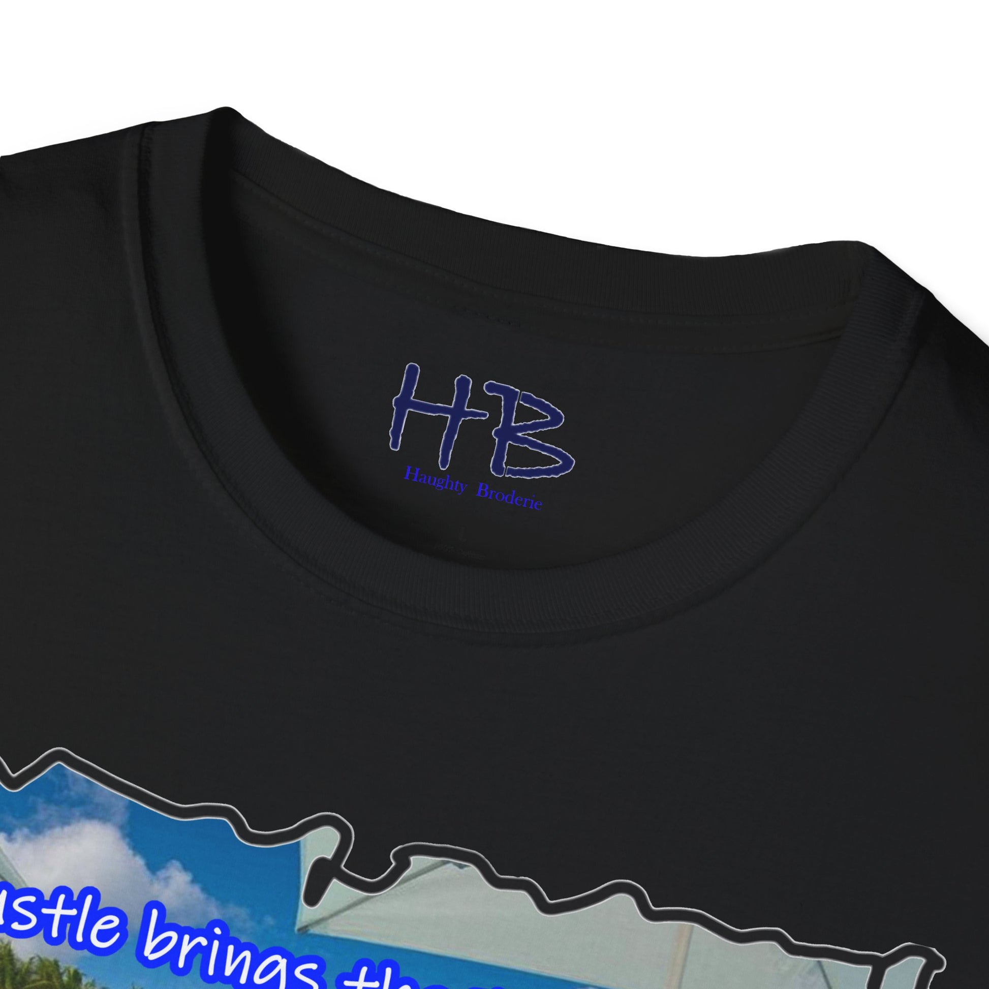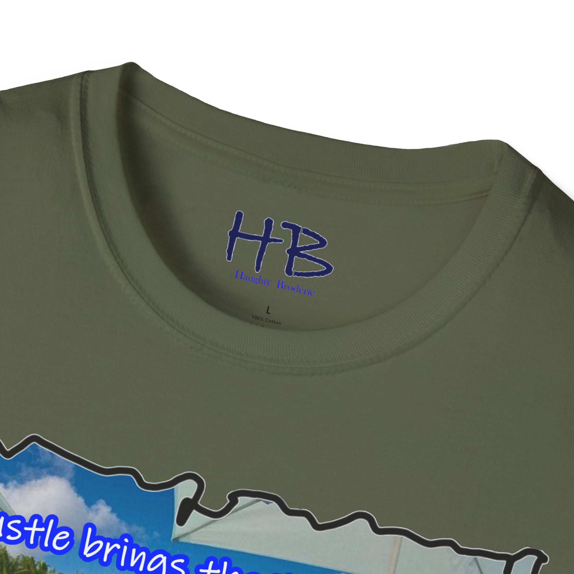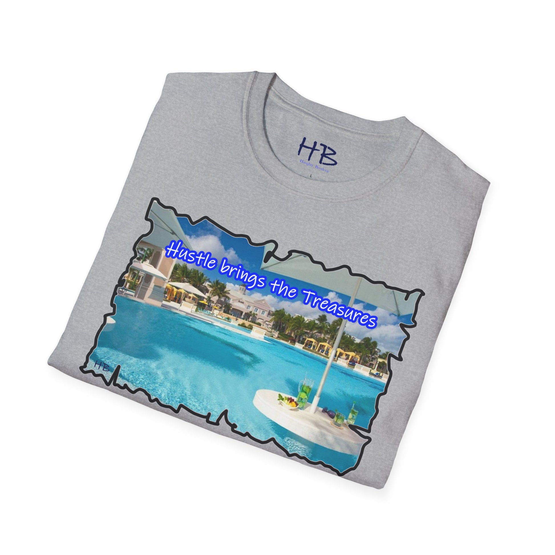 Text boldly declares, "Hustle brings the Treasures," infusing the garment with a motivational mantra that transcends mere attire. It's a call to action, a reminder that hard work isn't just a means to an end; it's the bridge to coveted islands of repose, where the rewards of tenacity await.