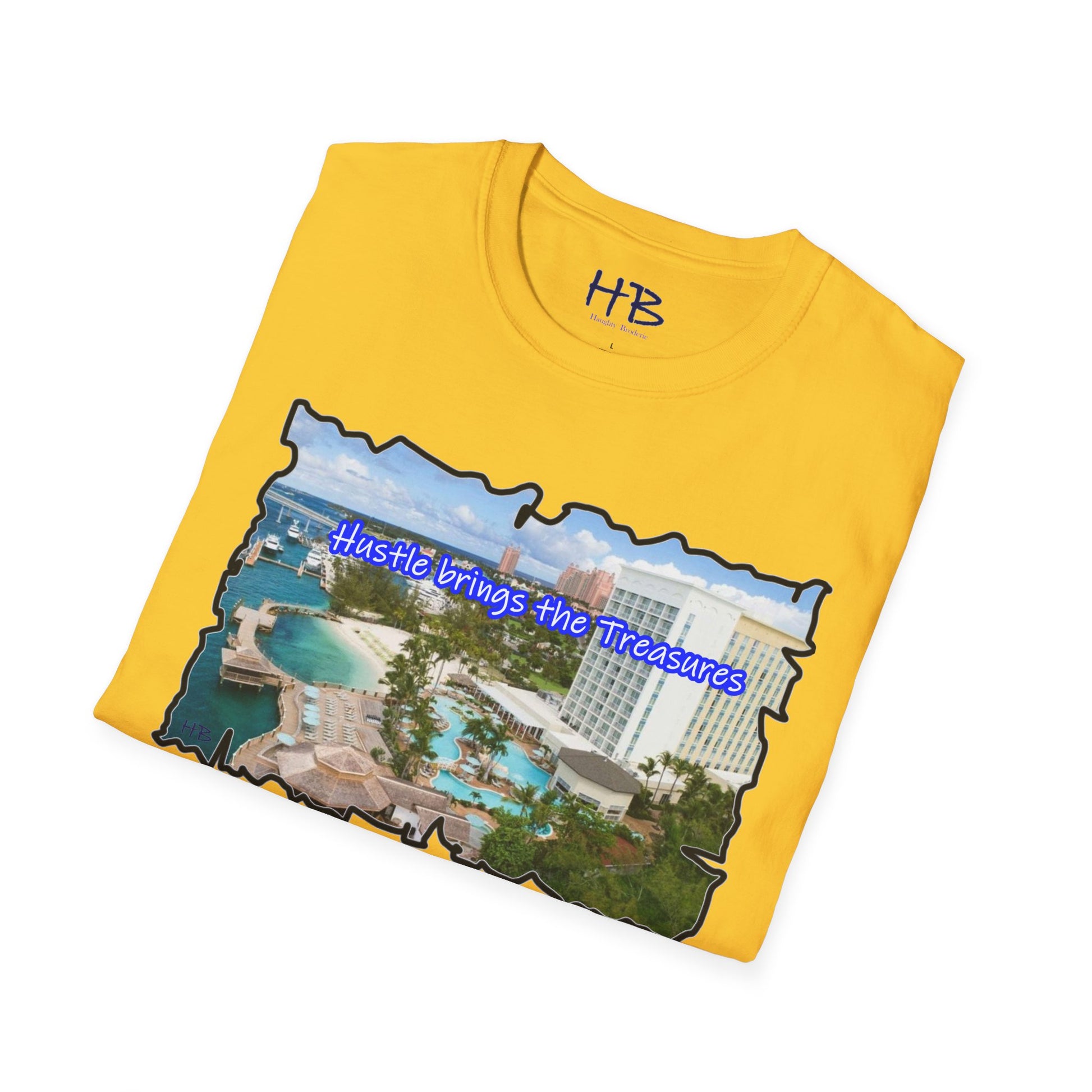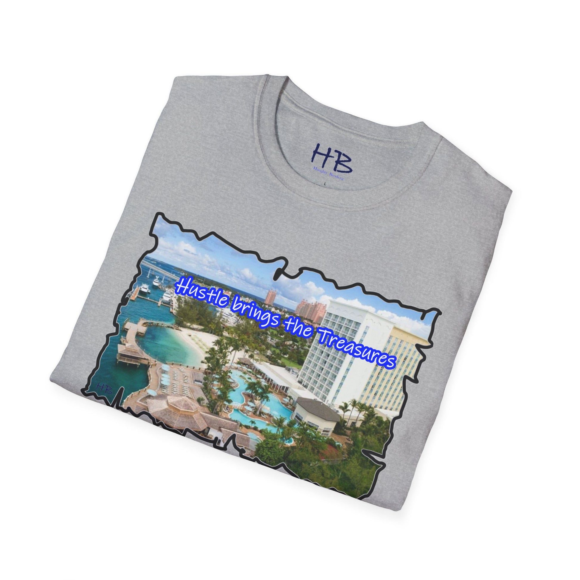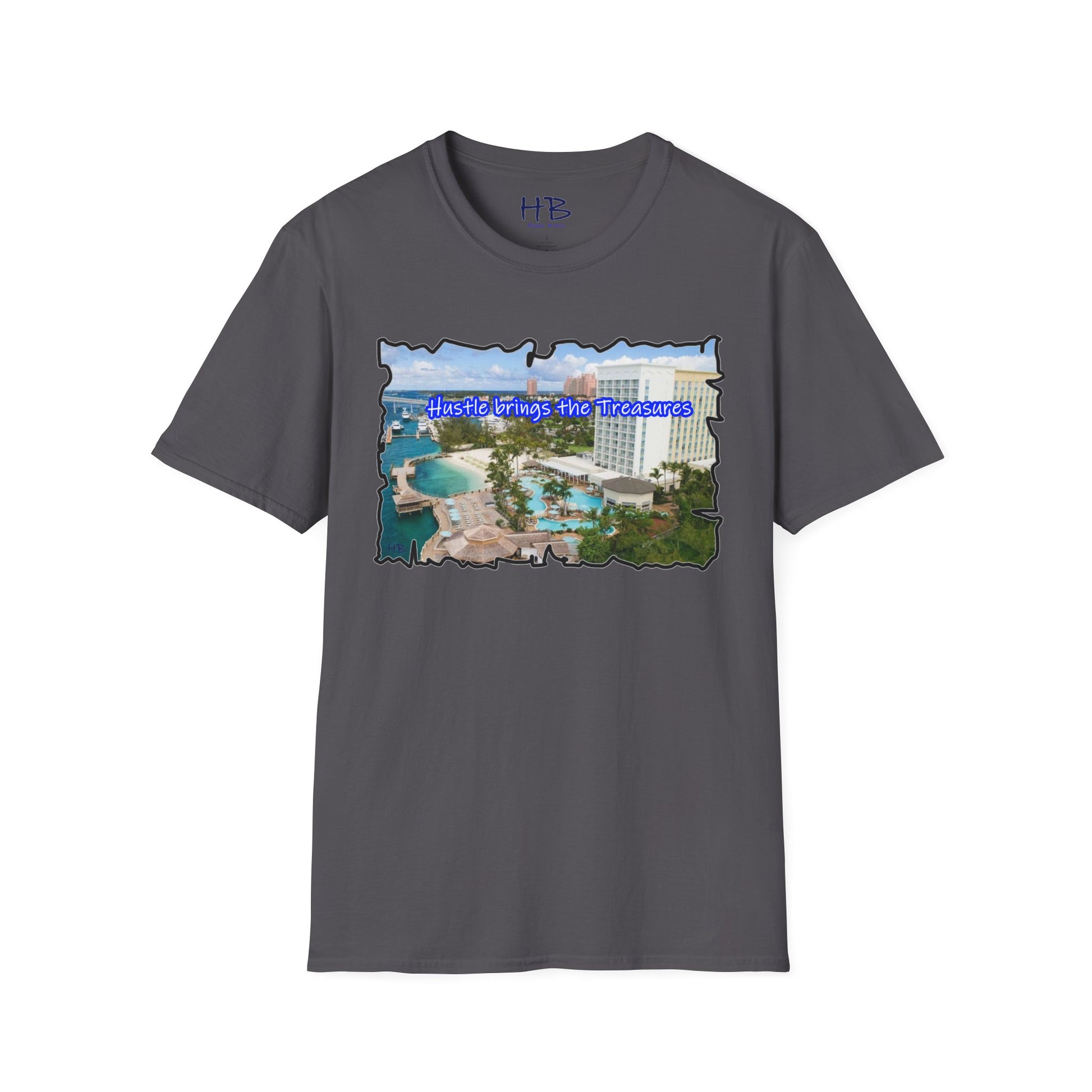Embark on a visual odyssey with our "Hustle brings the Treasures" T-shirt, a wearable masterpiece that captures the essence of aspirational leisure. Picture this: an opulent, sought-after touristic paradise framed by a marvelous resort-style pool, adorned with luxurious amenities that beckon the discerning traveler. The backdrop? The breathtaking Bahamas ocean, its azure waves caressing the coastline with a gentle embrace. Behold the silhouette of renowned iconic buildings, standing tall like sentinels of luxury, while a marina brims with opulent vessels, each one a testament to the lap of extravagance.