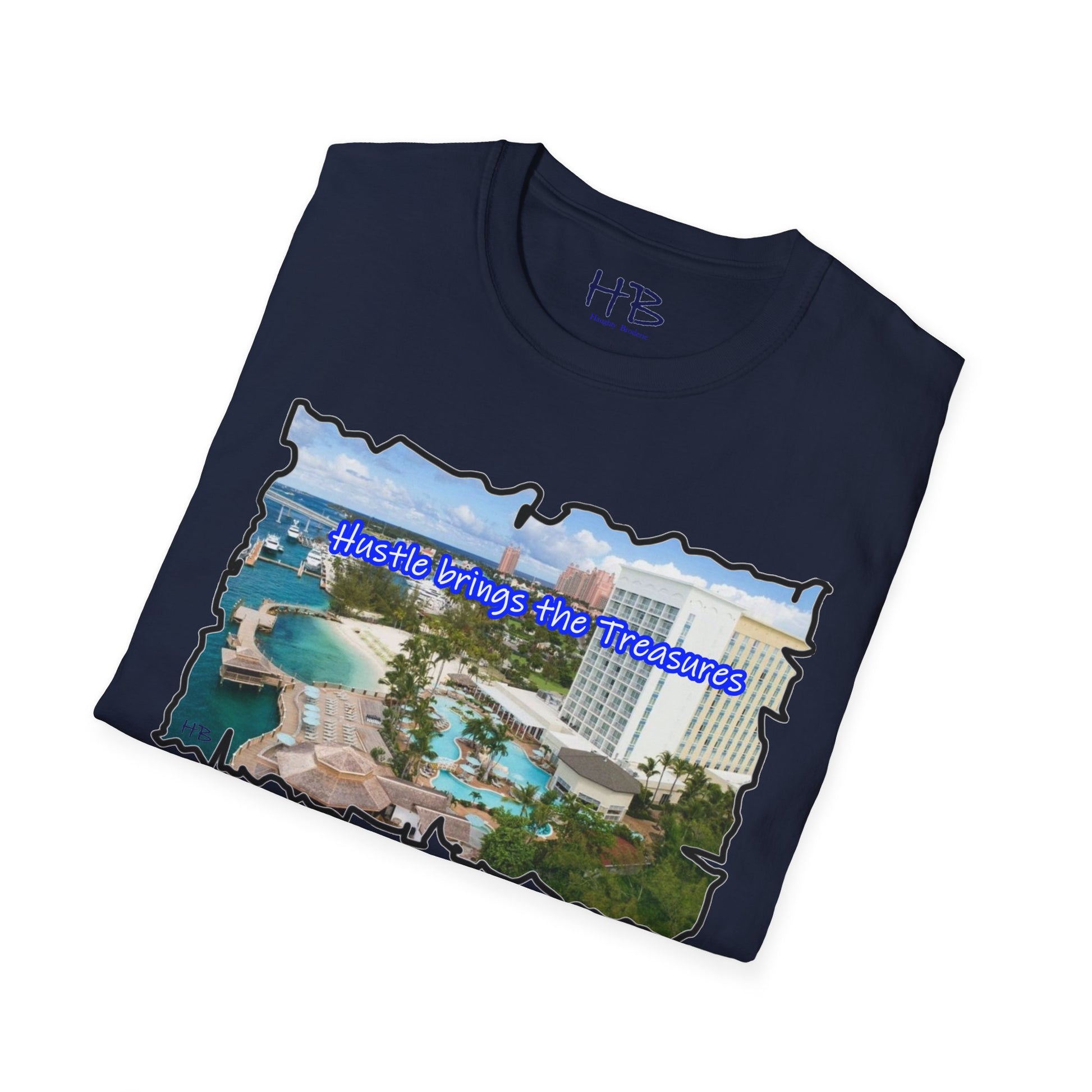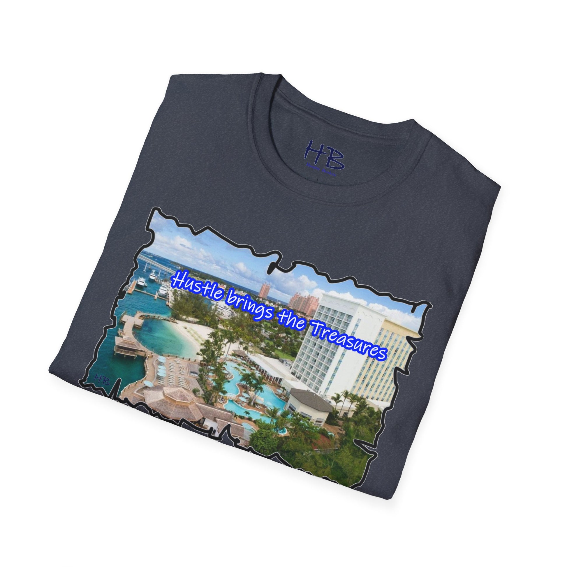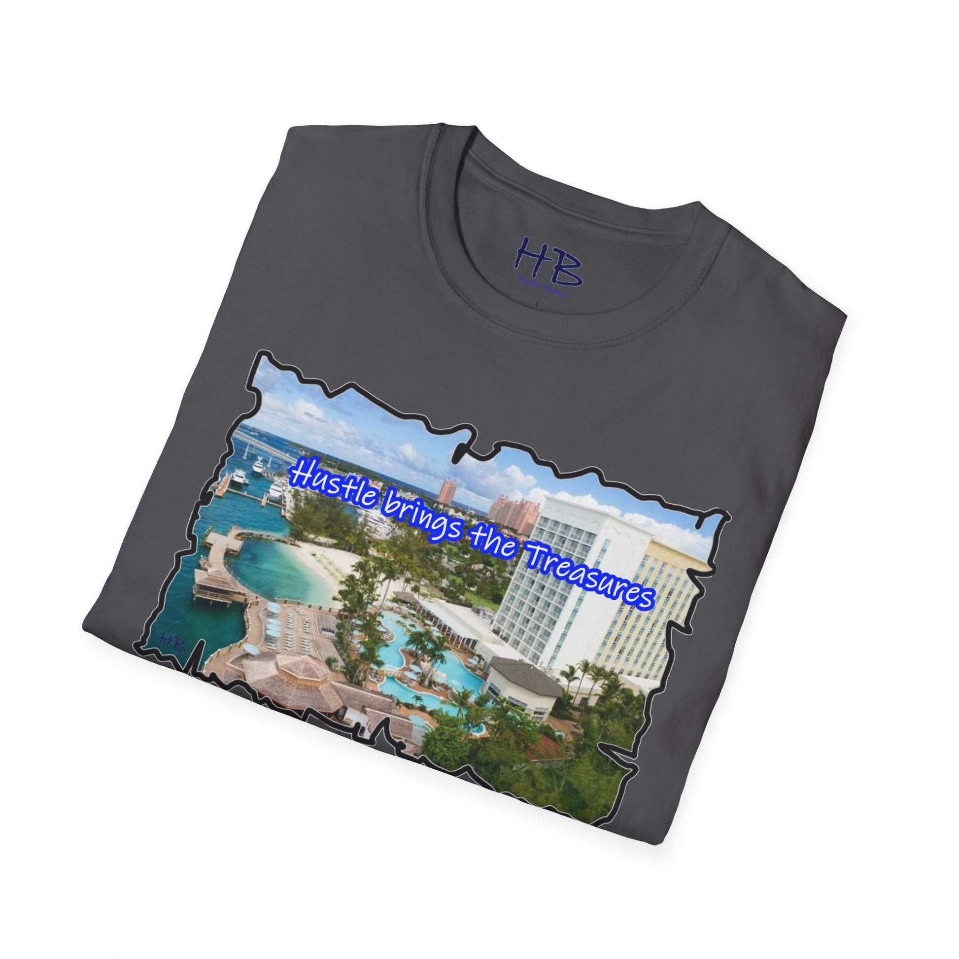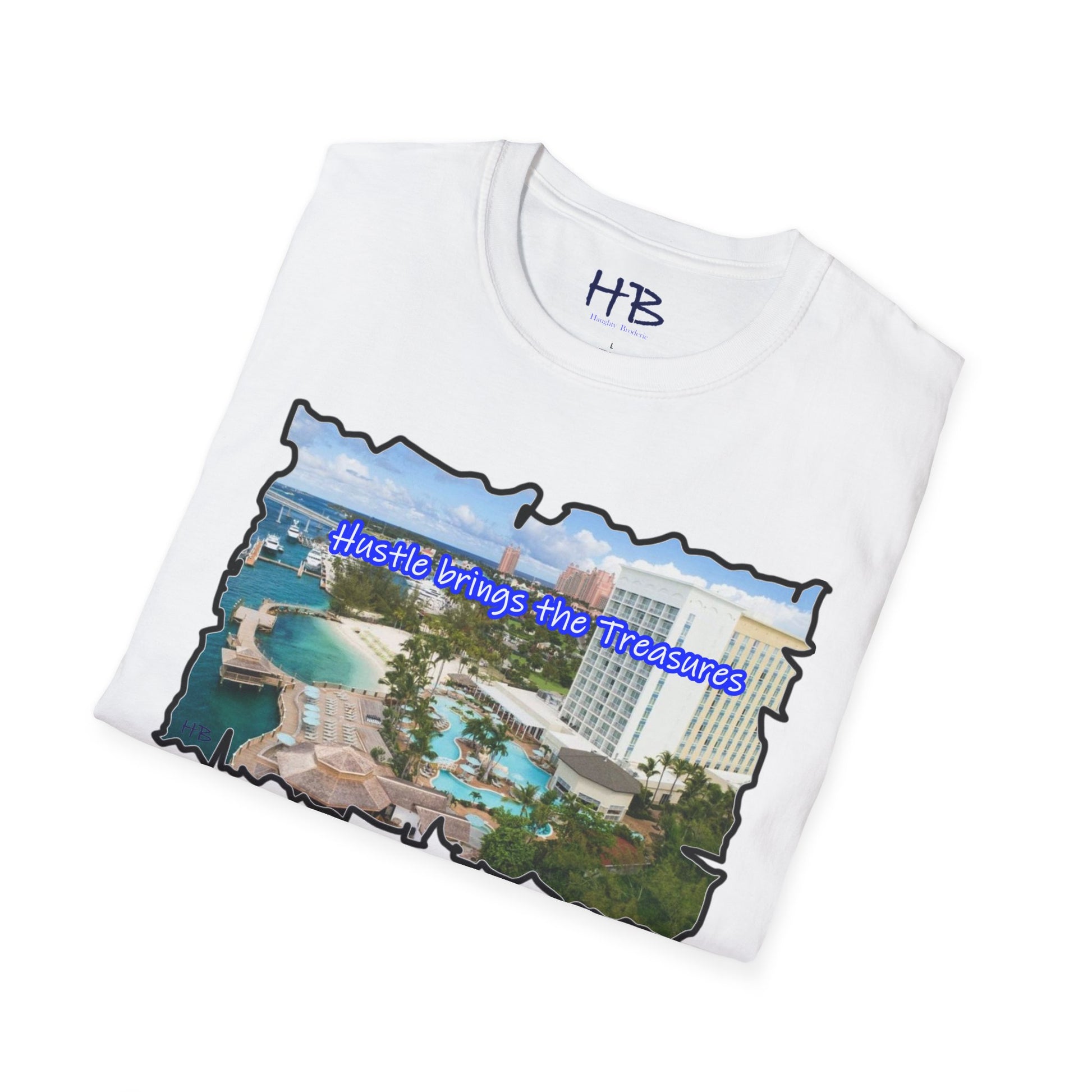 Embark on a visual odyssey with our "Hustle brings the Treasures" T-shirt, a wearable masterpiece that captures the essence of aspirational leisure. Picture this: an opulent, sought-after touristic paradise framed by a marvelous resort-style pool, adorned with luxurious amenities that beckon the discerning traveler. The backdrop? The breathtaking Bahamas ocean, its azure waves caressing the coastline with a gentle embrace. Behold the silhouette of renowned iconic buildings, standing tall like sentinels of luxury, while a marina brims with opulent vessels, each one a testament to the lap of extravagance.
