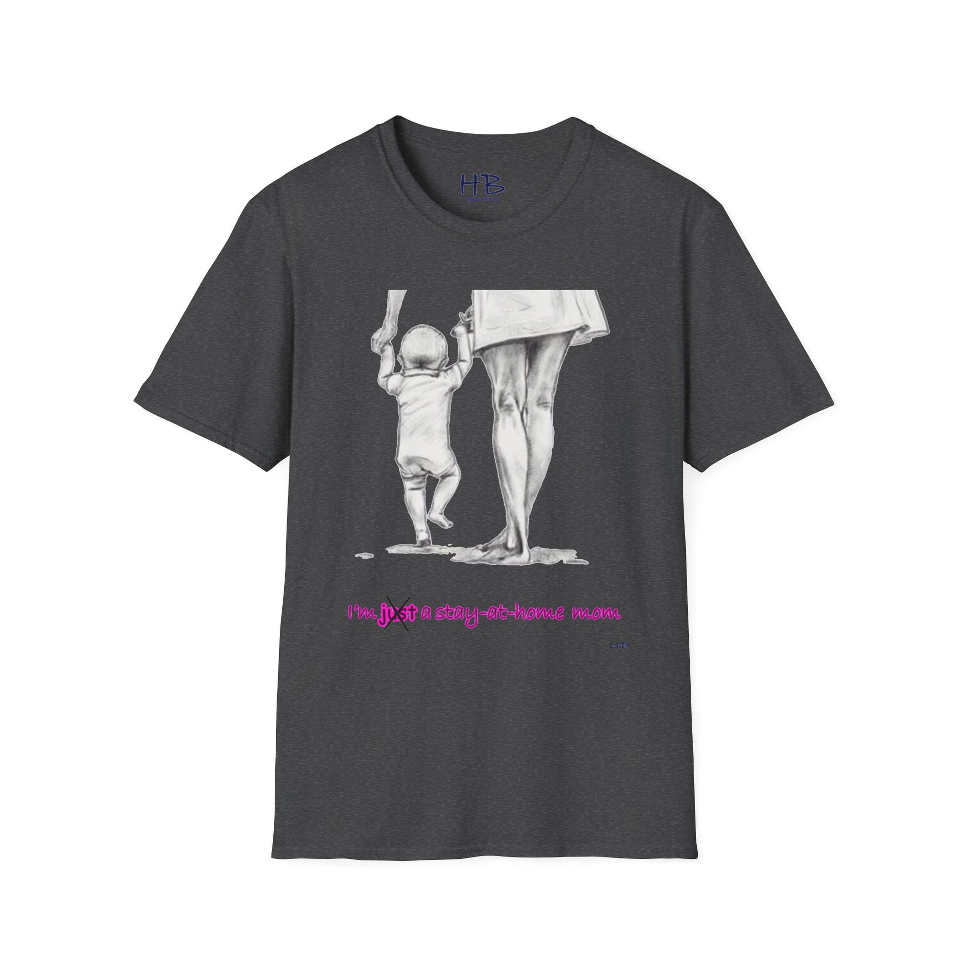 The accompanying text reads "I am a stay-at-home mom," with the word "just" crossed out intentionally to signify that the job of a stay-at-home mom is not something to be underestimated or devalued. We believe that the role of a stay-at-home mom is not only challenging but also incredibly rewarding, and this tee is a testament to that.