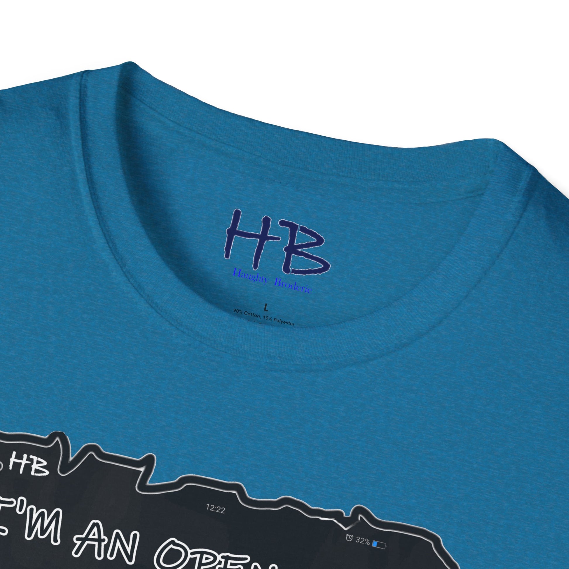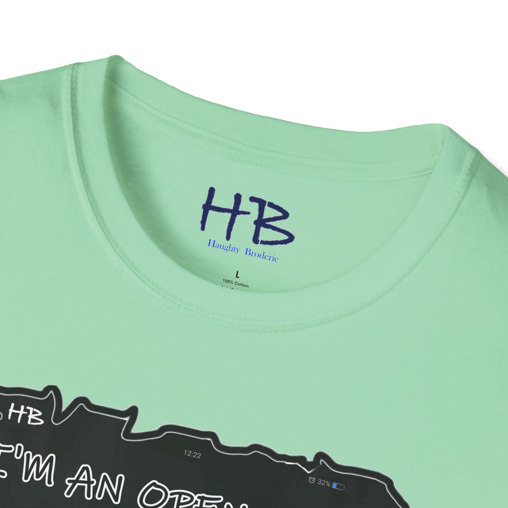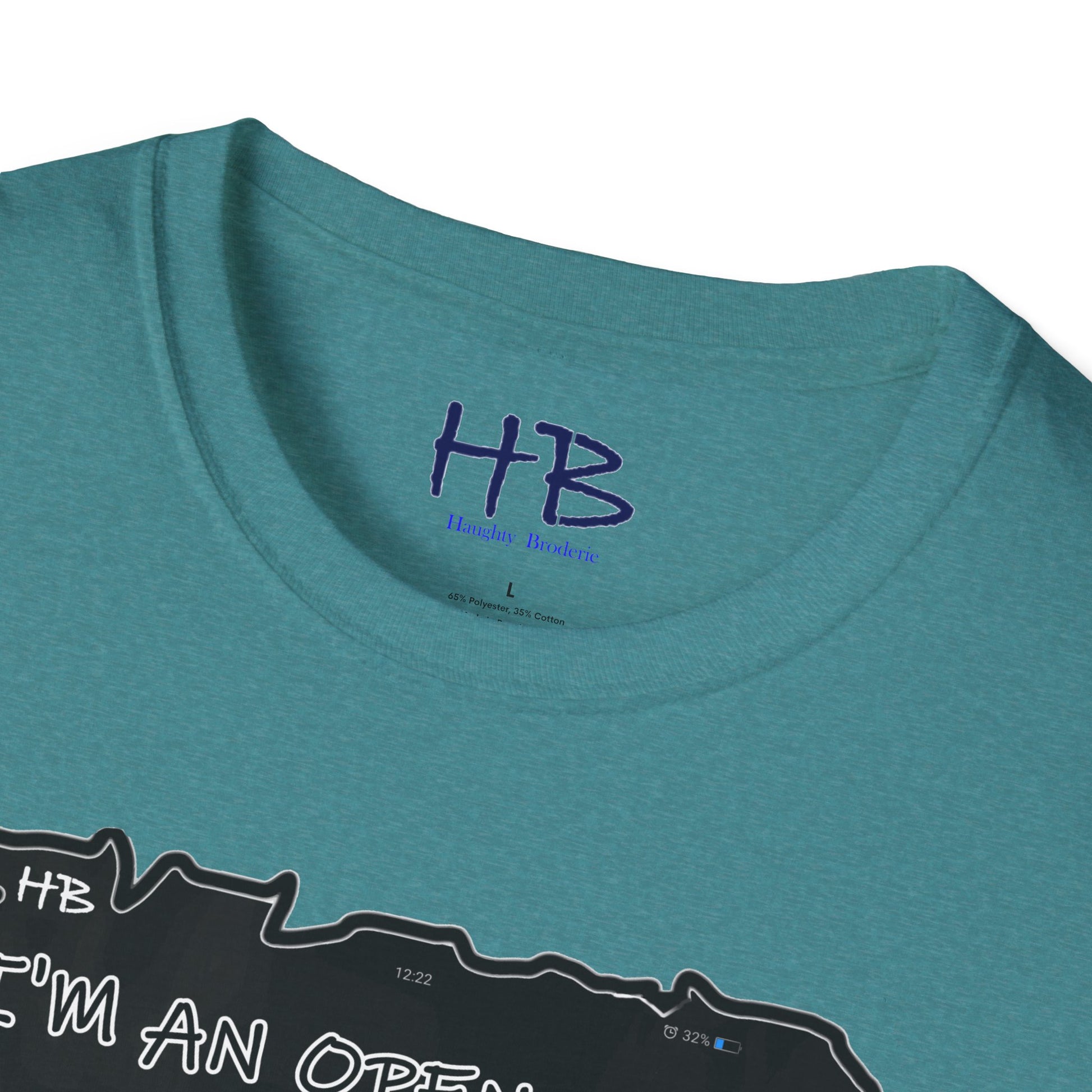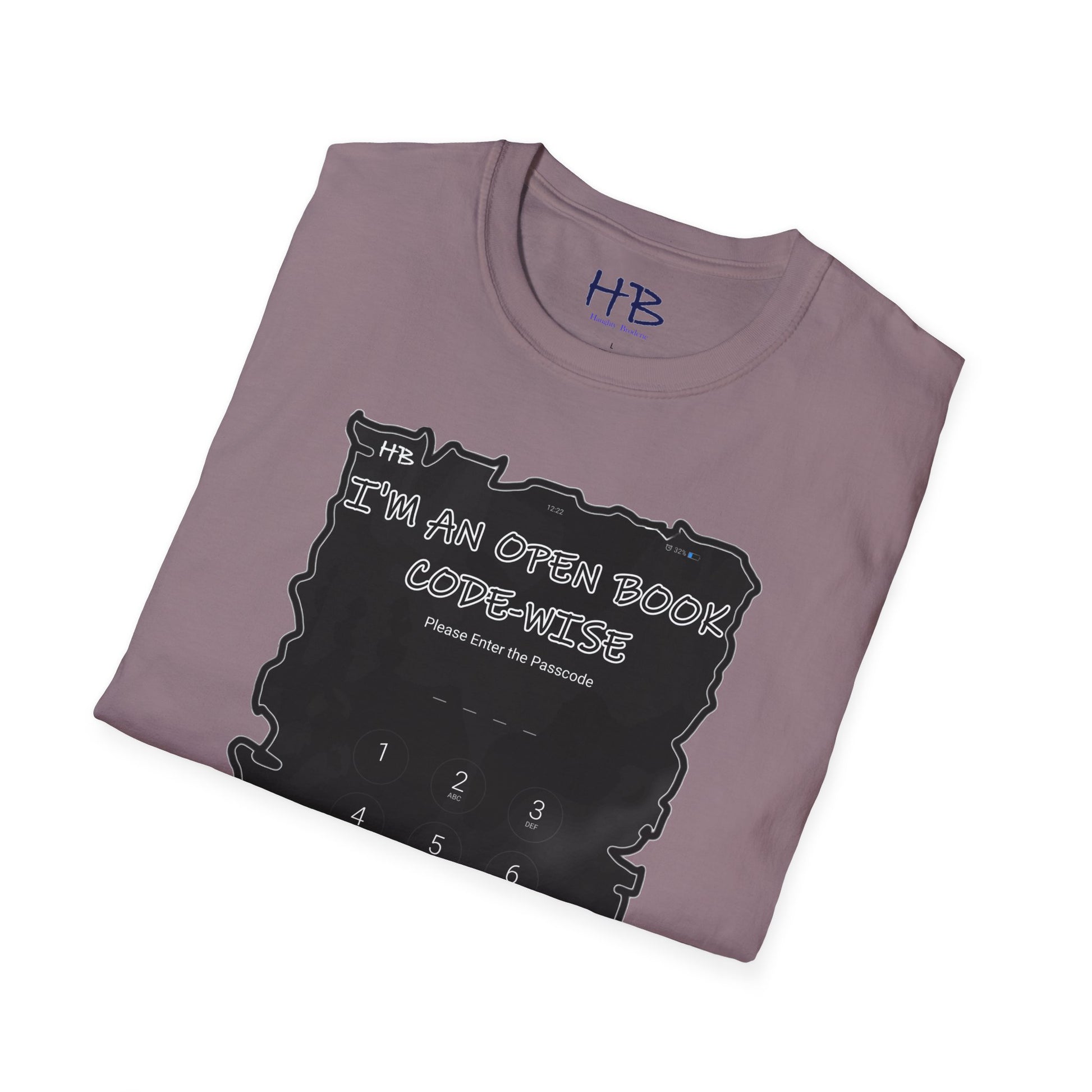 The text boldly declares, "I'M AN OPEN BOOK, CODE-WISE," weaving an intricate narrative that transcends the digital realm into the real world. This isn't just a shirt; it's a symbol of transparency, a visual key unlocking the wearer's affable nature. The passcode, though safeguarding the device, paradoxically signals an open invitation to connect with ease.