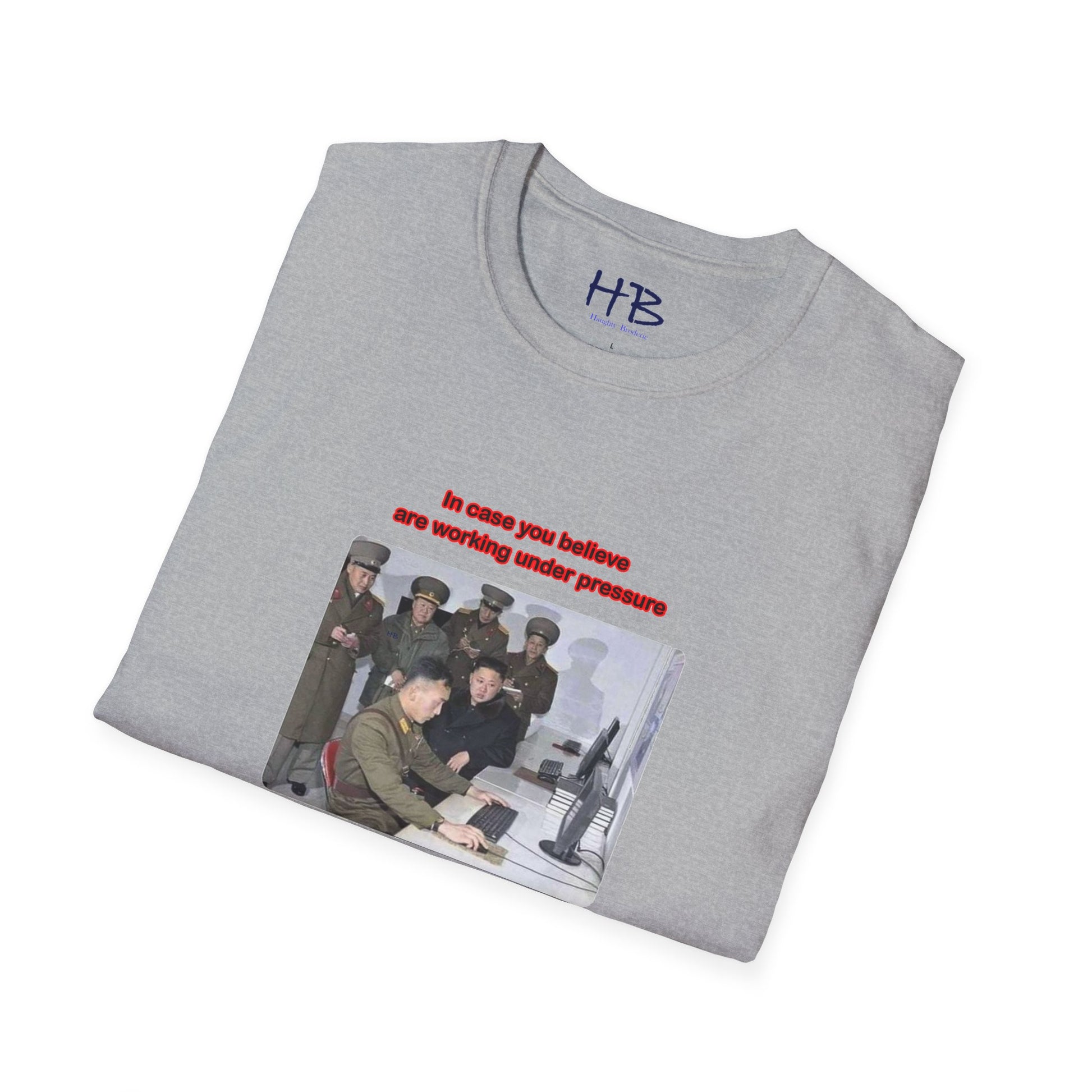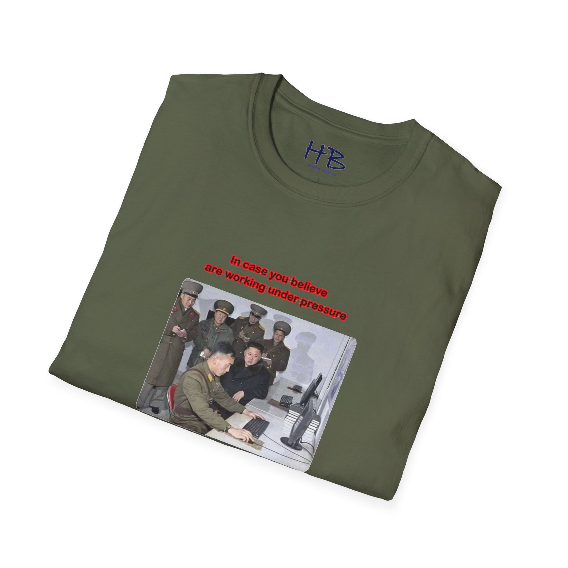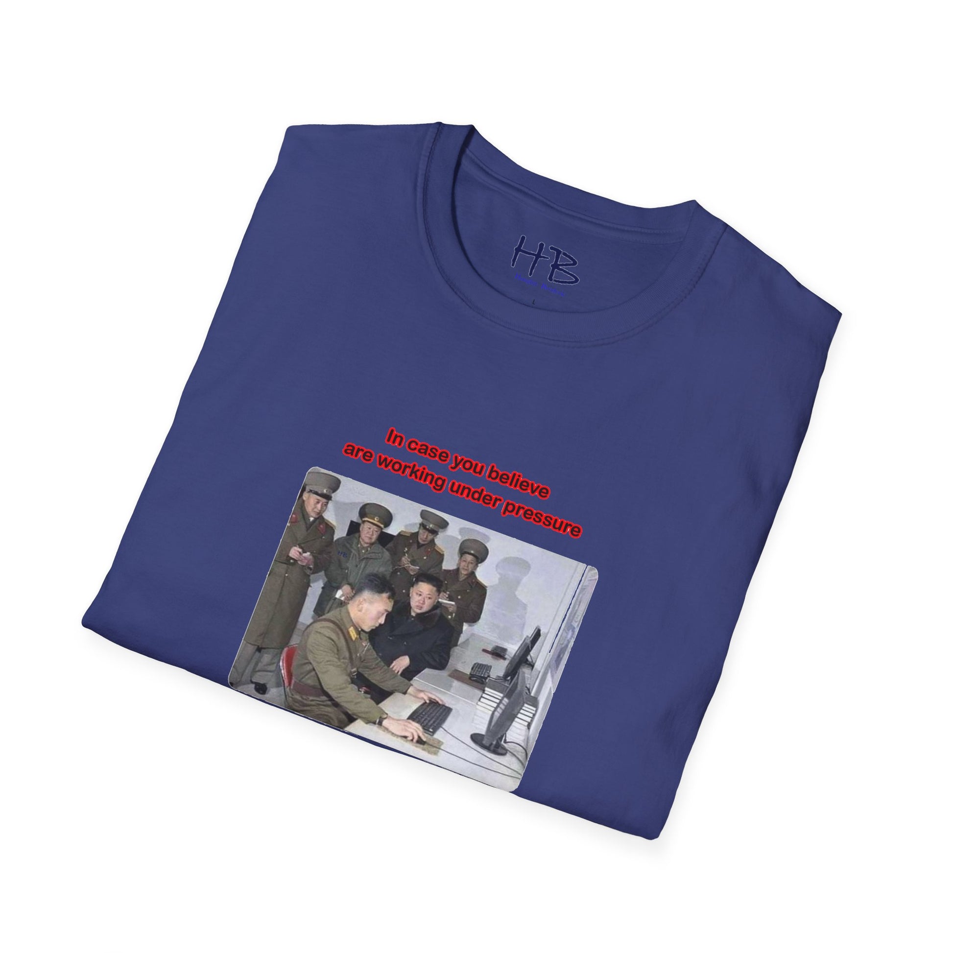 Introducing our latest tee shirt design, perfect for those who are seeking to convey the message of perseverance and resilience in the face of extreme pressure. Our tee shirt features a powerful image of four senior military officials, distinguished in their high ranks, diligently taking notes. Beside them sits a young North Korean soldier, hair pulled out from the immense stress he is experiencing while sitting in front of a computer screen. And to make matters worse, he is being closely monitored by none other than the notorious and demanding North Korean leader, Kim Jong-Un, who is visibly displeased with what he sees on the screen.