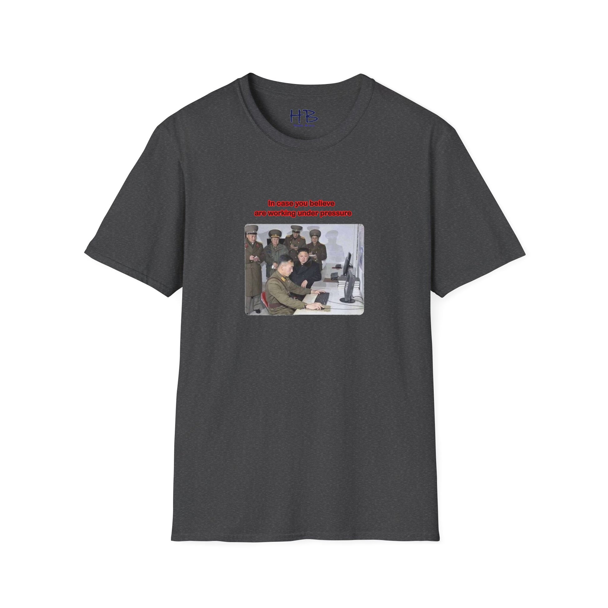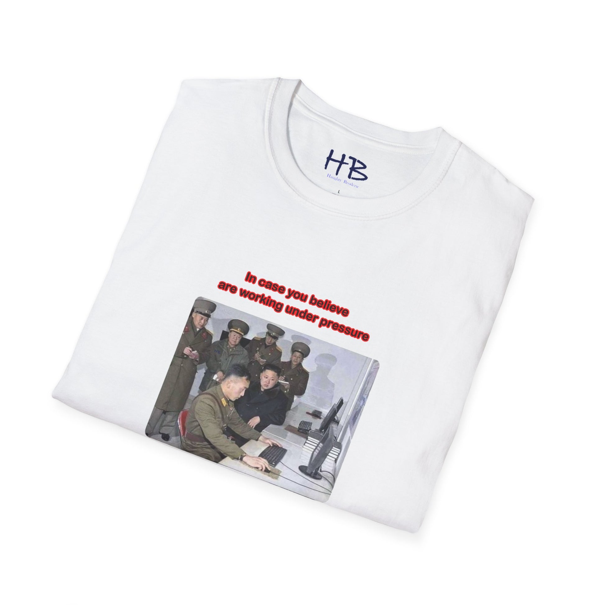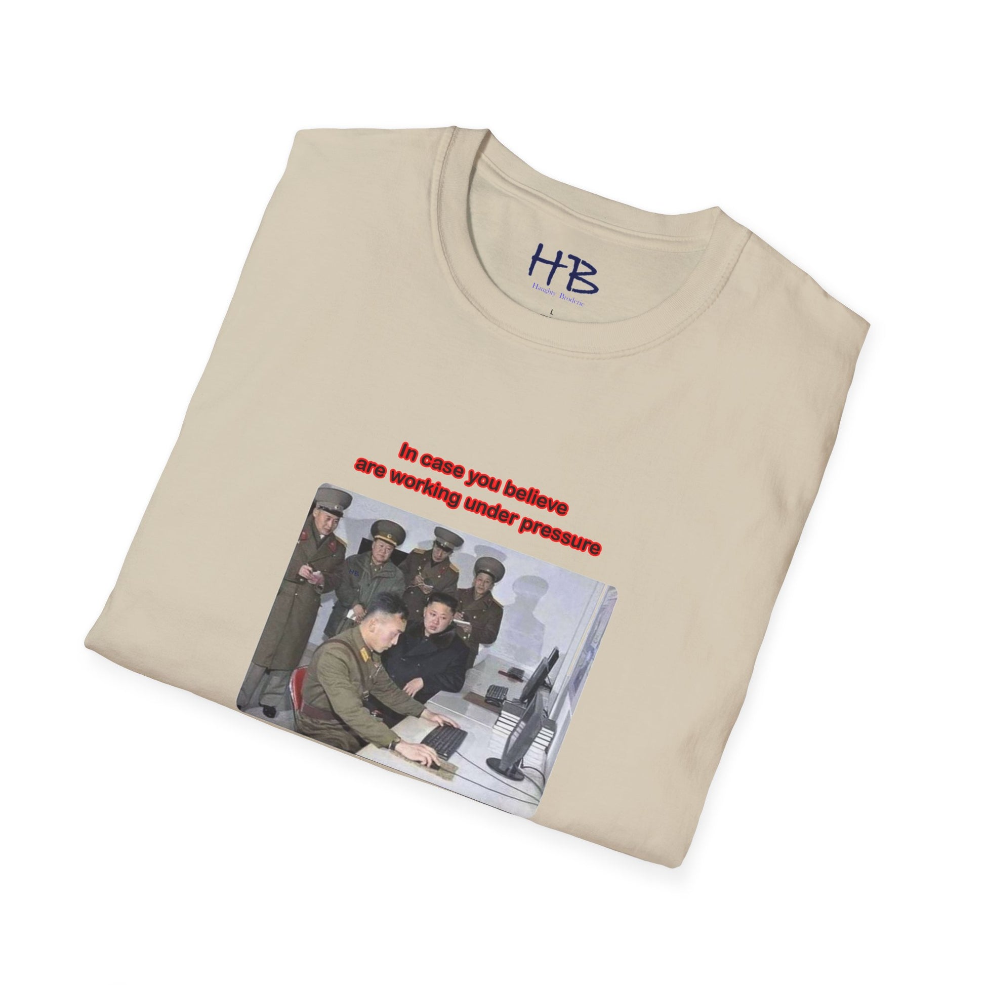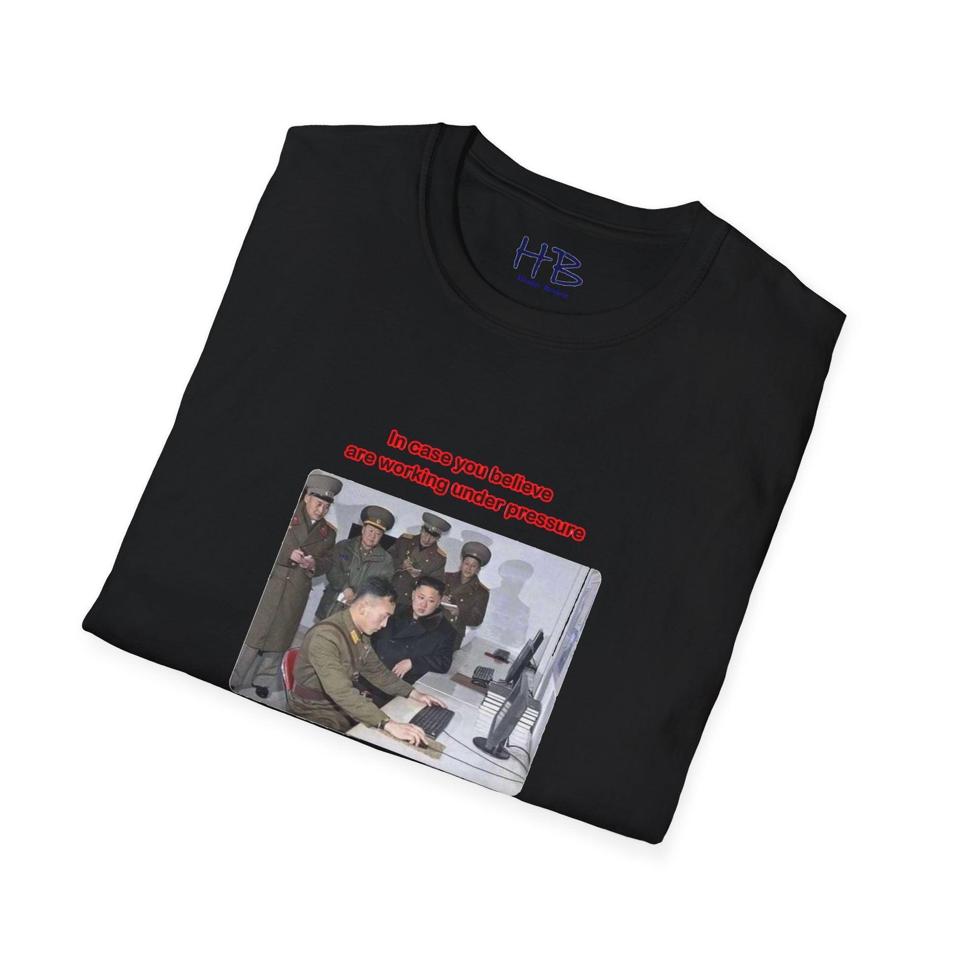 Introducing our latest tee shirt design, perfect for those who are seeking to convey the message of perseverance and resilience in the face of extreme pressure. Our tee shirt features a powerful image of four senior military officials, distinguished in their high ranks, diligently taking notes. Beside them sits a young North Korean soldier, hair pulled out from the immense stress he is experiencing while sitting in front of a computer screen. And to make matters worse, he is being closely monitored by none other than the notorious and demanding North Korean leader, Kim Jong-Un, who is visibly displeased with what he sees on the screen.