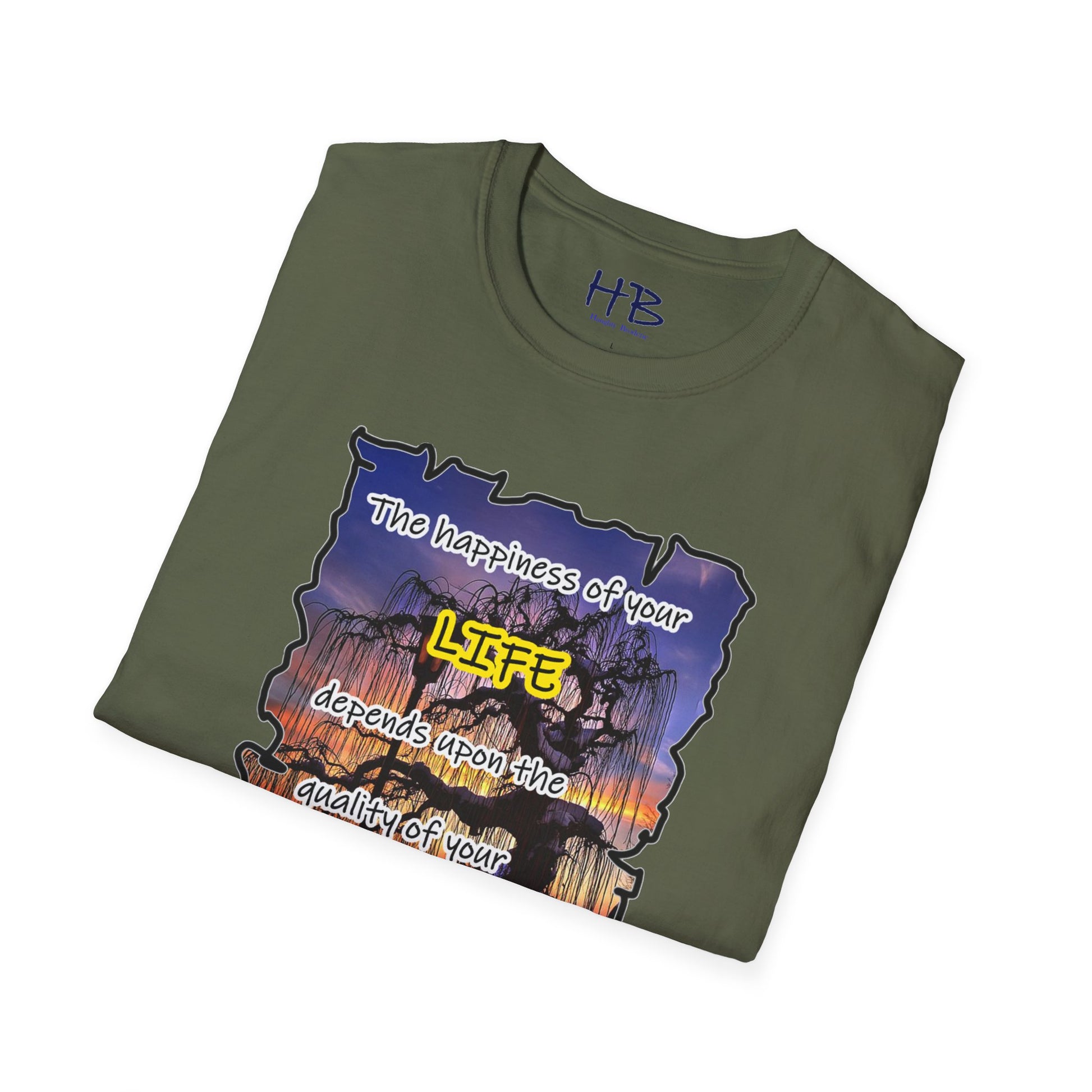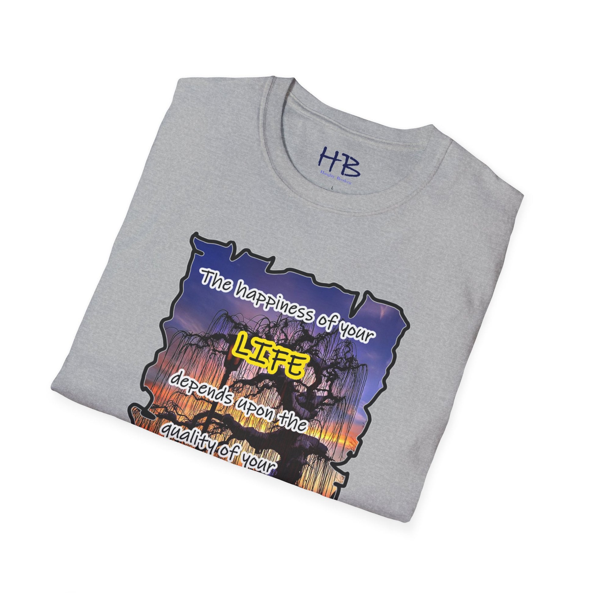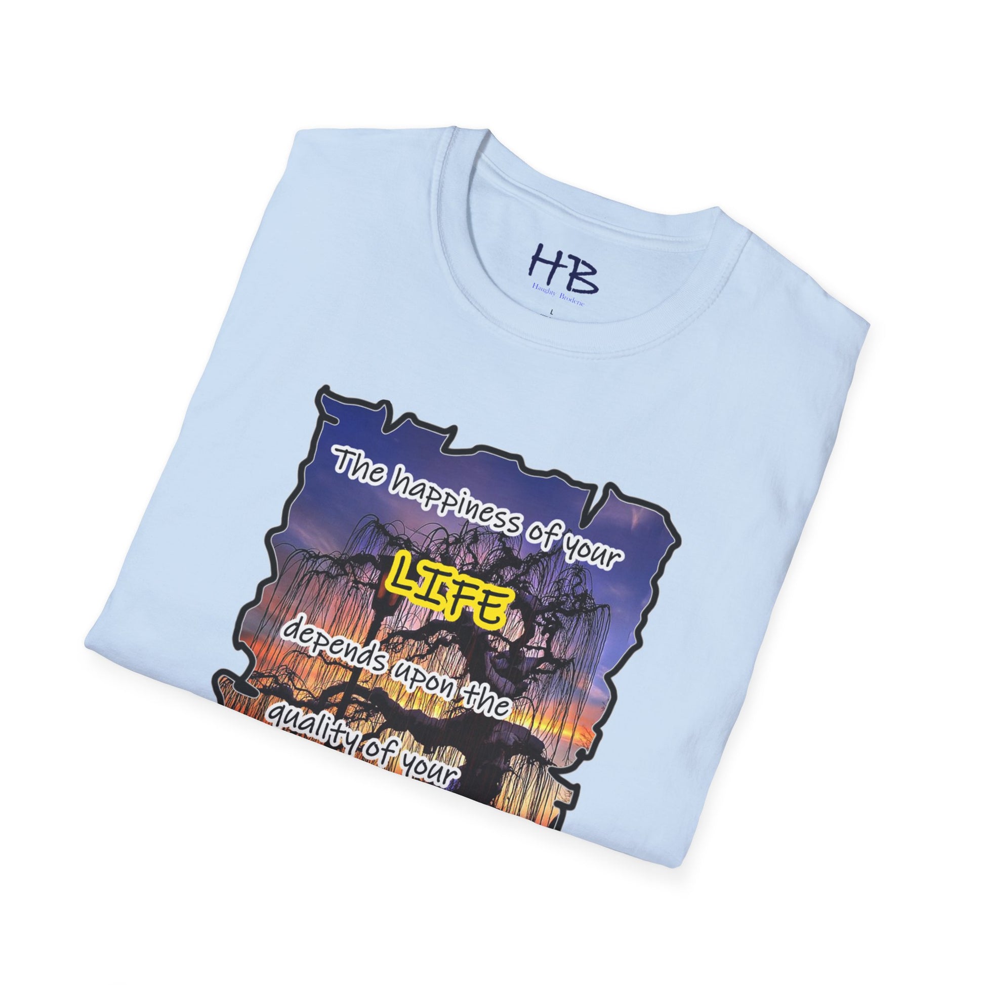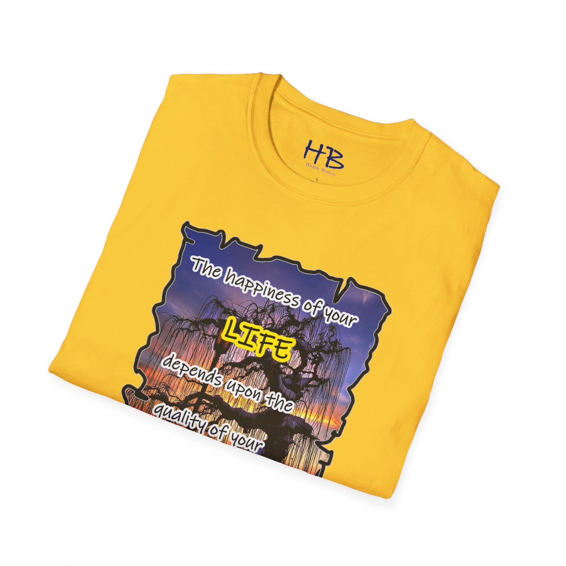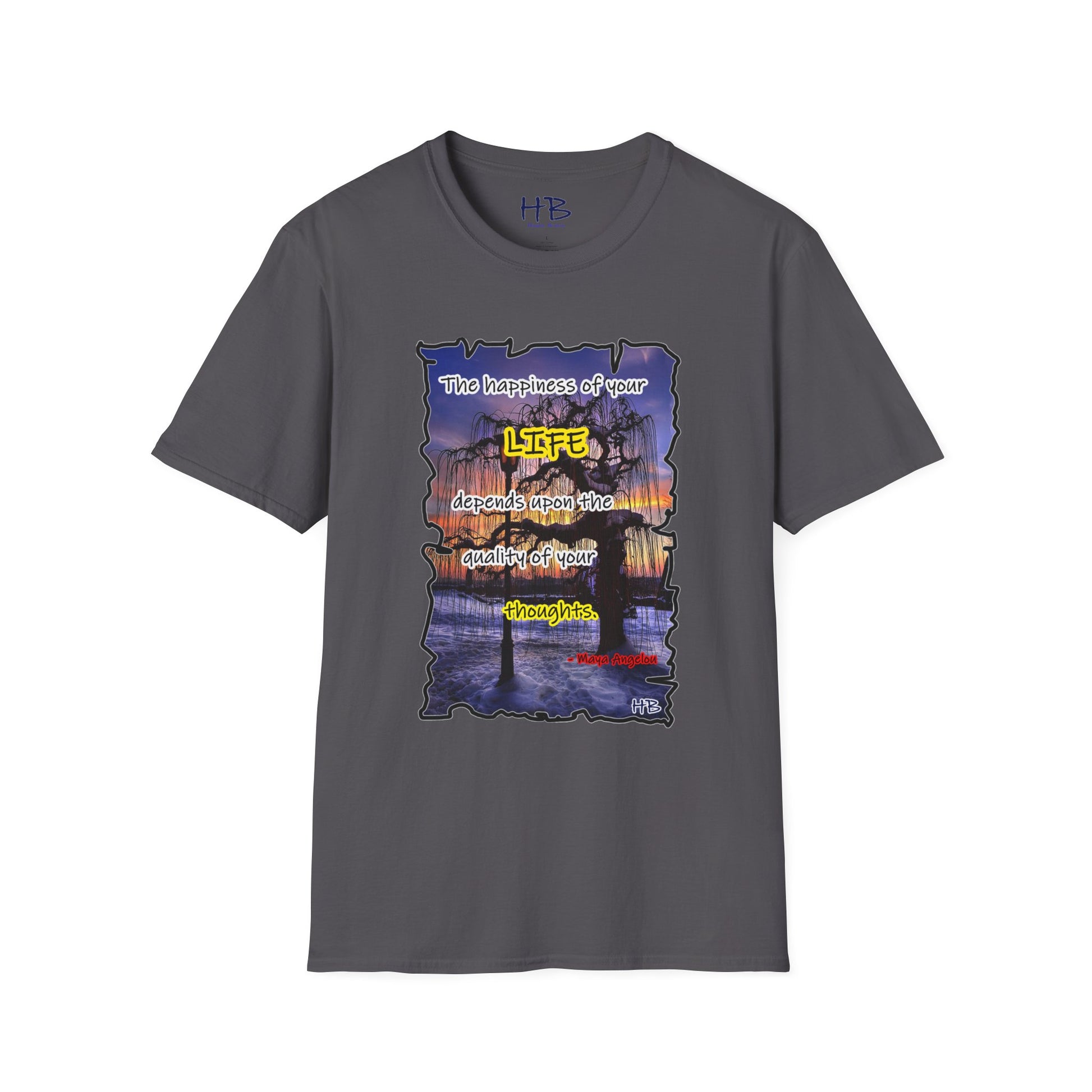 This remarkable tee shirt serves as a visual reminder that our thoughts have the potential to shape our lives. The quote emblazoned on the tee, attributed to the esteemed Maya Angelou, resonates deeply: "The happiness of your LIFE depends upon the quality of your thoughts." These profound words encapsulate the idea that the power lies within us to create a joyous existence by fostering positive and empowering thoughts.