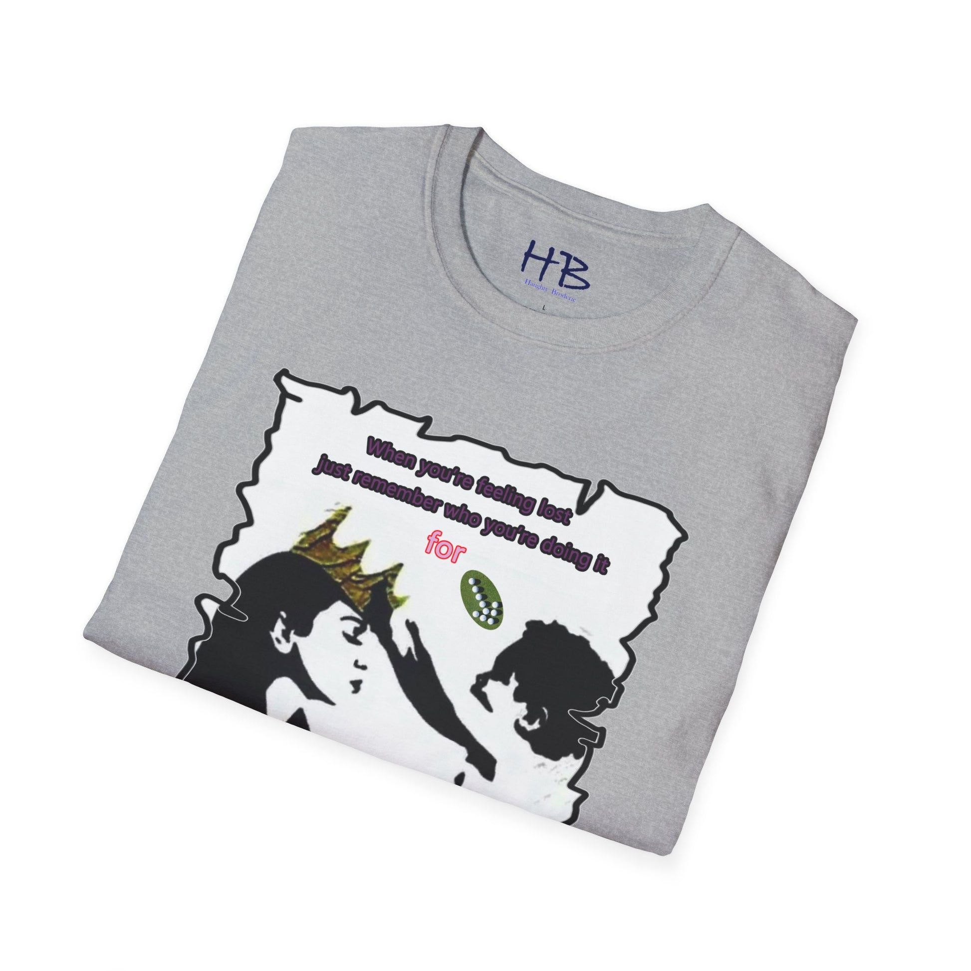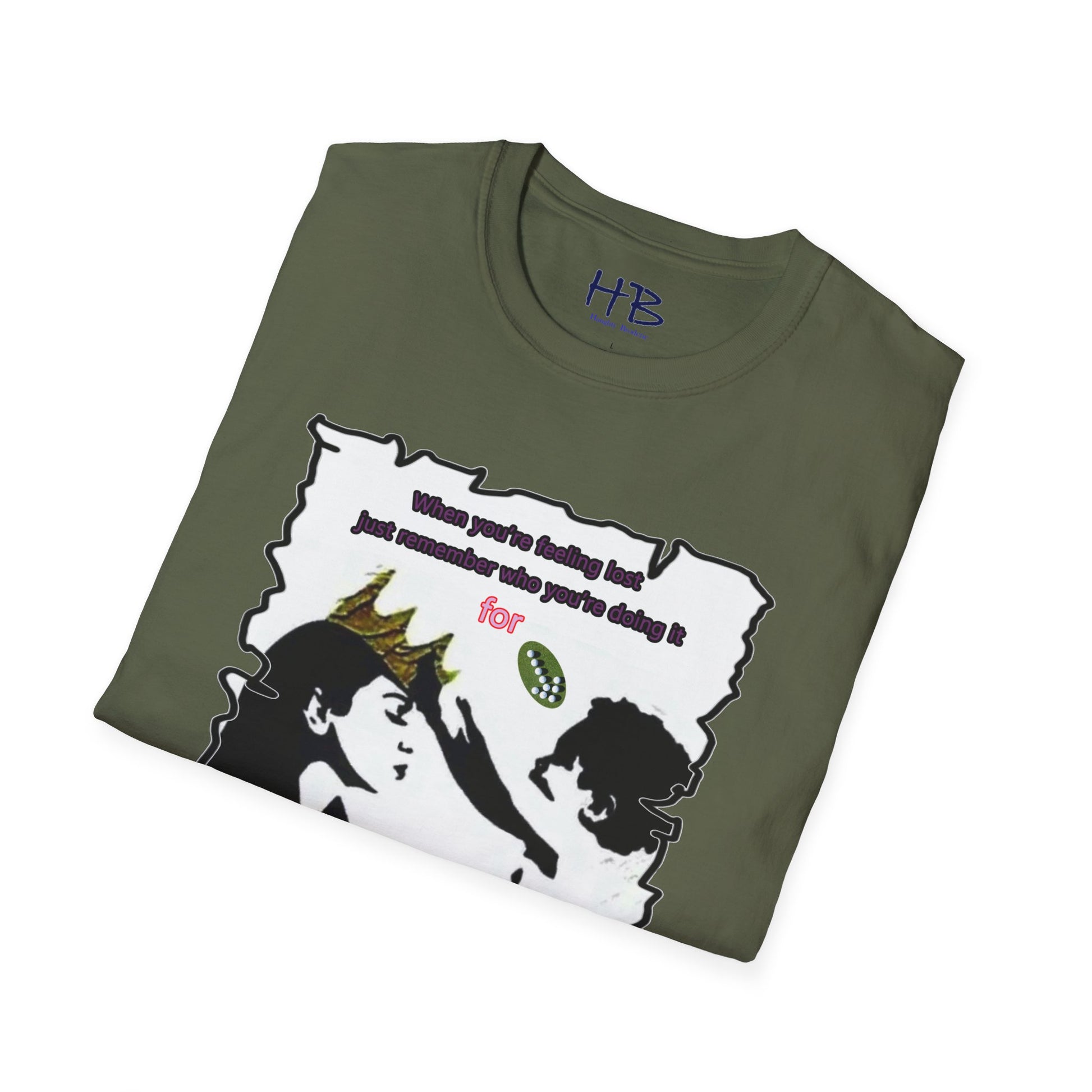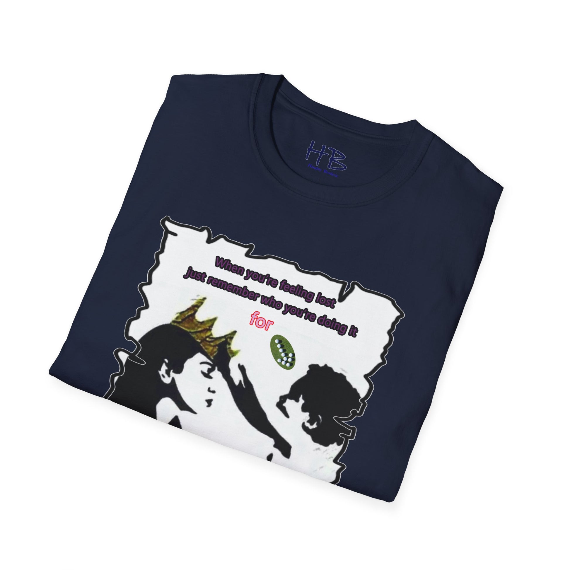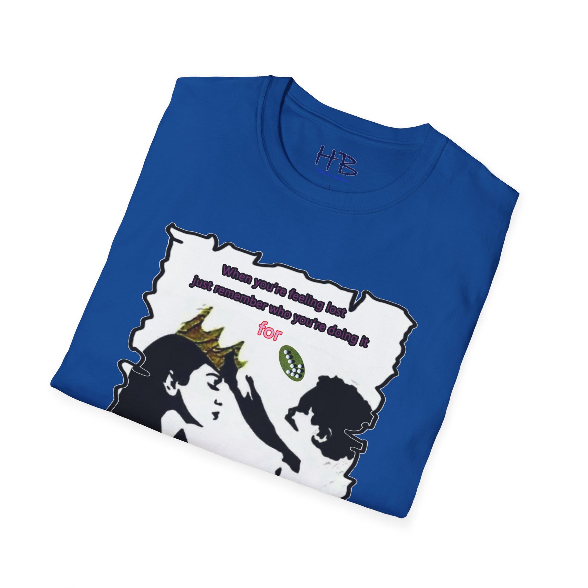 Introducing our exquisite t-shirt featuring a stunning illustration of a maternal figure and her offspring placing a regal headpiece atop her crown. The accompanying text serves as a poignant reminder to those who may feel adrift or uncertain in life, urging them to reflect upon their motivations and remember their true purpose.