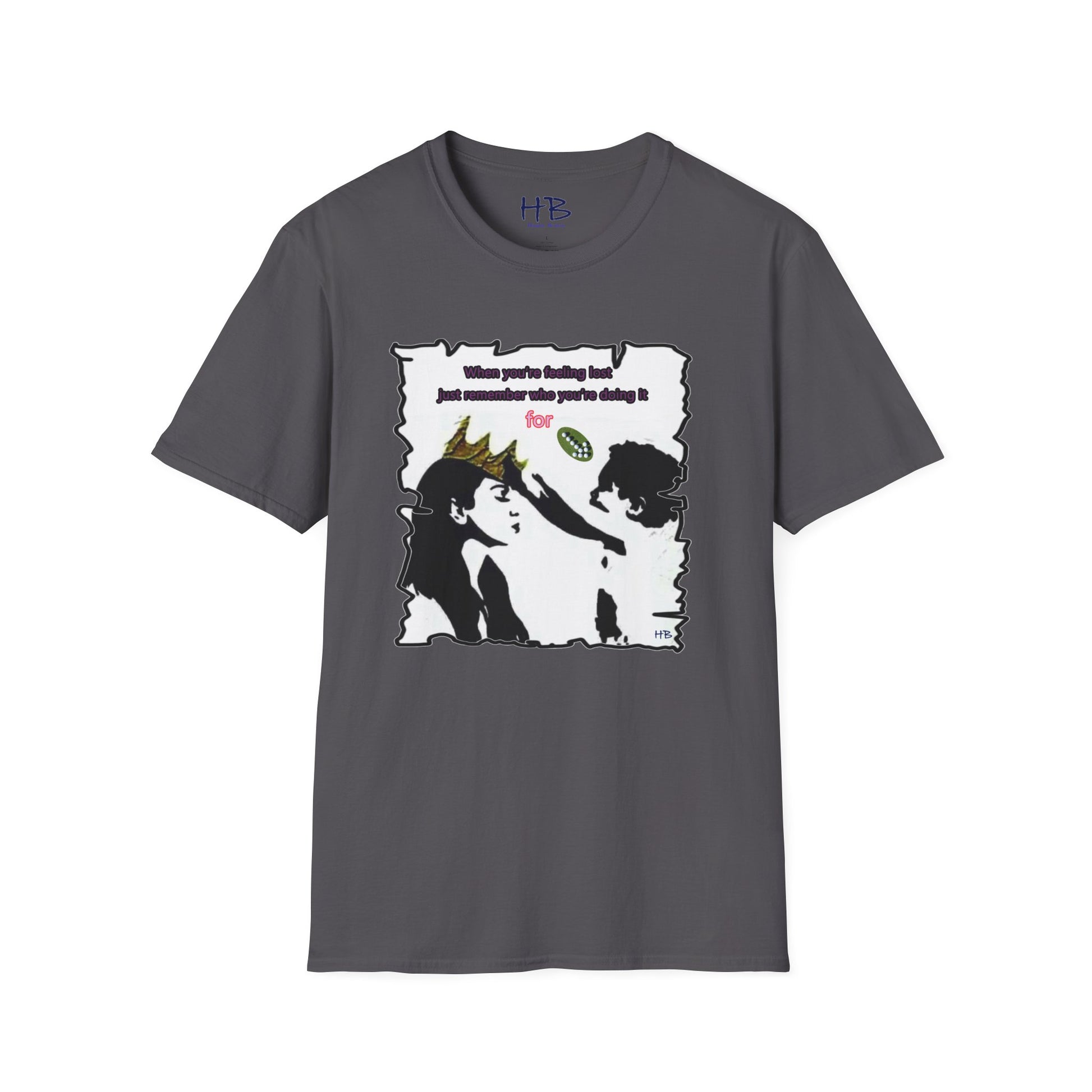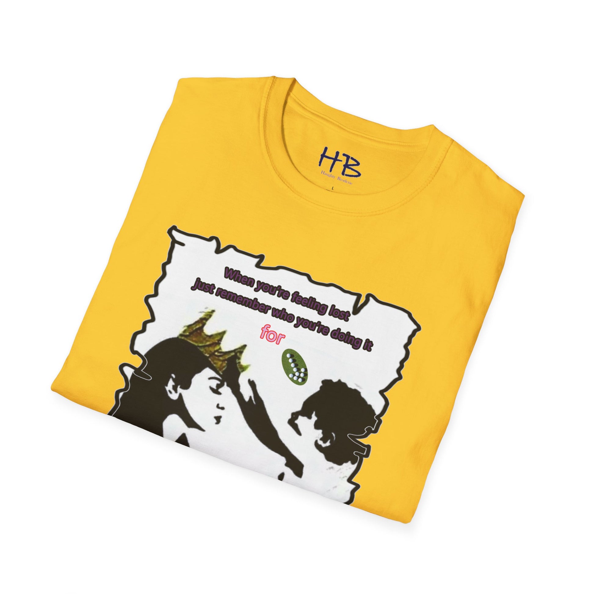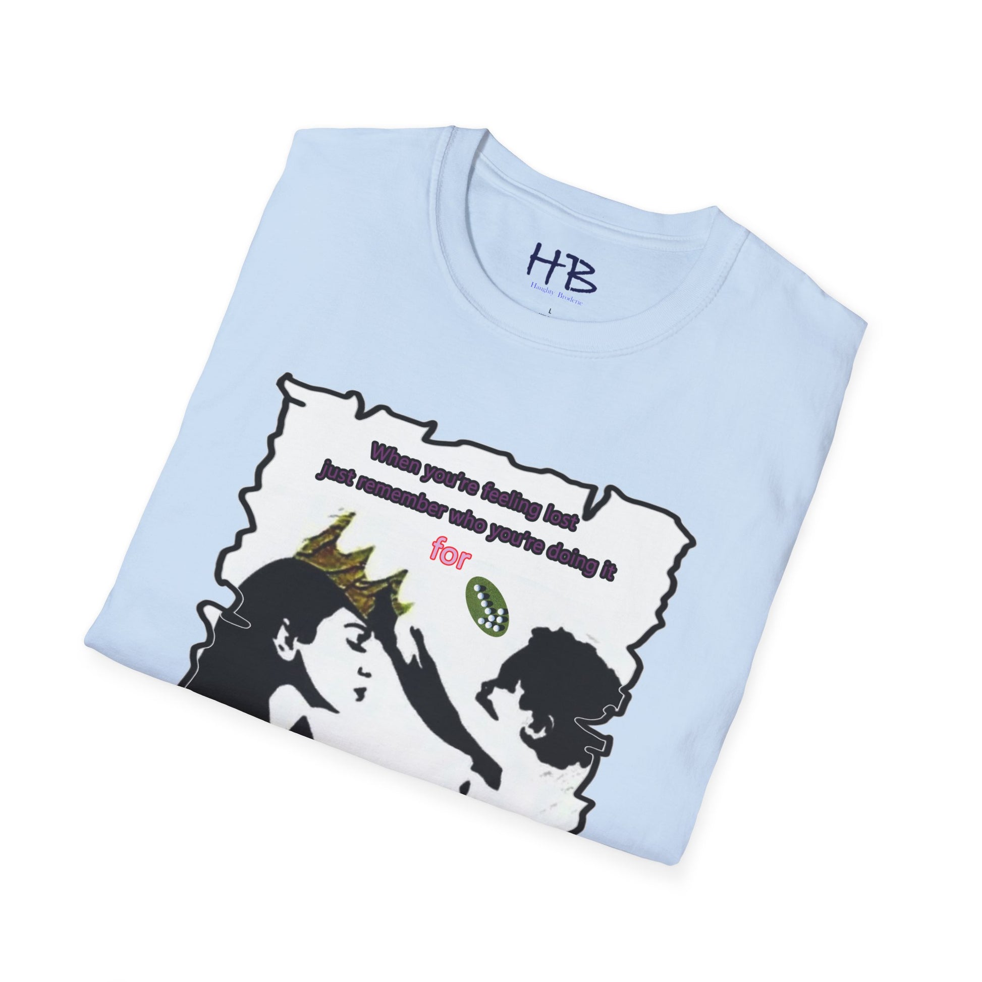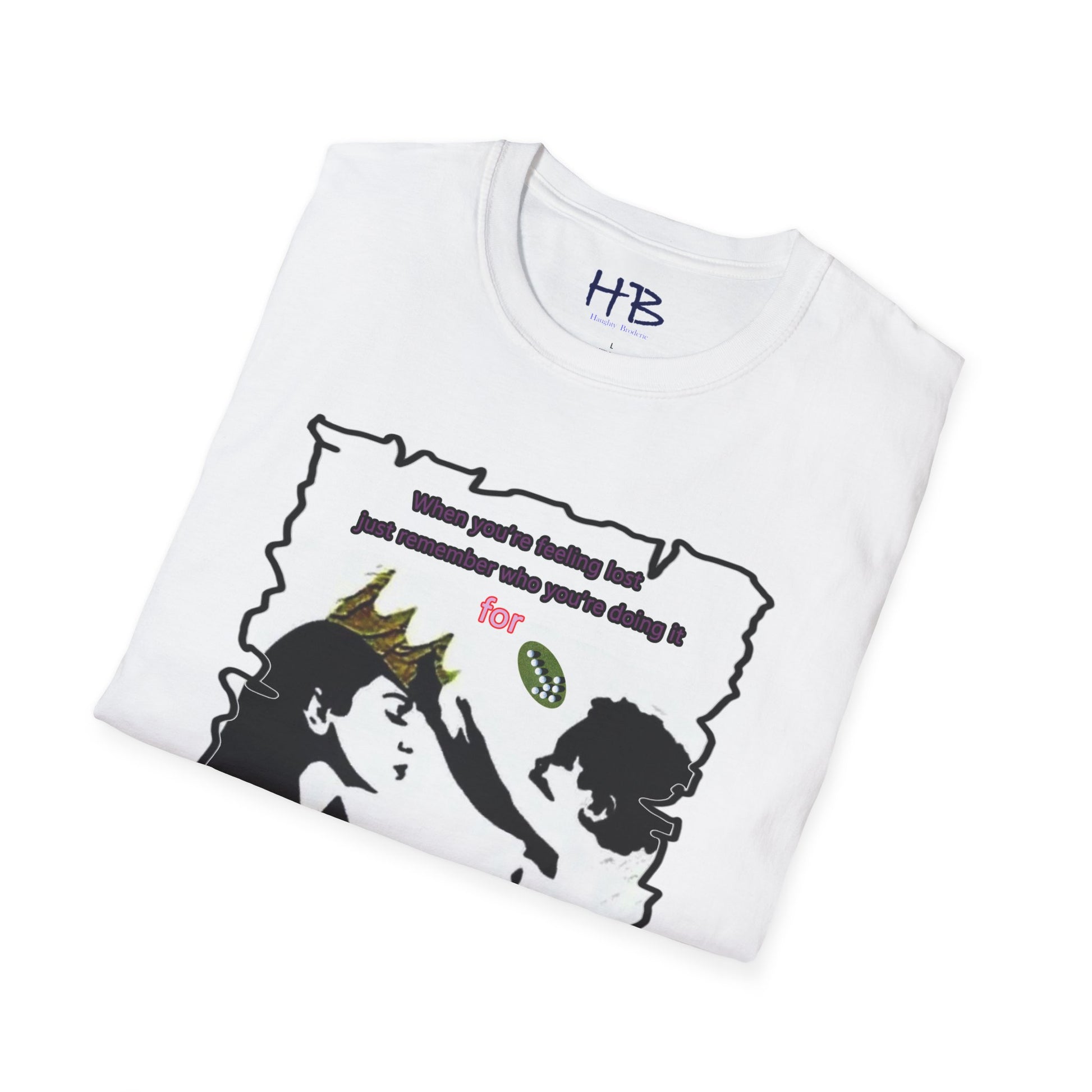 Introducing our exquisite t-shirt featuring a stunning illustration of a maternal figure and her offspring placing a regal headpiece atop her crown. The accompanying text serves as a poignant reminder to those who may feel adrift or uncertain in life, urging them to reflect upon their motivations and remember their true purpose.