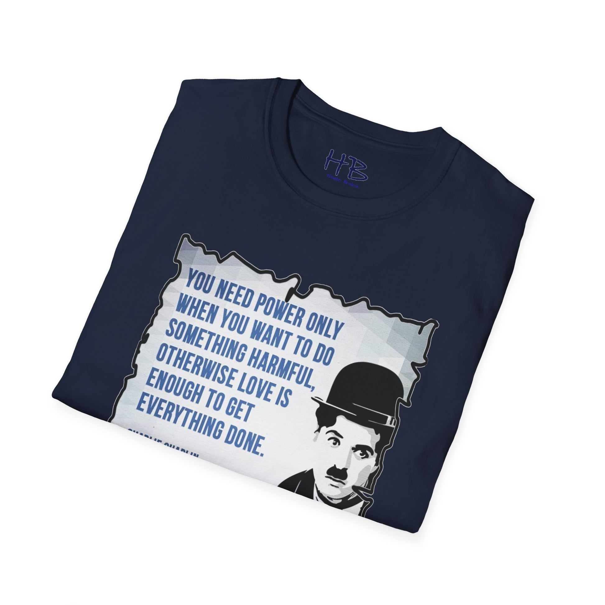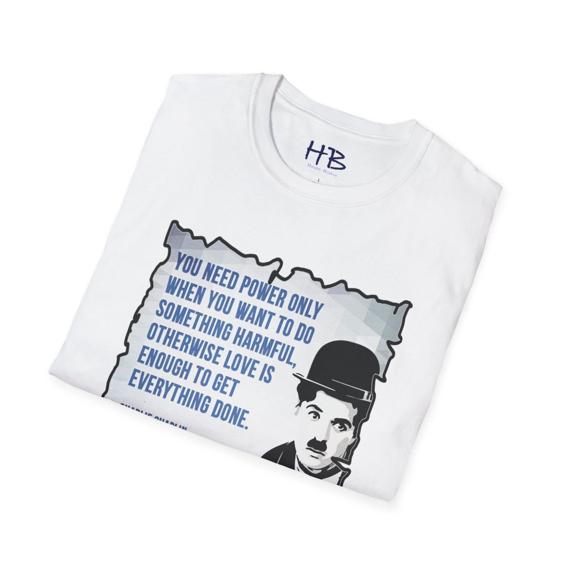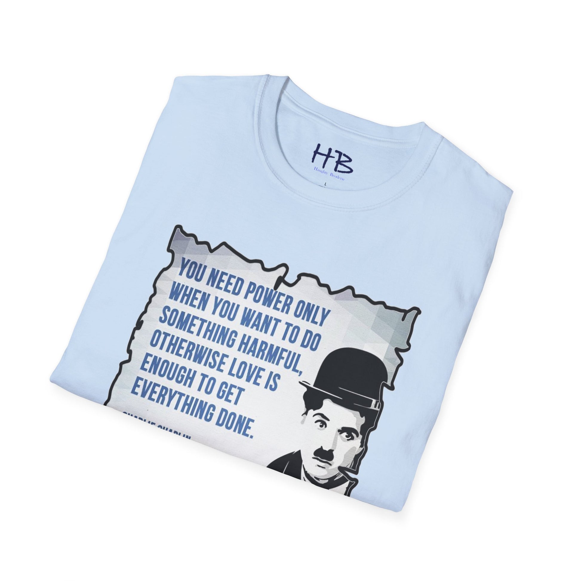 Introducing our remarkable garment featuring a captivating artwork of the legendary Charlie Chaplin, accompanied by one of his timeless quotes: "You need power only when you want to do something harmful, otherwise Love is enough to get everything done." This exquisite tee shirt is not just an apparel item; it's a symbol of wisdom, compassion, and the power of love.