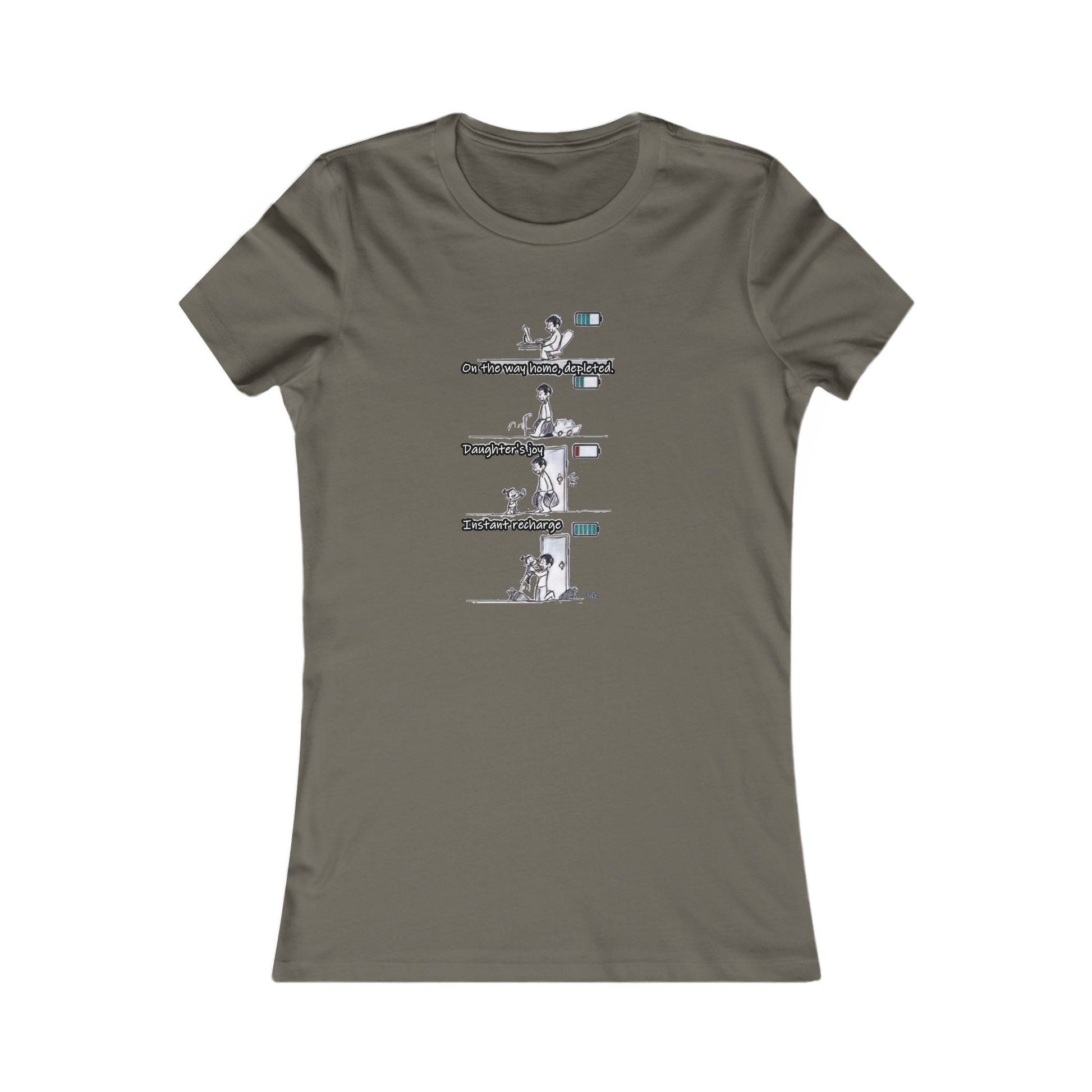 Embark on a visual journey with this uniquely designed tee that tells a compelling story in four captivating frames. At the top, witness a dedicated man immersed in his work at the office, pushing through challenges with only three green bars of energy on his metaphorical battery – a true depiction of the draining workday.
