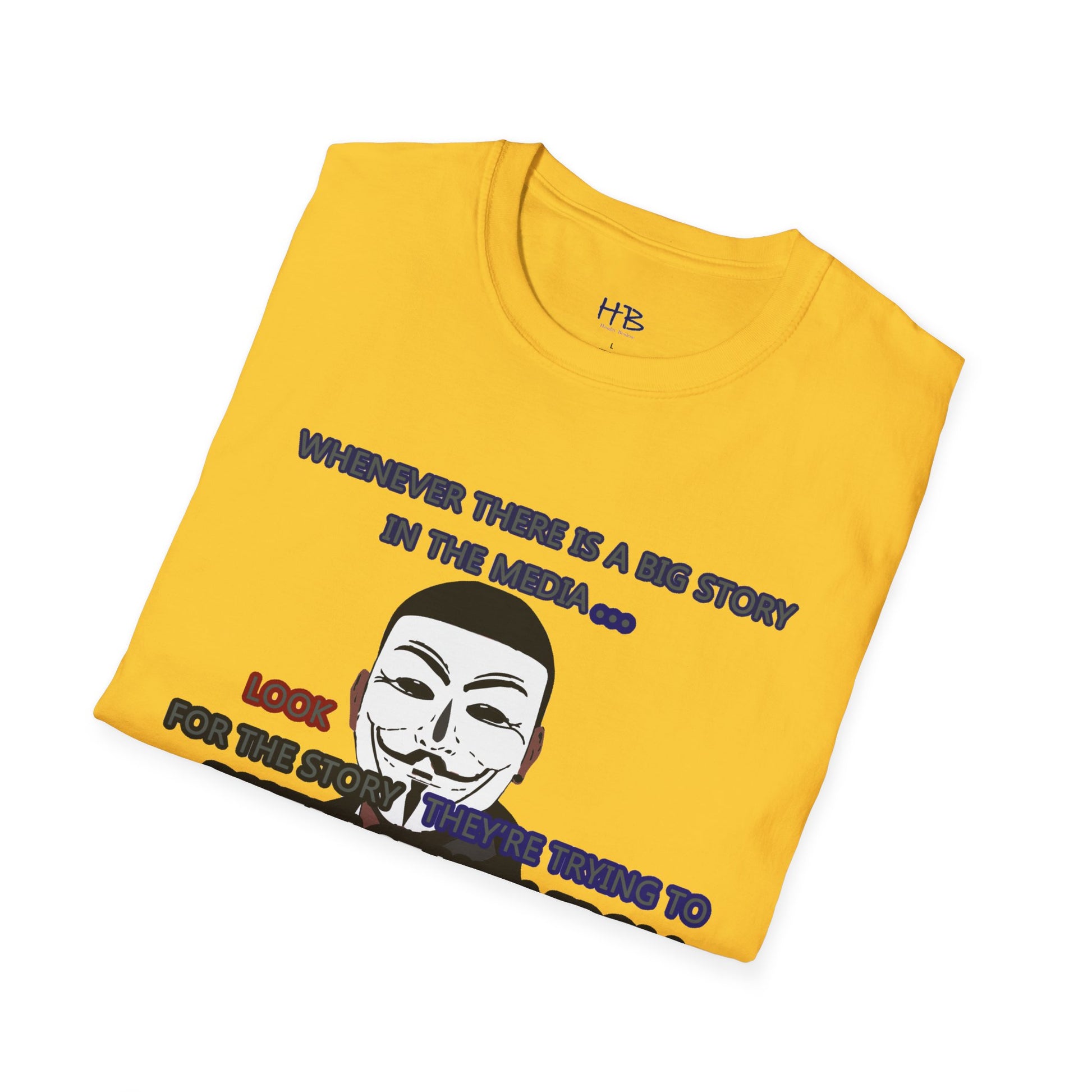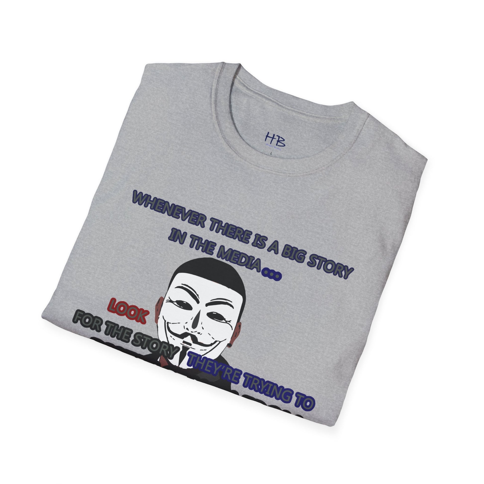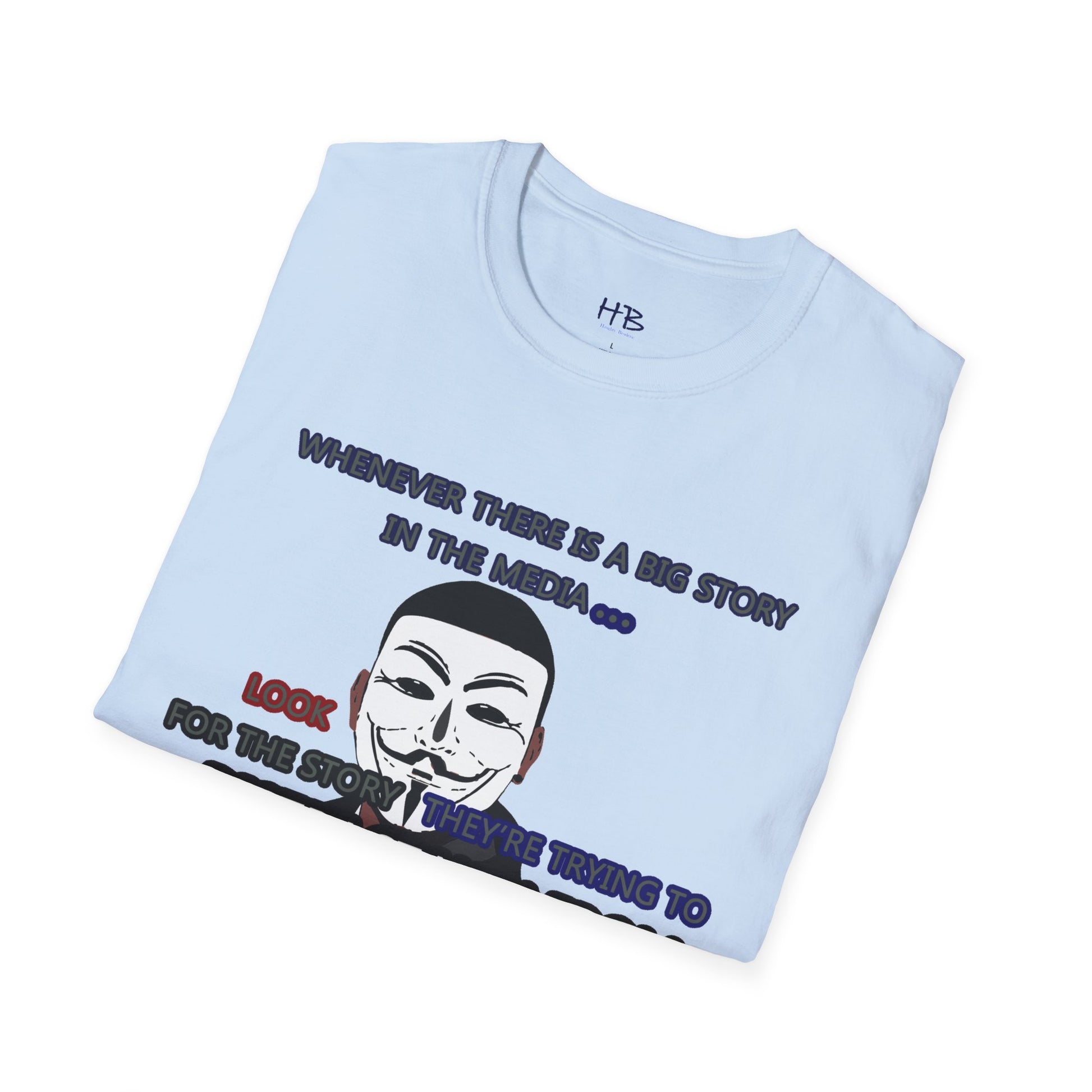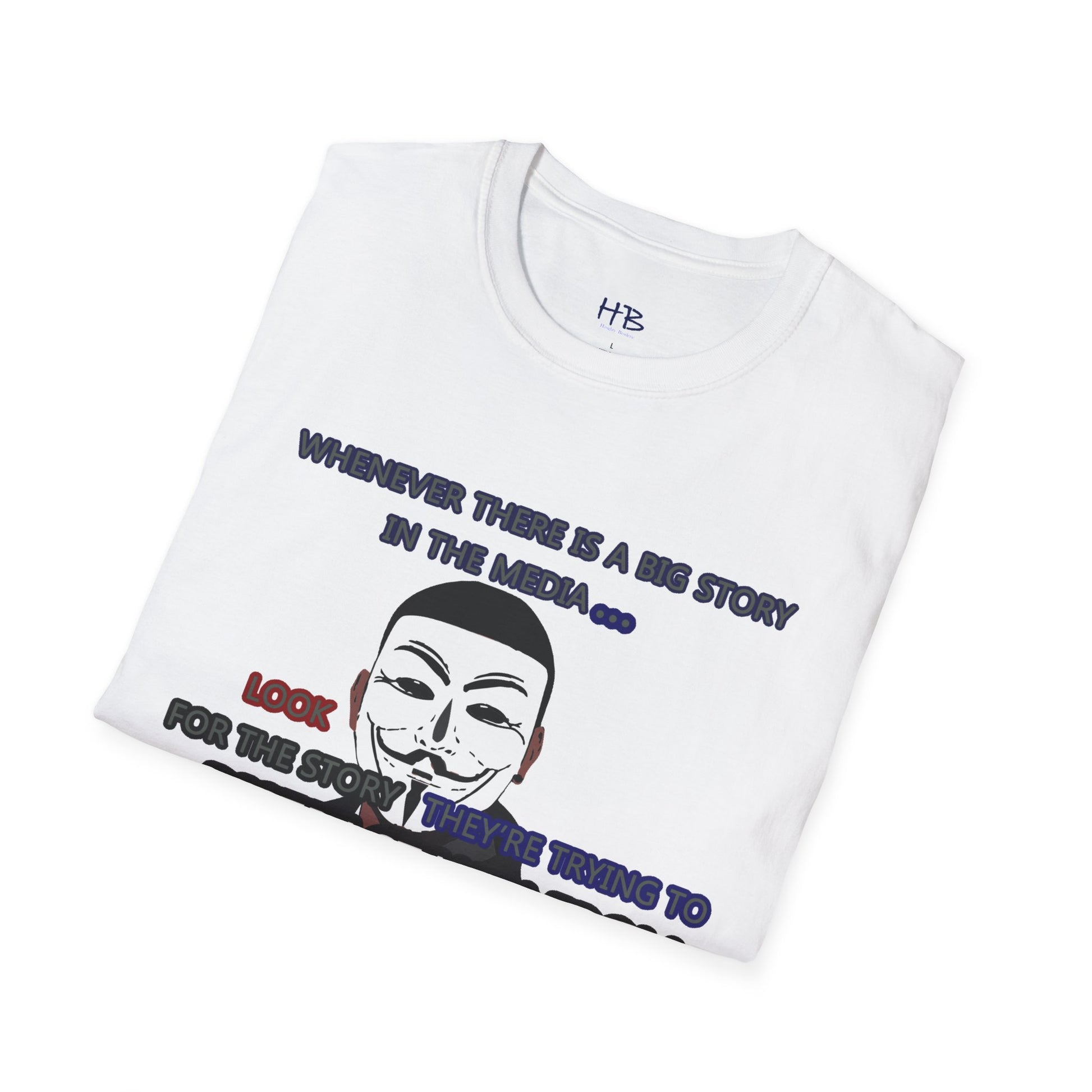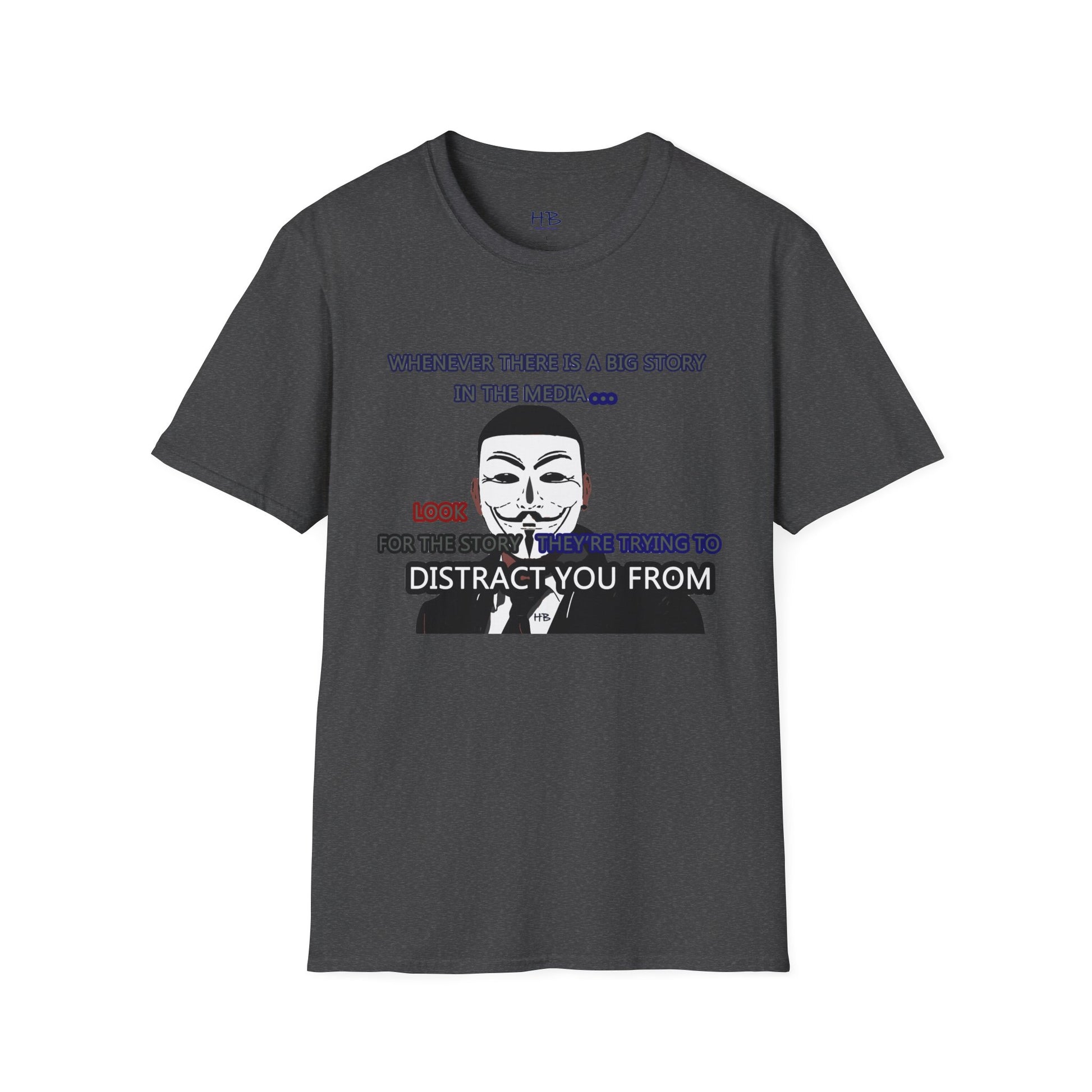The powerful image of the anonymous face mask serves as a compelling symbol of resistance against injustice and the questioning of authority. Coupled with the impactful statement, "Whenever there is a big story in the media... Look for the story they're trying to distract you from," this tee shirt urges individuals to remain vigilant and not passively accept information disseminated by the media.