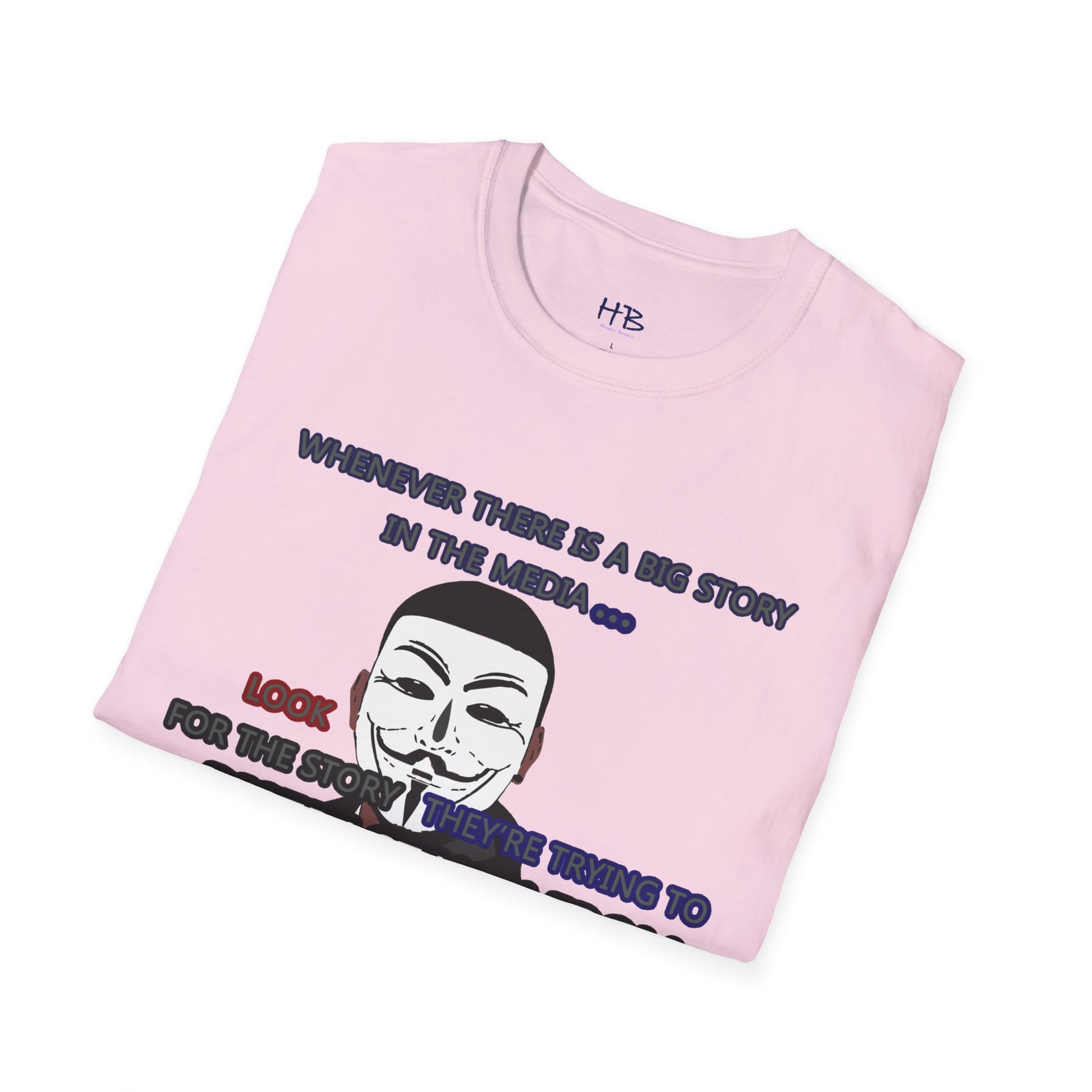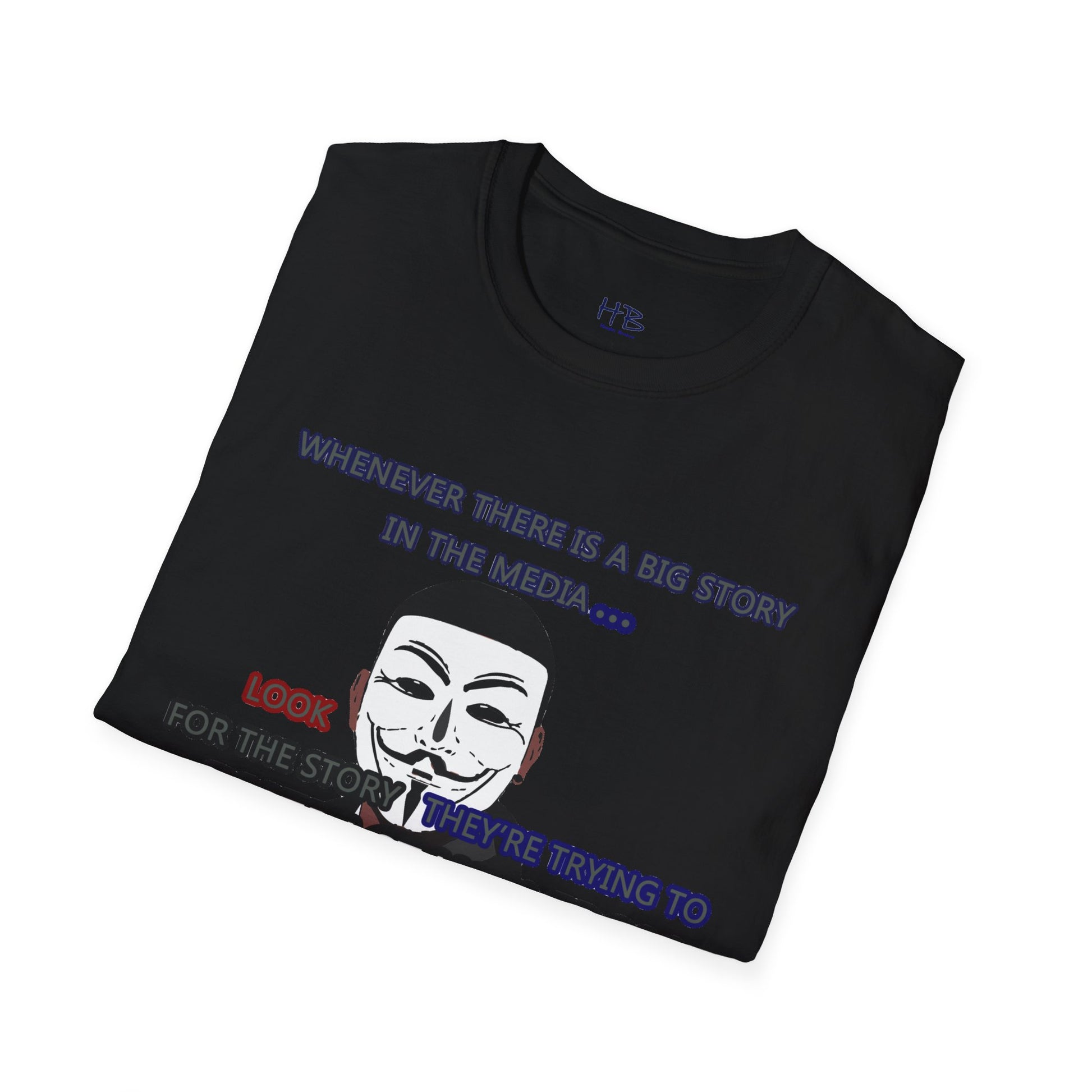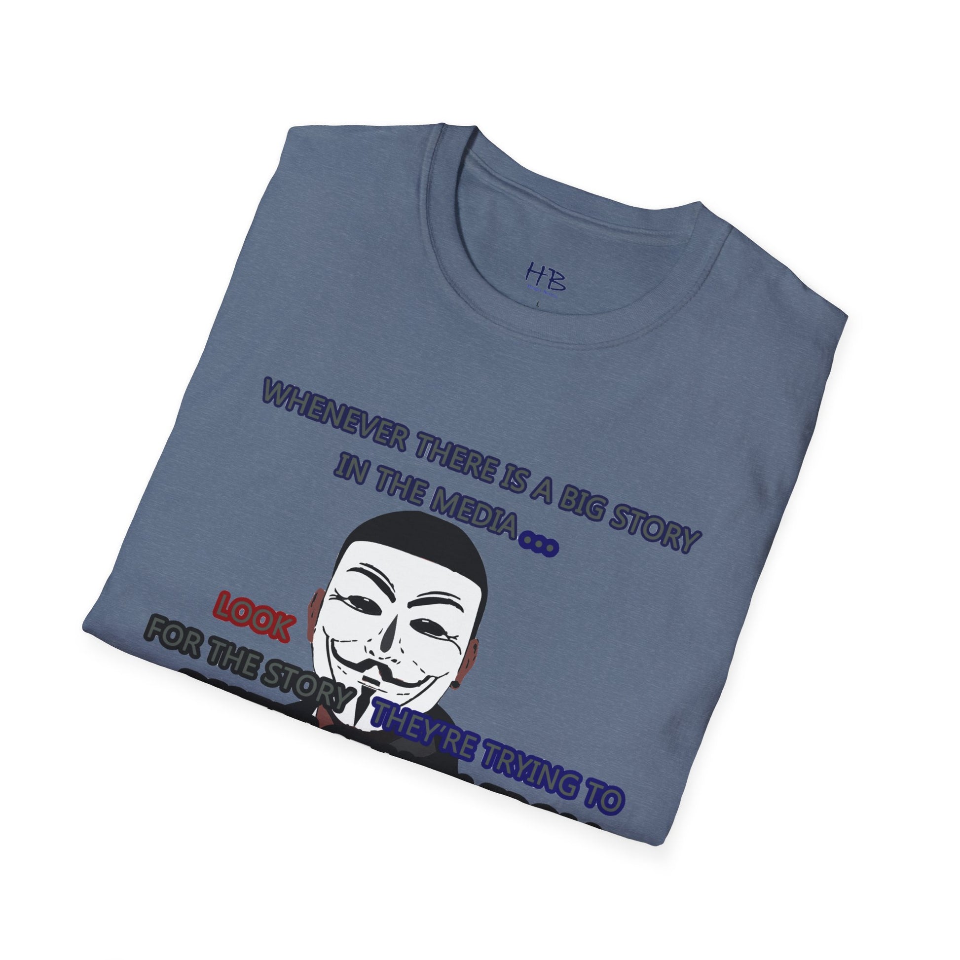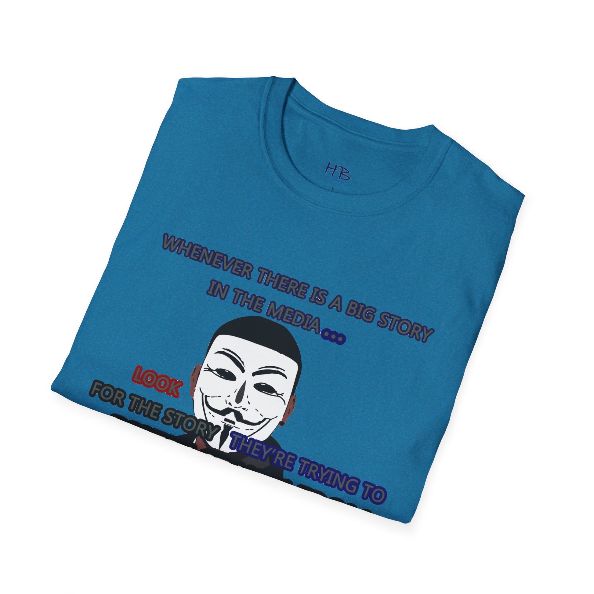 The powerful image of the anonymous face mask serves as a compelling symbol of resistance against injustice and the questioning of authority. Coupled with the impactful statement, "Whenever there is a big story in the media... Look for the story they're trying to distract you from," this tee shirt urges individuals to remain vigilant and not passively accept information disseminated by the media.