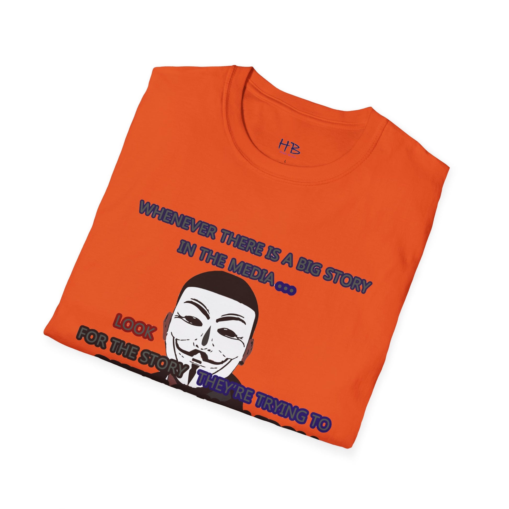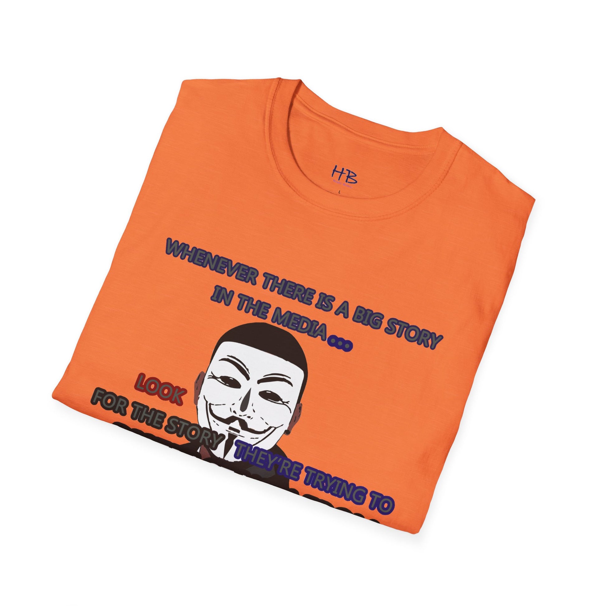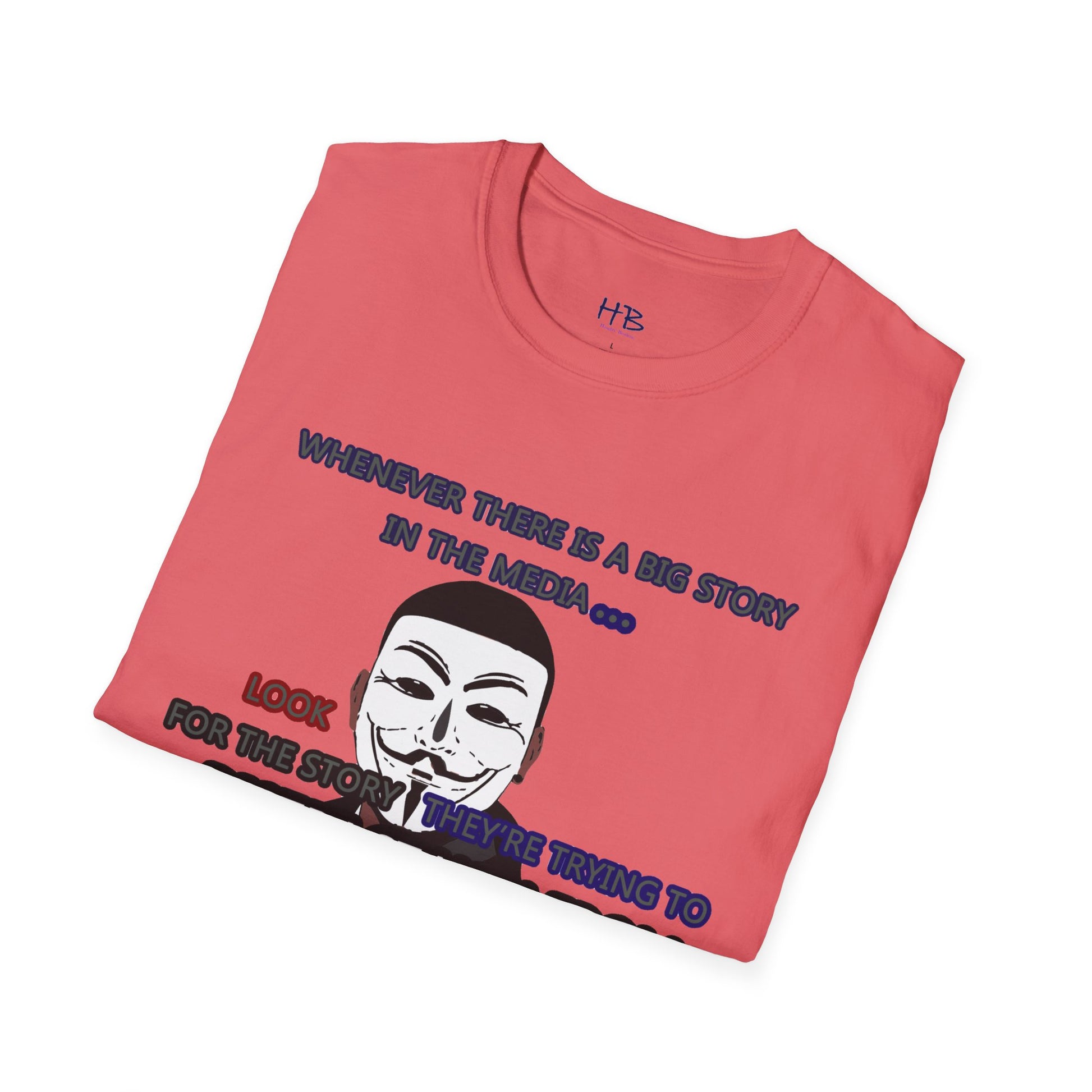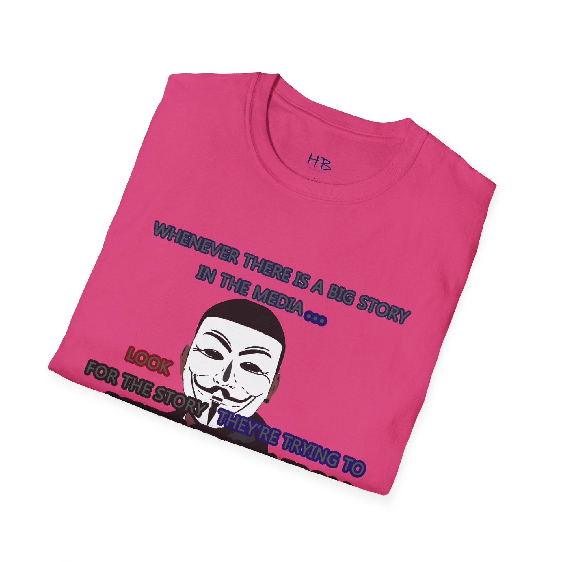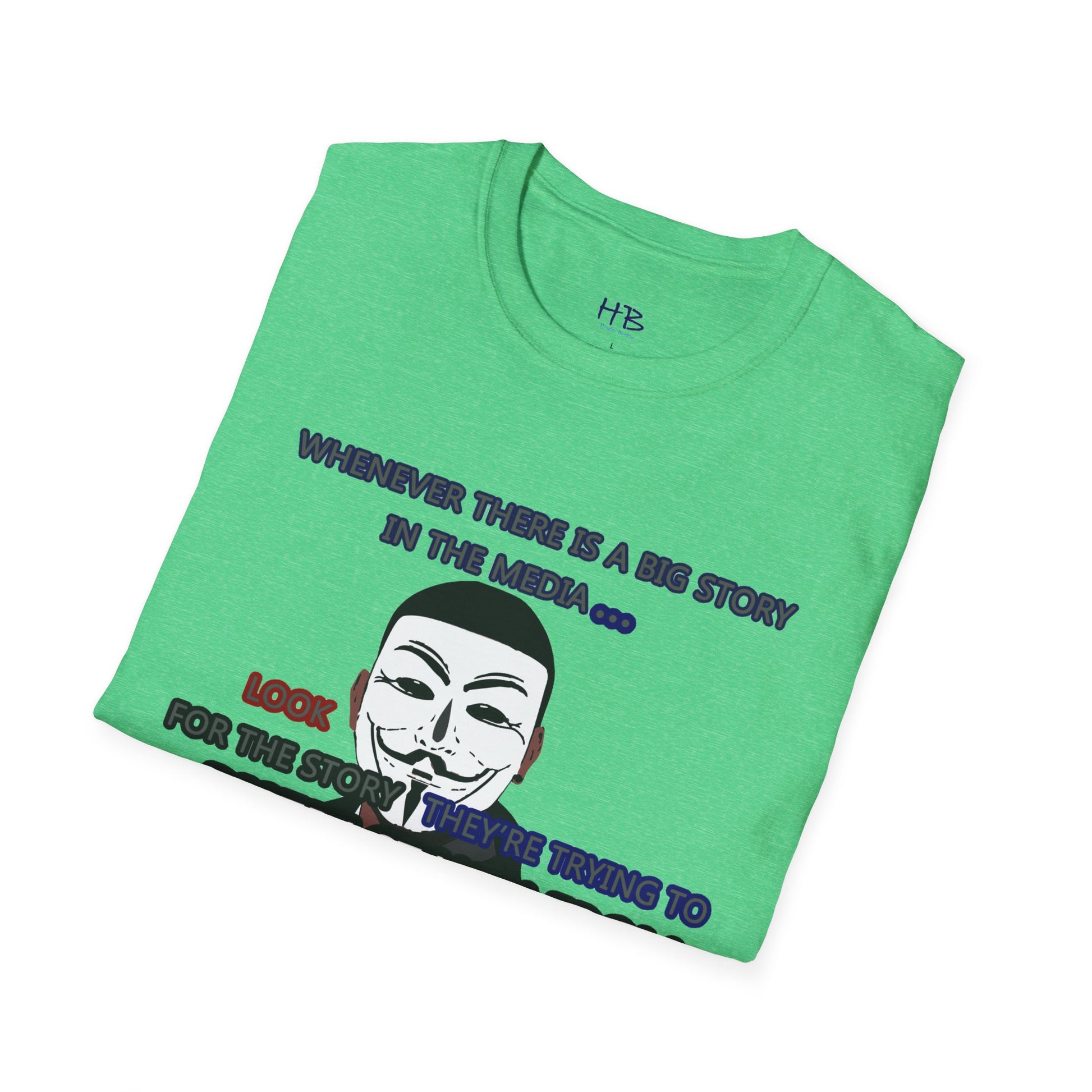 The powerful image of the anonymous face mask serves as a compelling symbol of resistance against injustice and the questioning of authority. Coupled with the impactful statement, "Whenever there is a big story in the media... Look for the story they're trying to distract you from," this tee shirt urges individuals to remain vigilant and not passively accept information disseminated by the media.
