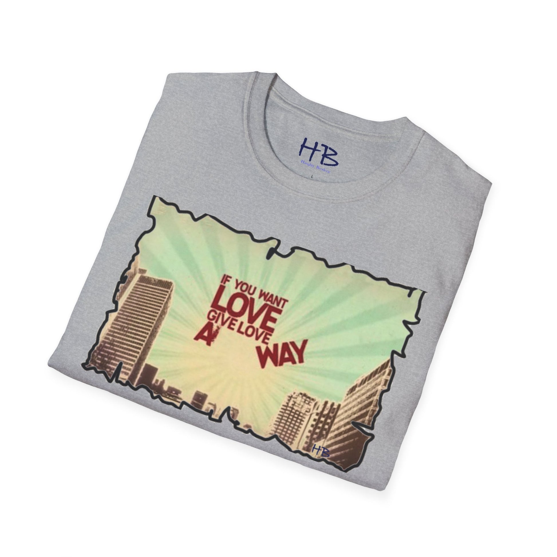 Step into a world of love and connection with our Love-Giving Cityscape Tee Shirt! This striking tee showcases a captivating image of high rise buildings on the left and right sides, forming a vibrant urban backdrop. In the midst of this bustling cityscape, you'll find an inspiring message emblazoned in bold letters, "IF YOU WANT LOVE GIVE LOVE A WAY."