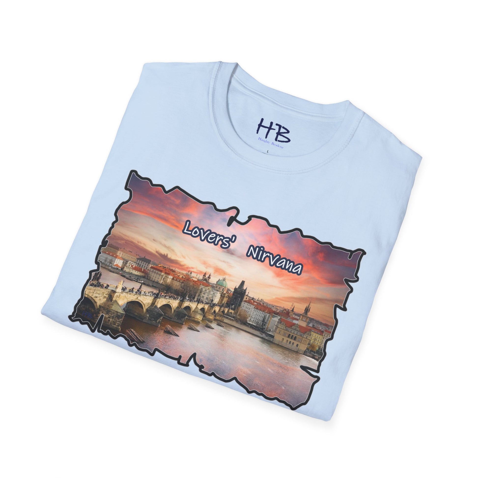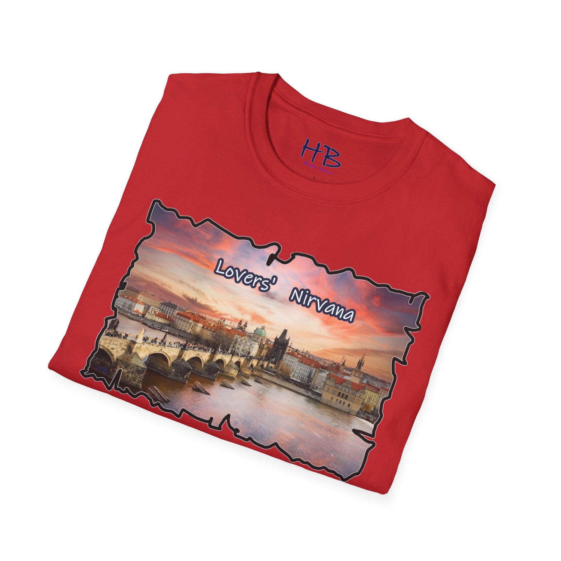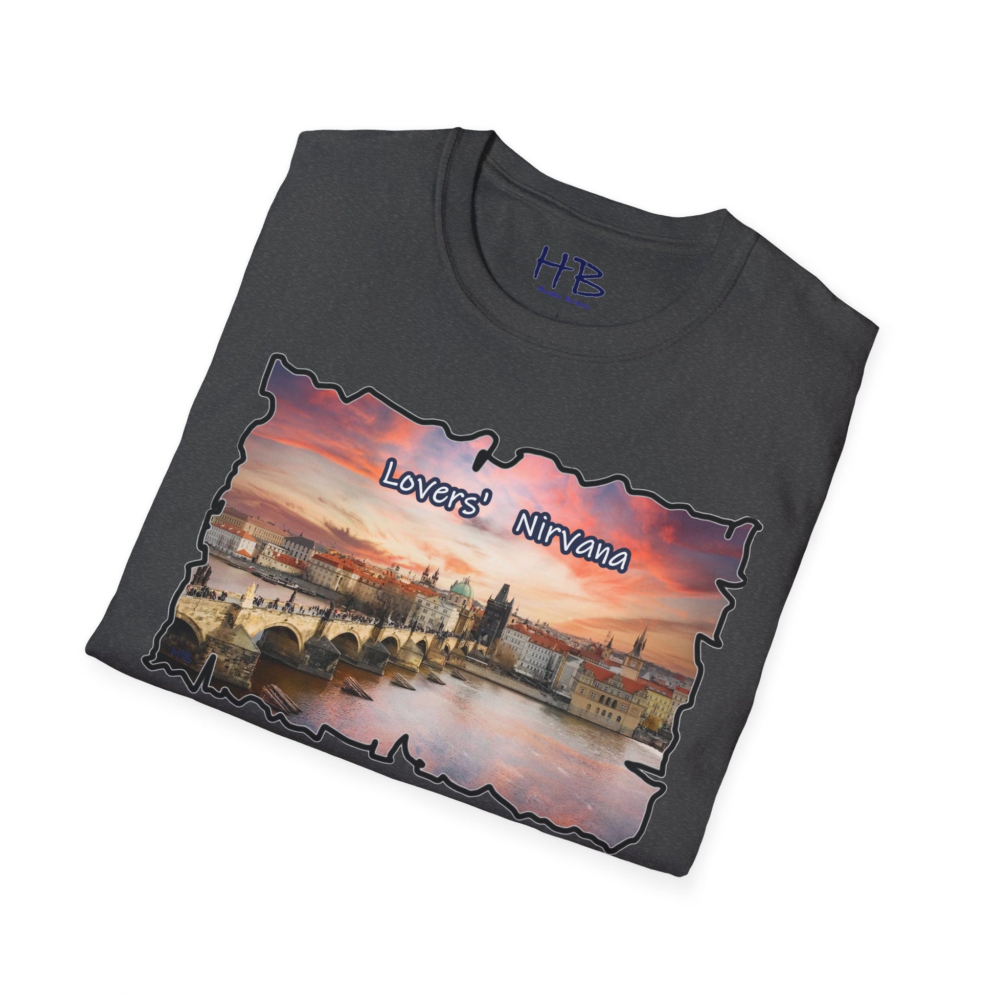 Introducing our latest wearable masterpiece, a living canvas that captures the essence of a sought-after tourist haven – a picturesque river coursing through the heart of Prague, Czech Republic, framed by the architectural splendor of this historic city. Immerse yourself in the vibrant hues of a sunset-kissed sky that serves as the backdrop to this enchanting scene. Our T-shirt, emblazoned with the words "Lovers' Nirvana," is more than a garment; it's an invitation to explore the beauty of love and the allure of travel.
