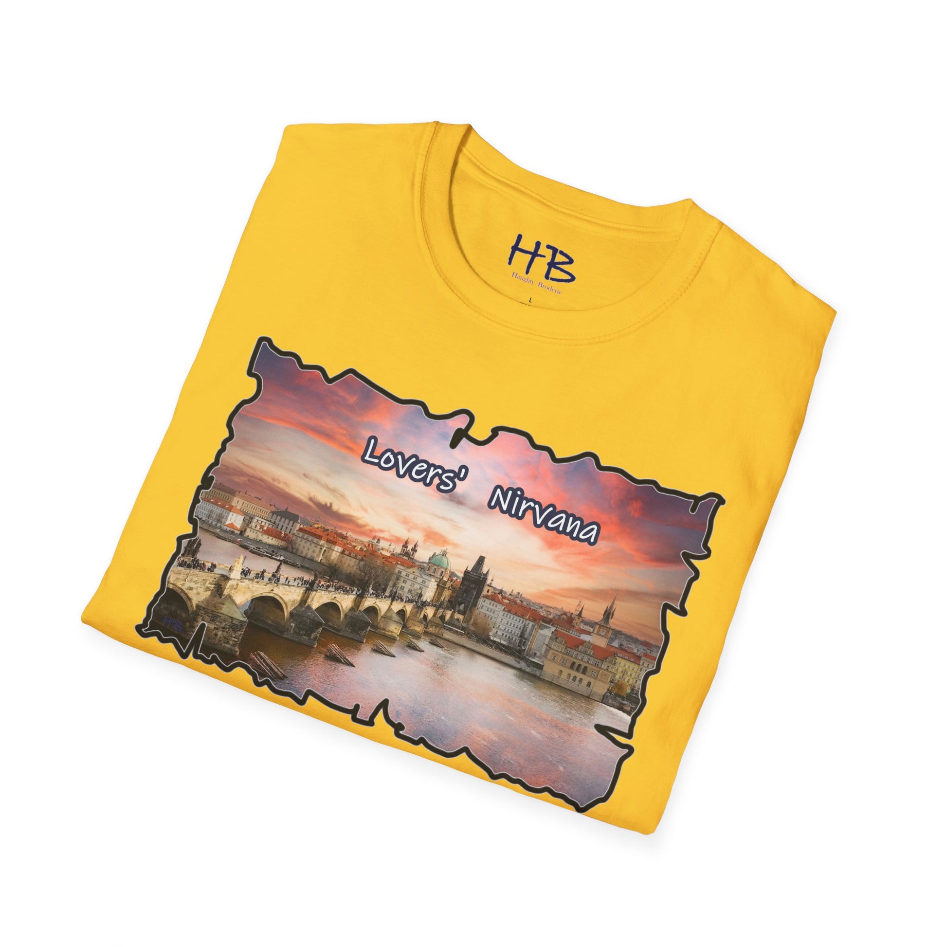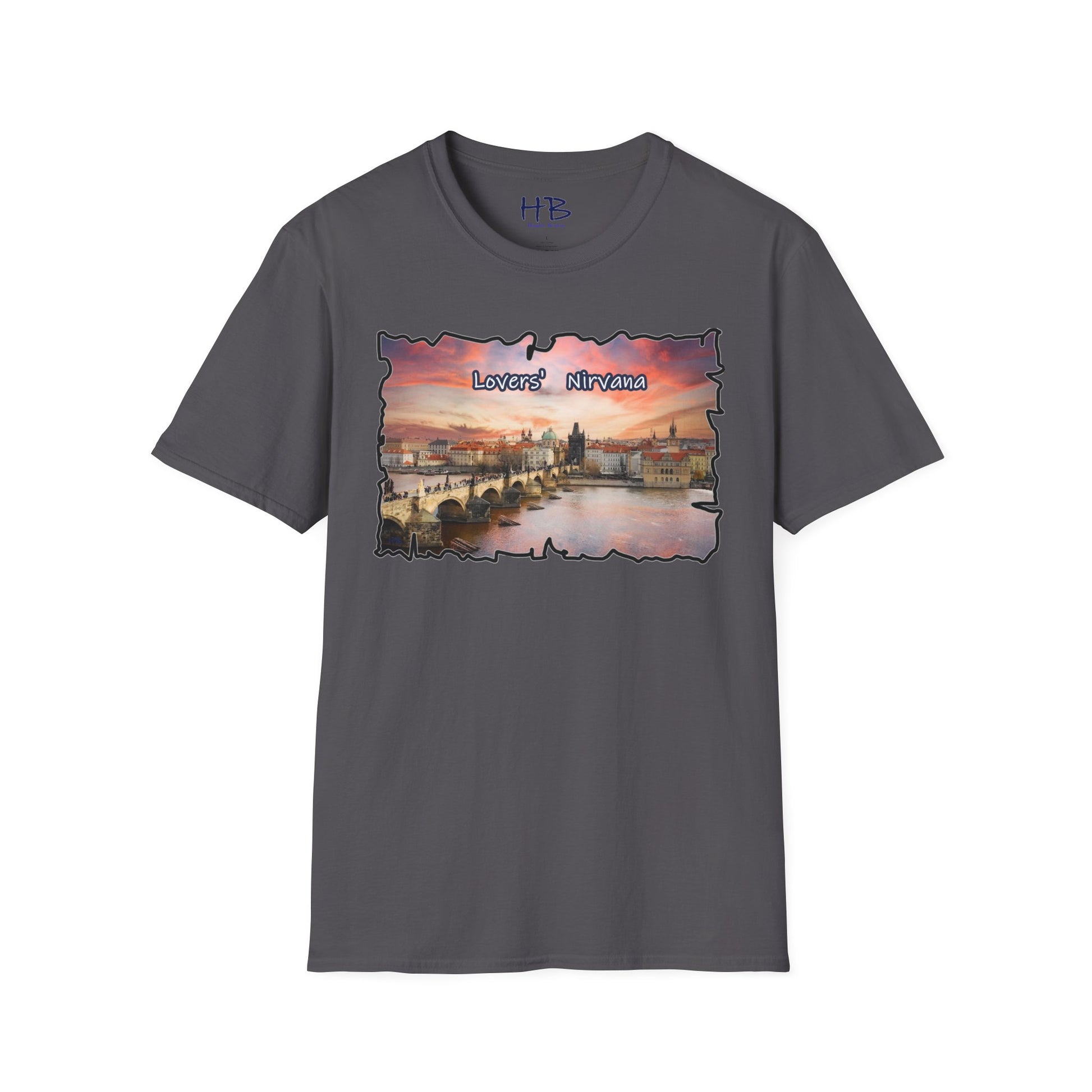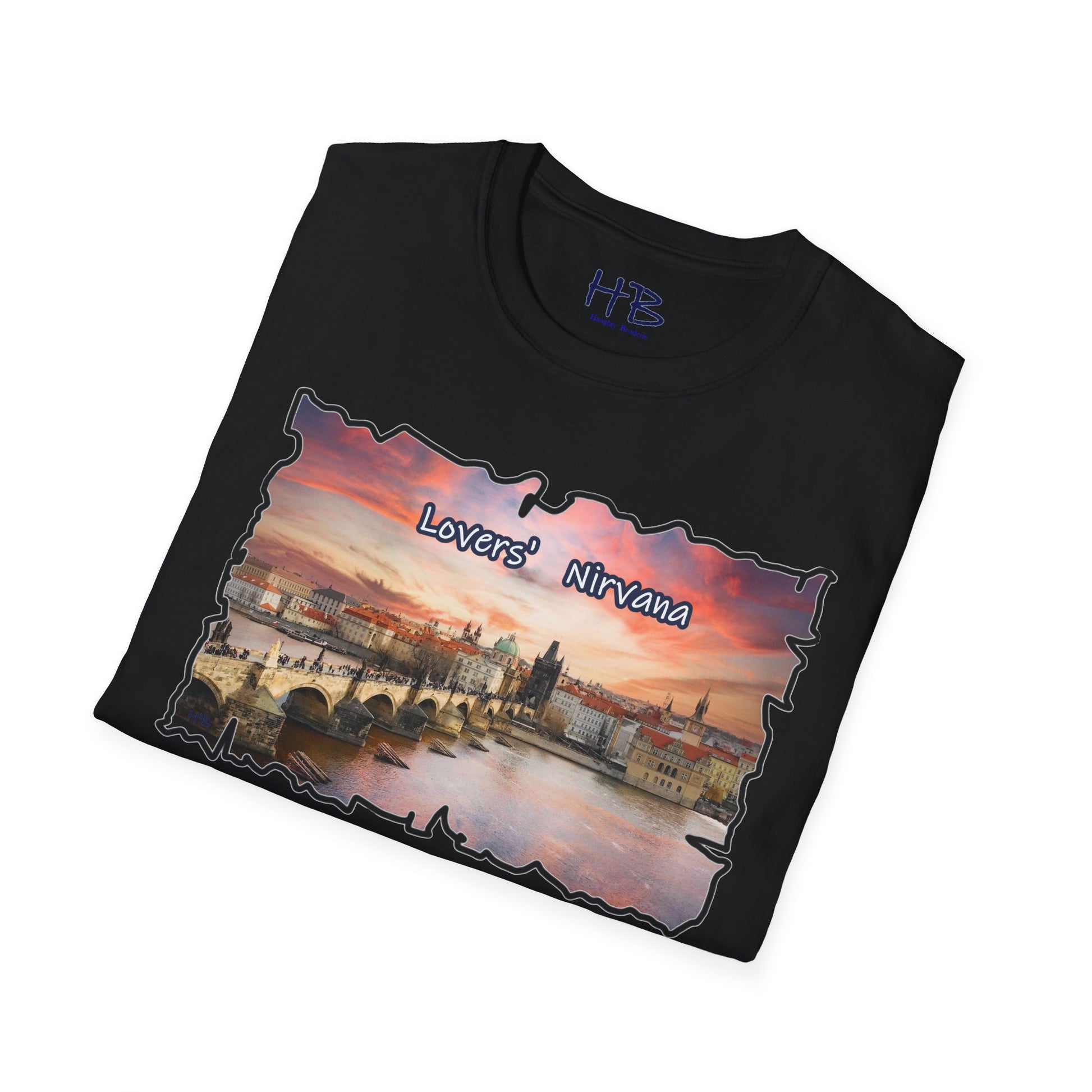 Introducing our latest wearable masterpiece, a living canvas that captures the essence of a sought-after tourist haven – a picturesque river coursing through the heart of Prague, Czech Republic, framed by the architectural splendor of this historic city. Immerse yourself in the vibrant hues of a sunset-kissed sky that serves as the backdrop to this enchanting scene. Our T-shirt, emblazoned with the words "Lovers' Nirvana," is more than a garment; it's an invitation to explore the beauty of love and the allure of travel.