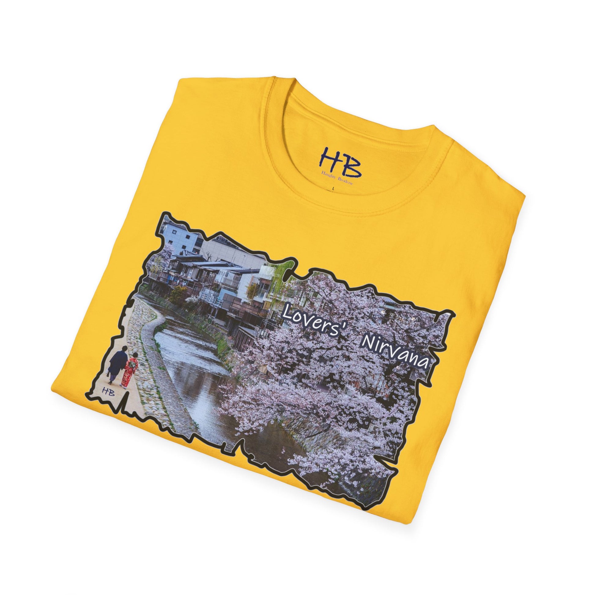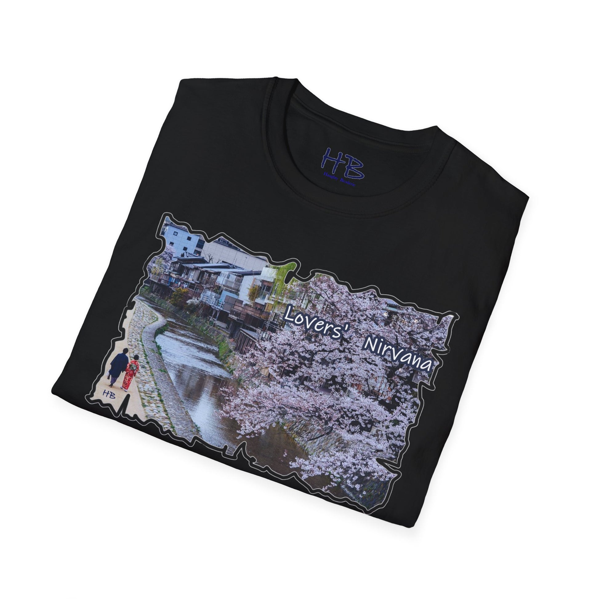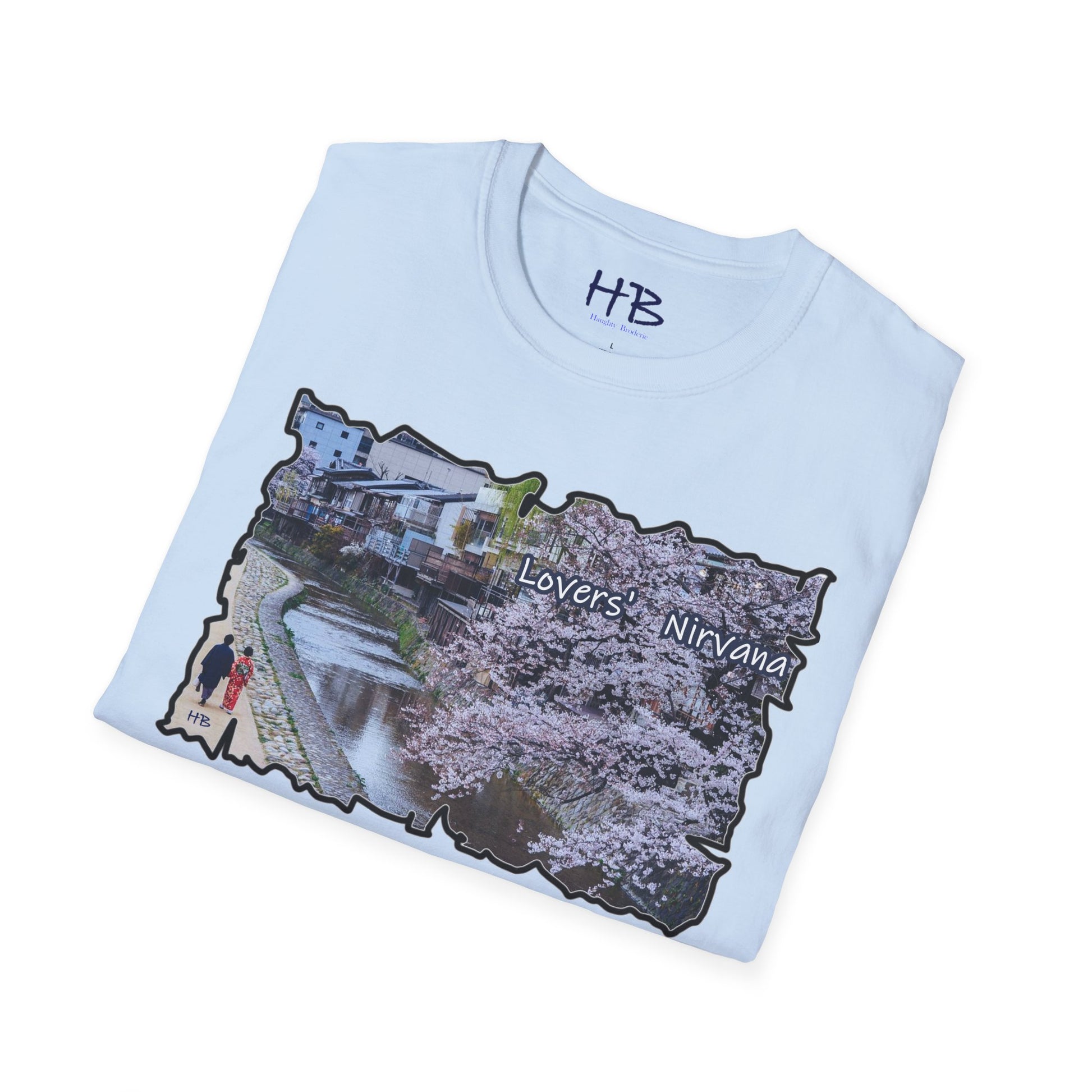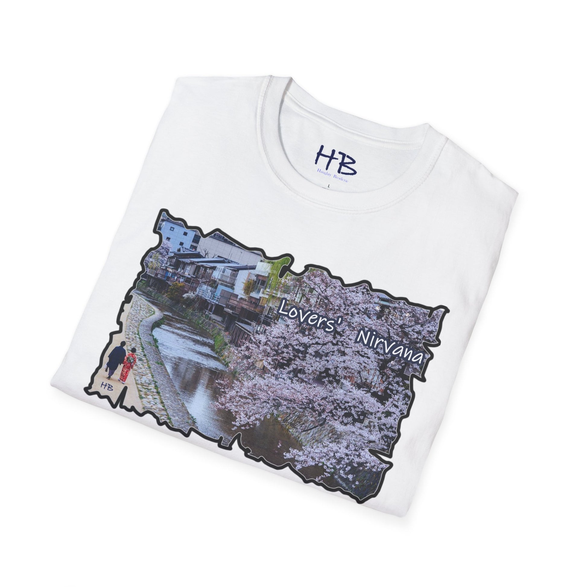 Step into the essence of timeless romance and cultural allure with our exquisite wearable masterpiece—the Lovers' Nirvana Commemorative T-shirt. This captivating garment unfolds a picturesque panorama, capturing the serenity of a sought-after tourist haven, the enchanting river crossing Kyoto. Behold the seamless fusion of Japanese architectural splendor and the delicate bloom of a Sakura tree, gracefully adorned with a cascade of pure white leaves.