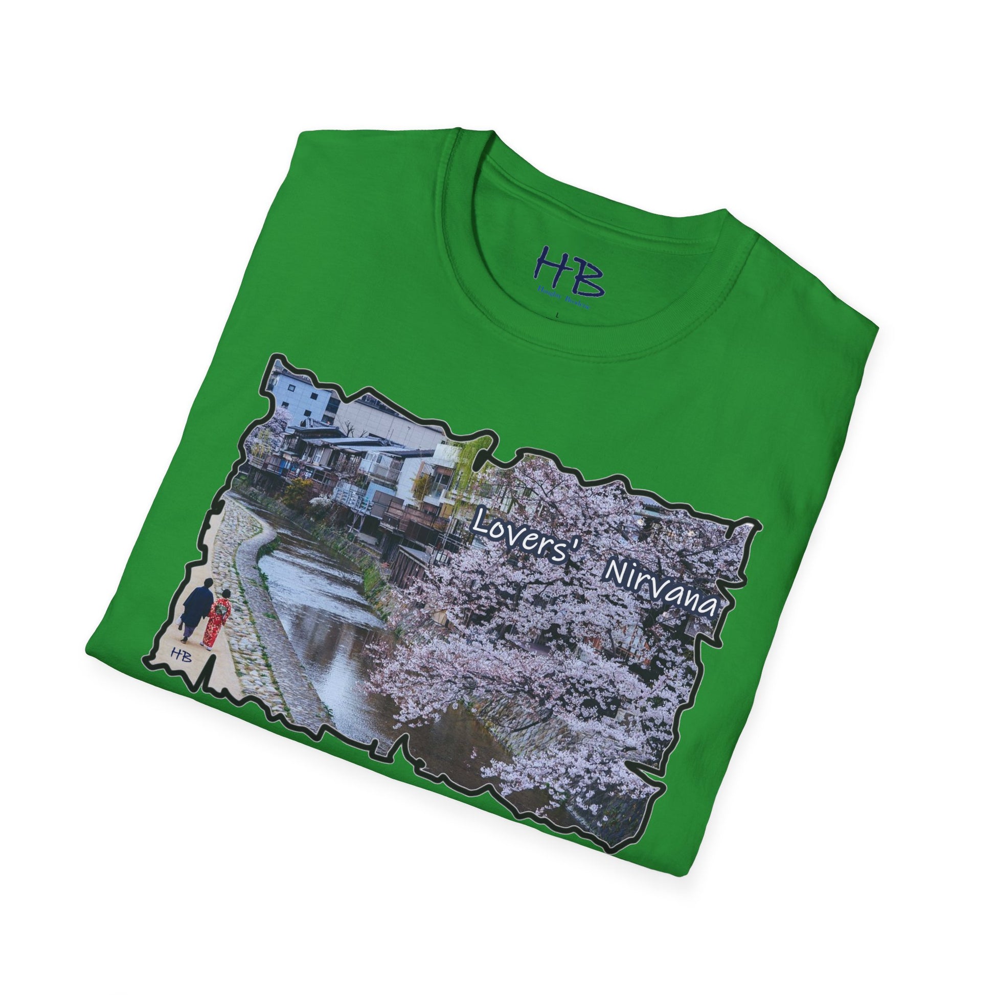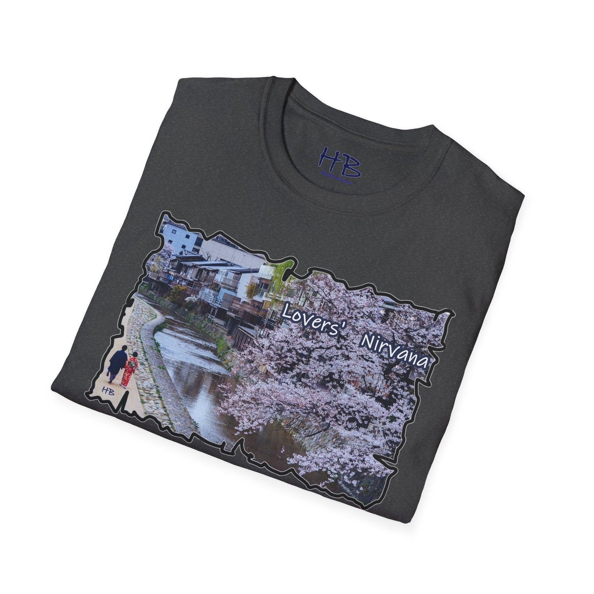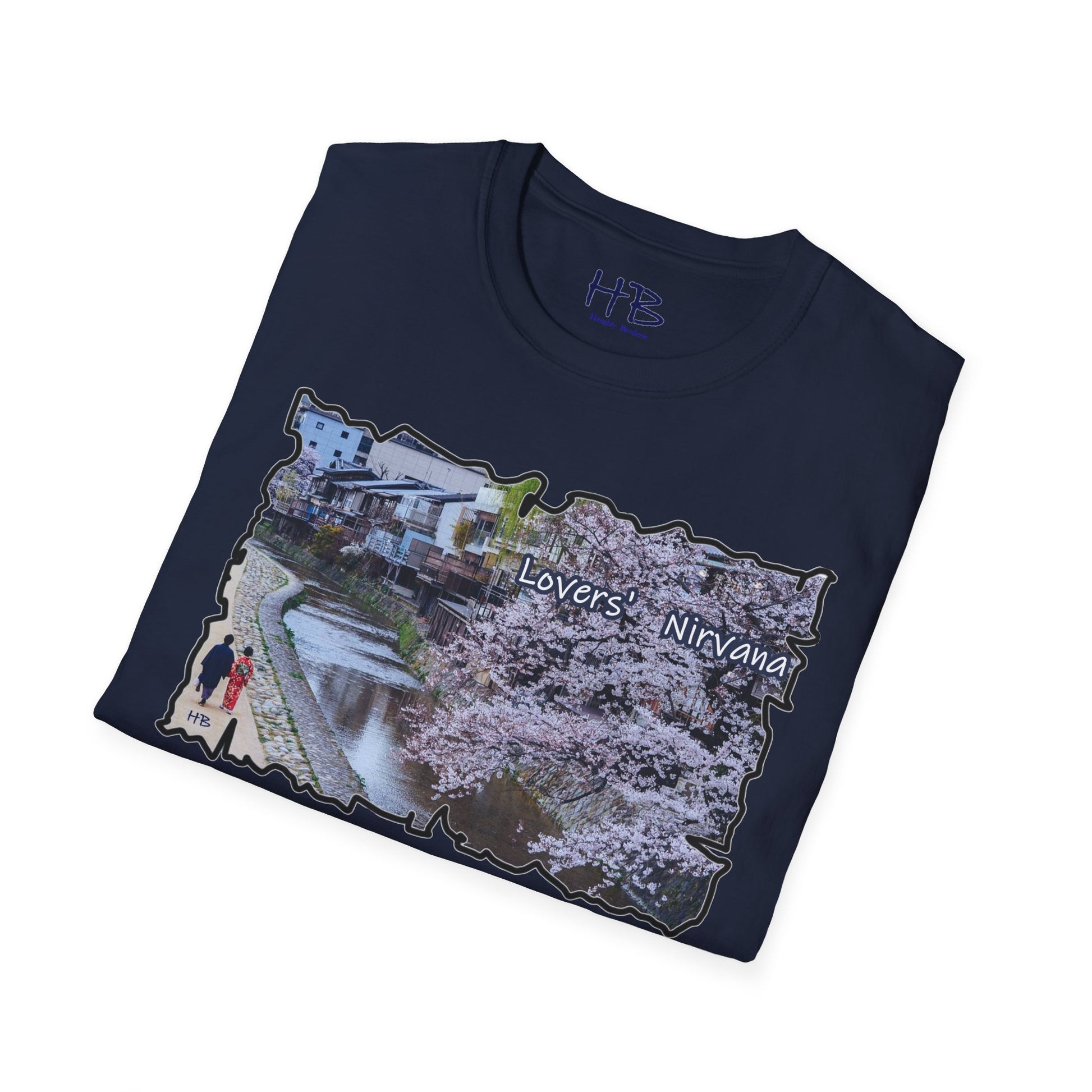 Embark on a visual journey as you traverse the scenic river, where the essence of Kyoto's charm is encapsulated in the intricate details of this finely crafted depiction. The Japanese architecture, meticulously portrayed, evokes a sense of tradition and grace, while the Sakura tree, symbolizing transience and beauty, stands as a testament to nature's poetic artistry. The text delicately inscribed, "Lovers' Nirvana," adds a touch of whimsy and romanticism, inviting wearers to bask in the ambience of shared love and tranquility.