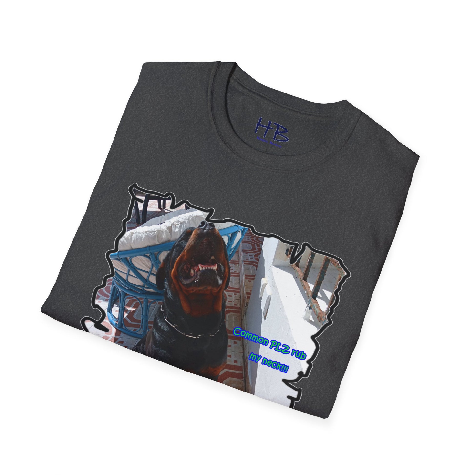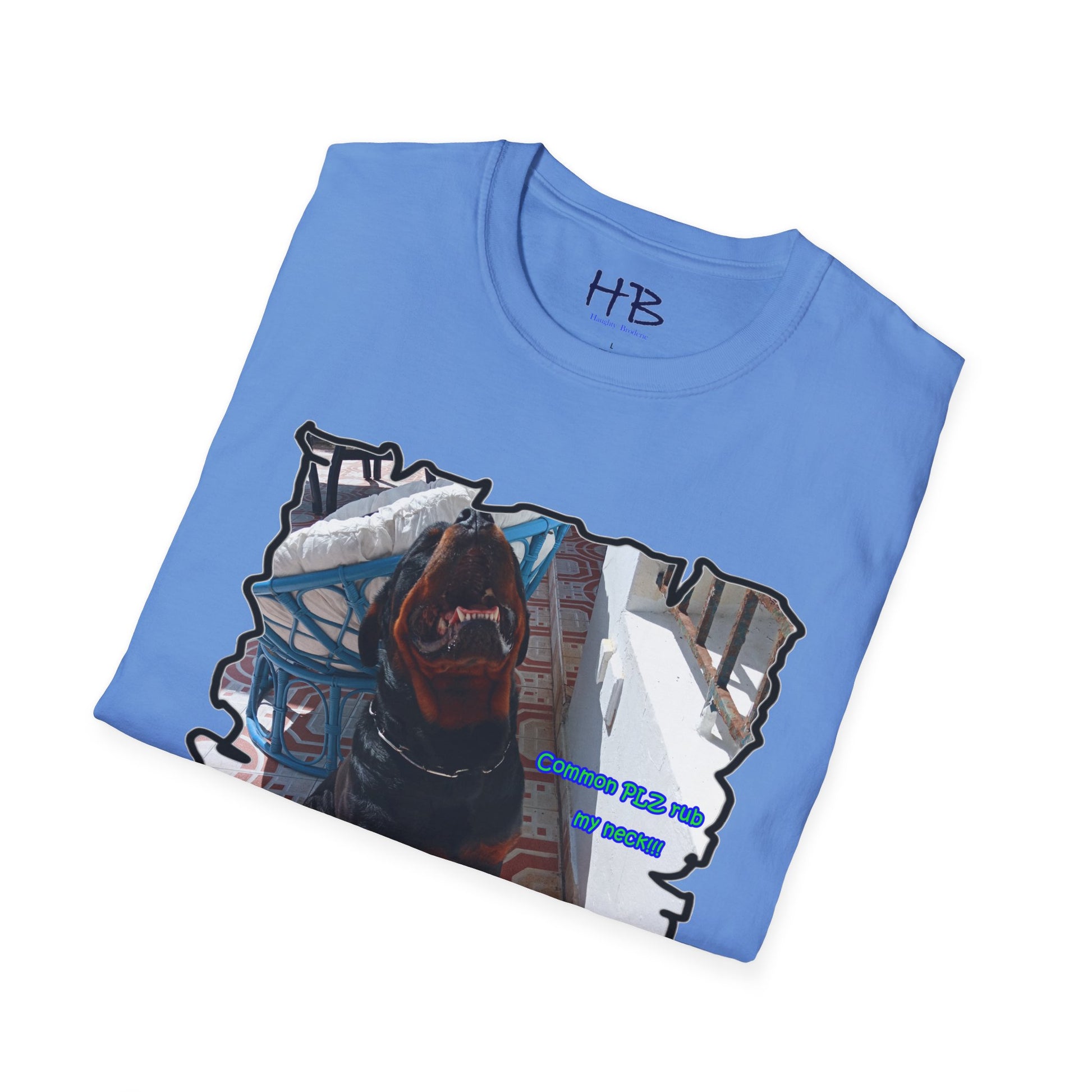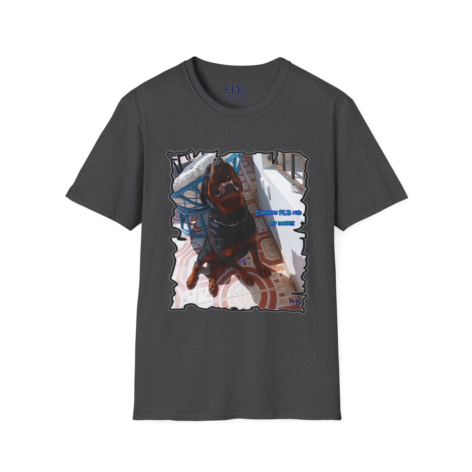 The design features Luke with a charming smile, displaying his pearly whites while his head tilts, presenting his neck. The text on the shirt reads "Common PLZ rub my neck", which is sure to catch the attention of any pet owner looking for a fun and playful tee shirt.