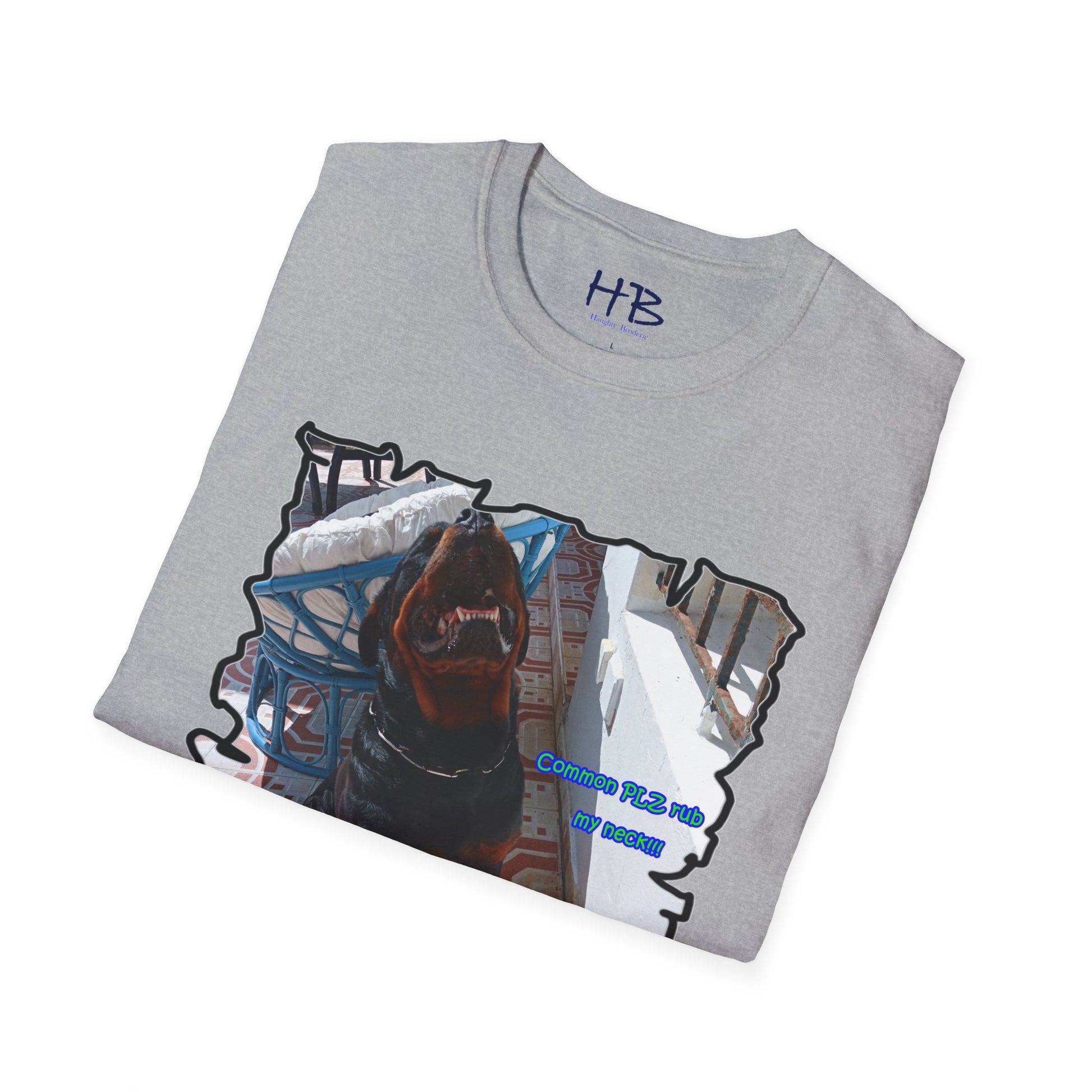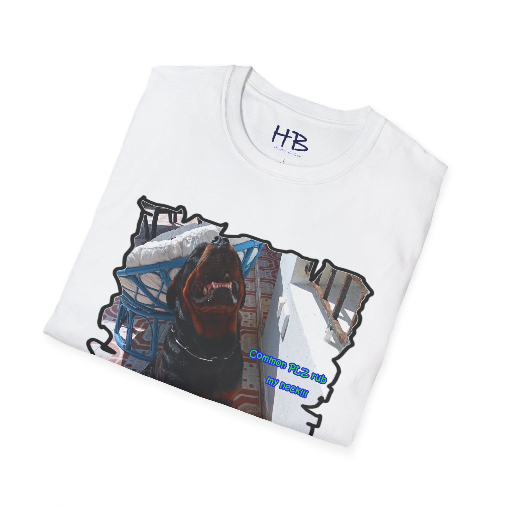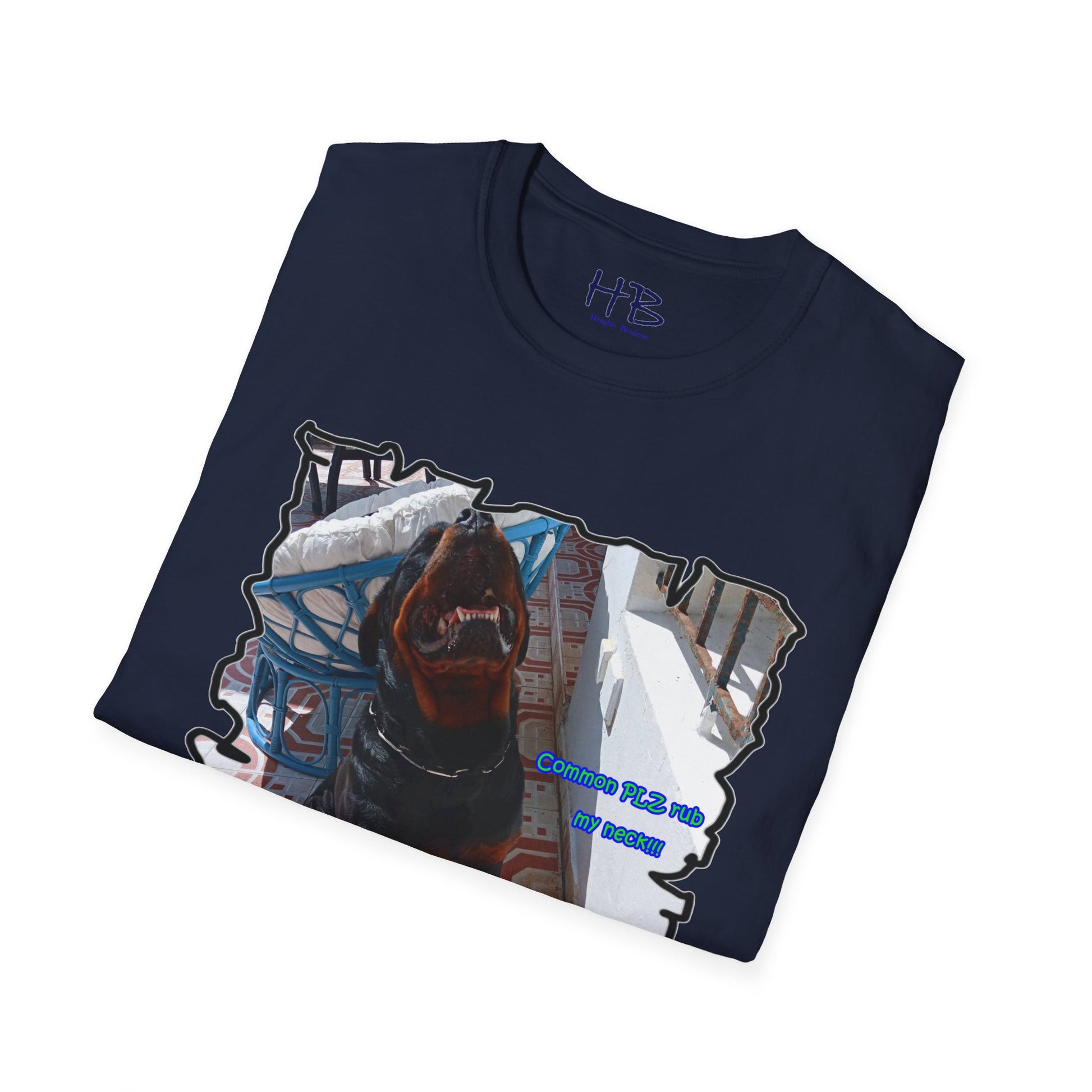The design features Luke with a charming smile, displaying his pearly whites while his head tilts, presenting his neck. The text on the shirt reads "Common PLZ rub my neck", which is sure to catch the attention of any pet owner looking for a fun and playful tee shirt.