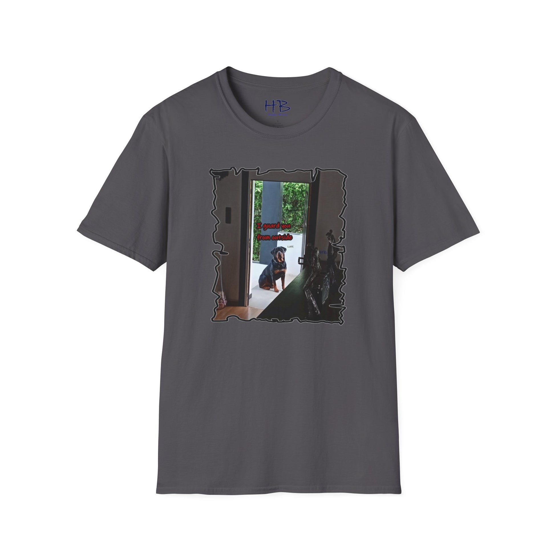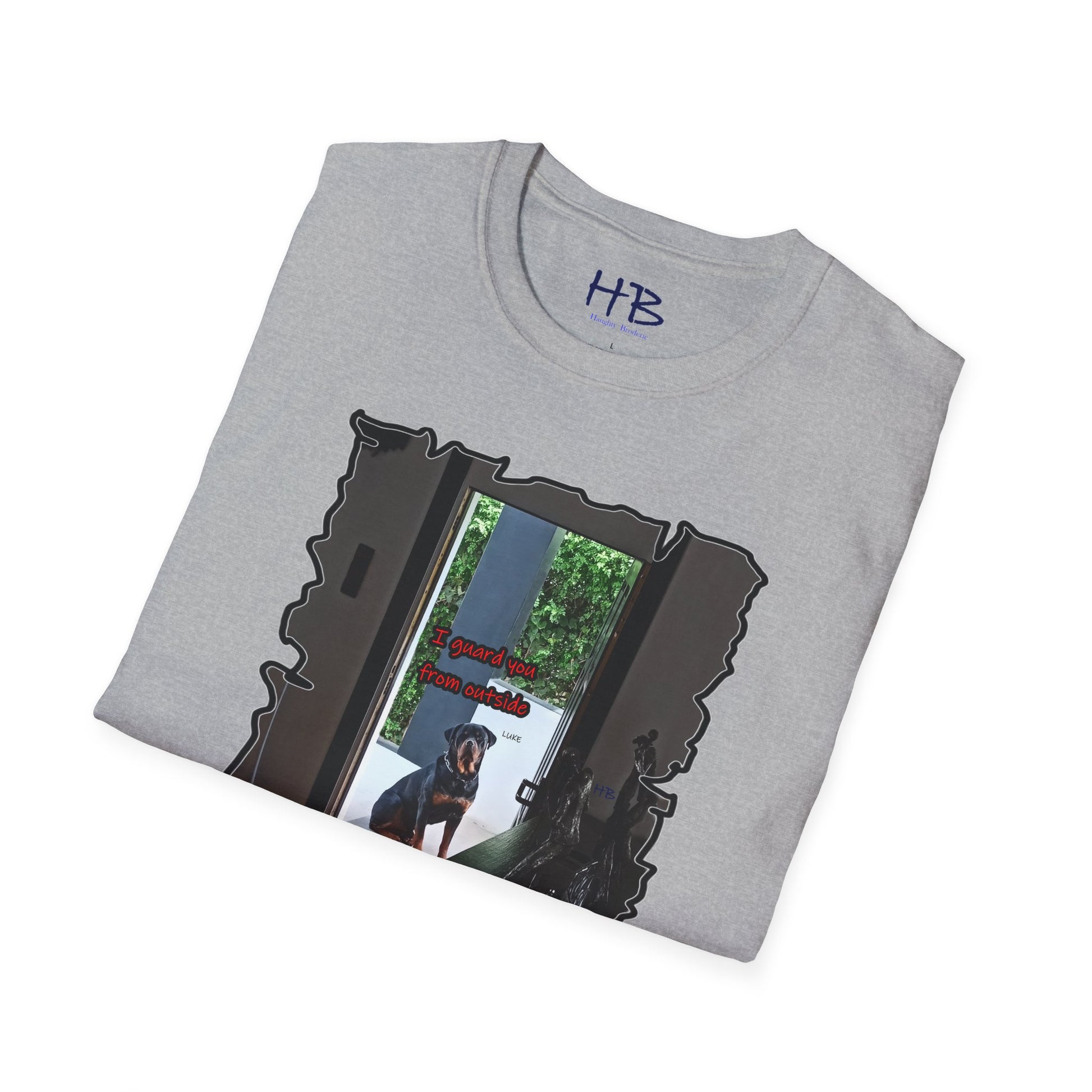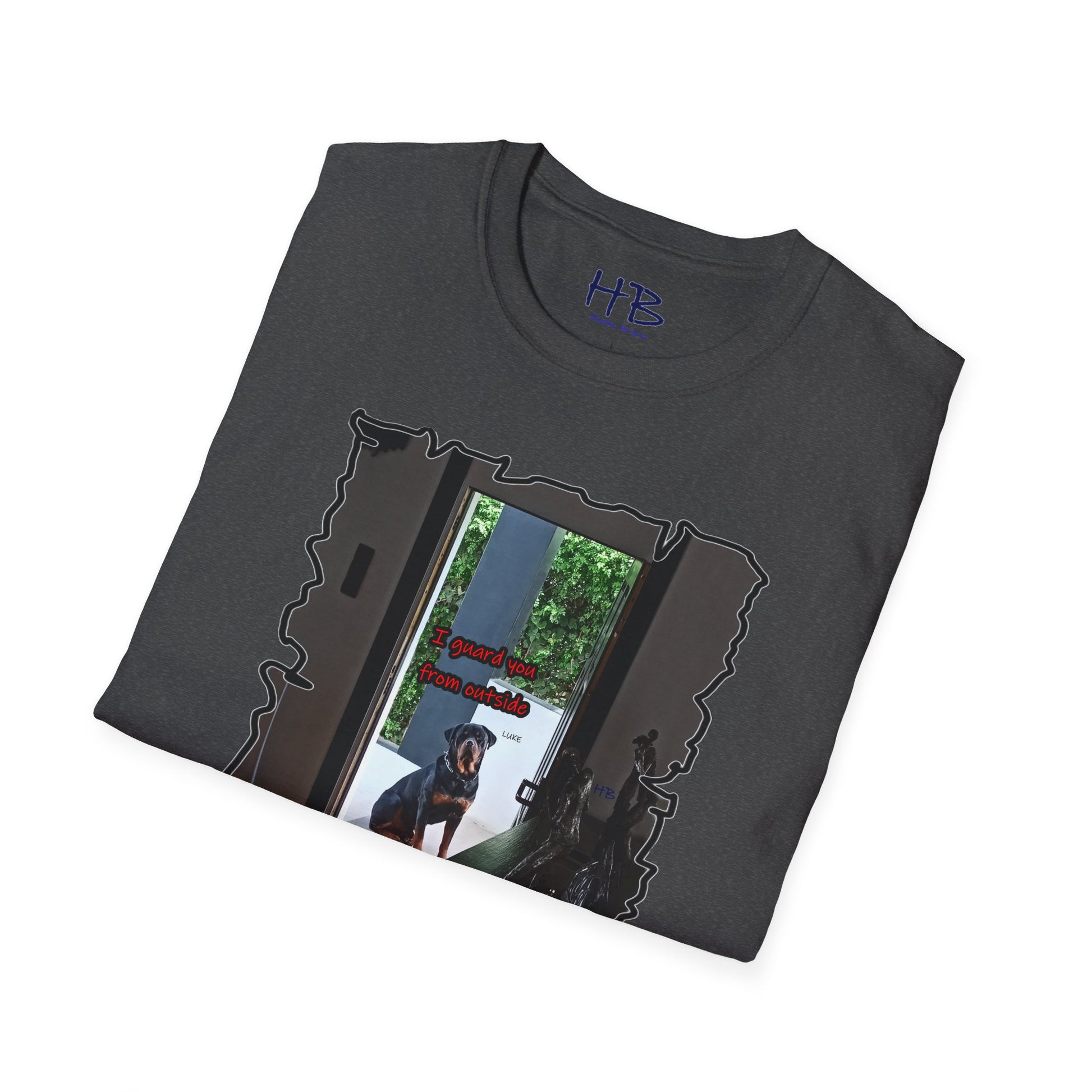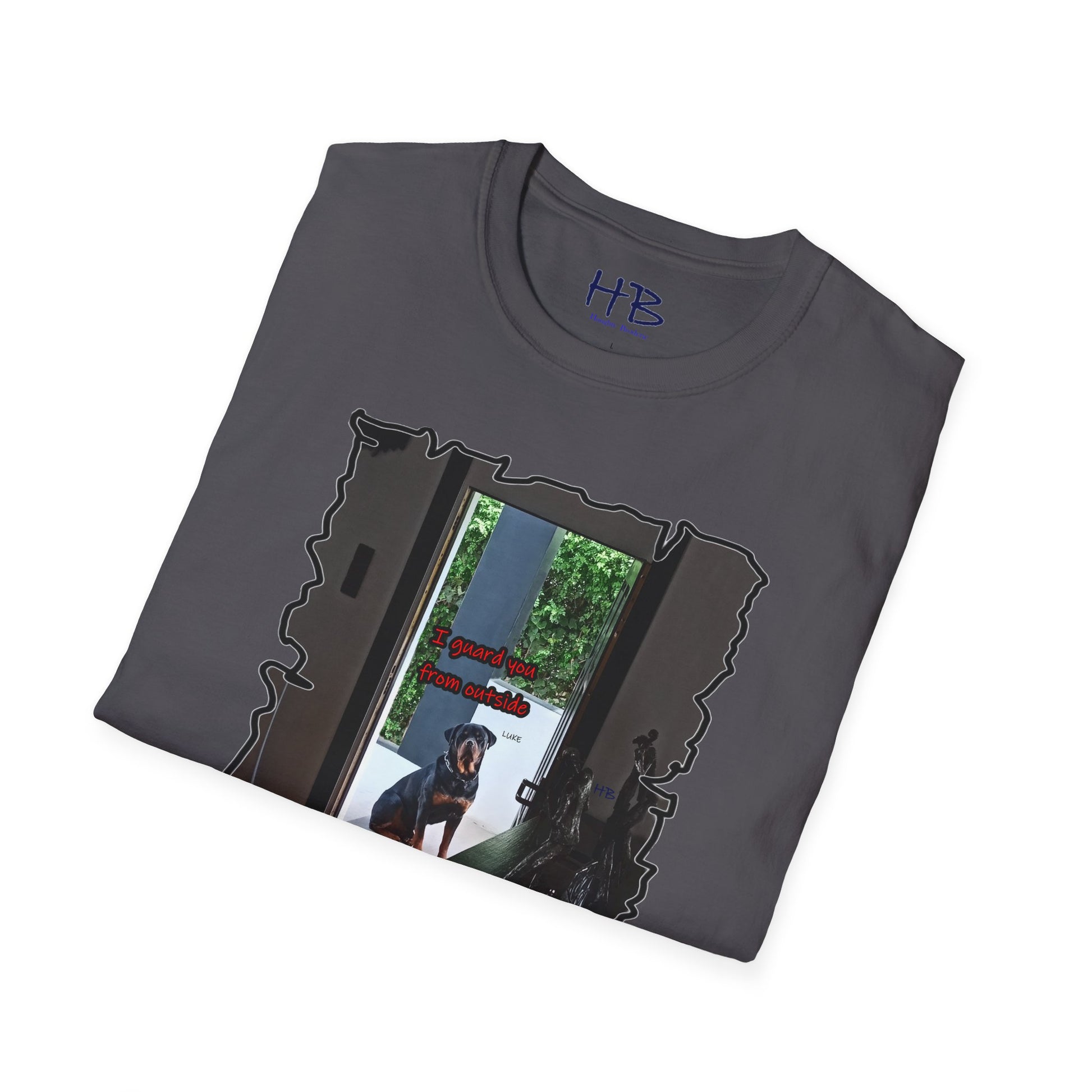 With meticulous craftsmanship and attention to detail, this tee shirt showcases a lifelike representation of Luke's regal appearance. His expressive gaze resonates with a sense of unwavering devotion and determination, embodying the essence of a true guardian. The accompanying text boldly states, "I guard you from outside," serving as a powerful testament to the protective instincts and love of a loyal dog.