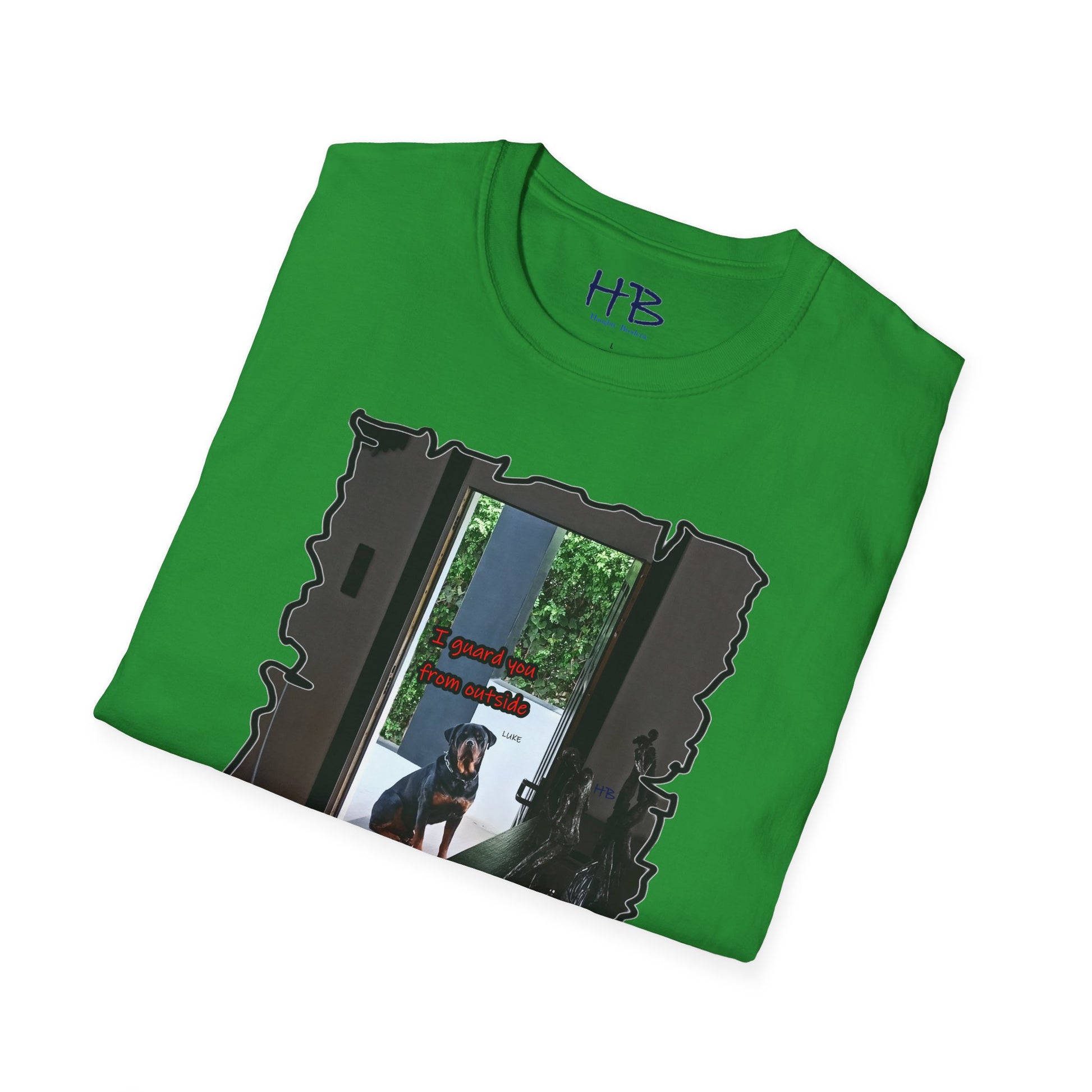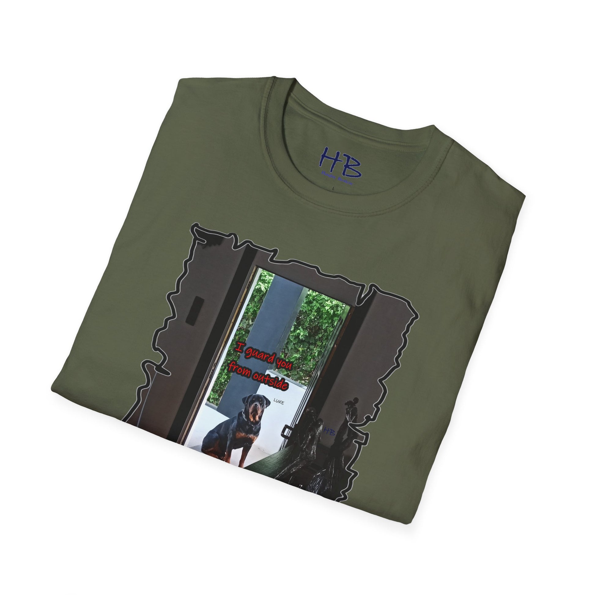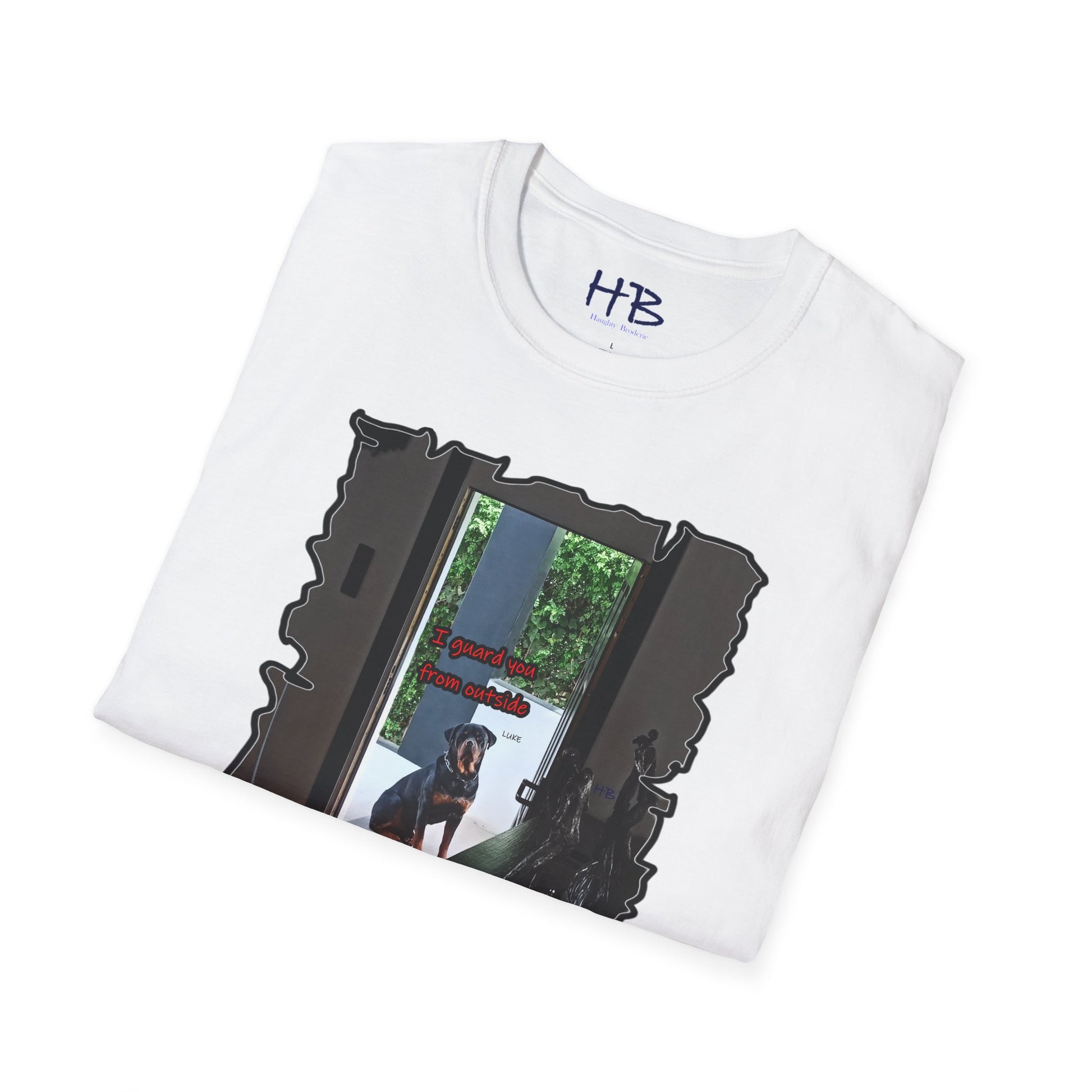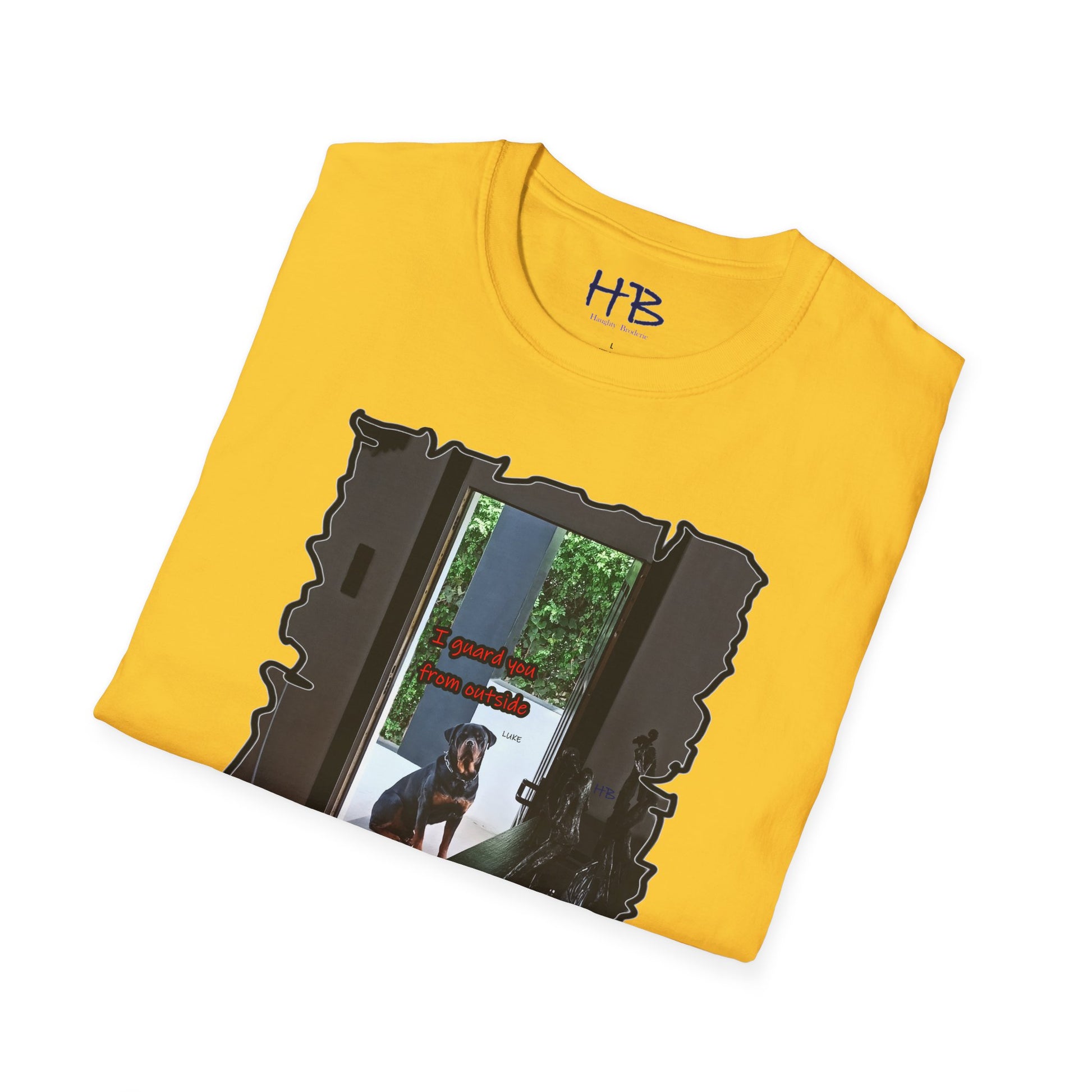 With meticulous craftsmanship and attention to detail, this tee shirt showcases a lifelike representation of Luke's regal appearance. His expressive gaze resonates with a sense of unwavering devotion and determination, embodying the essence of a true guardian. The accompanying text boldly states, "I guard you from outside," serving as a powerful testament to the protective instincts and love of a loyal dog.