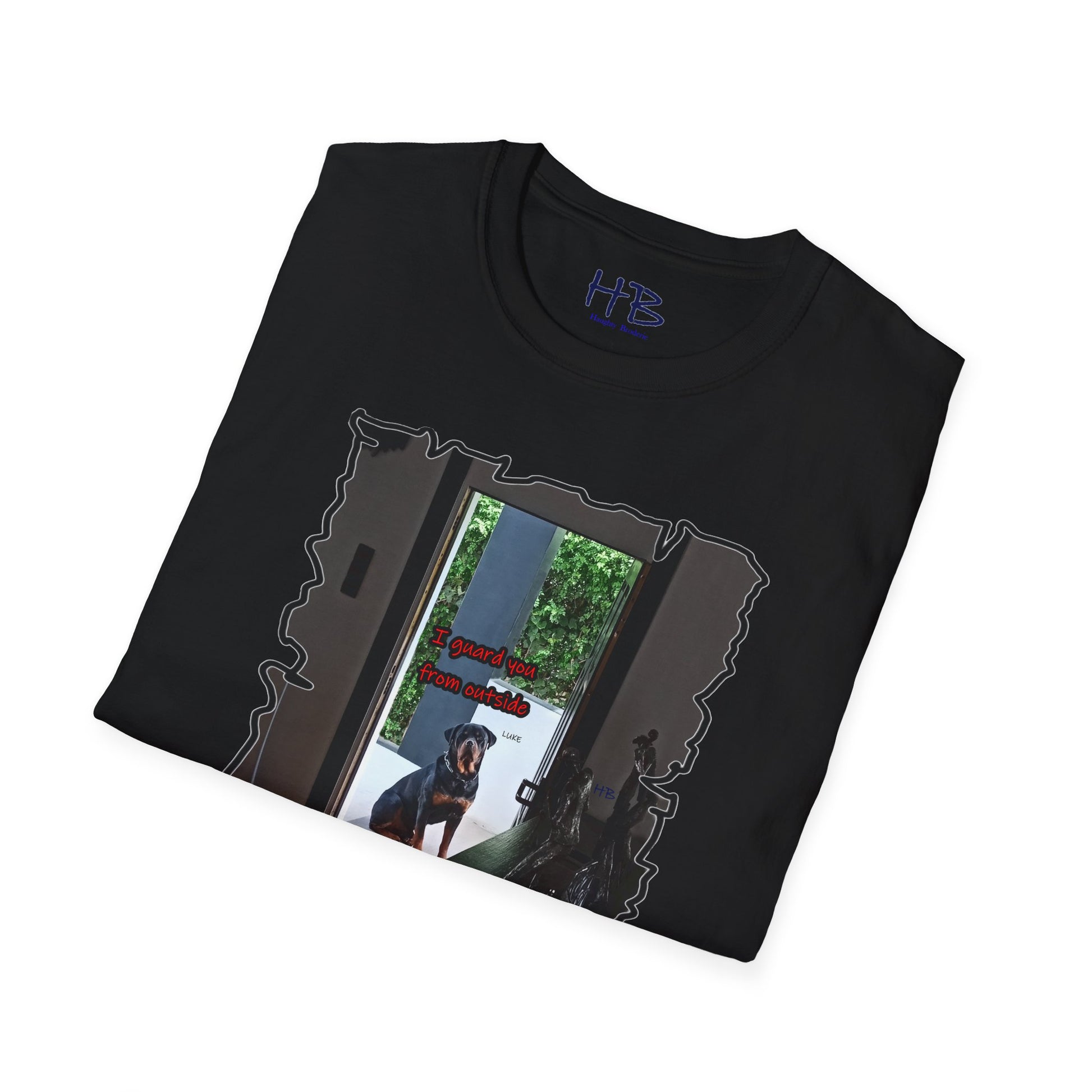 Introducing our remarkable apparel featuring an exquisite image of Luke, the magnificent Rothweiler, showcasing his undeniable loyalty and protective nature. This exclusive tee shirt embodies the essence of a faithful companion, capturing a heartfelt moment as Luke peeks through the house door, diligently safeguarding his owner from the outside.