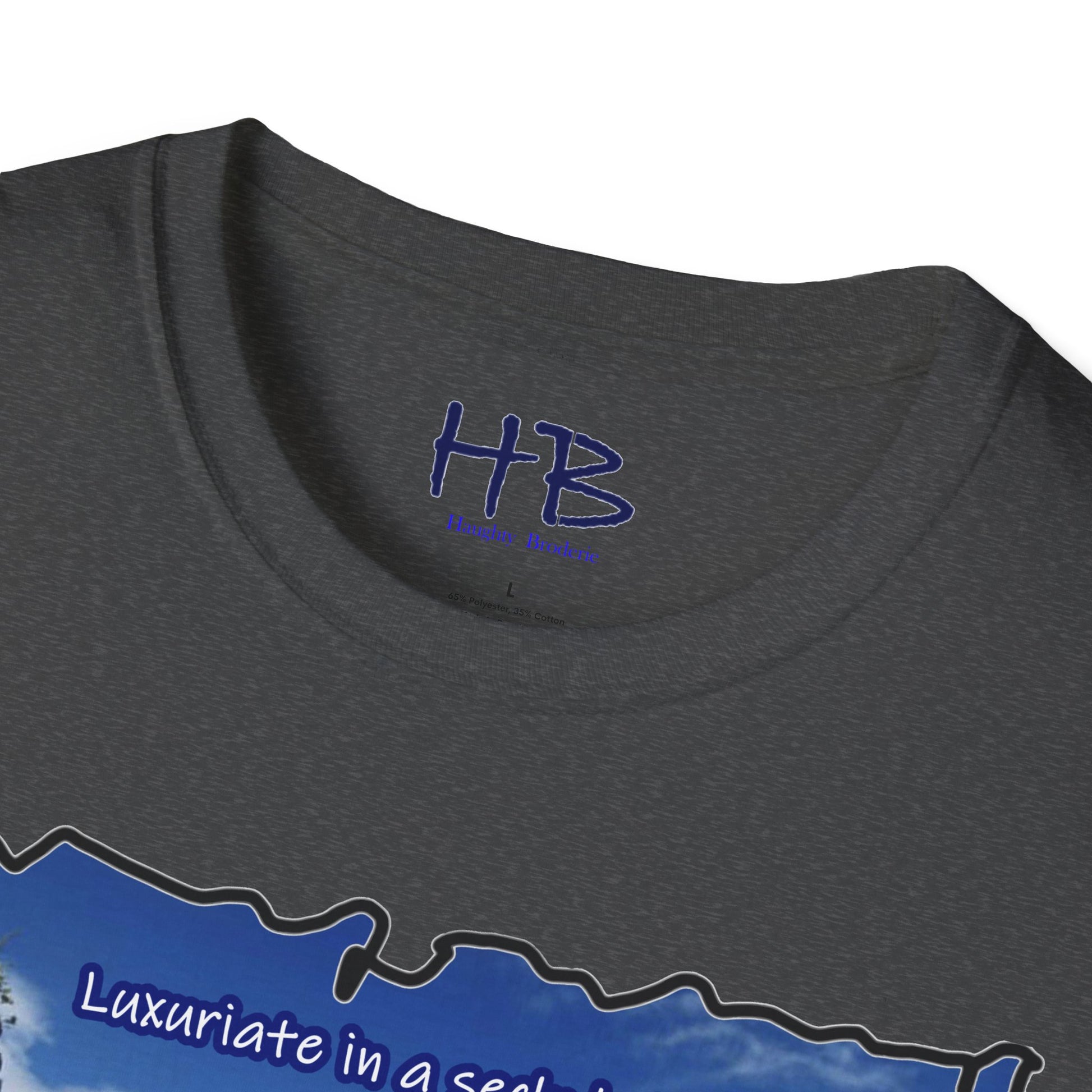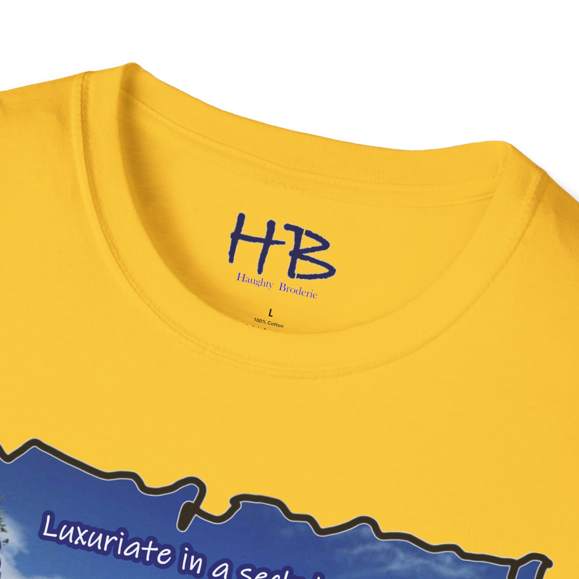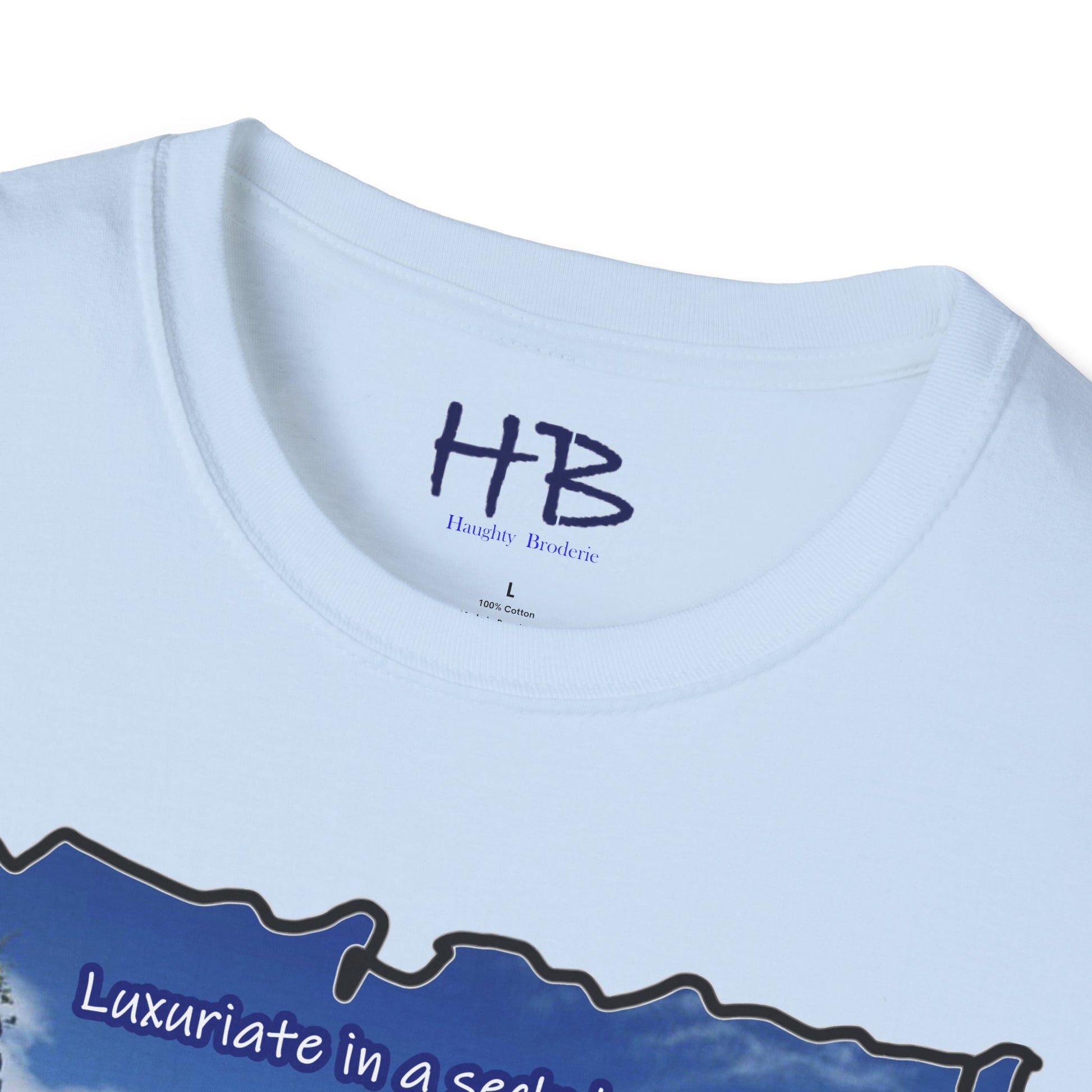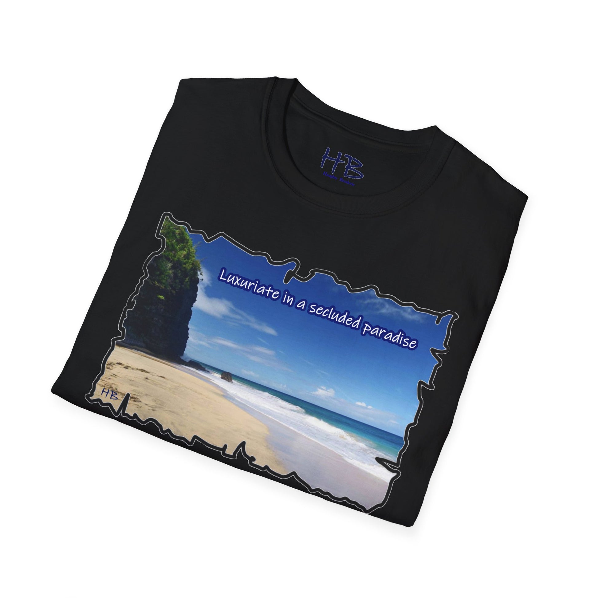 Embark on a visual journey as you gaze upon the image that graces this T-shirt. The azure waters of the Caribbean, so clear you can almost feel the gentle caress of the waves, captivate the eye. The white sand, like powdered sugar, stretches along the coast, inviting you to step into a realm of pure bliss. The image, paired with the evocative text, "Luxuriate in a secluded paradise," becomes a portal to an oasis of tranquility and leisure.