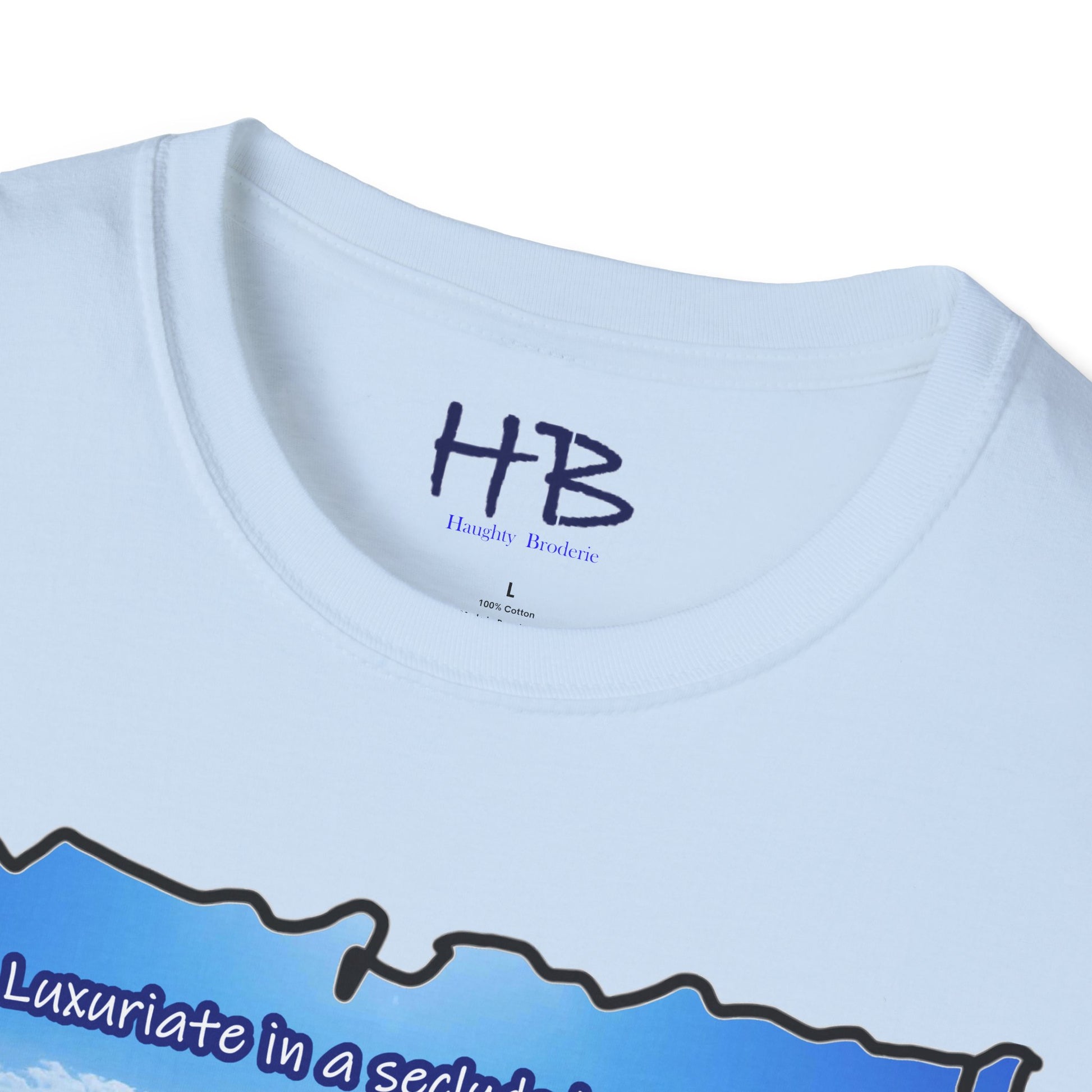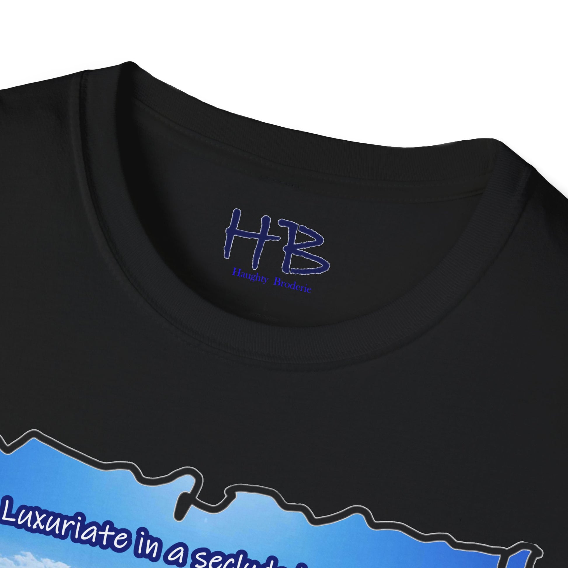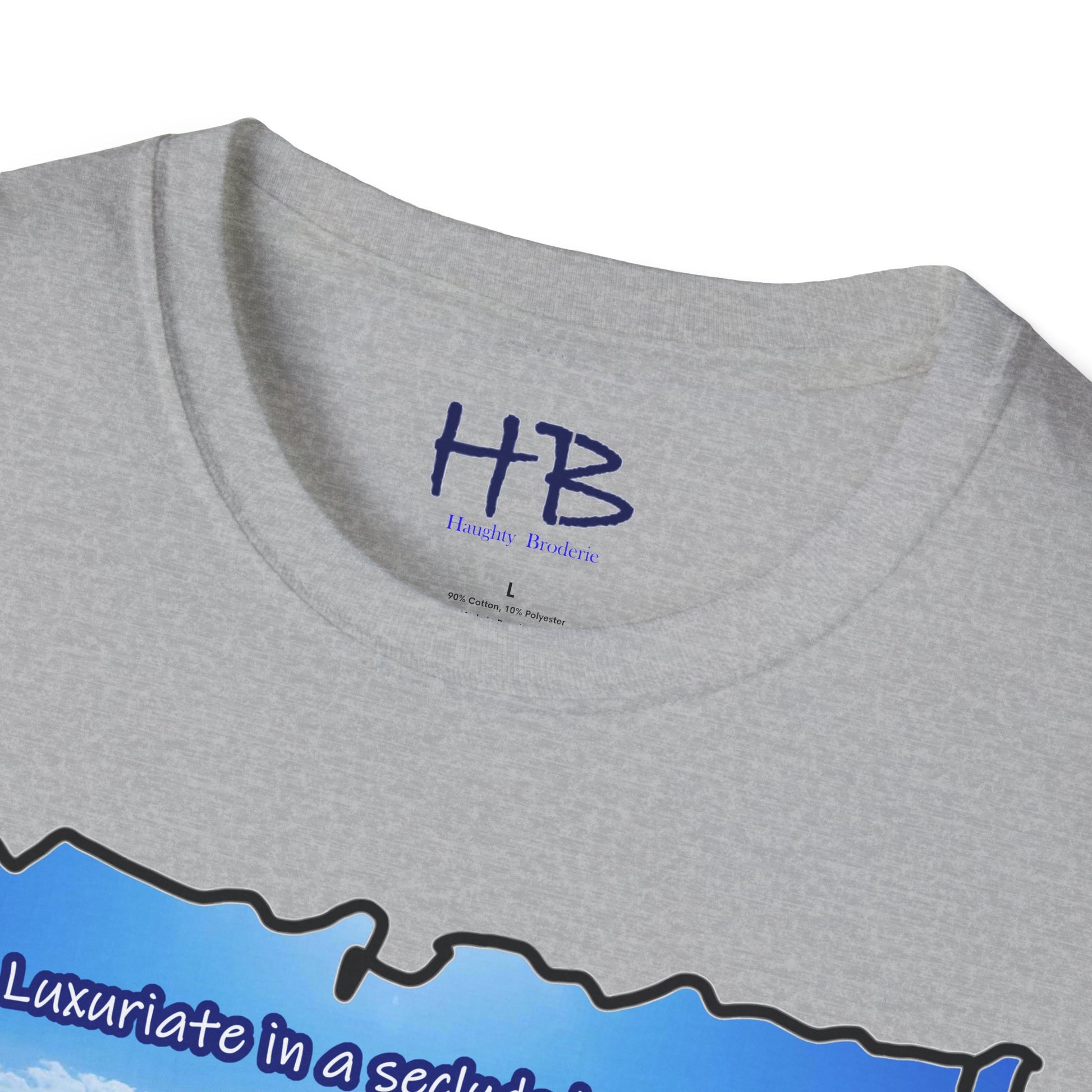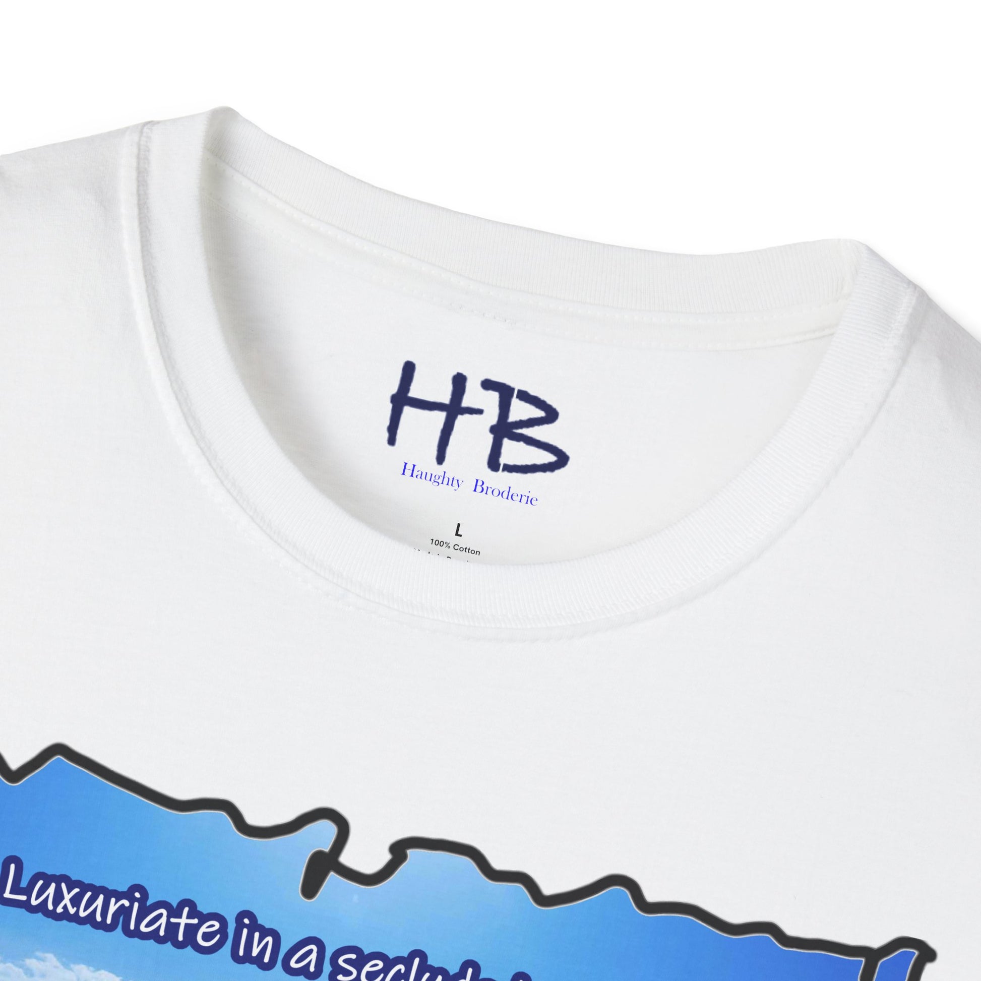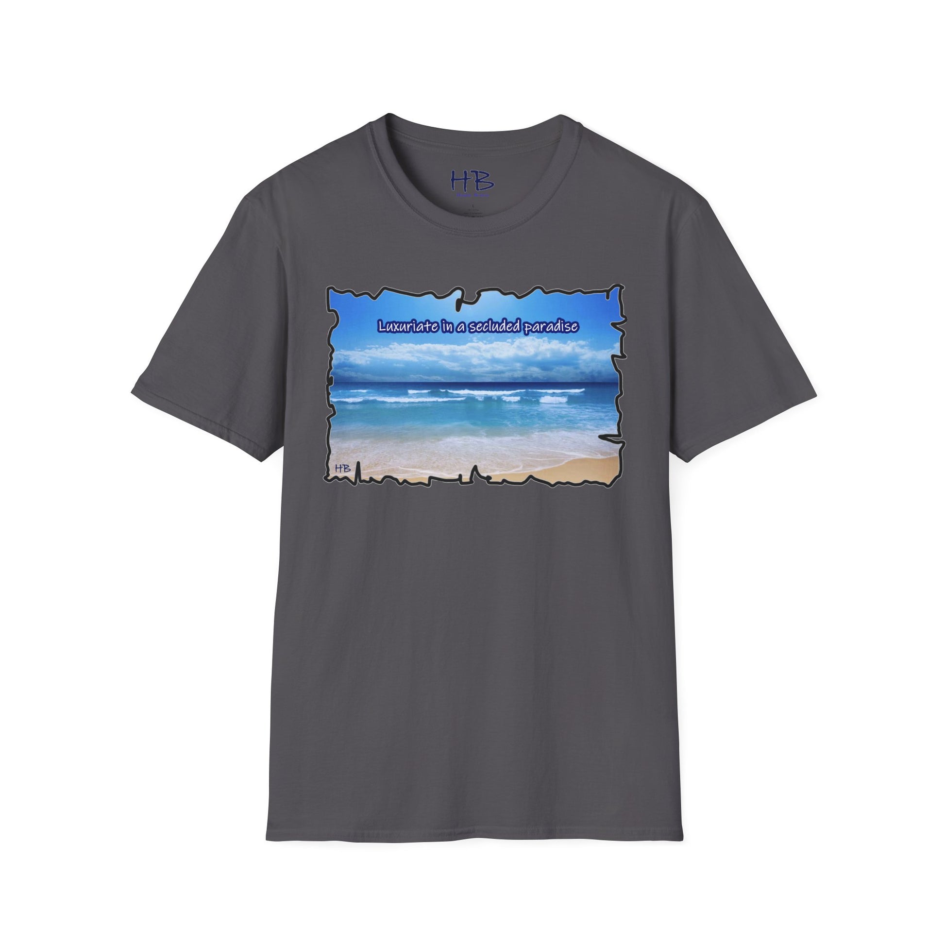 Wearing this tee is an affirmation of your appreciation for the finer things in life — a declaration that you understand the importance of moments of solitude and relaxation. The text, "Luxuriate in a secluded paradise," serves as a gentle reminder to prioritize self-care and bask in the luxury of tranquility, even in the midst of a bustling world.