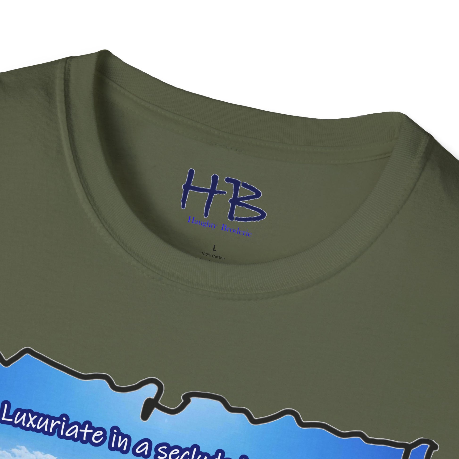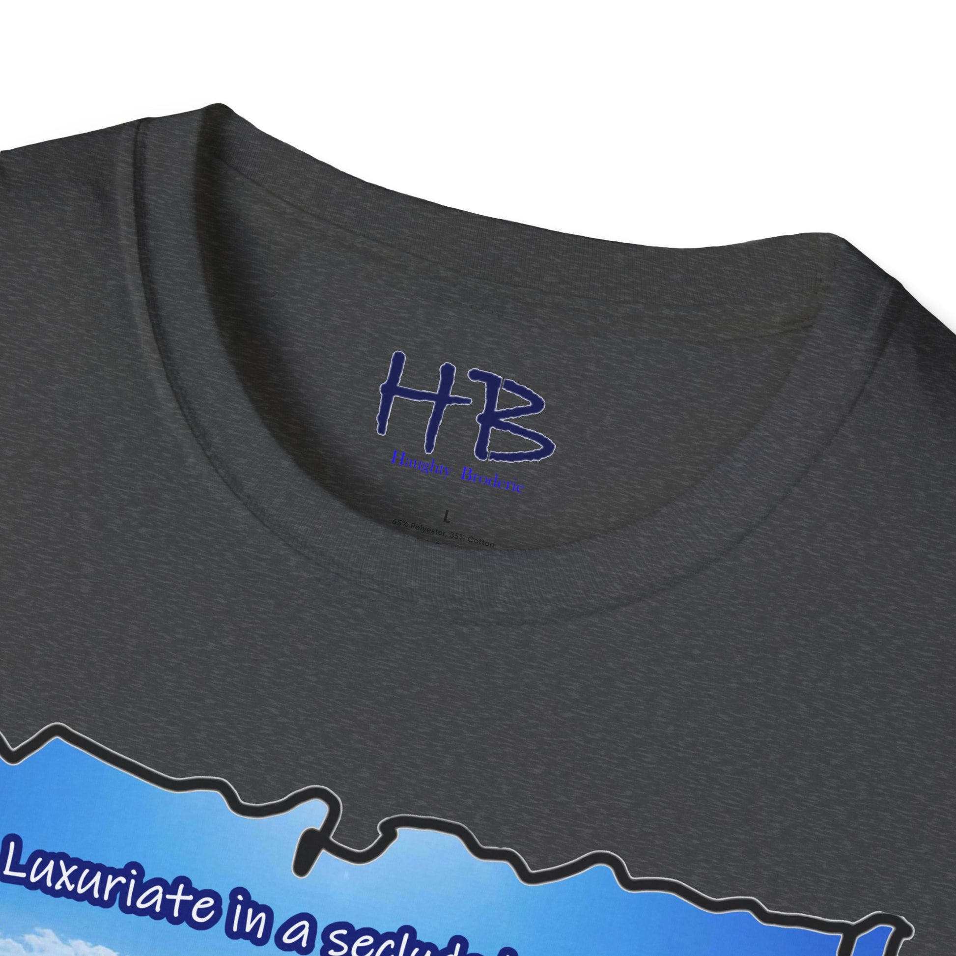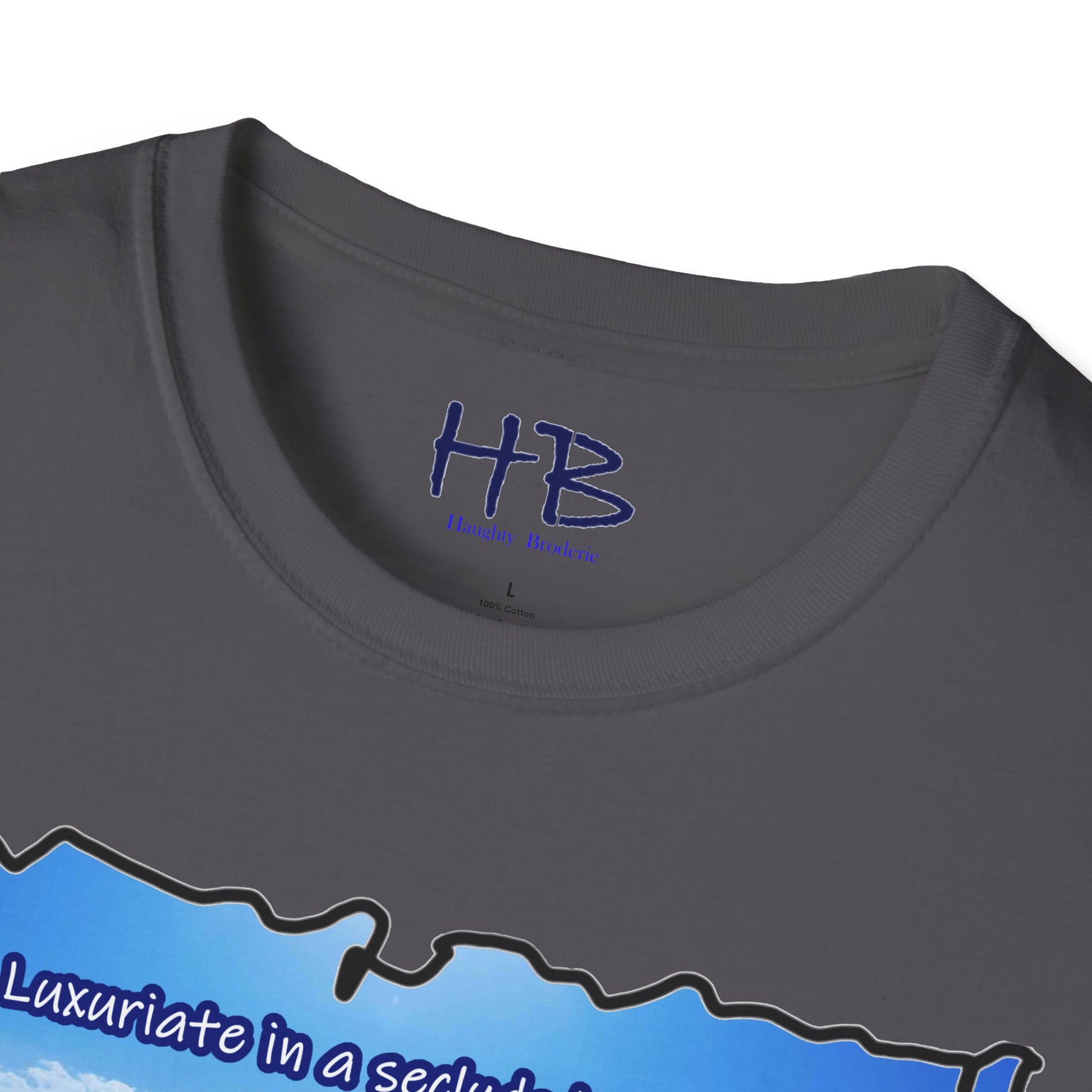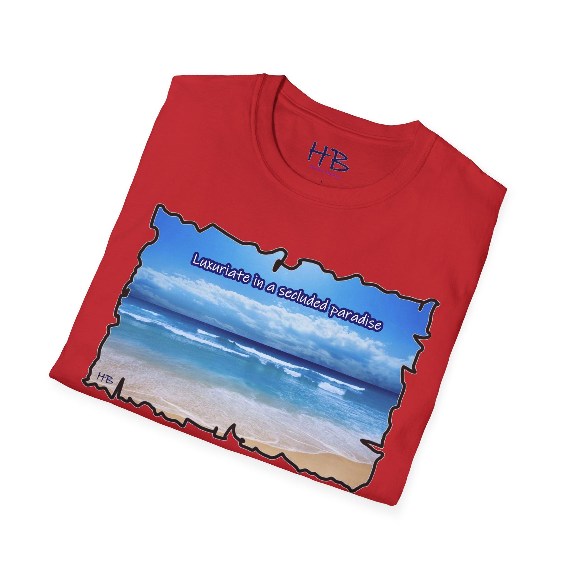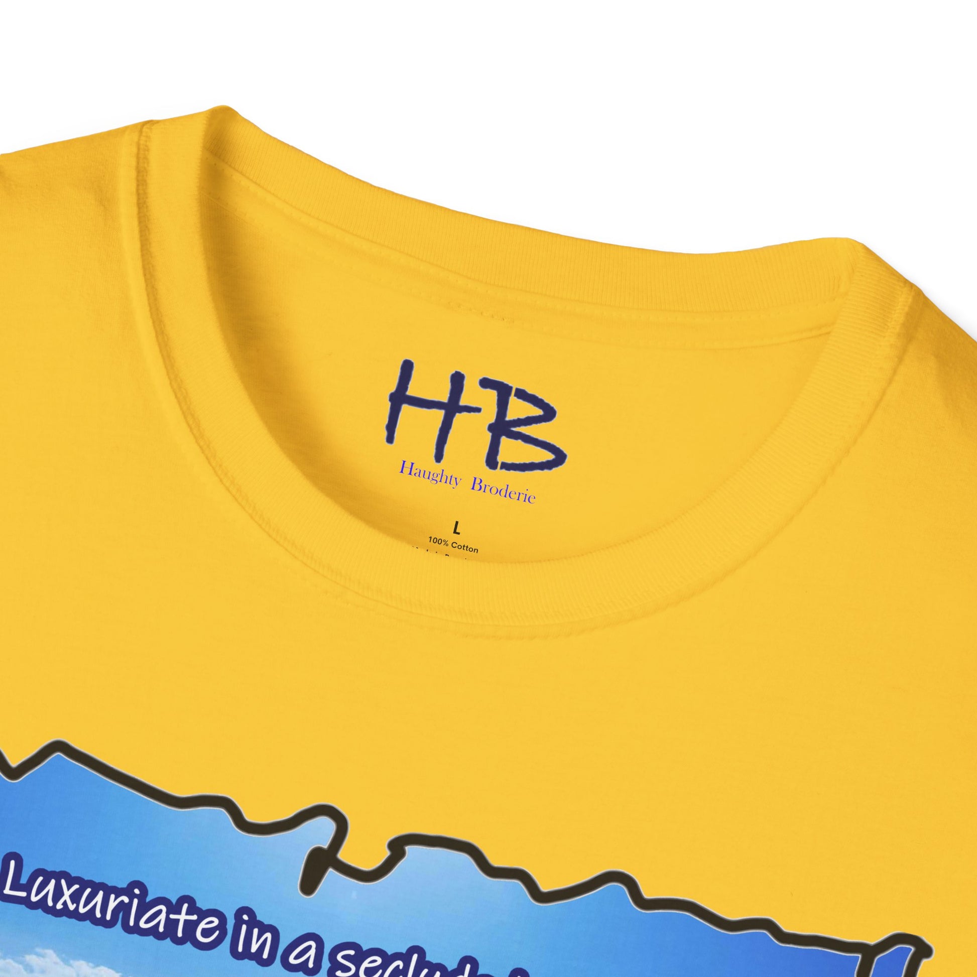 Wearing this tee is an affirmation of your appreciation for the finer things in life — a declaration that you understand the importance of moments of solitude and relaxation. The text, "Luxuriate in a secluded paradise," serves as a gentle reminder to prioritize self-care and bask in the luxury of tranquility, even in the midst of a bustling world.