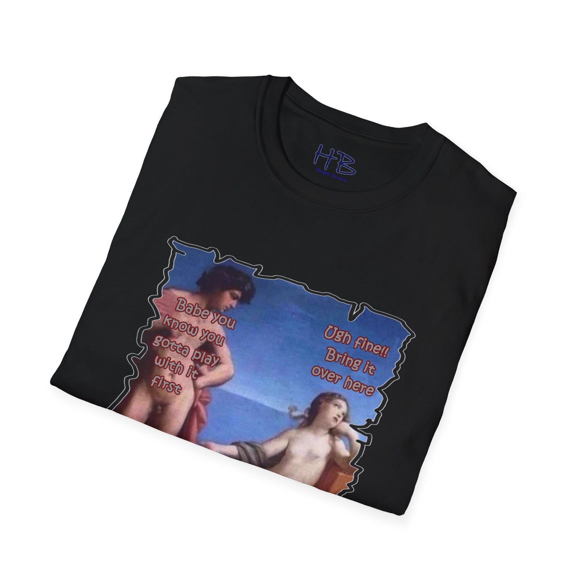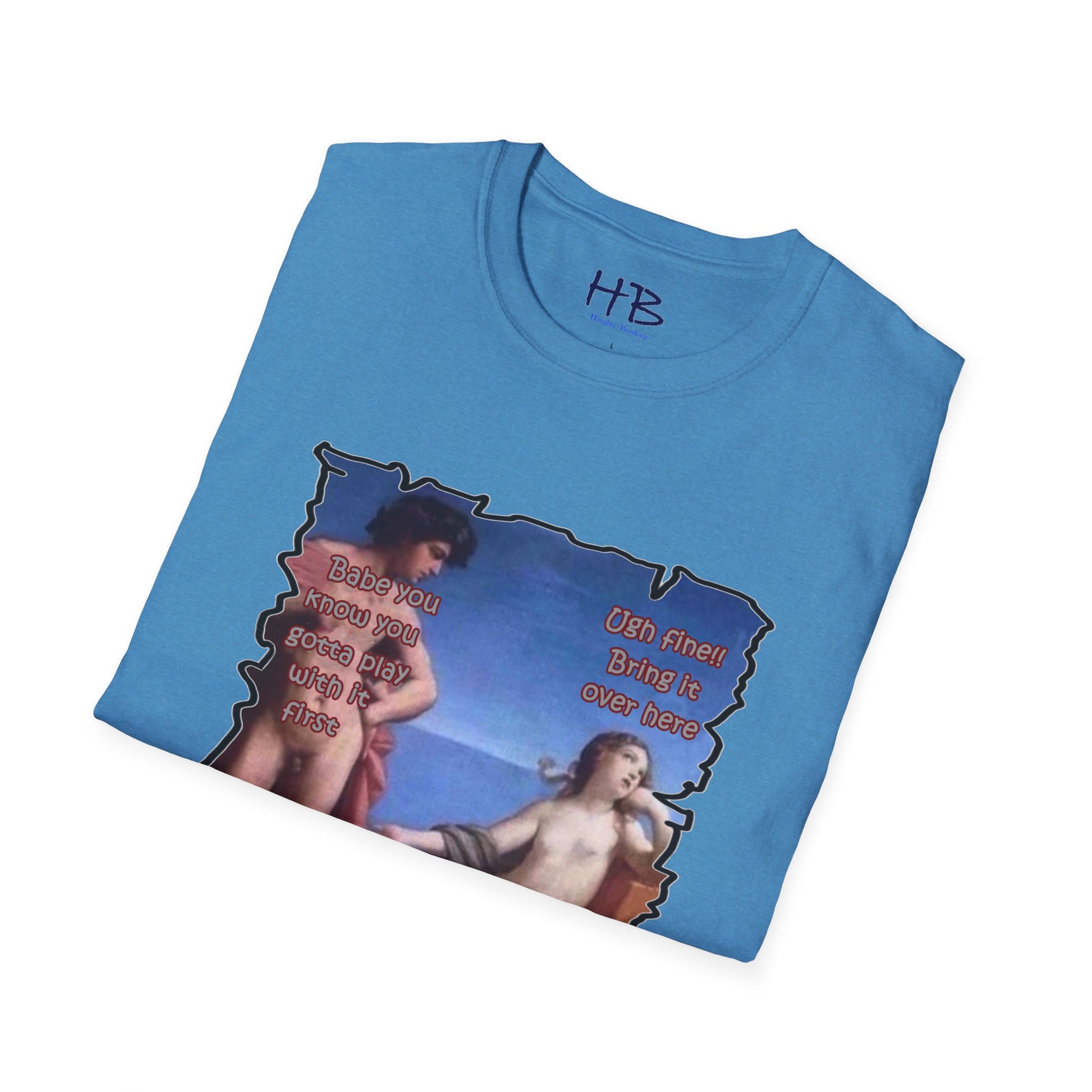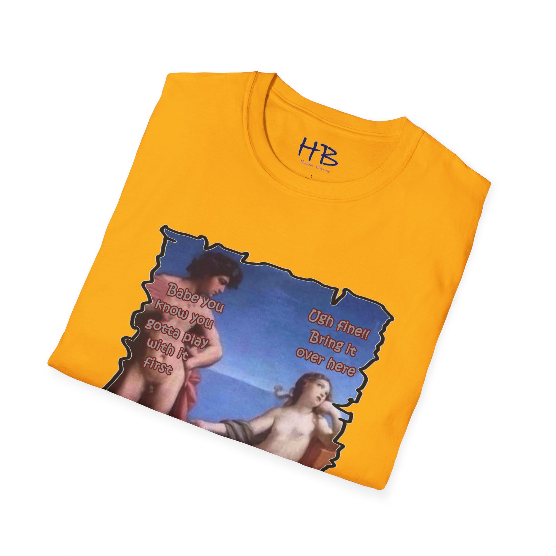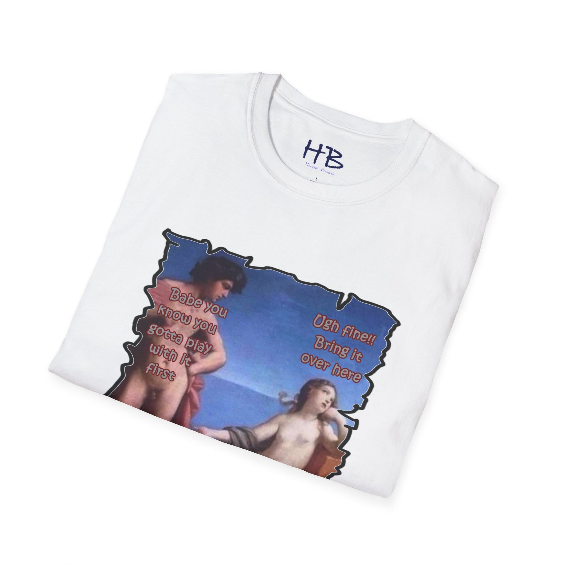 Why settle for ordinary when you can adorn yourself with a tee shirt that seamlessly blends art and humor? This extraordinary piece showcases a clever juxtaposition of a humorous text overlaying an iconic masterpiece from the distant past. It's an artistic fusion that transcends eras, making it a perfect choice for the discerning individual who appreciates wit and history.