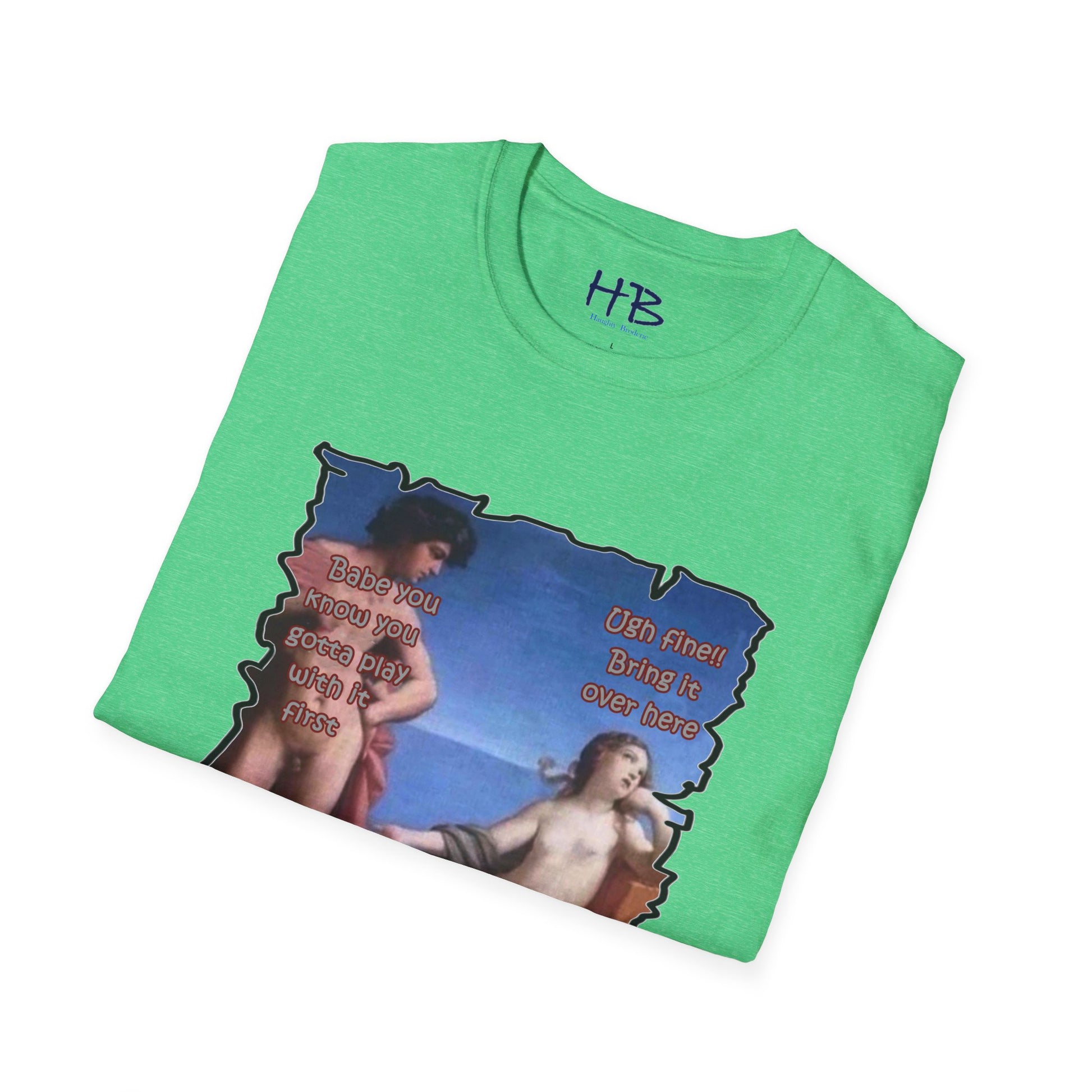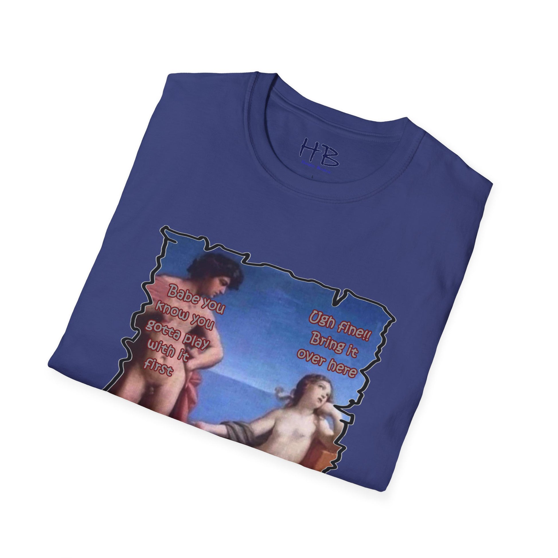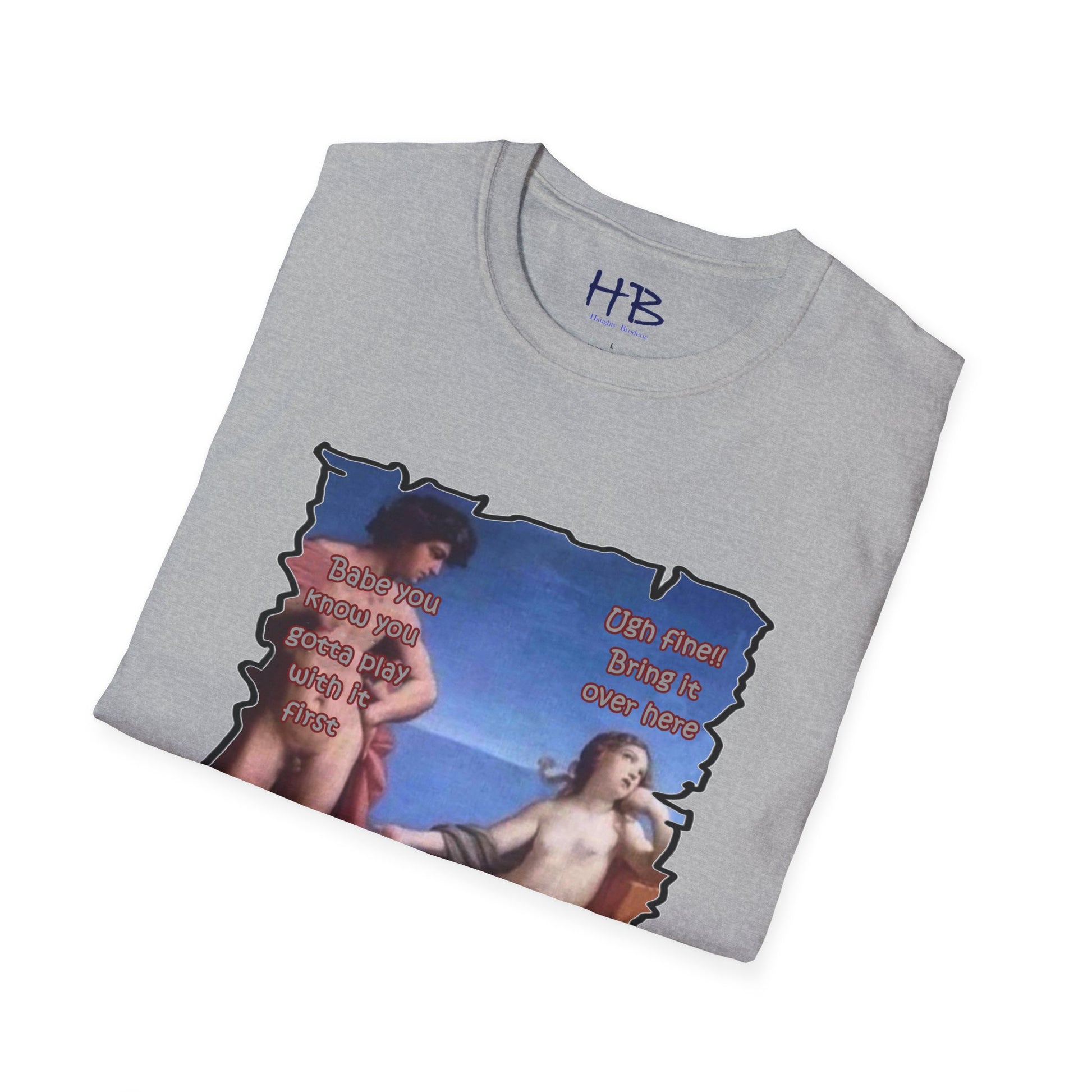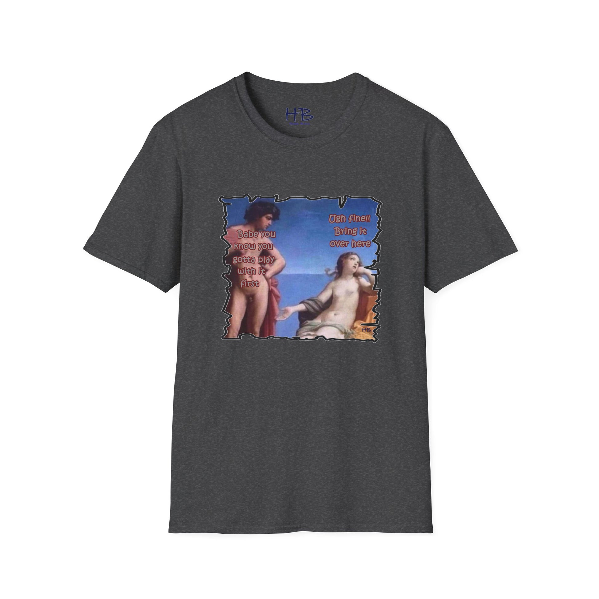 Why settle for ordinary when you can adorn yourself with a tee shirt that seamlessly blends art and humor? This extraordinary piece showcases a clever juxtaposition of a humorous text overlaying an iconic masterpiece from the distant past. It's an artistic fusion that transcends eras, making it a perfect choice for the discerning individual who appreciates wit and history.