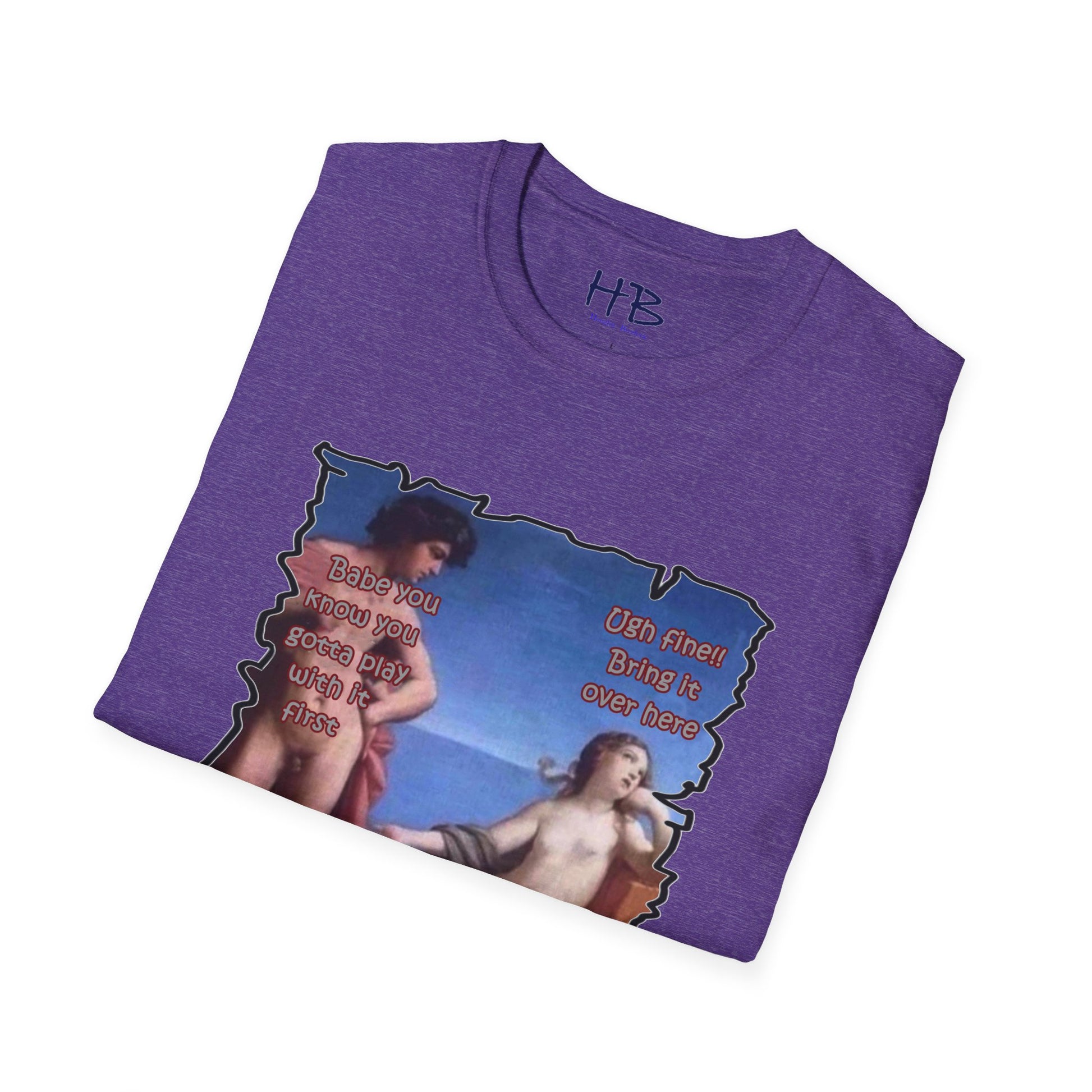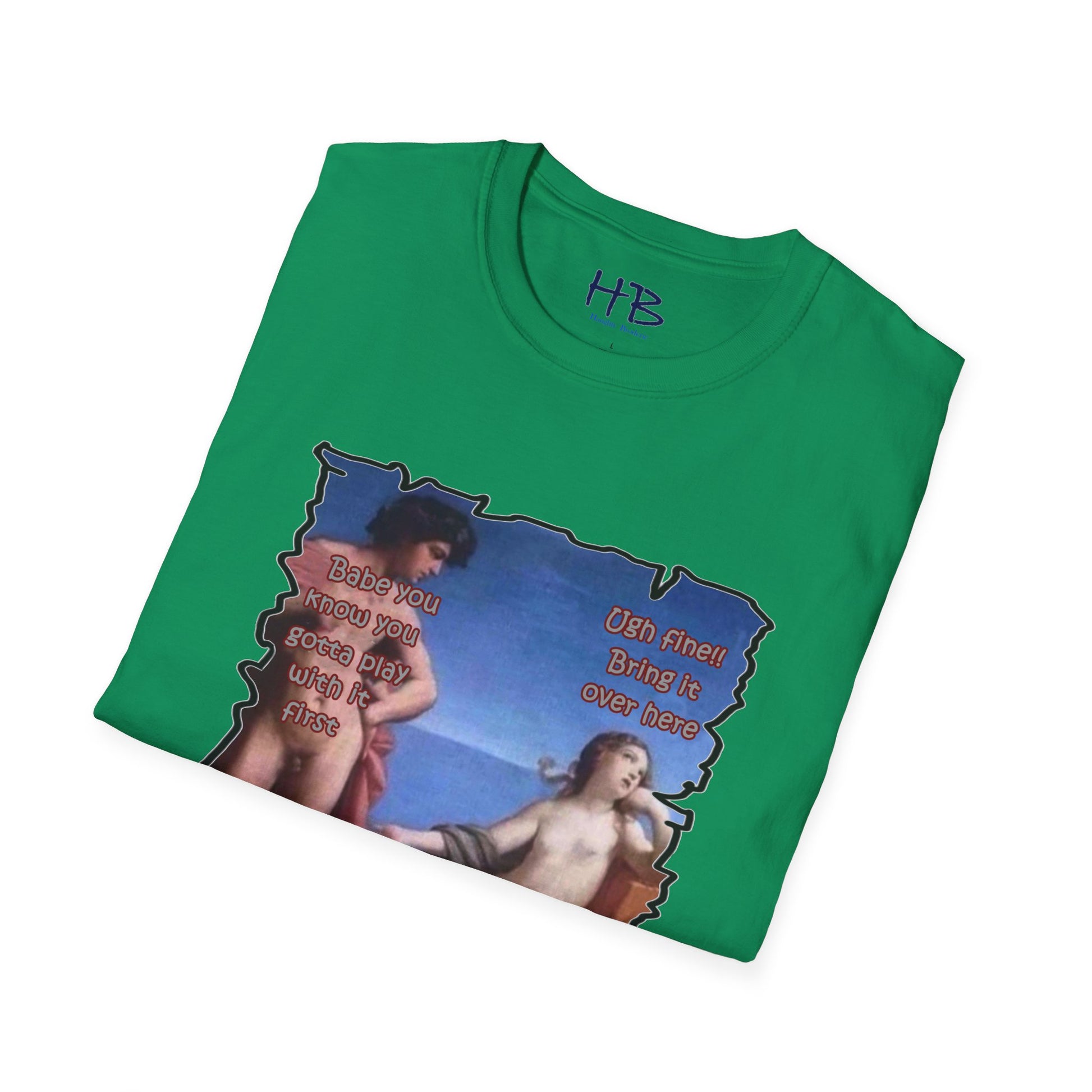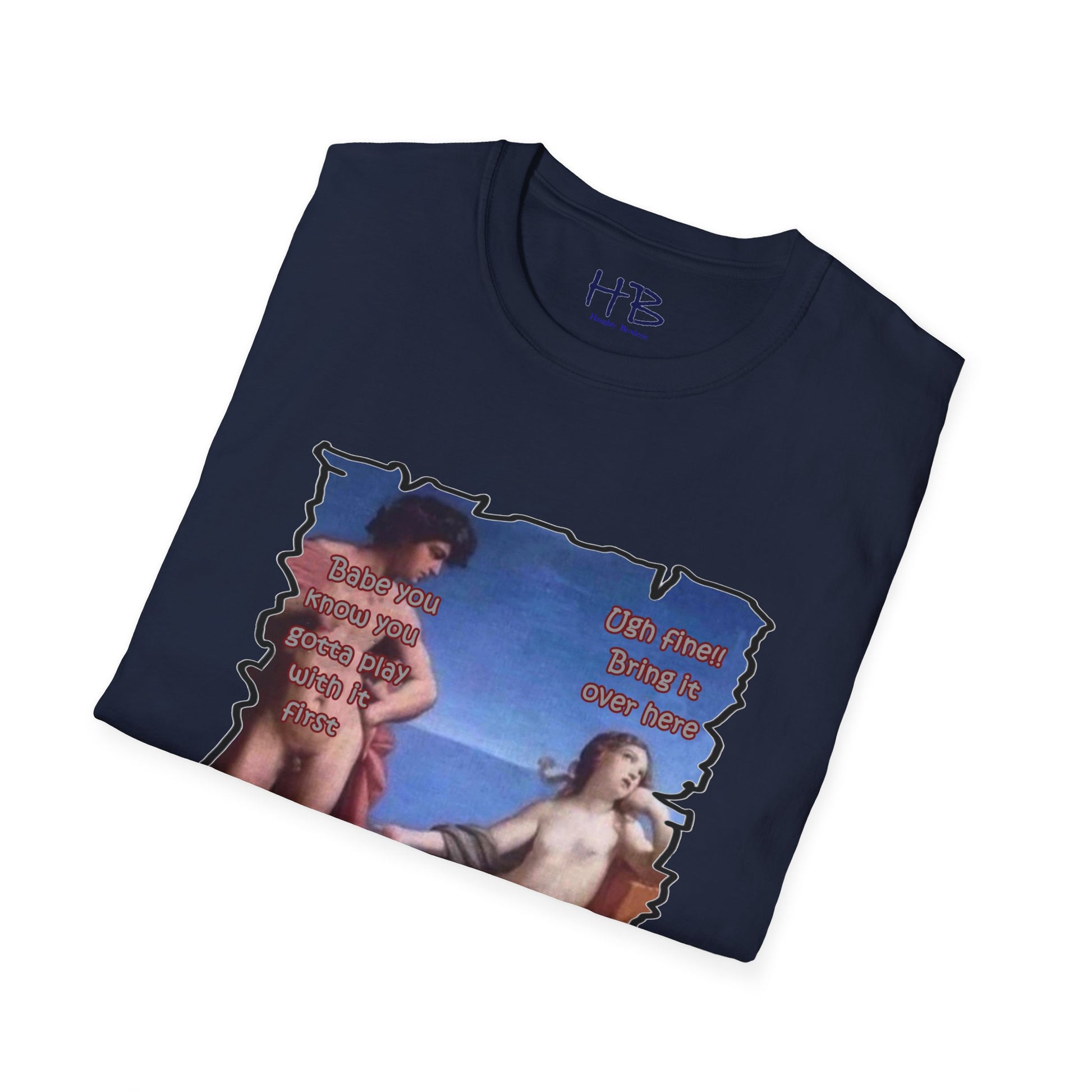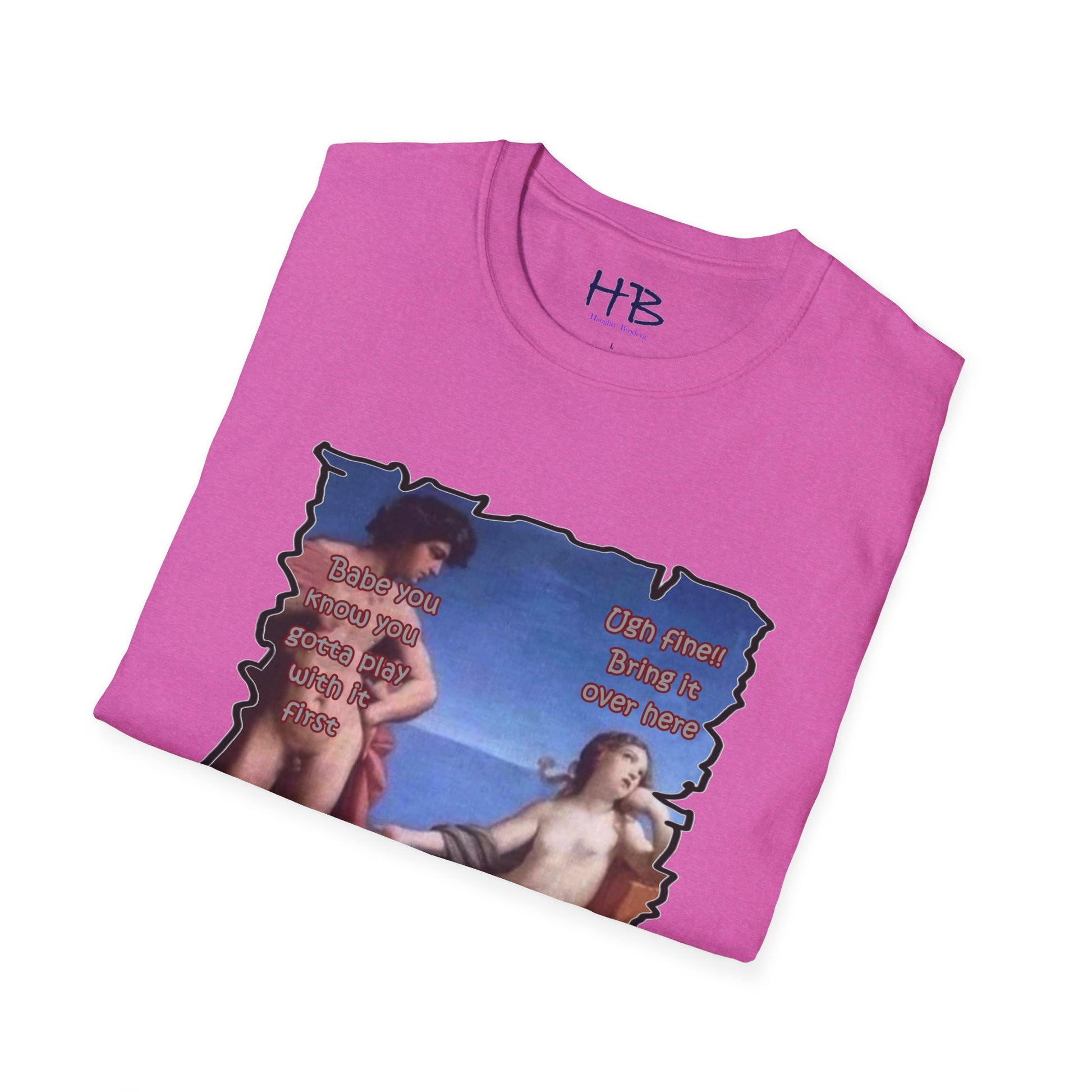 Why settle for ordinary when you can adorn yourself with a tee shirt that seamlessly blends art and humor? This extraordinary piece showcases a clever juxtaposition of a humorous text overlaying an iconic masterpiece from the distant past. It's an artistic fusion that transcends eras, making it a perfect choice for the discerning individual who appreciates wit and history.