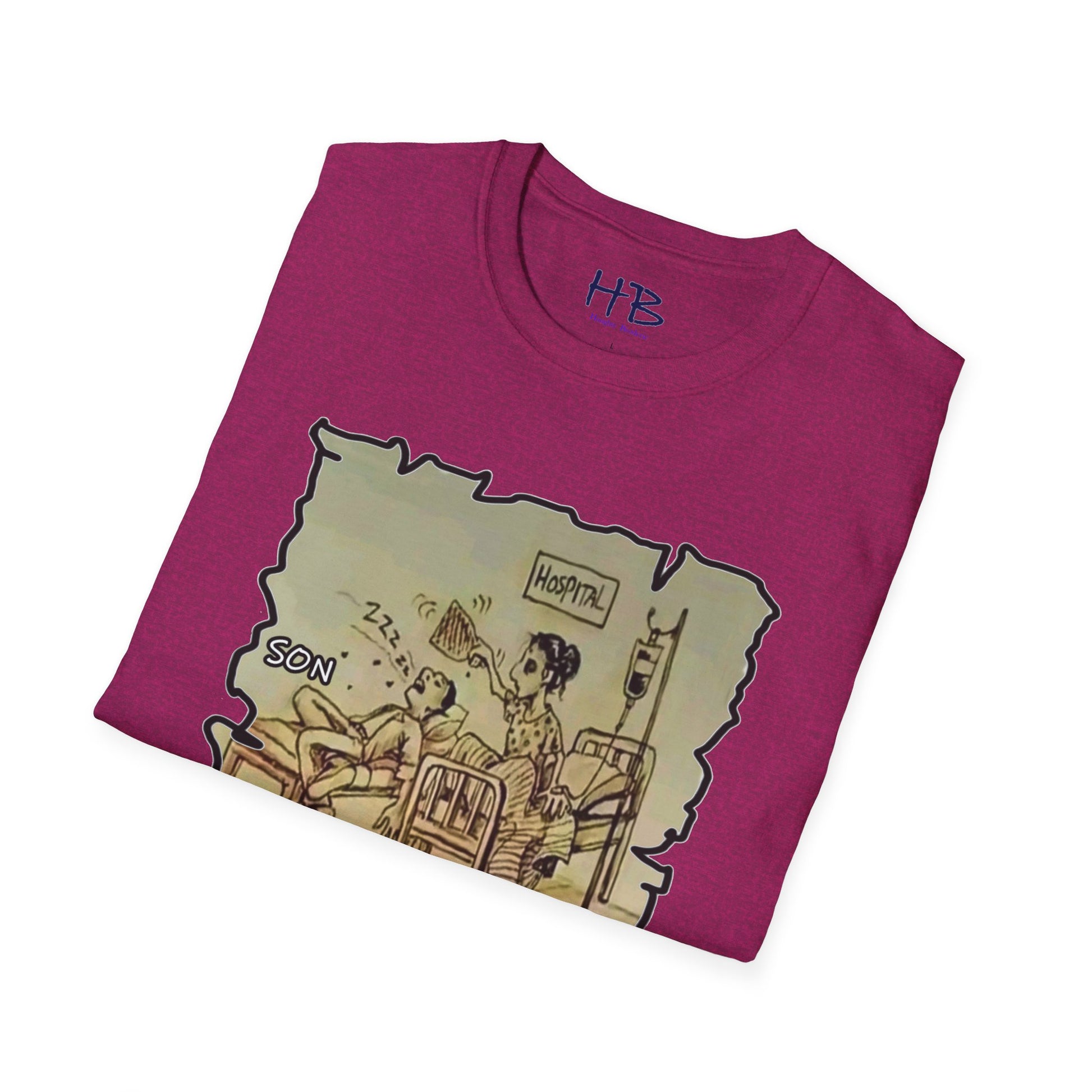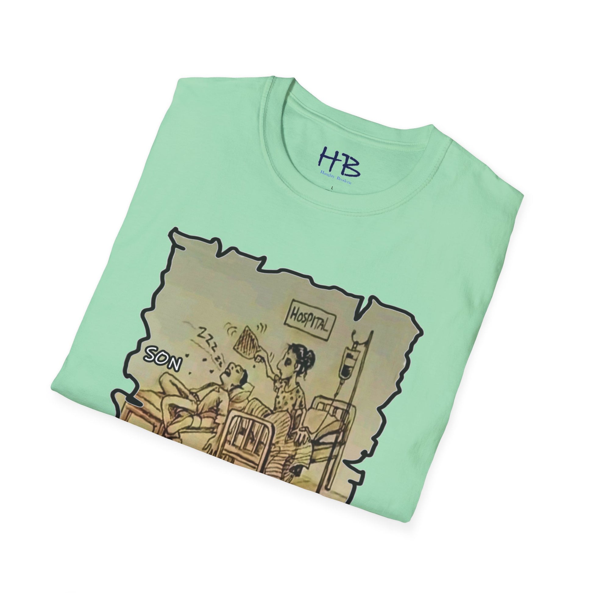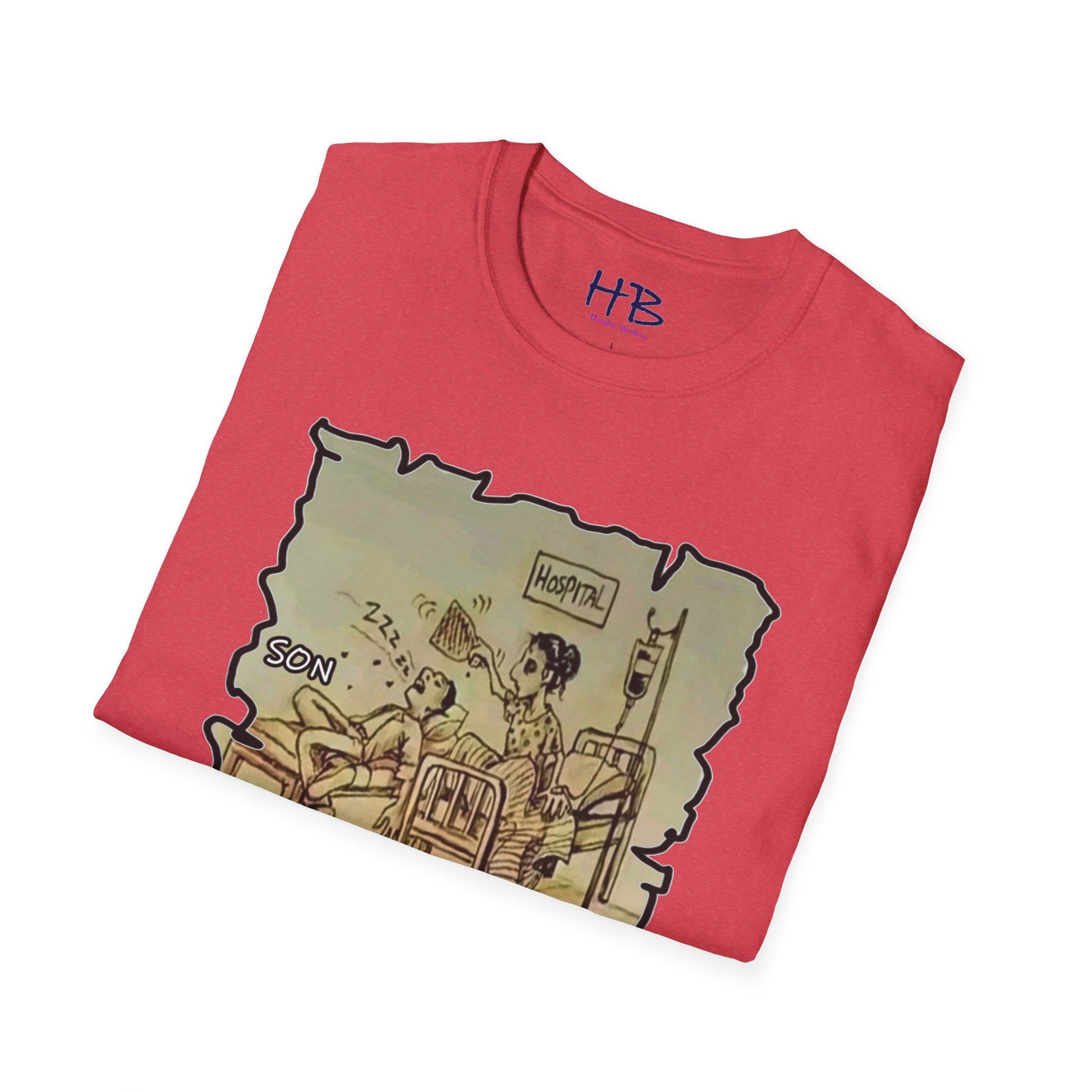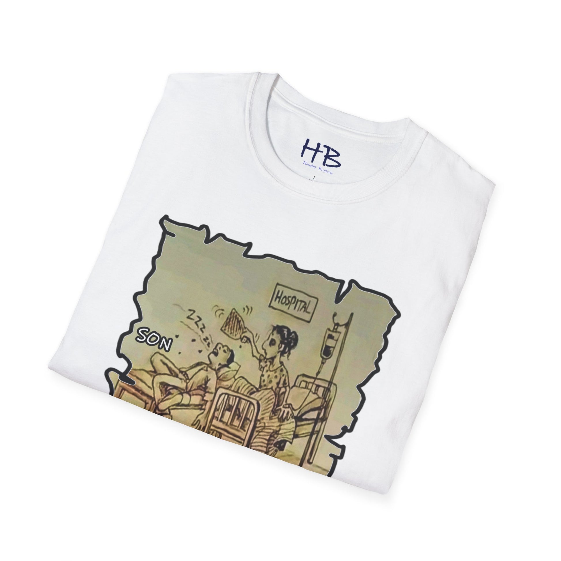 Embark on an emotional journey with our extraordinary t-shirt, where every thread tells a story of love, sacrifice, and the profound bond between a mother and her son. The captivating artwork unfolds in a hospital room, a sanctuary of emotions, where a mother battles illness in her hospital bed. Tubes weave a complex tapestry around her, a visual representation of her resilience. Despite her exhaustion, she gently fans herself, ensuring her son, who sleeps on a pull-up bed by her side, remains undisturbed.