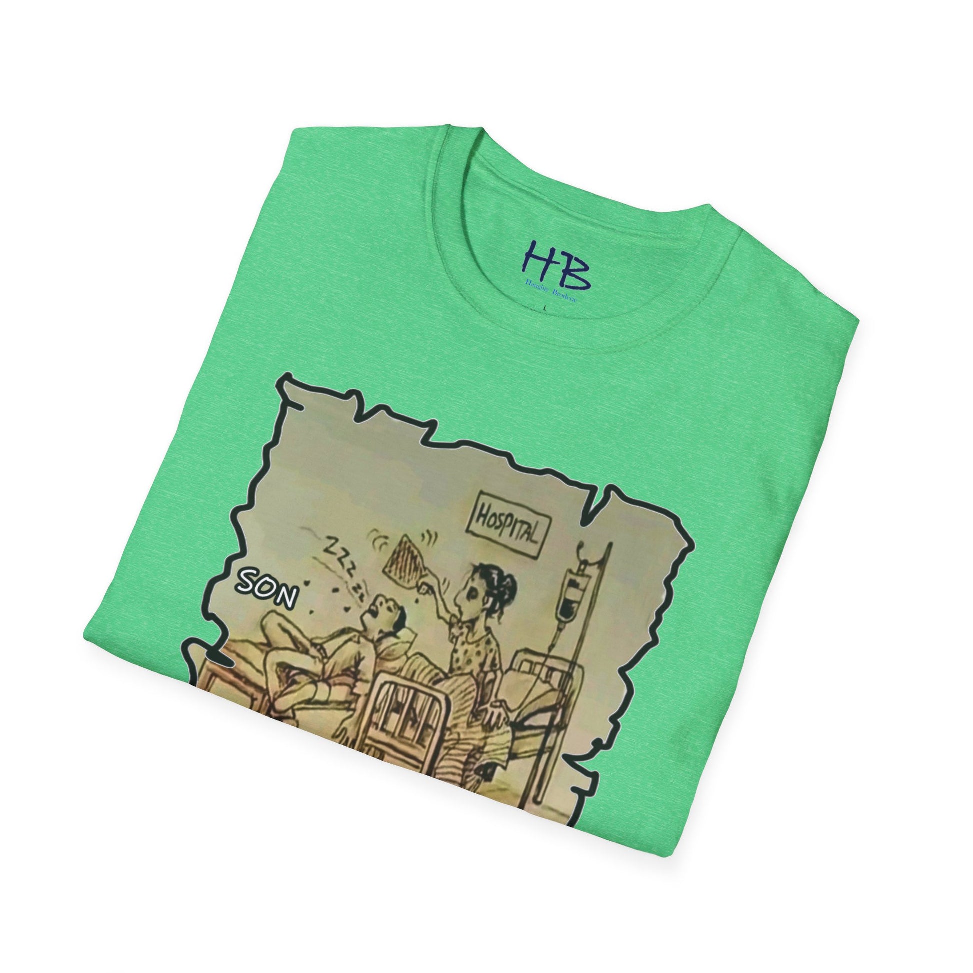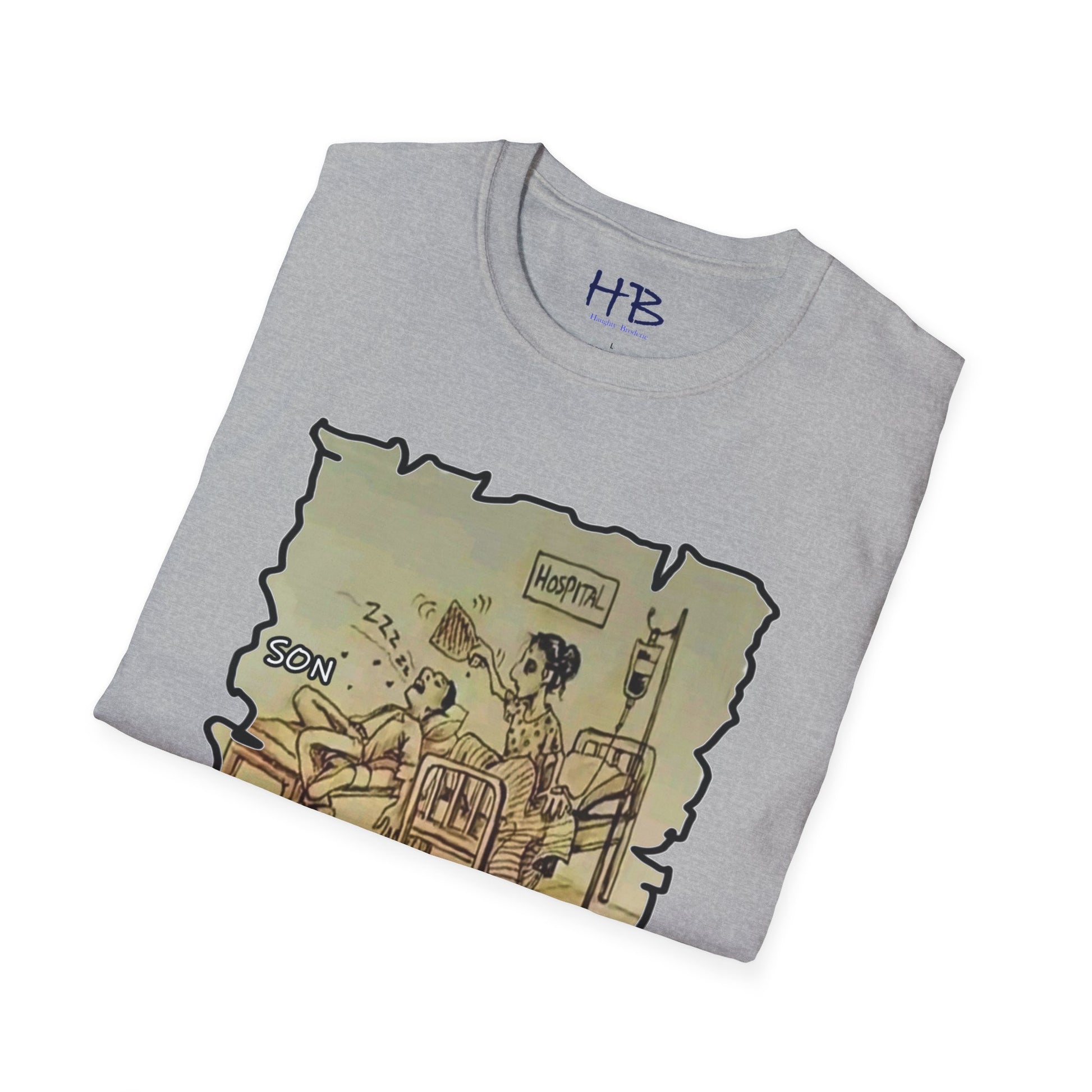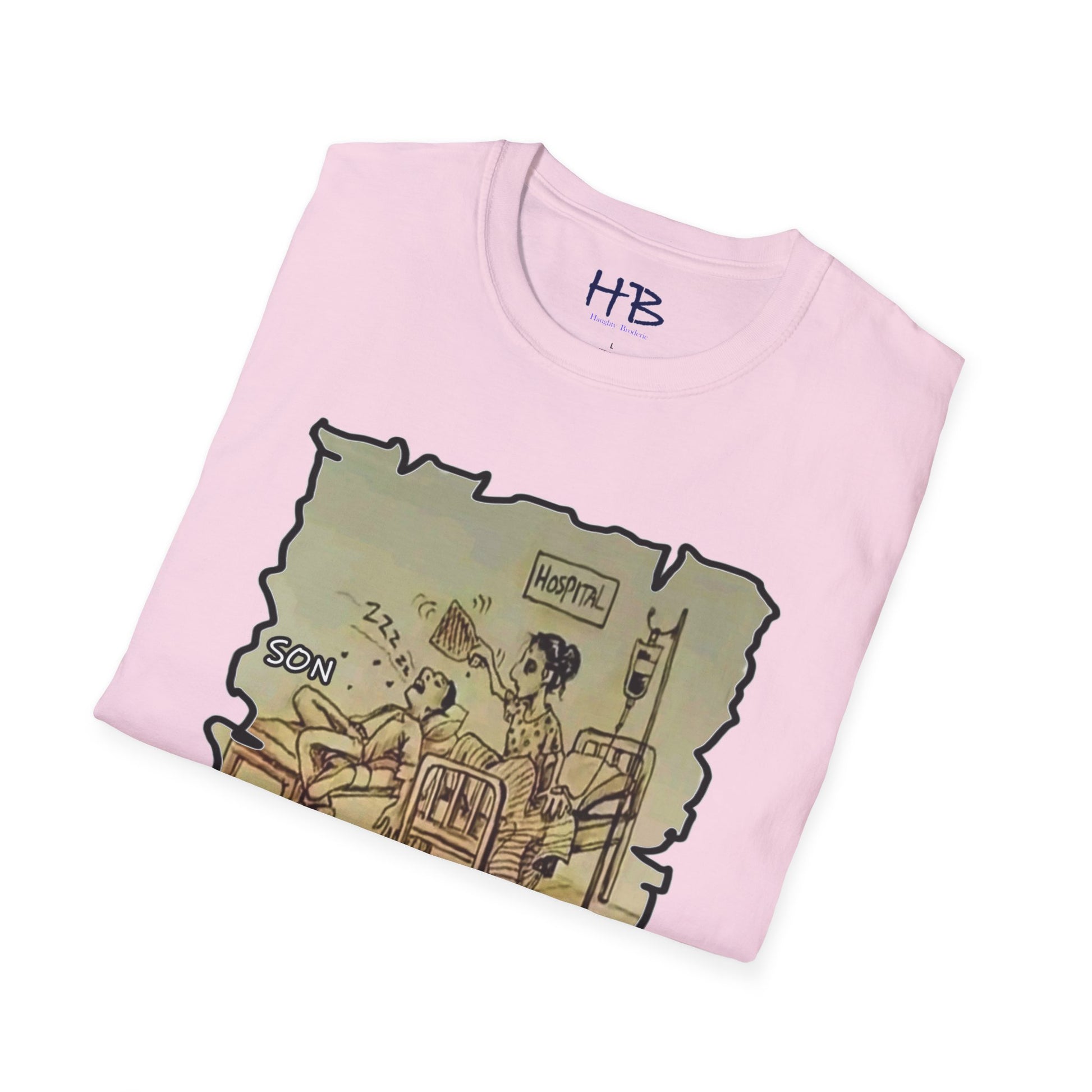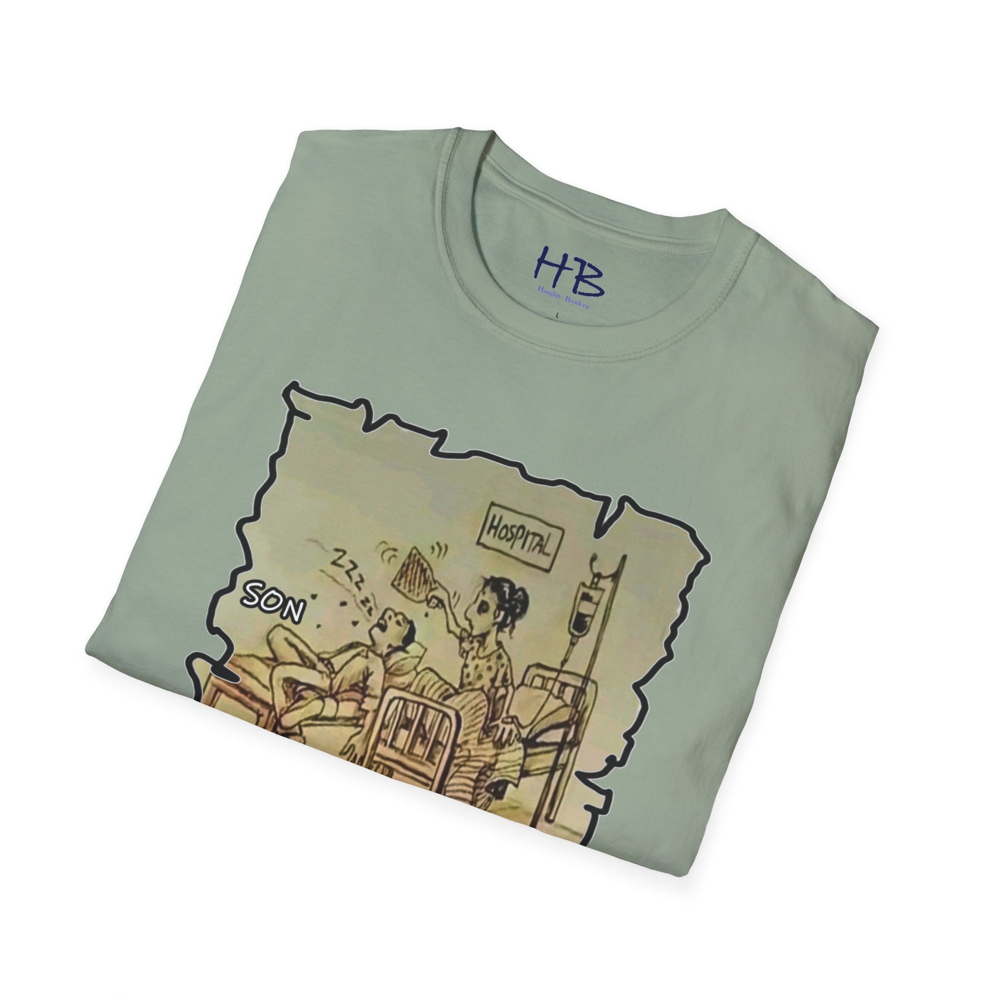 Embark on an emotional journey with our extraordinary t-shirt, where every thread tells a story of love, sacrifice, and the profound bond between a mother and her son. The captivating artwork unfolds in a hospital room, a sanctuary of emotions, where a mother battles illness in her hospital bed. Tubes weave a complex tapestry around her, a visual representation of her resilience. Despite her exhaustion, she gently fans herself, ensuring her son, who sleeps on a pull-up bed by her side, remains undisturbed.