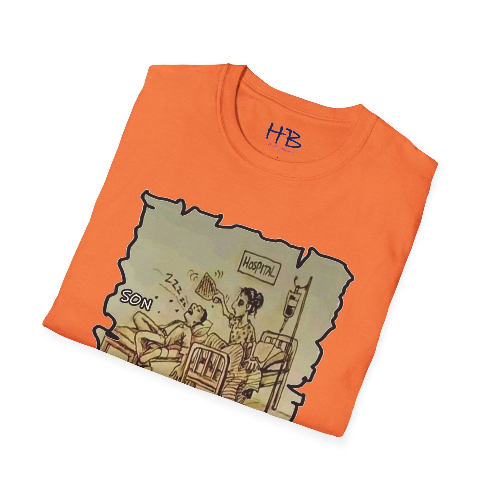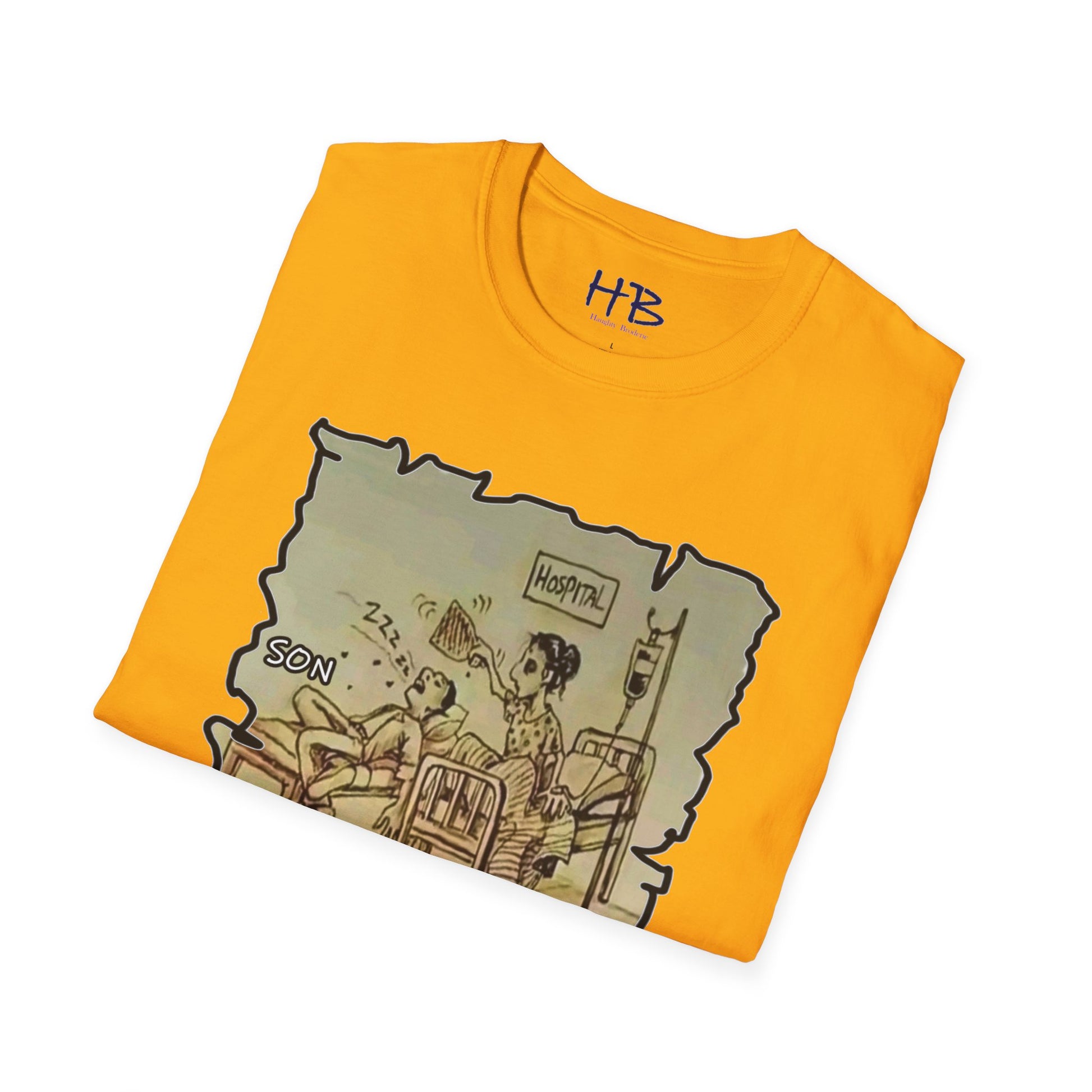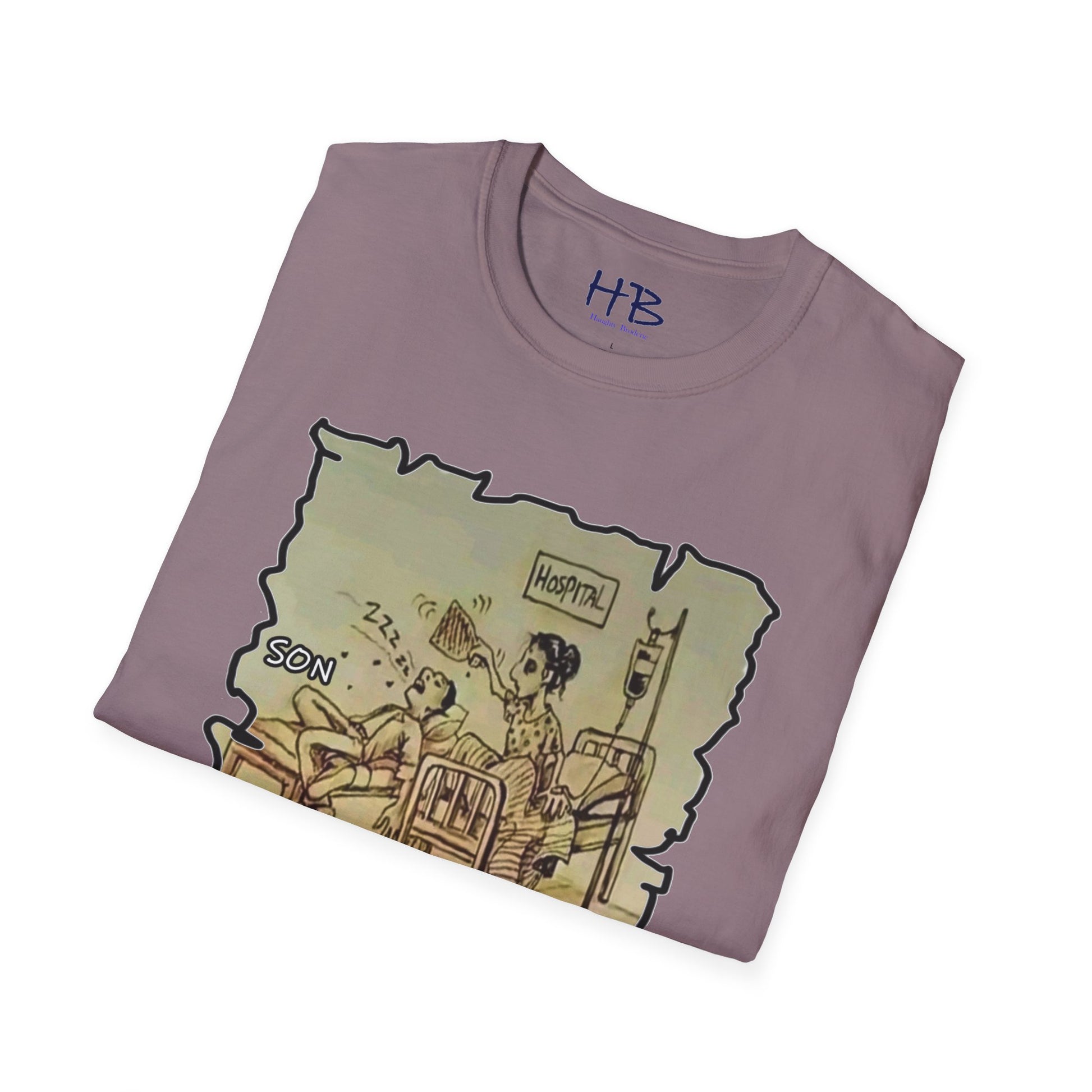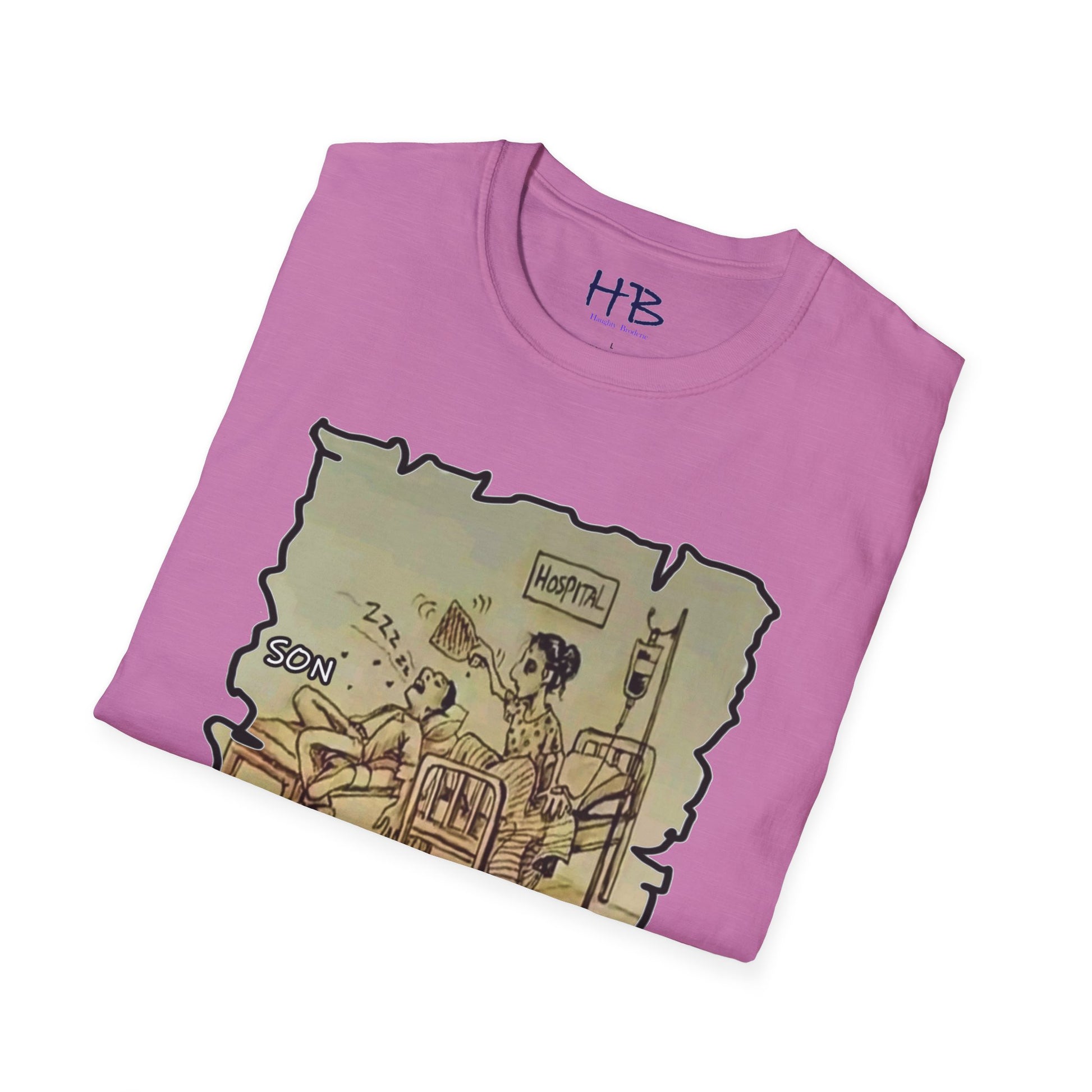 Embark on an emotional journey with our extraordinary t-shirt, where every thread tells a story of love, sacrifice, and the profound bond between a mother and her son. The captivating artwork unfolds in a hospital room, a sanctuary of emotions, where a mother battles illness in her hospital bed. Tubes weave a complex tapestry around her, a visual representation of her resilience. Despite her exhaustion, she gently fans herself, ensuring her son, who sleeps on a pull-up bed by her side, remains undisturbed.