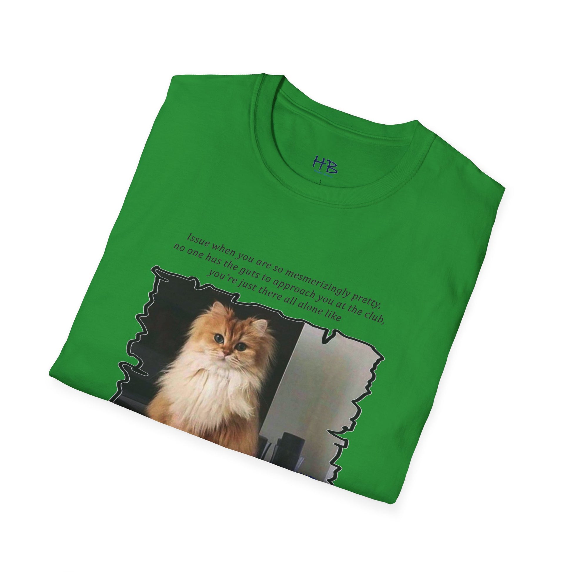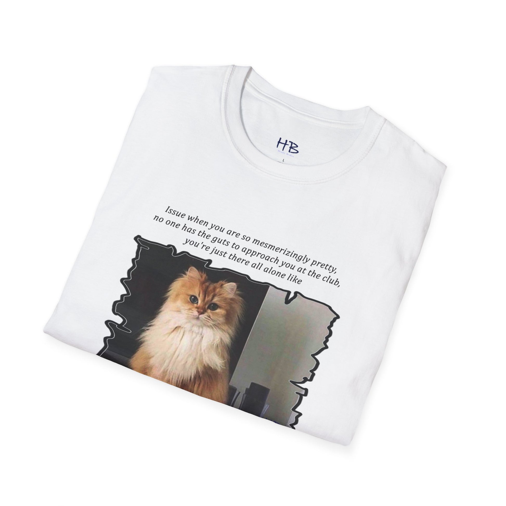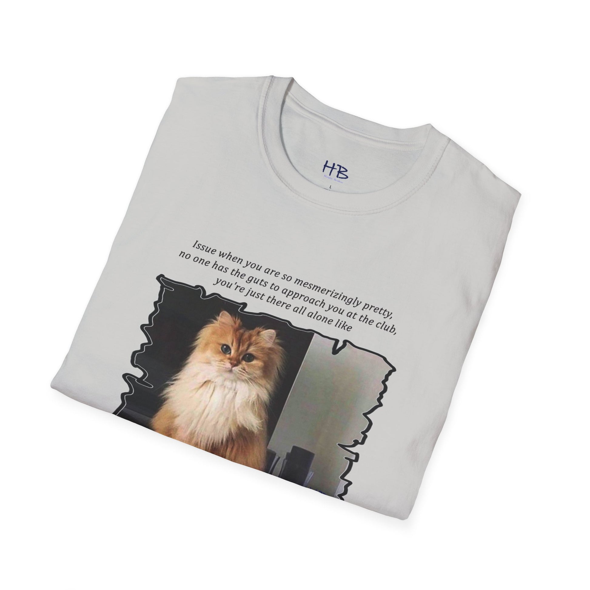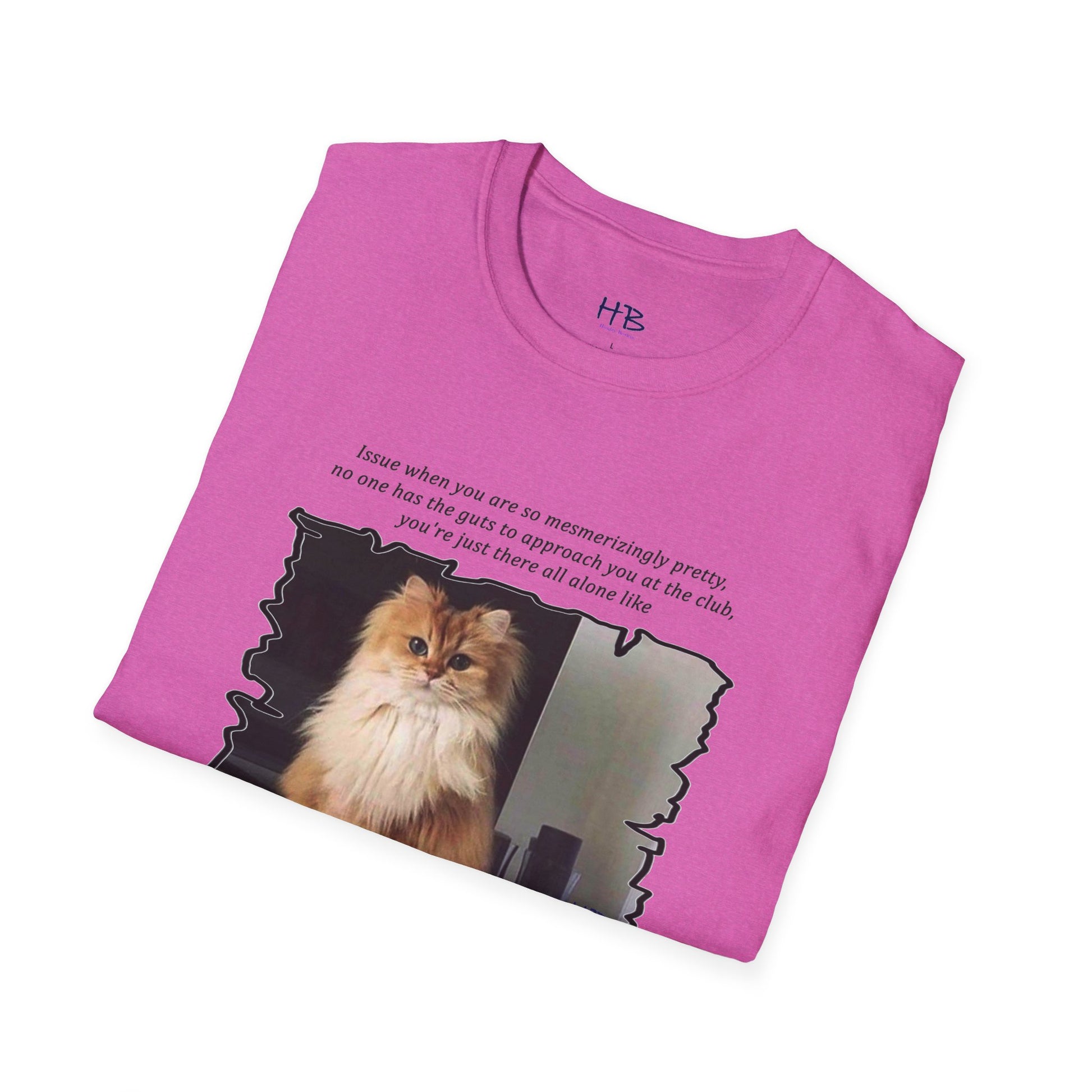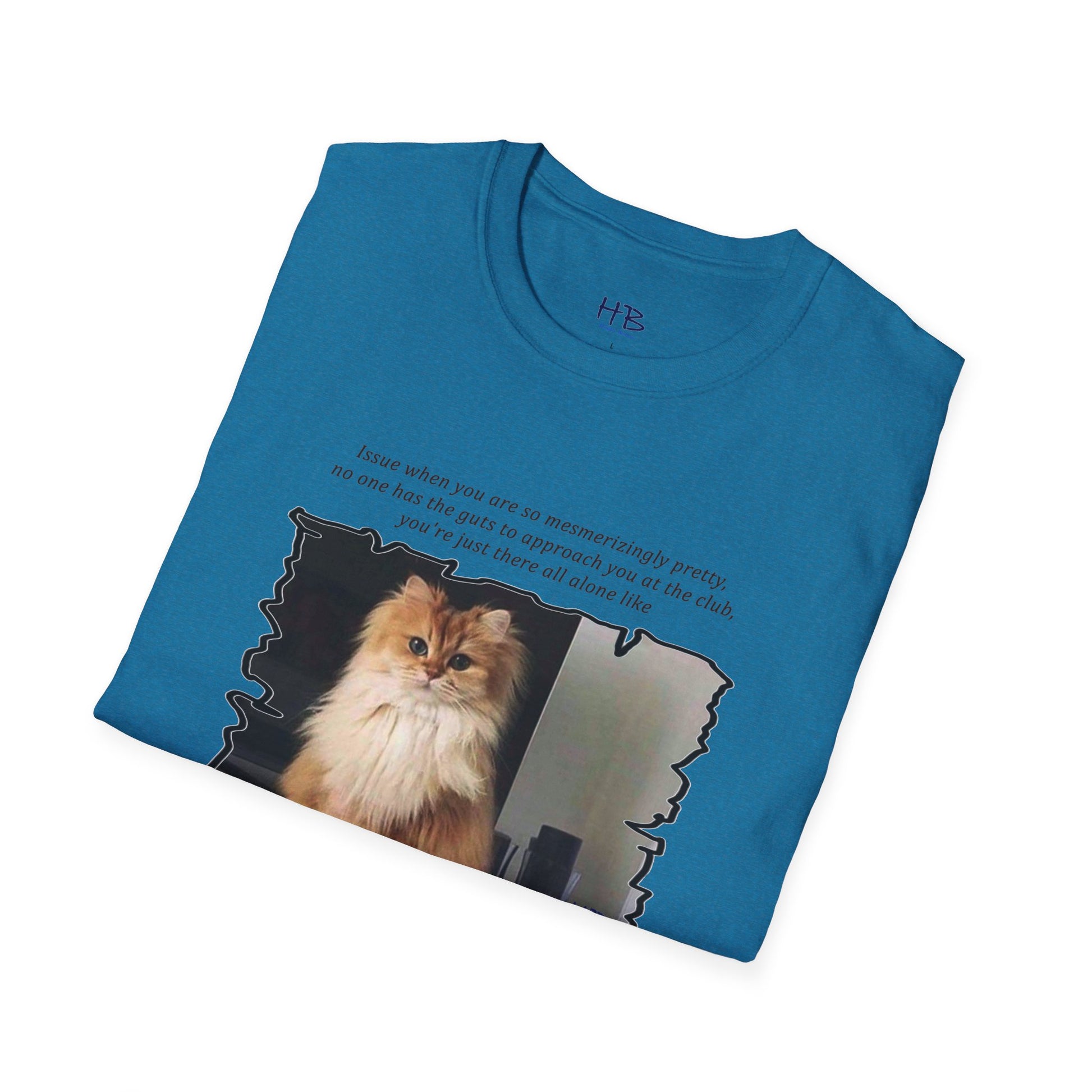 The accompanying text on the tee shirt reads, "When you're so mesmerizingly pretty, no one has the courage to approach you at the club. You're just there all alone, like a beautiful but lonely kitty." This clever text highlights the issue that even the most beautiful of creatures can feel alone and isolated at times.